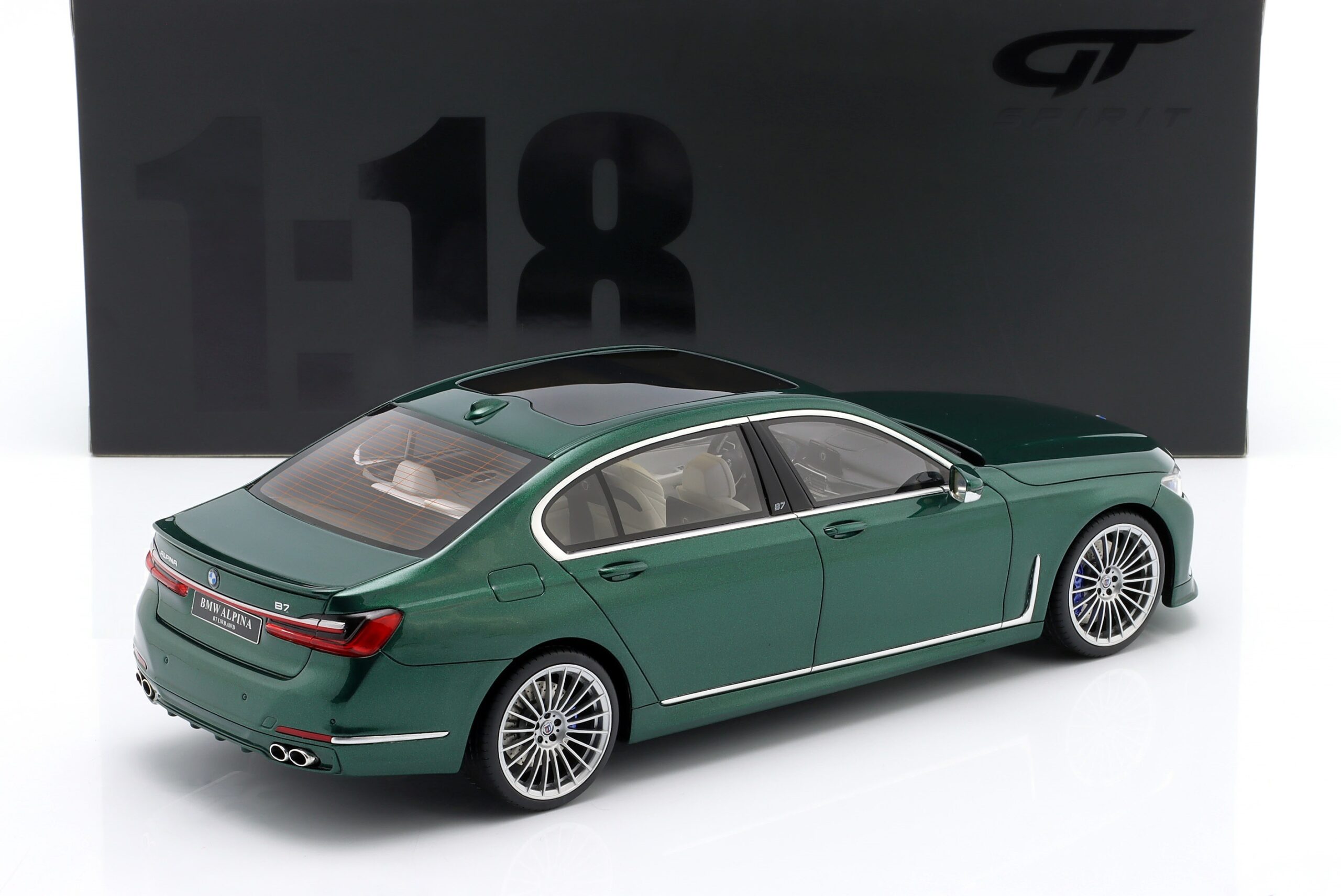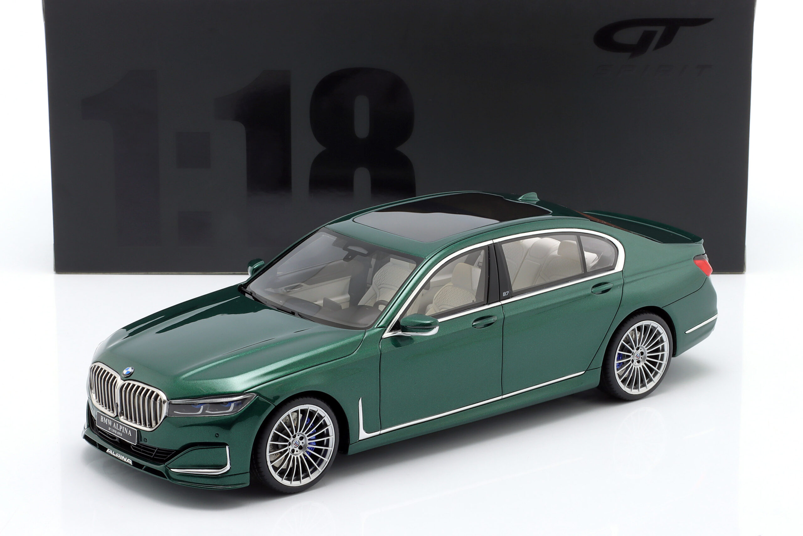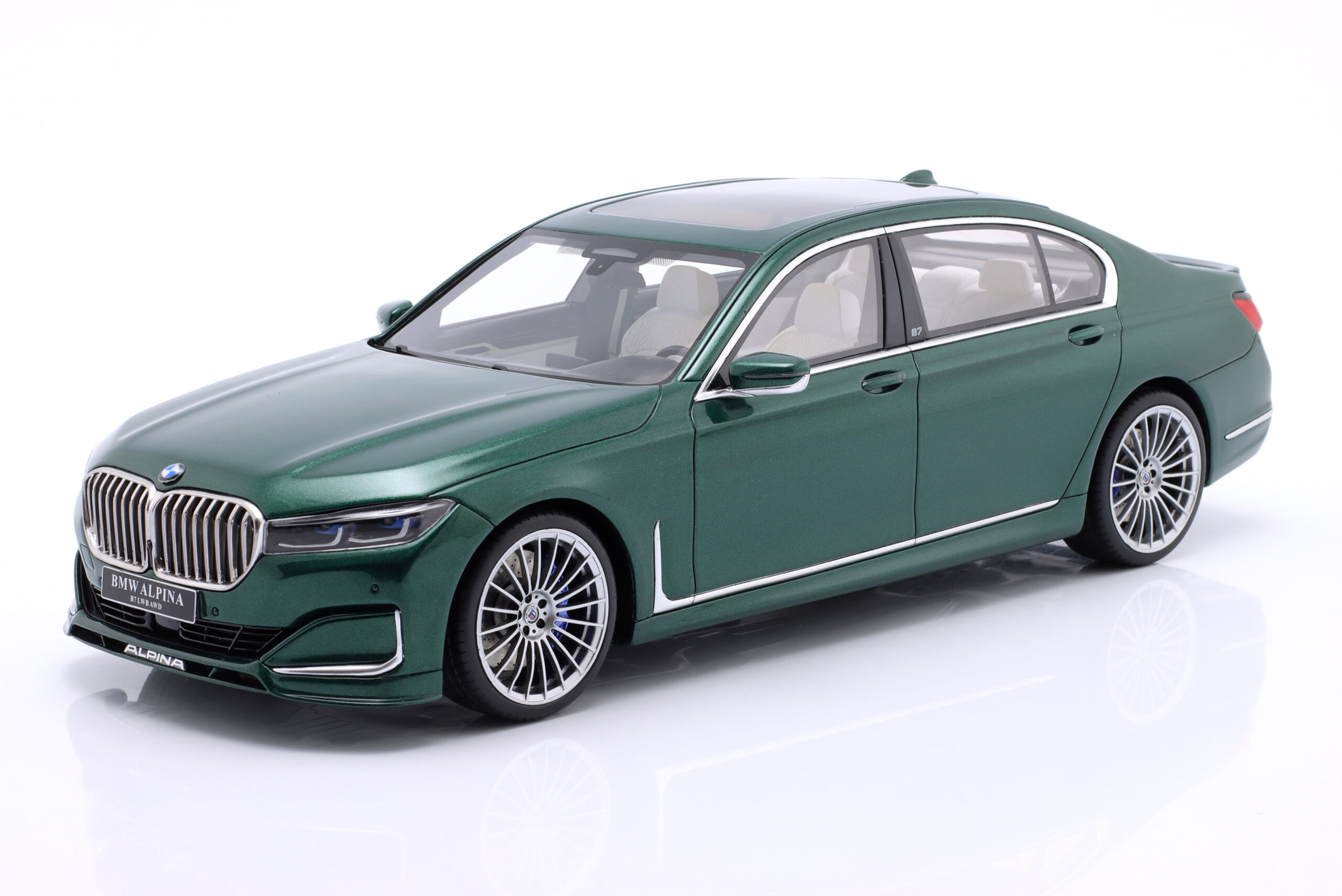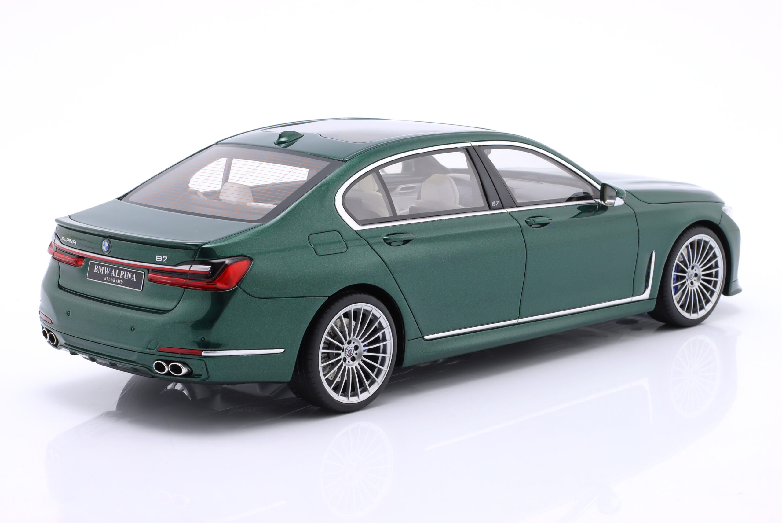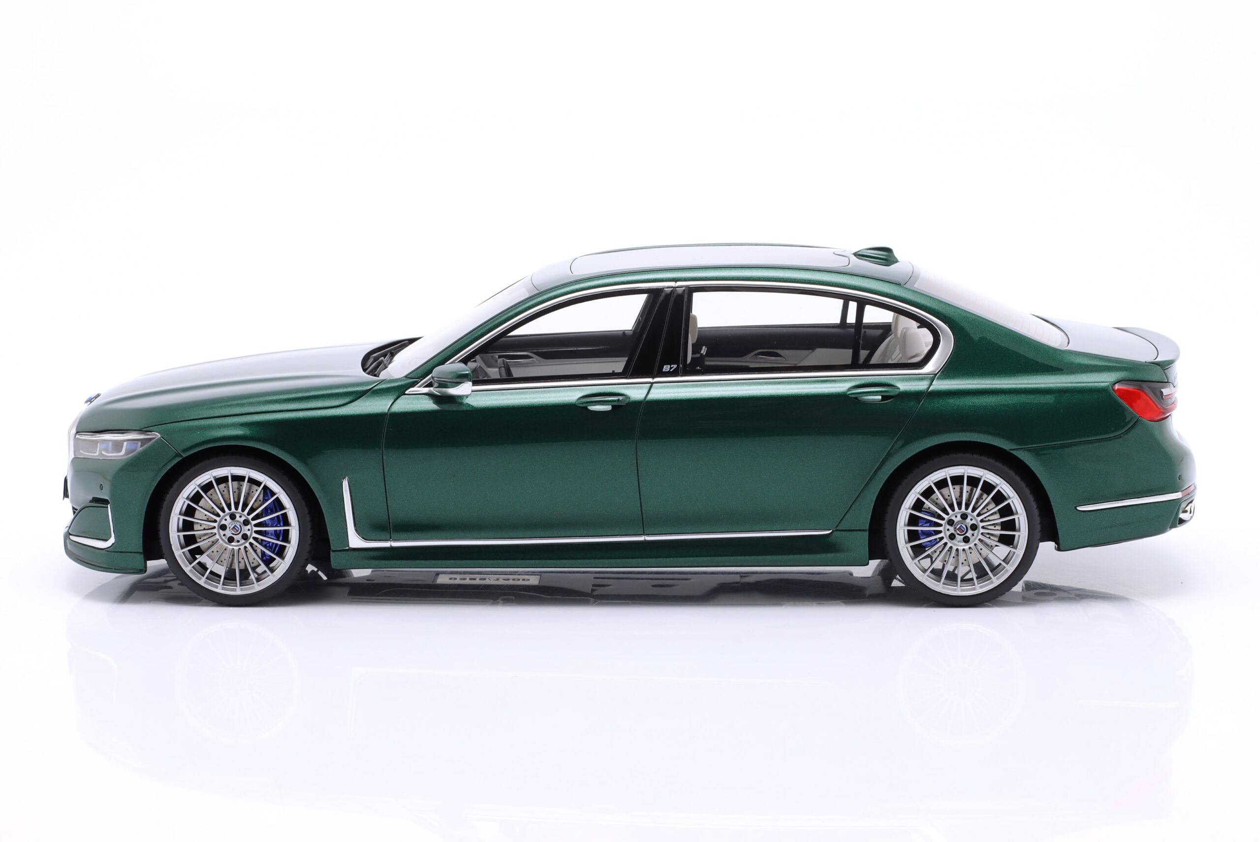 Kolekcjonerski model wykonany z żywicy samochodu BMW ALPINA B7 (G12) z roku 2022 w kolorze Ciemnozielony metallic.Model nie posiada otwieranych elementów.Edycja limitowana tylko 1400 sztuk.