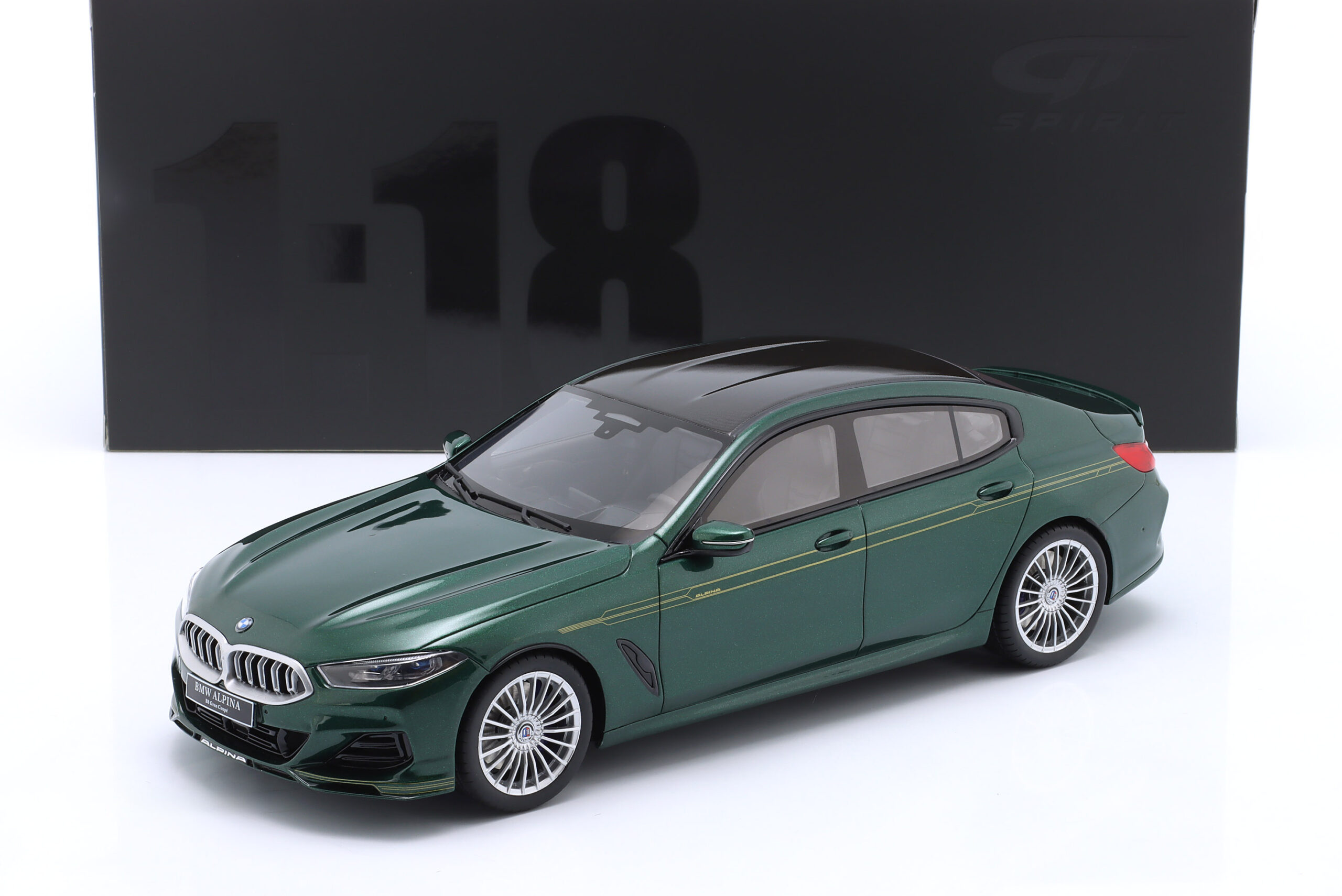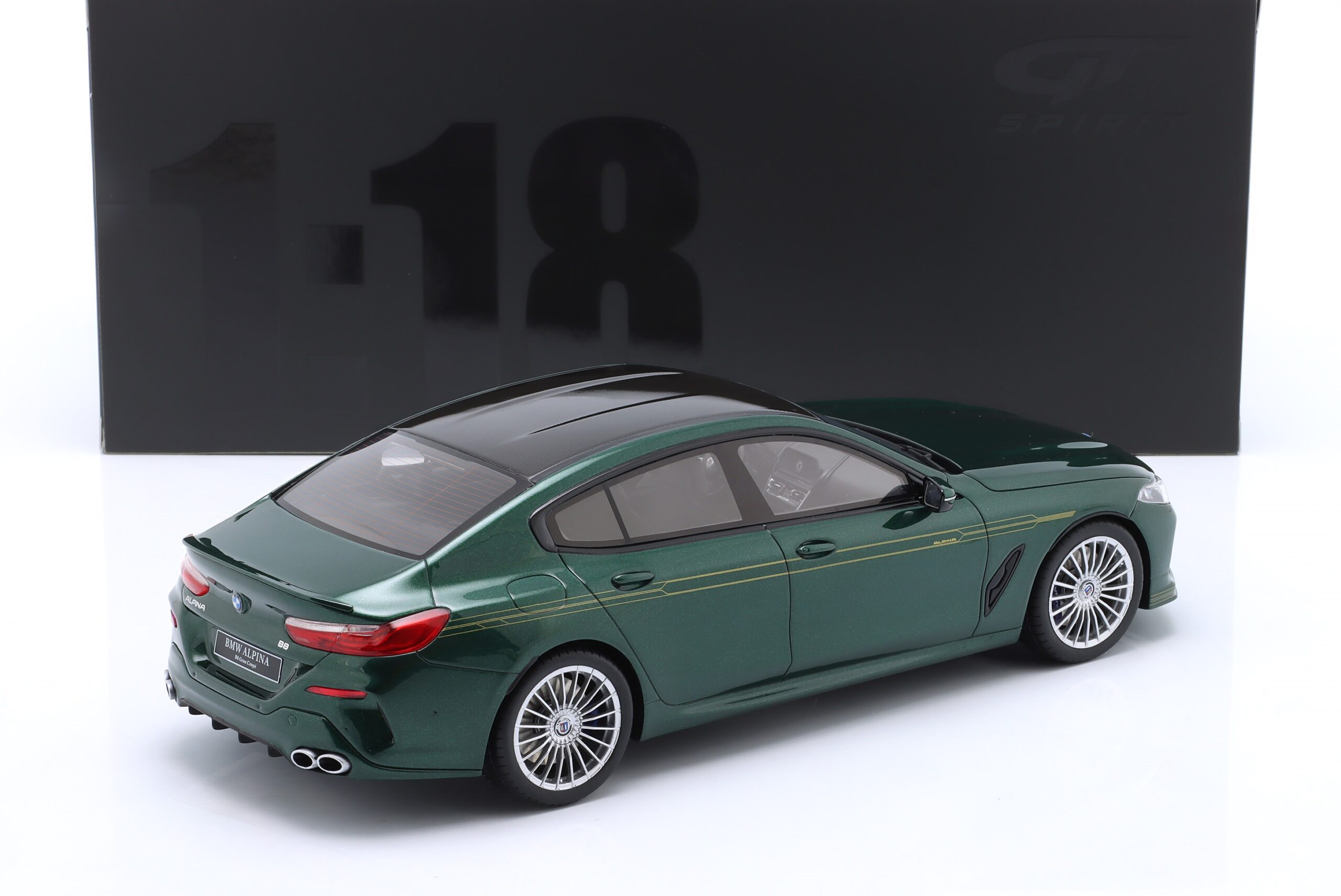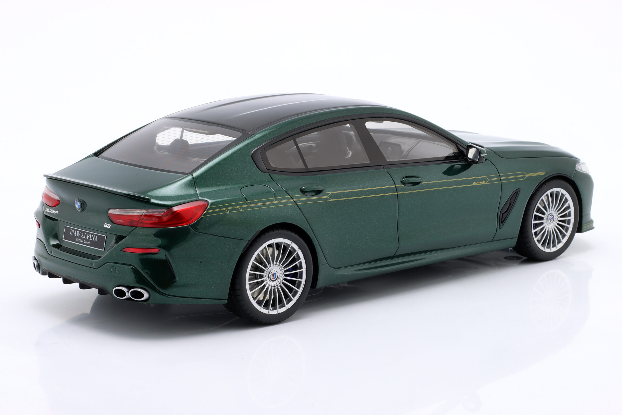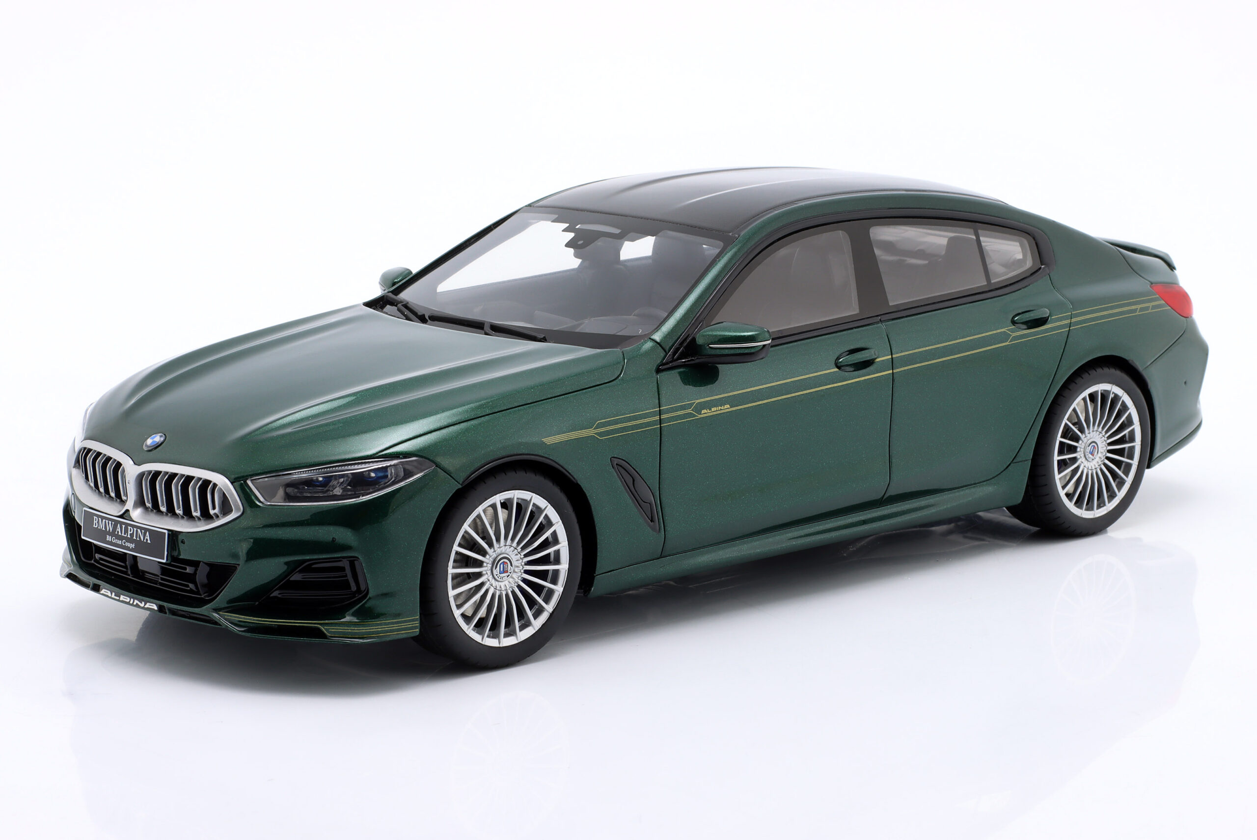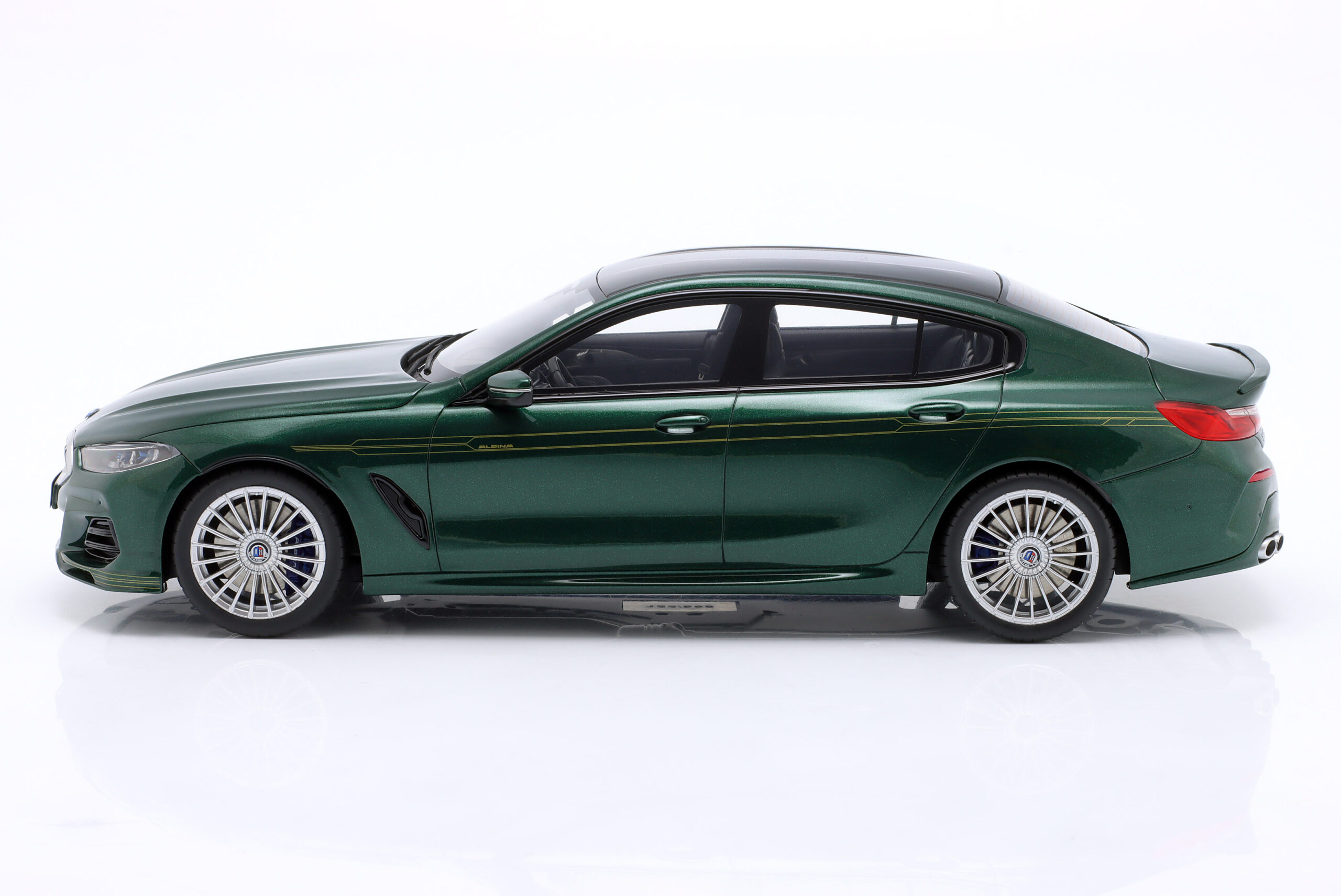 Kolekcjonerski model wykonany z żywicy samochodu BMW ALPINA B8 Gran Coupe z roku 2023 w kolorze Ciemnozielony metallic.Model nie posiada otwieranych elementów.Edycja limitowana tylko 999 sztuk.