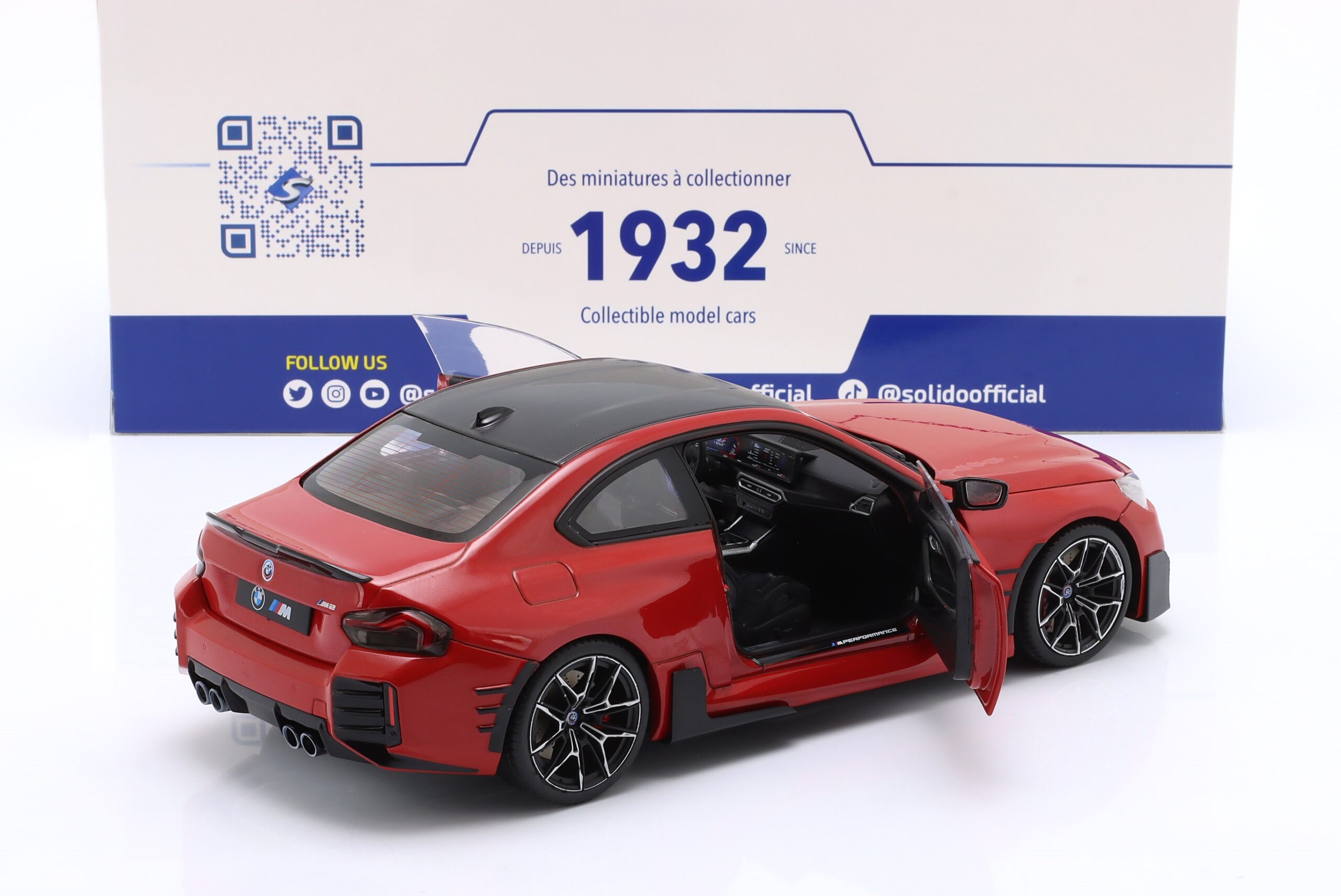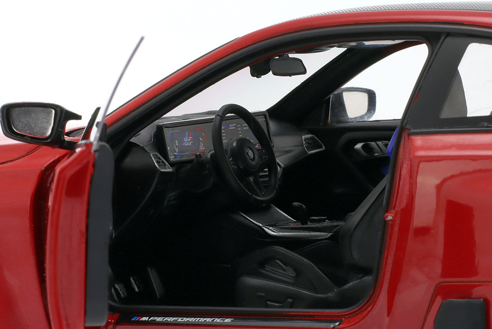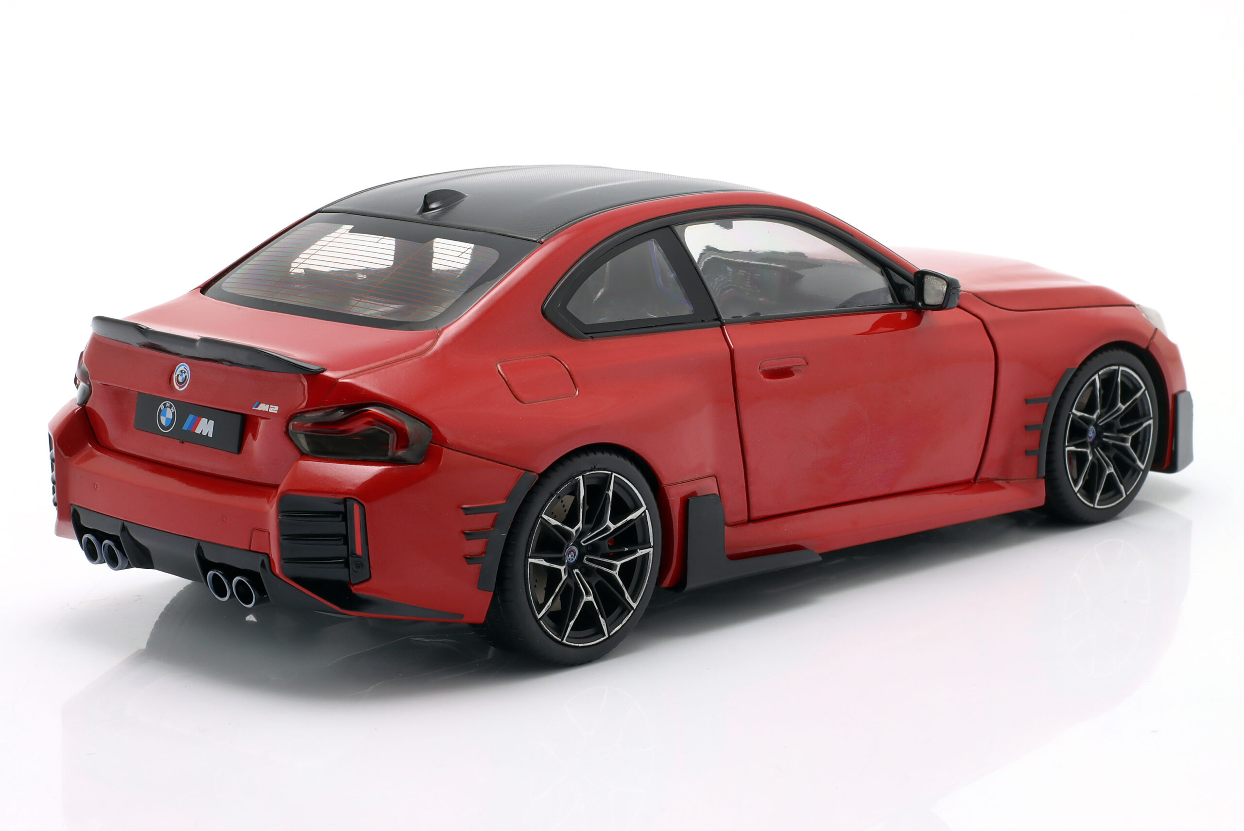 Kolekcjonerski model metalowy z elementami plastikowymi samochodu BMW M2 PERFORMANCE PARTS (G87) roku 2024 w kolorze Toronto red.Model posiada otwierane drzwi.