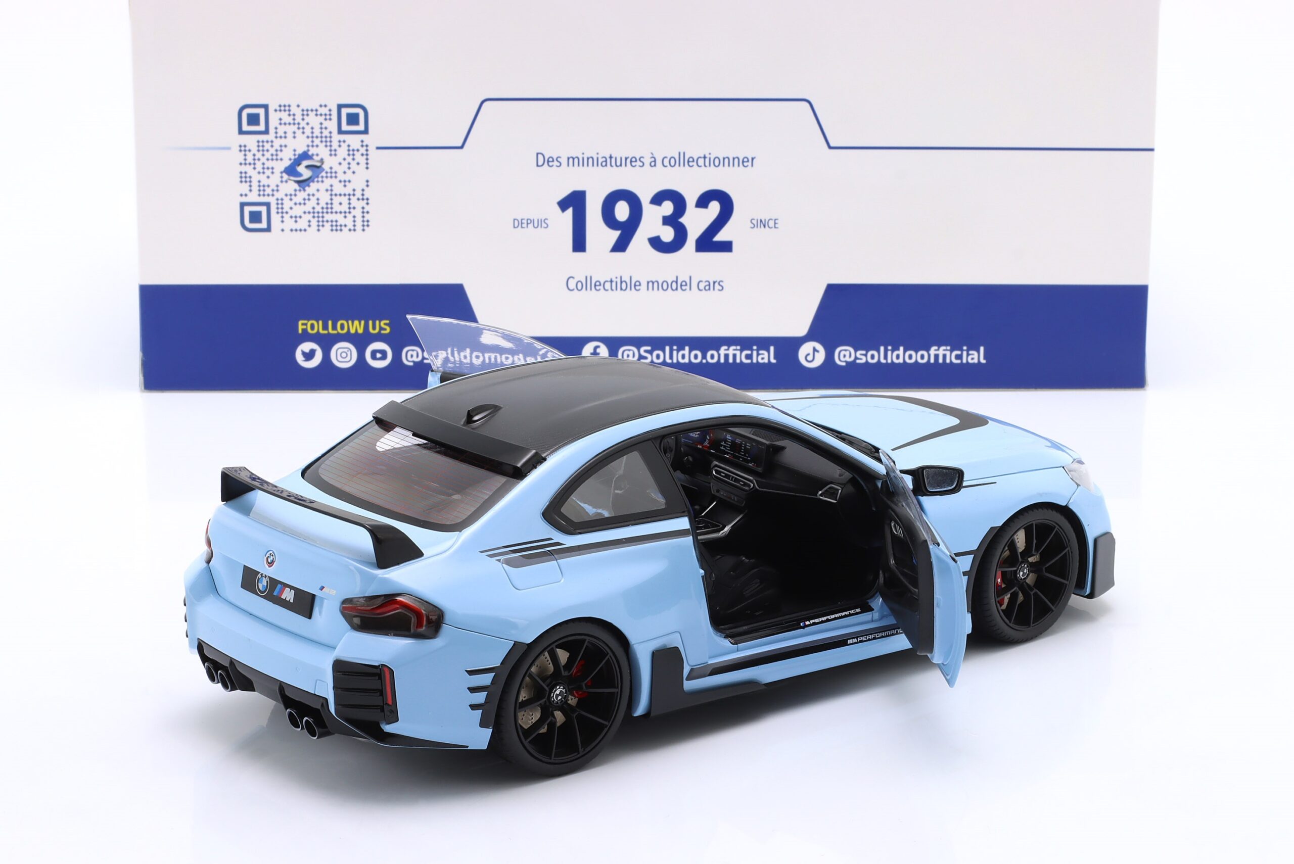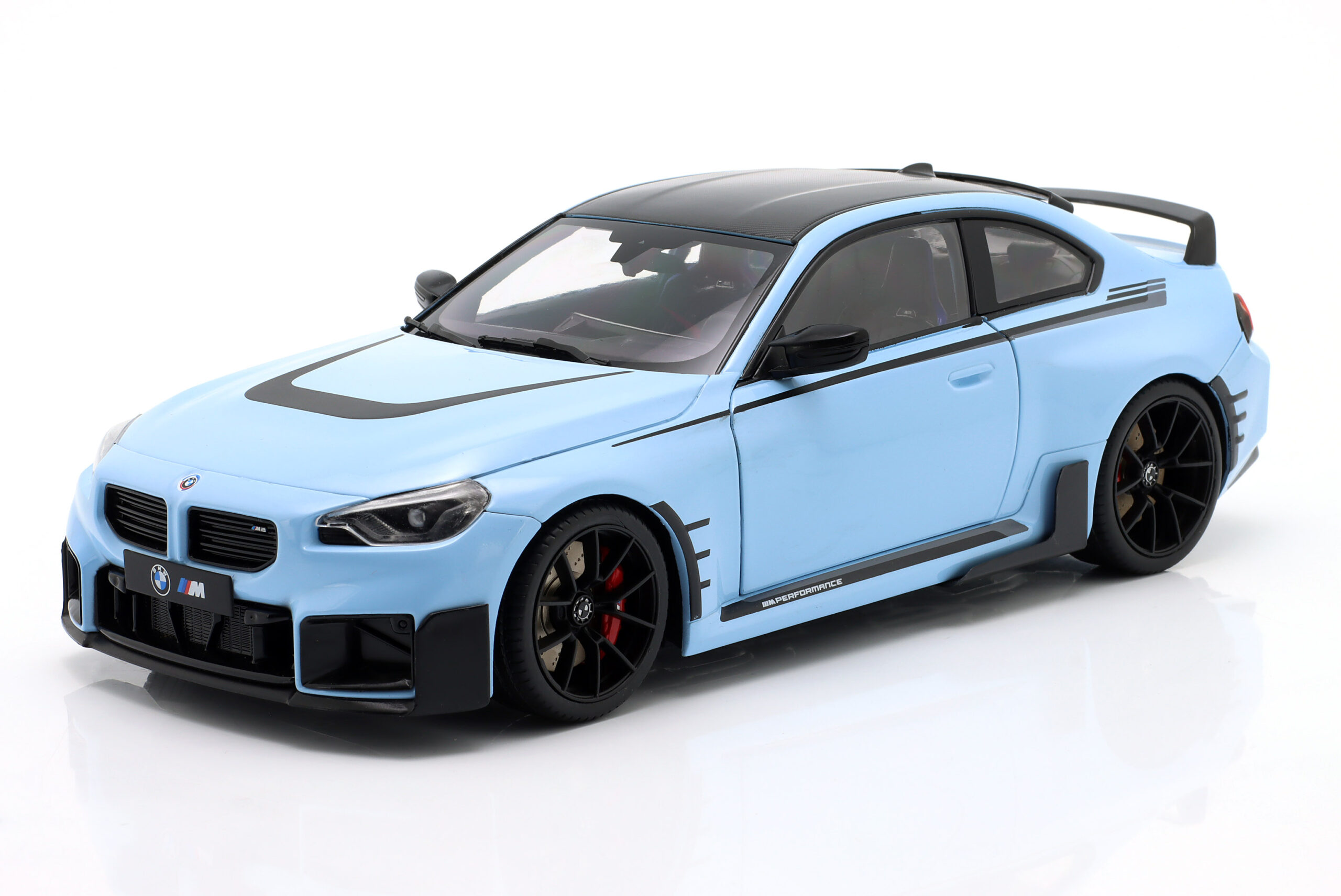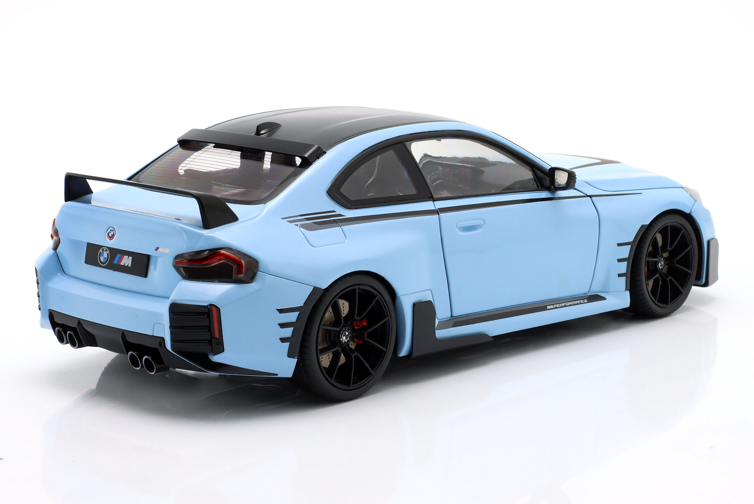Kolekcjonerski model metalowy z elementami plastikowymi samochodu BMW M2 PERFORMANCE PARTS (G87) roku 2024 w kolorze Zandvoort blue.Model posiada otwierane drzwi.