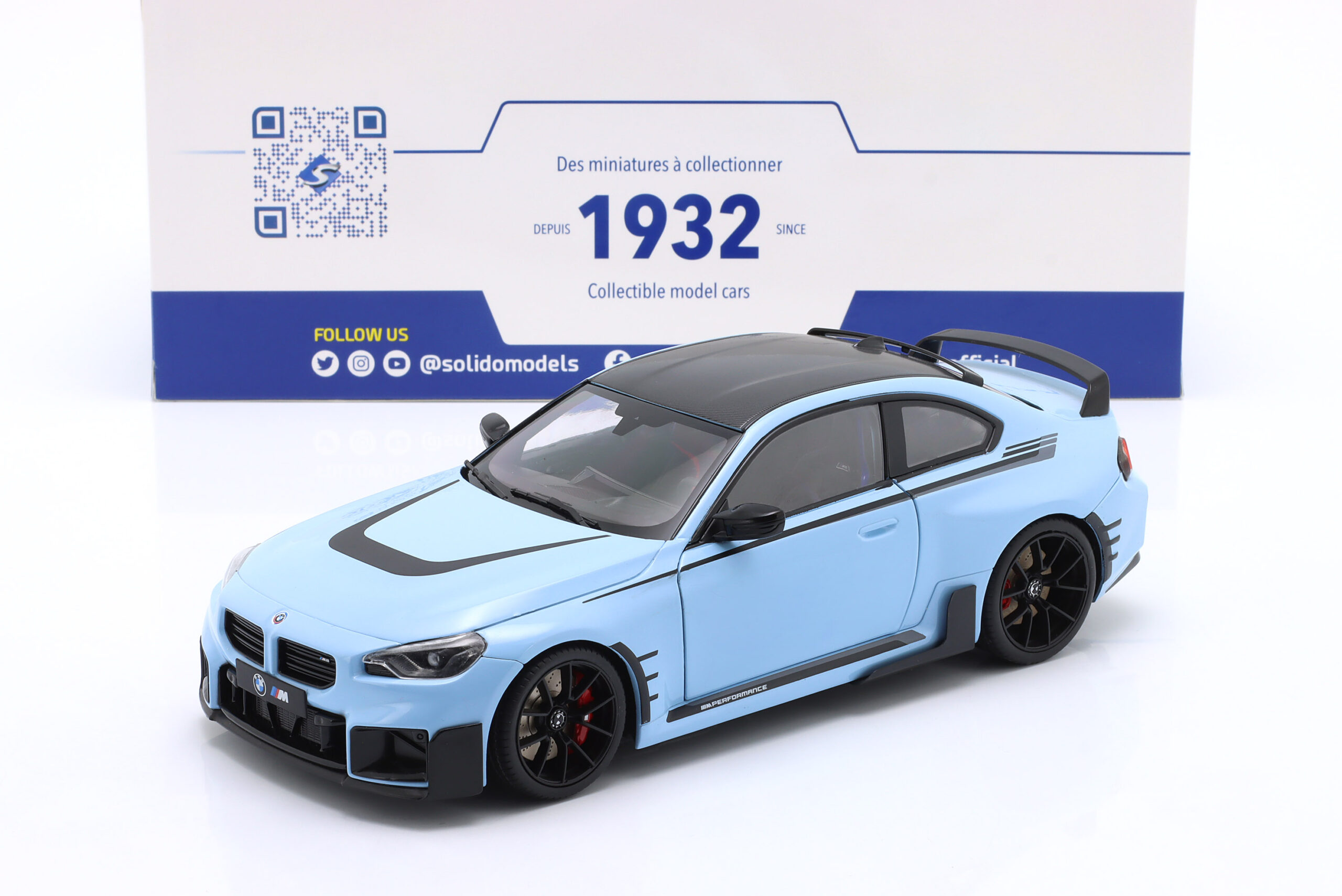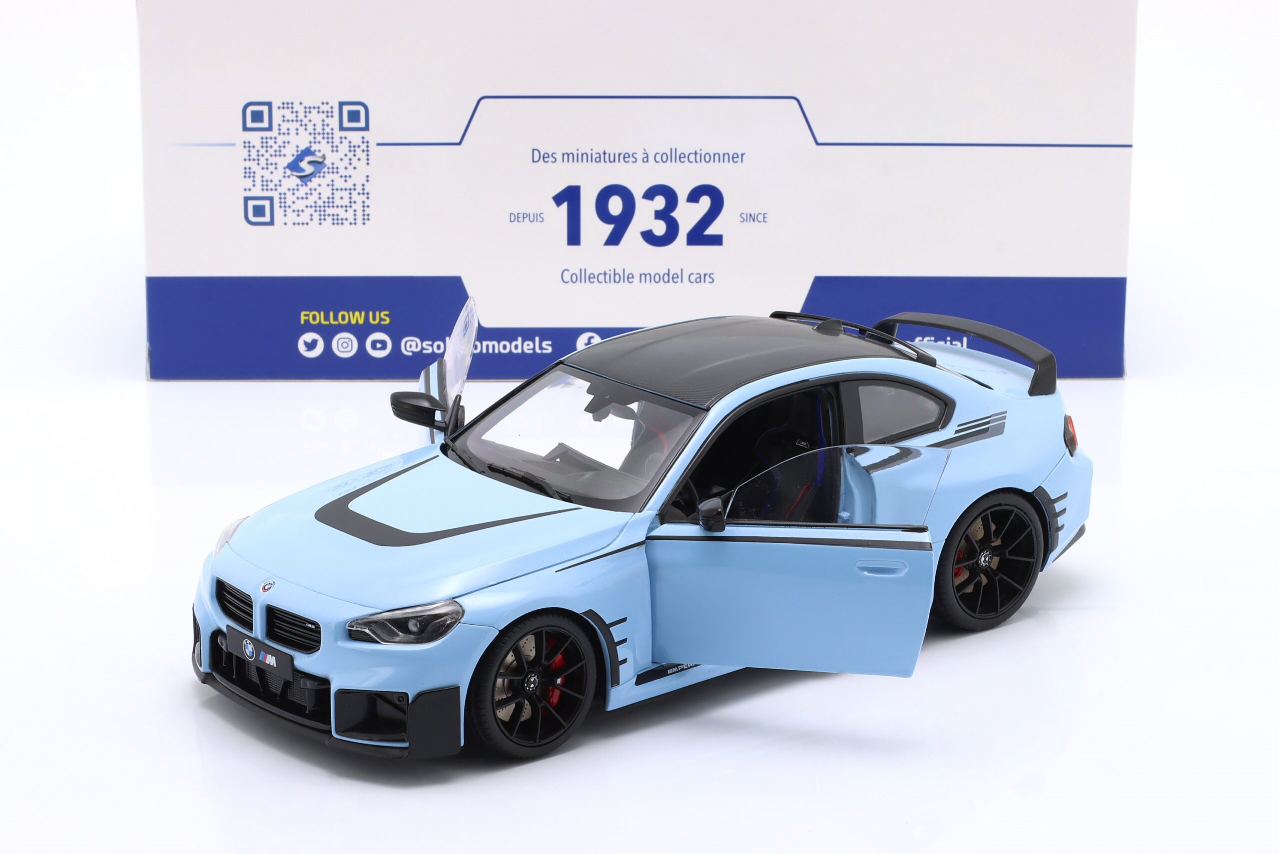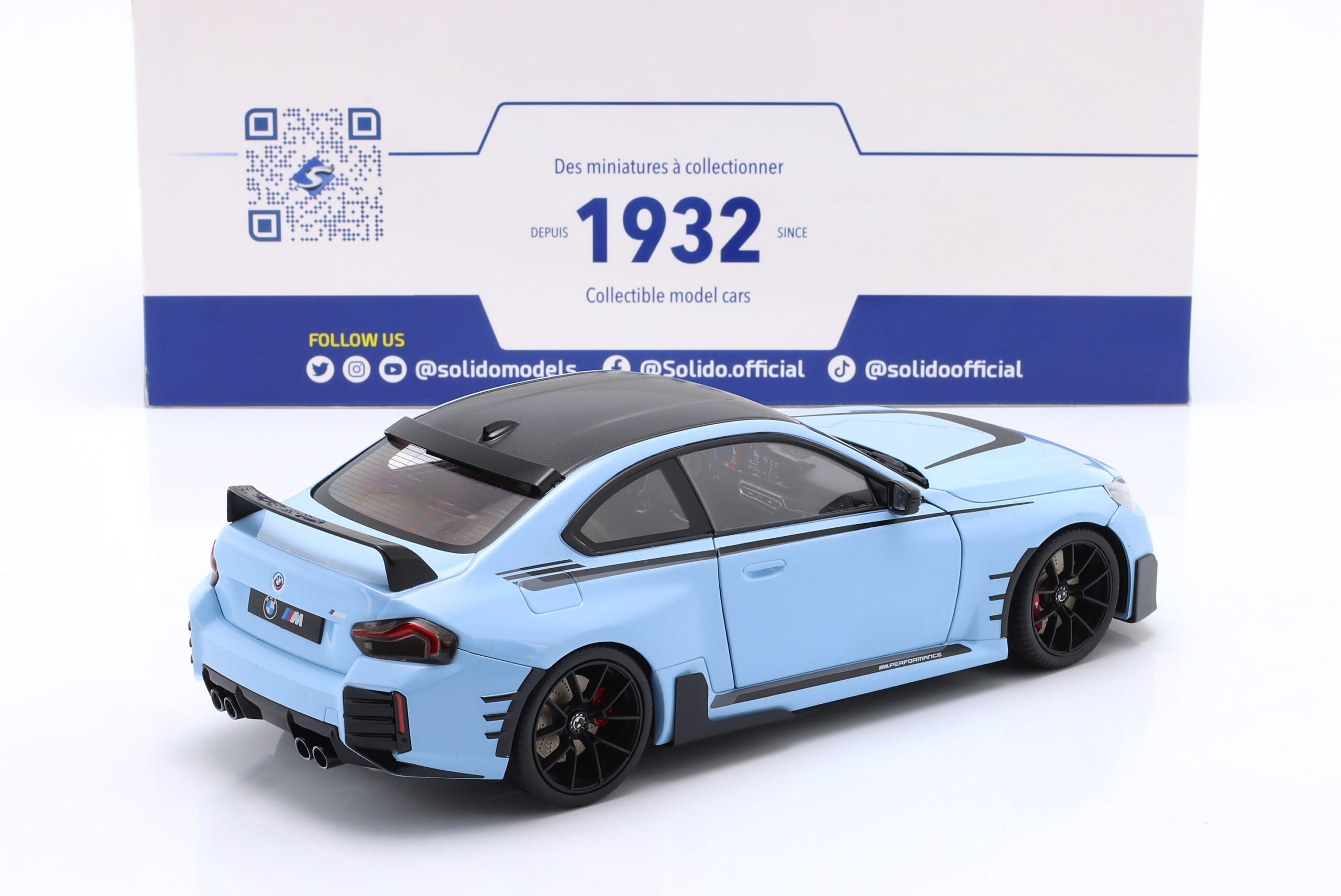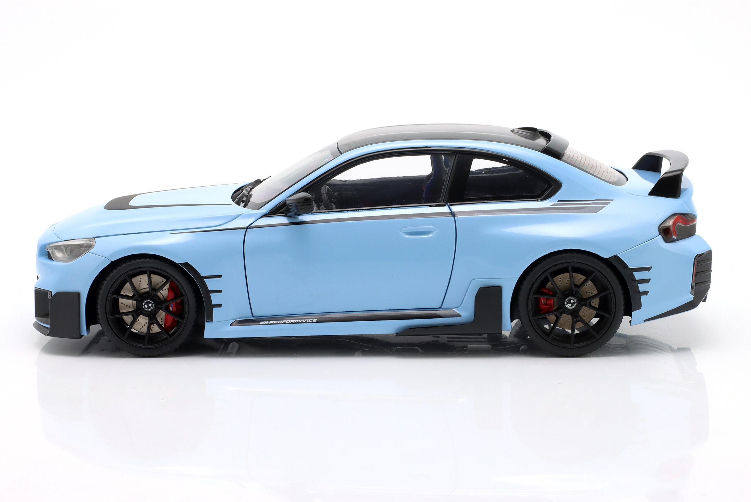 Kolekcjonerski model metalowy z elementami plastikowymi samochodu BMW M2 PERFORMANCE PARTS (G87) roku 2024 w kolorze Zandvoort blue.Model posiada otwierane drzwi.