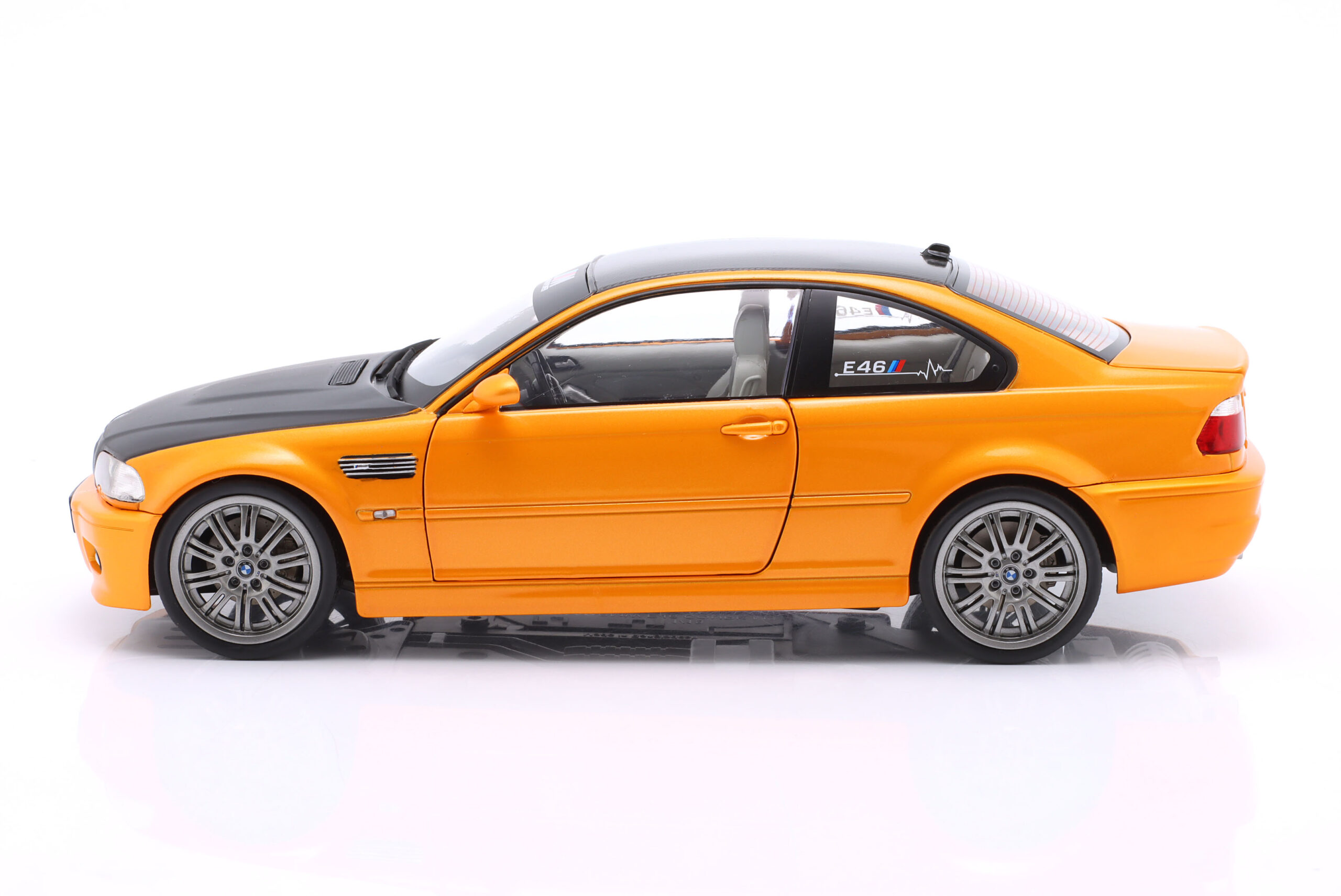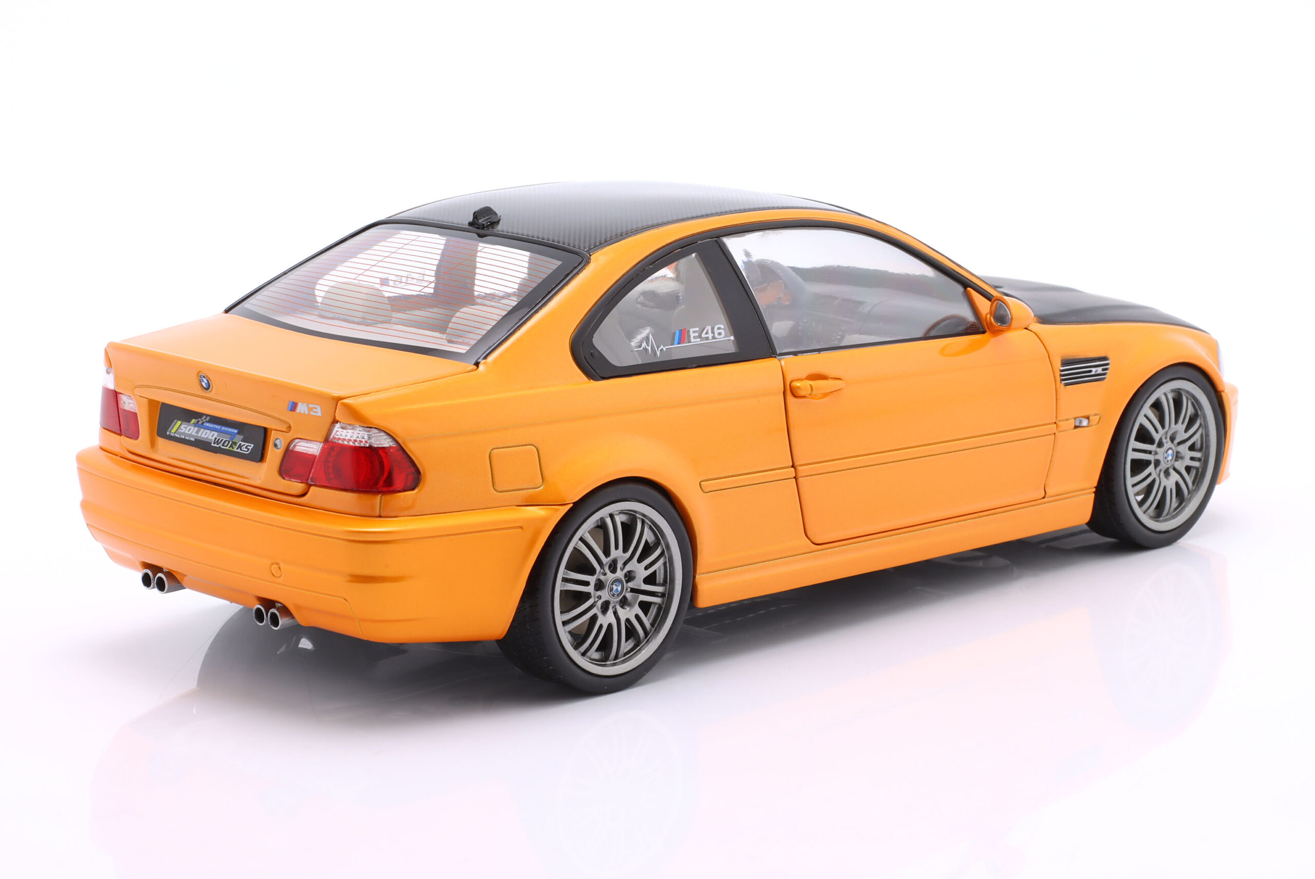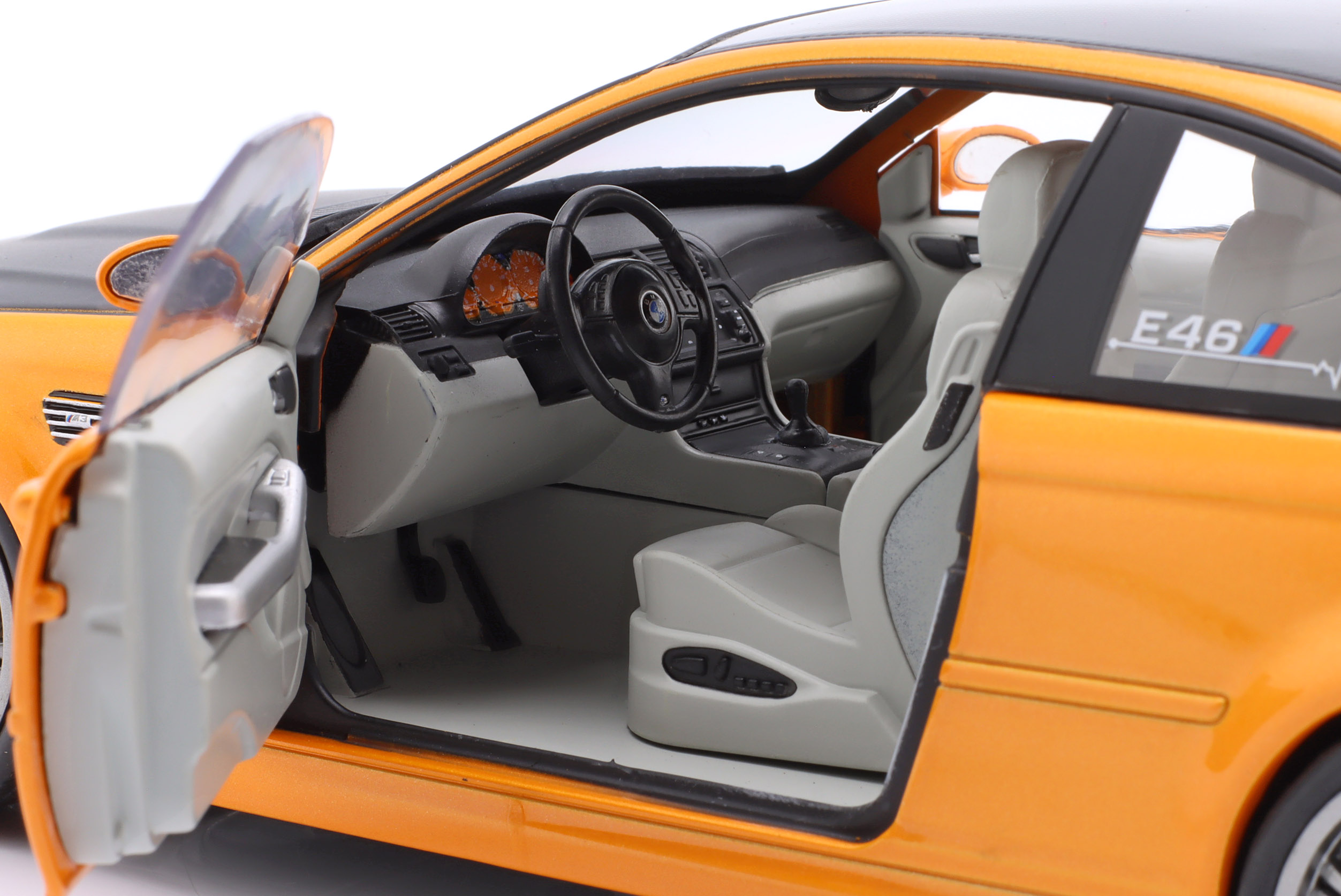 Kolekcjonerski model metalowy z elementami plastikowymi samochodu BMW M3 Coupe (E46) Solido Works z roku 2000 w kolorze Pomarańczowy/Czarny.Model posiada otwierane drzwi.