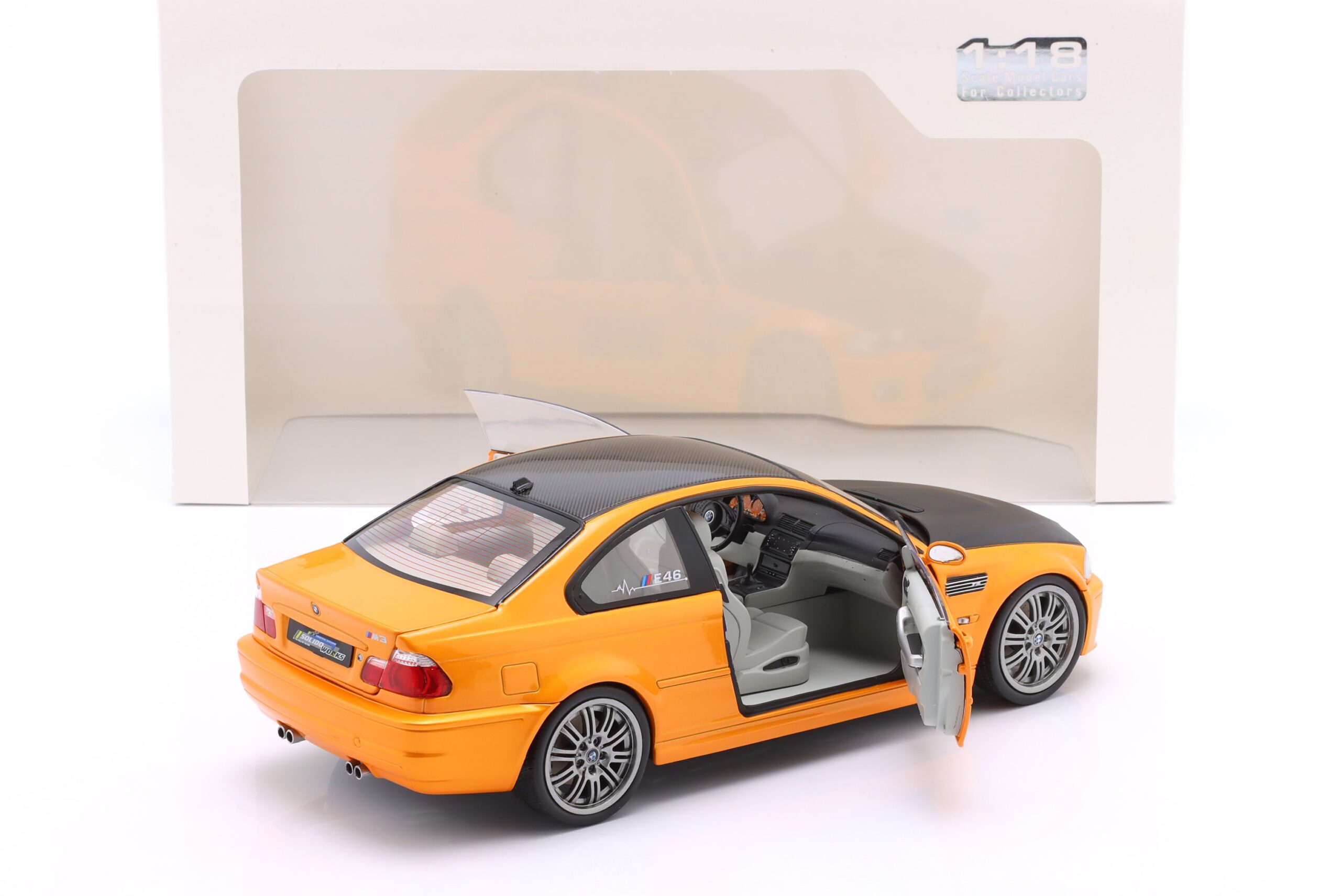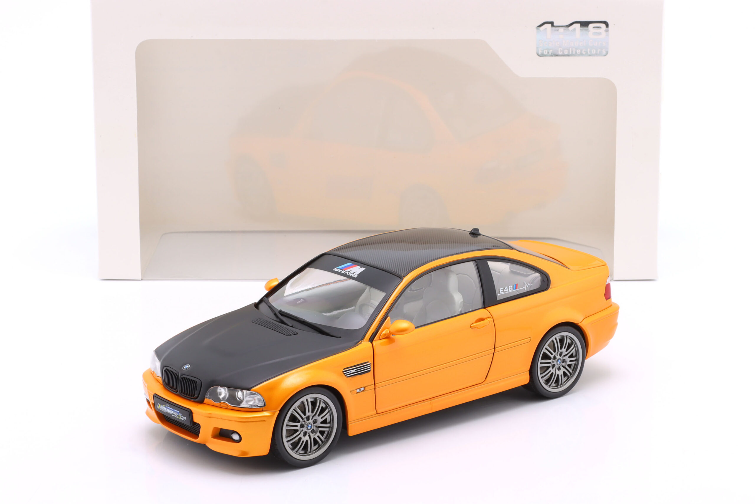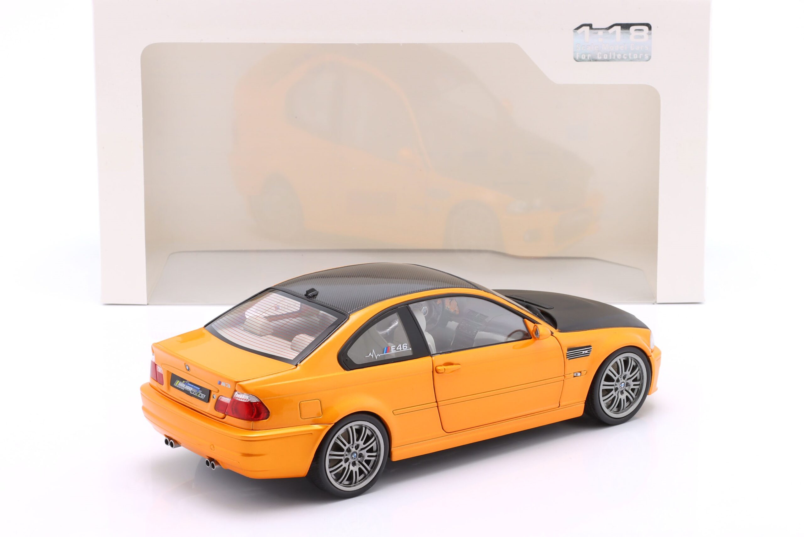 Kolekcjonerski model metalowy z elementami plastikowymi samochodu BMW M3 Coupe (E46) Solido Works z roku 2000 w kolorze Pomarańczowy/Czarny.Model posiada otwierane drzwi.