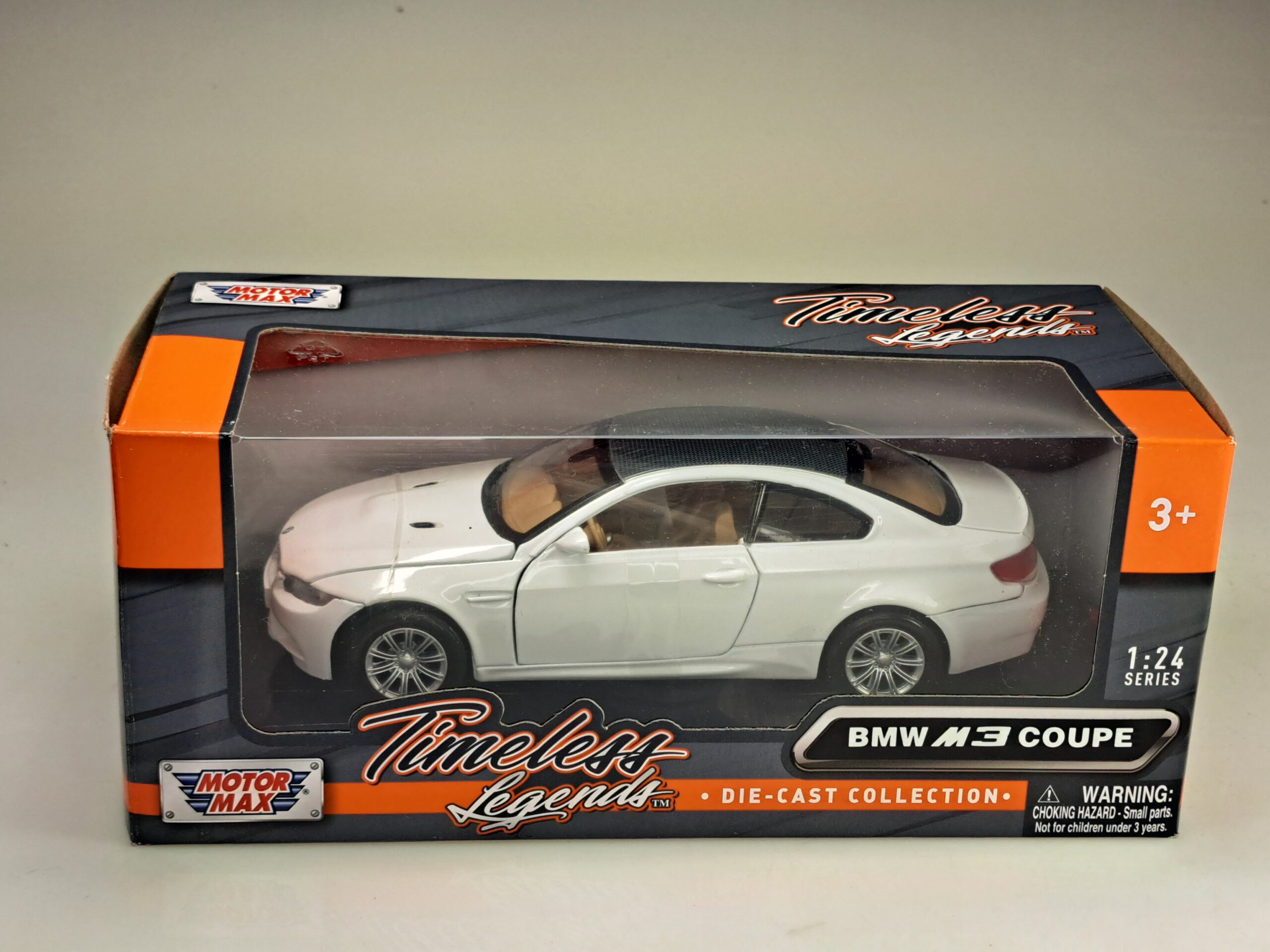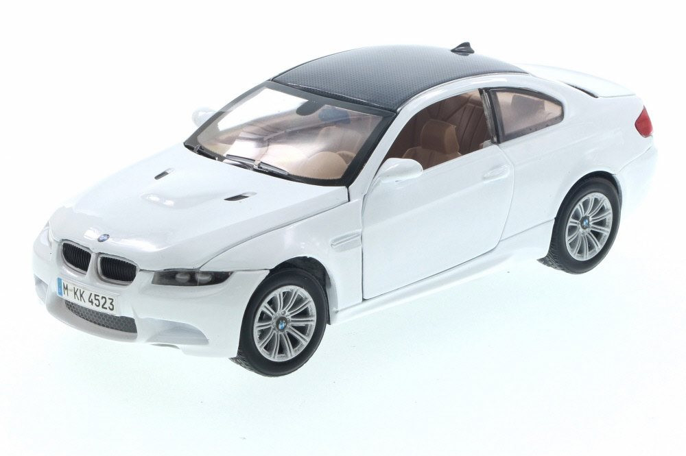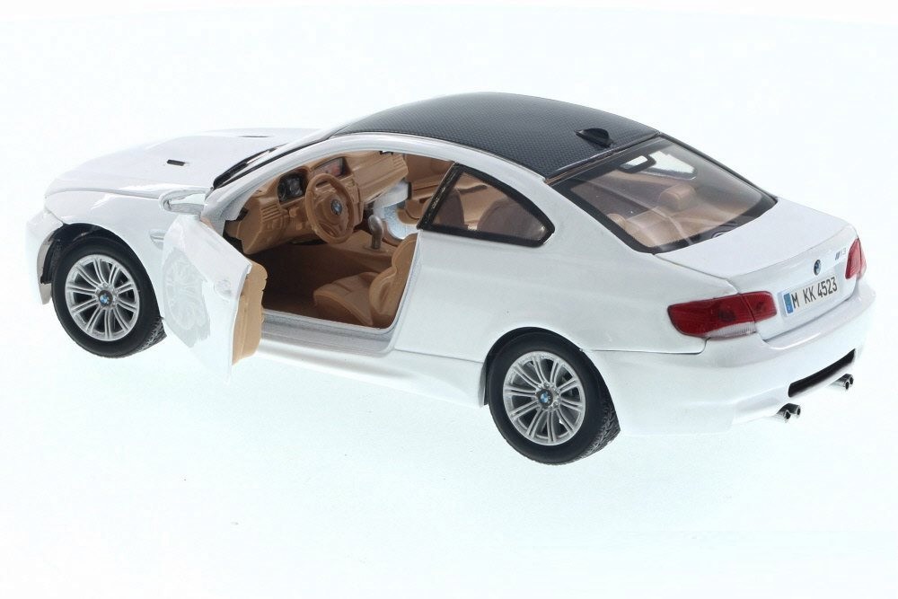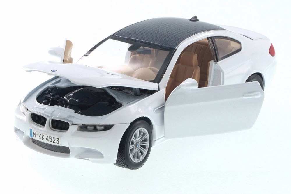 Kolekcjonerski model metalowy z elementami plastikowymi samochodu BMW M3 Coupe (E92) z roku 2008 w kolorze Białym.Posiada otwierane drzwi.Model zapakowany w kartonowe pudełko witrynką.