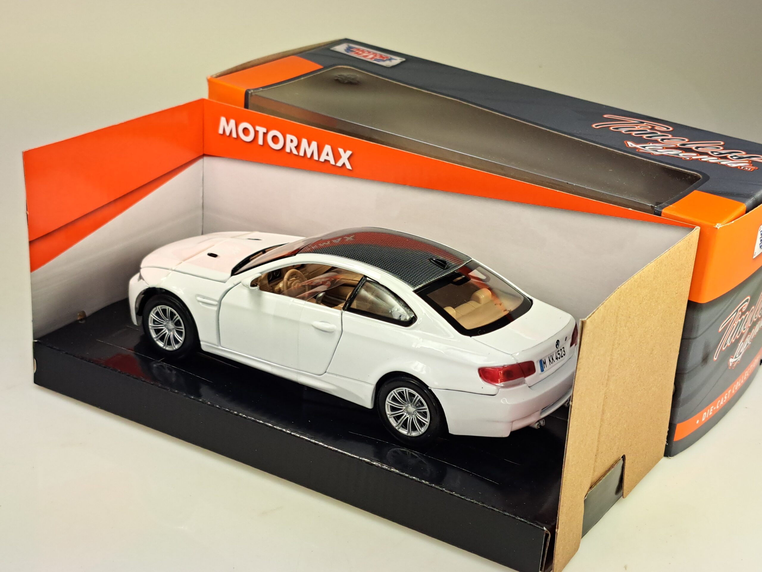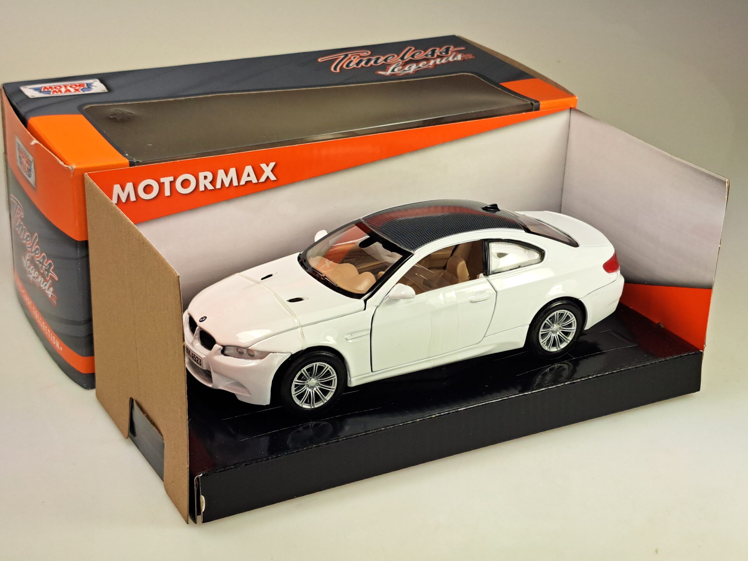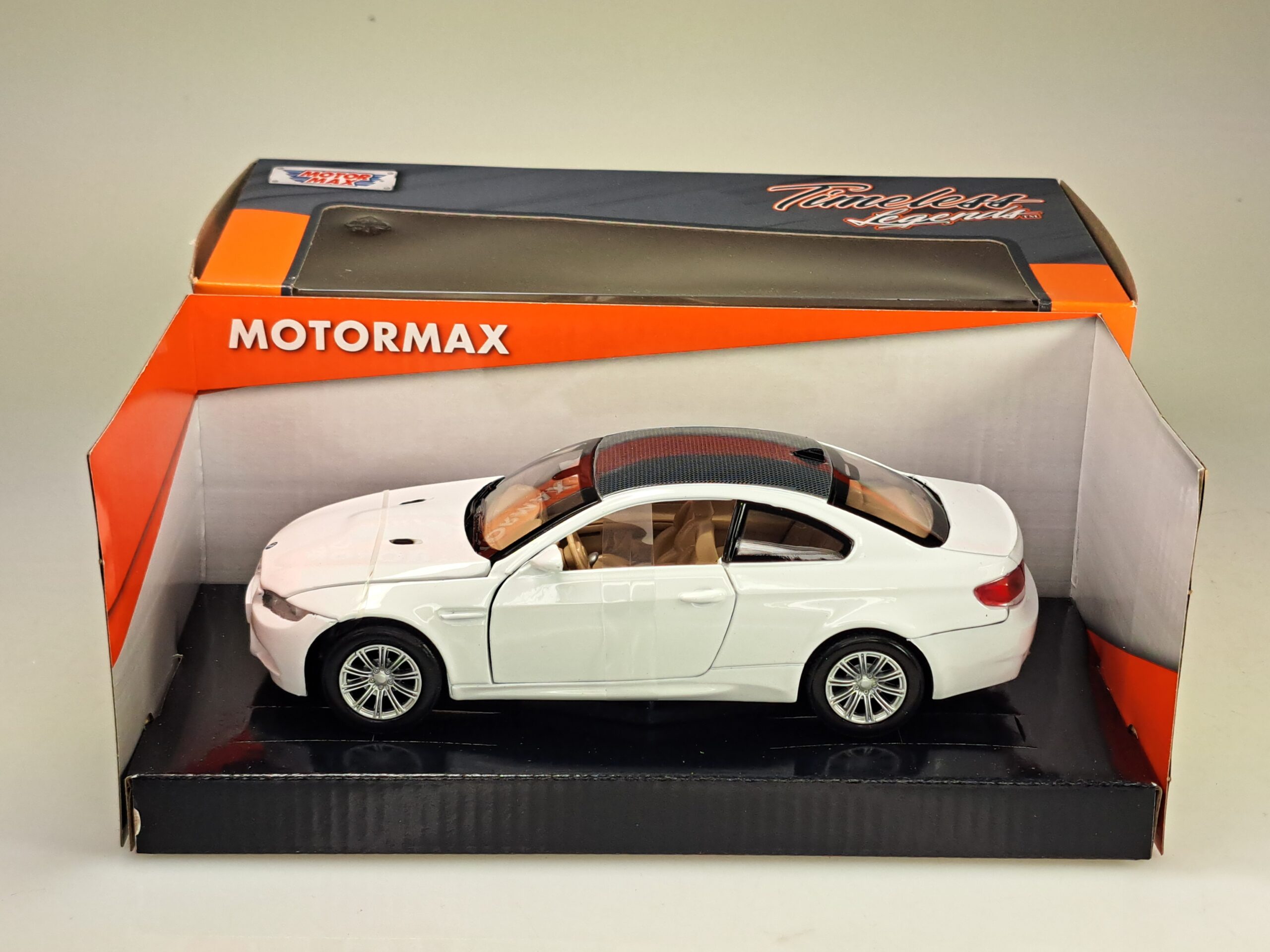Kolekcjonerski model metalowy z elementami plastikowymi samochodu BMW M3 Coupe (E92) z roku 2008 w kolorze Białym.Posiada otwierane drzwi.Model zapakowany w kartonowe pudełko witrynką.