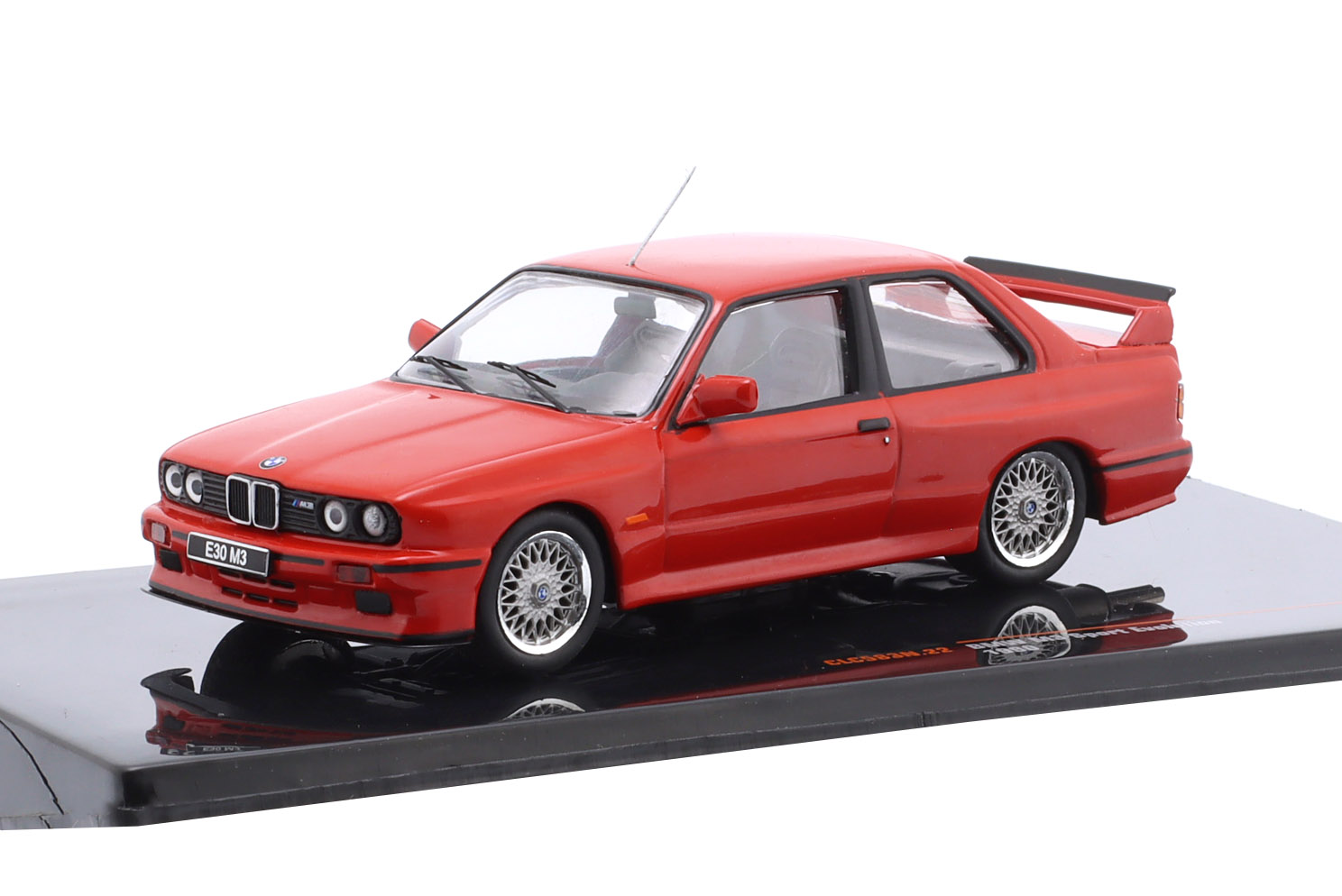 Kolekcjonerski model metalowy z elementami plastikowymi samochodu BMW M3 (E30) z roku 1990 w kolorze Czerwonym.Model nie posiada otwieranych elementów.Model na plastikowej podstawce,posiada akrylową gablotkę ekspozycyjną.
