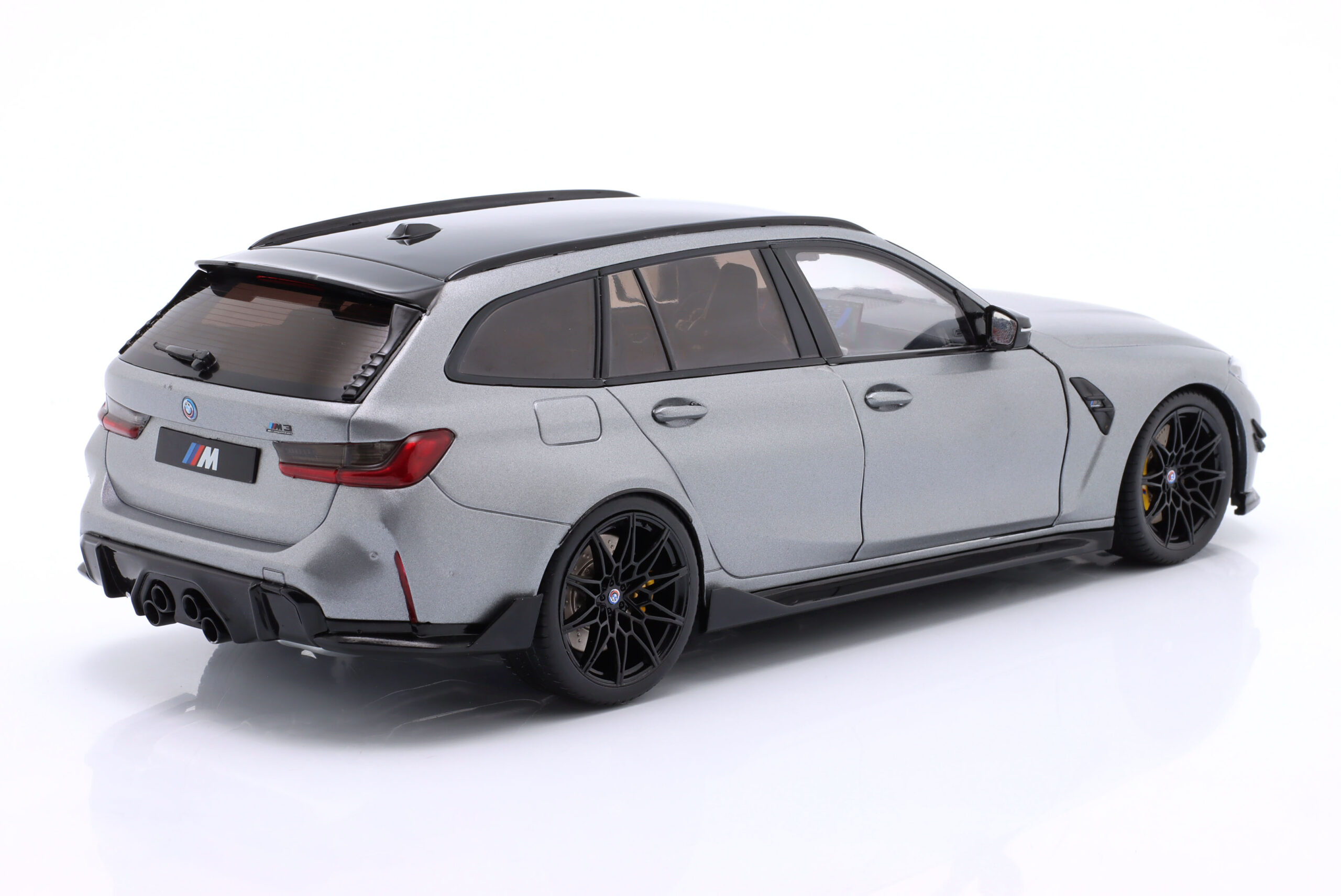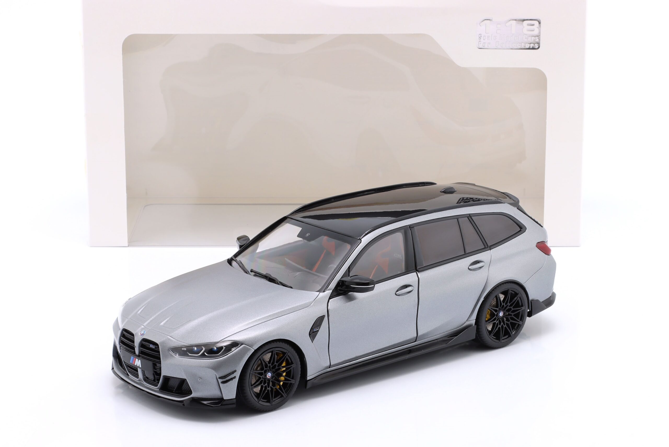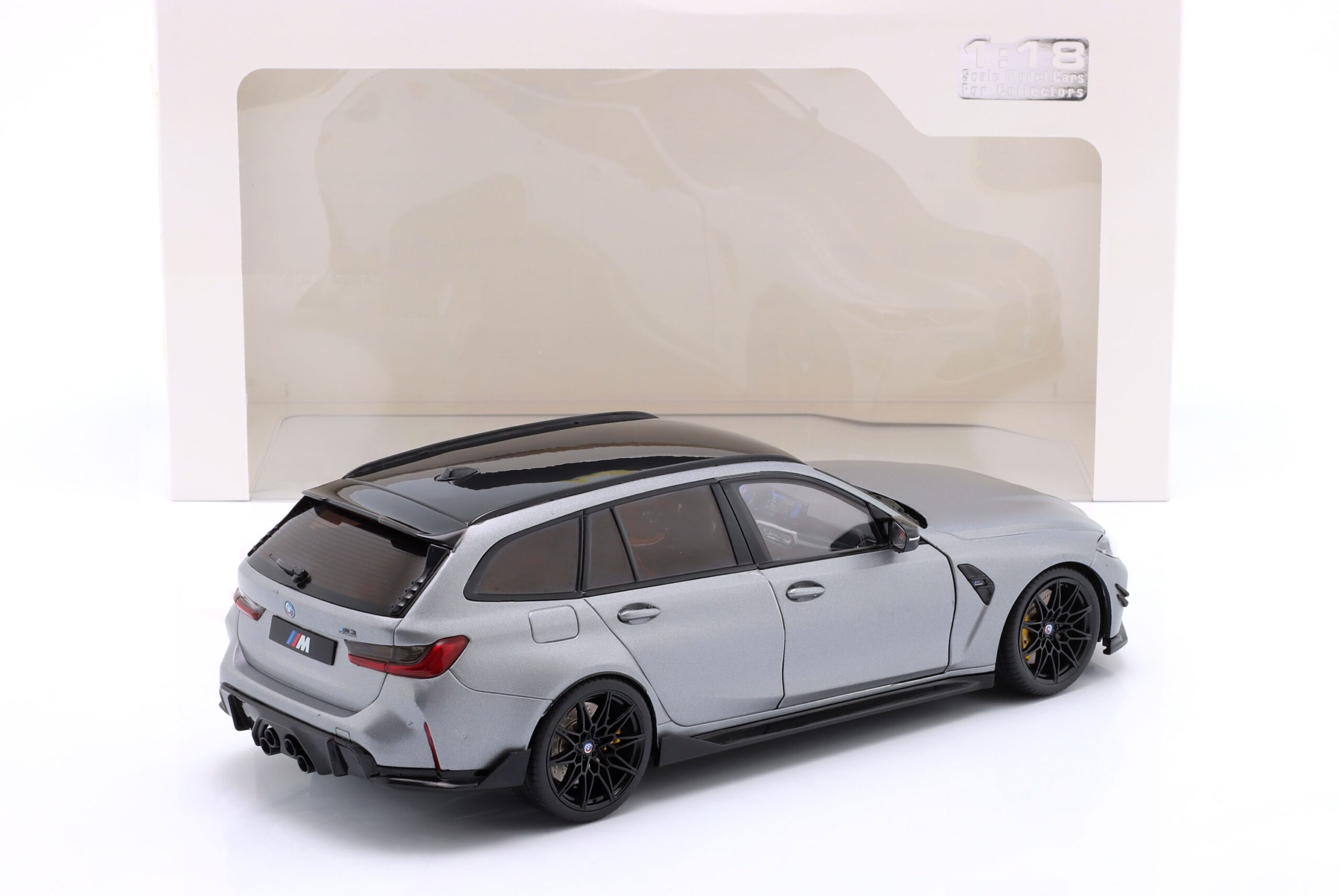 Kolekcjonerski model metalowy z elementami plastikowymi samochodu BMW M3 (G81) Competition M XDrive Touring z roku 2024 w kolorze Frozen Grey pure metallic.Model posiada otwierane drzwi.