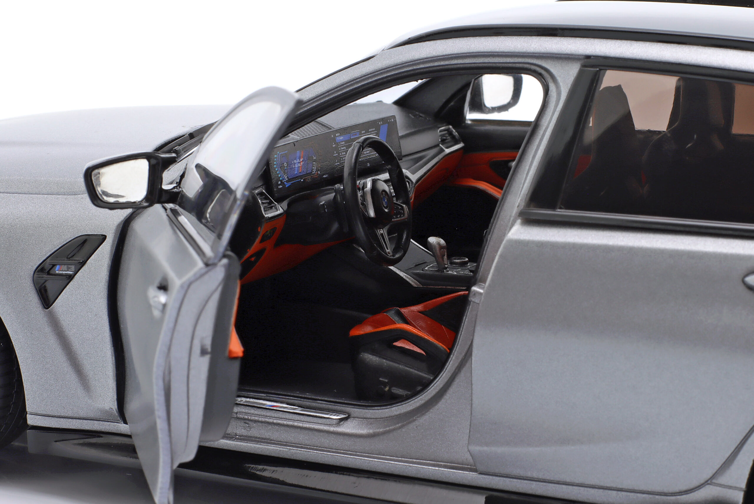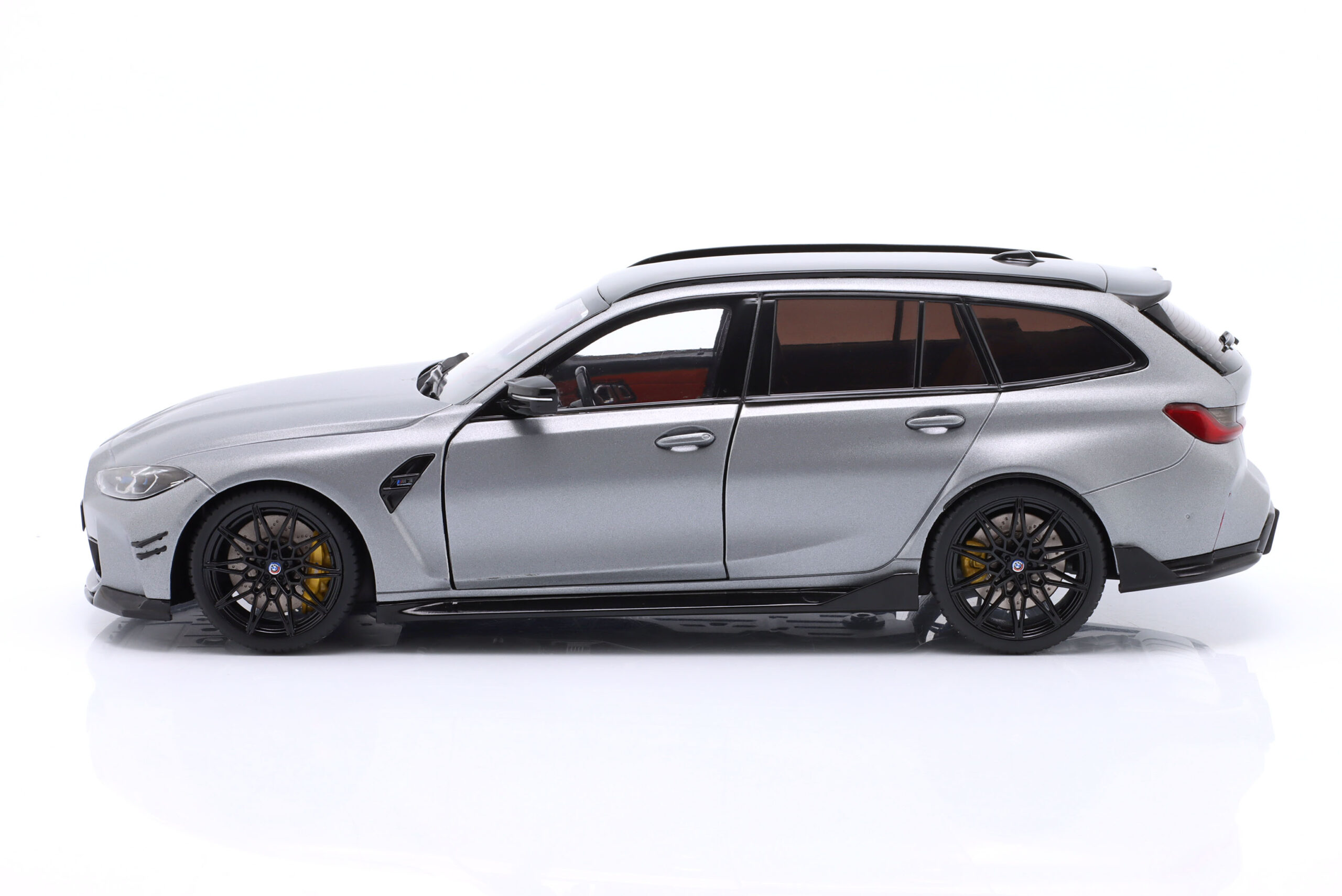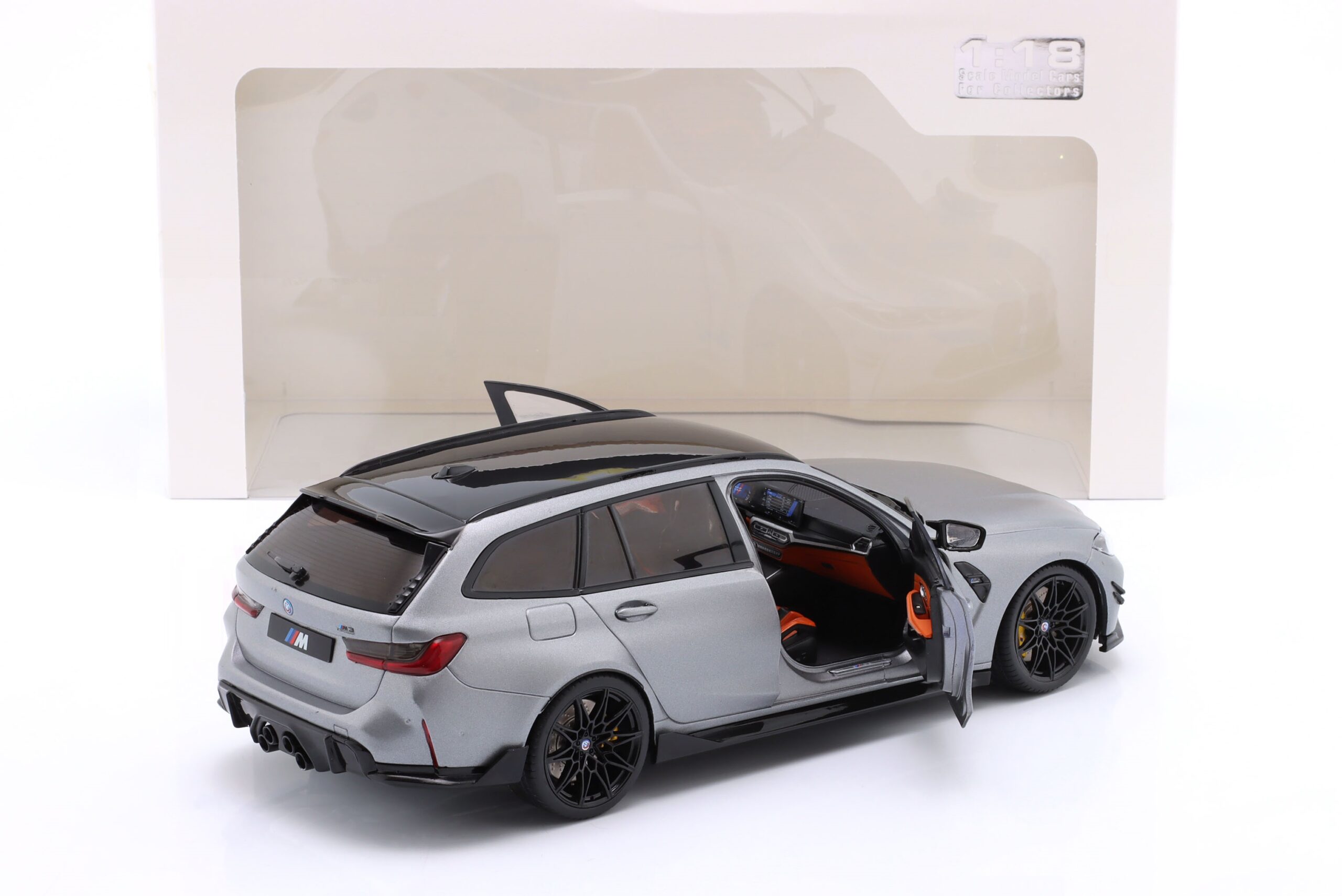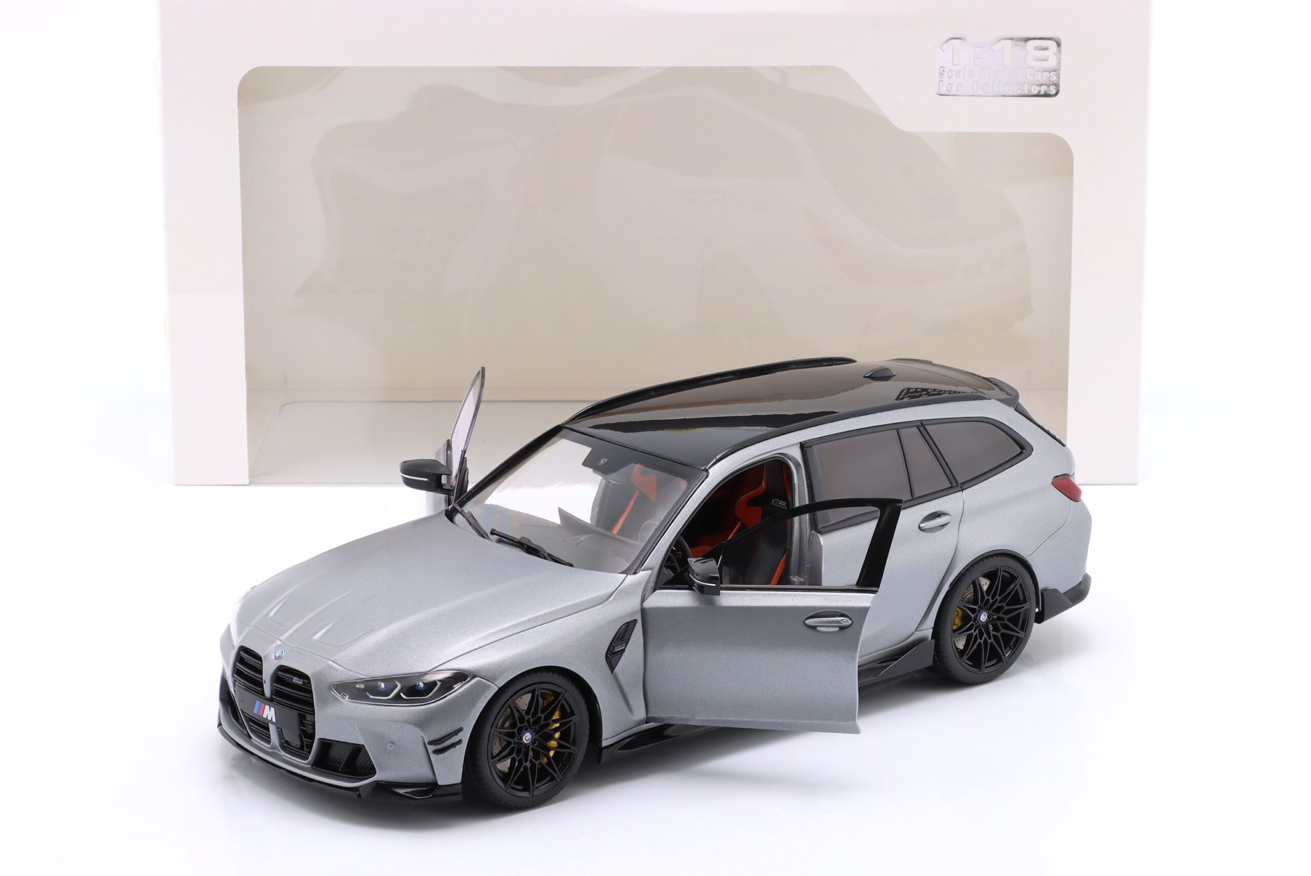 Kolekcjonerski model metalowy z elementami plastikowymi samochodu BMW M3 (G81) Competition M XDrive Touring z roku 2024 w kolorze Frozen Grey pure metallic.Model posiada otwierane drzwi.