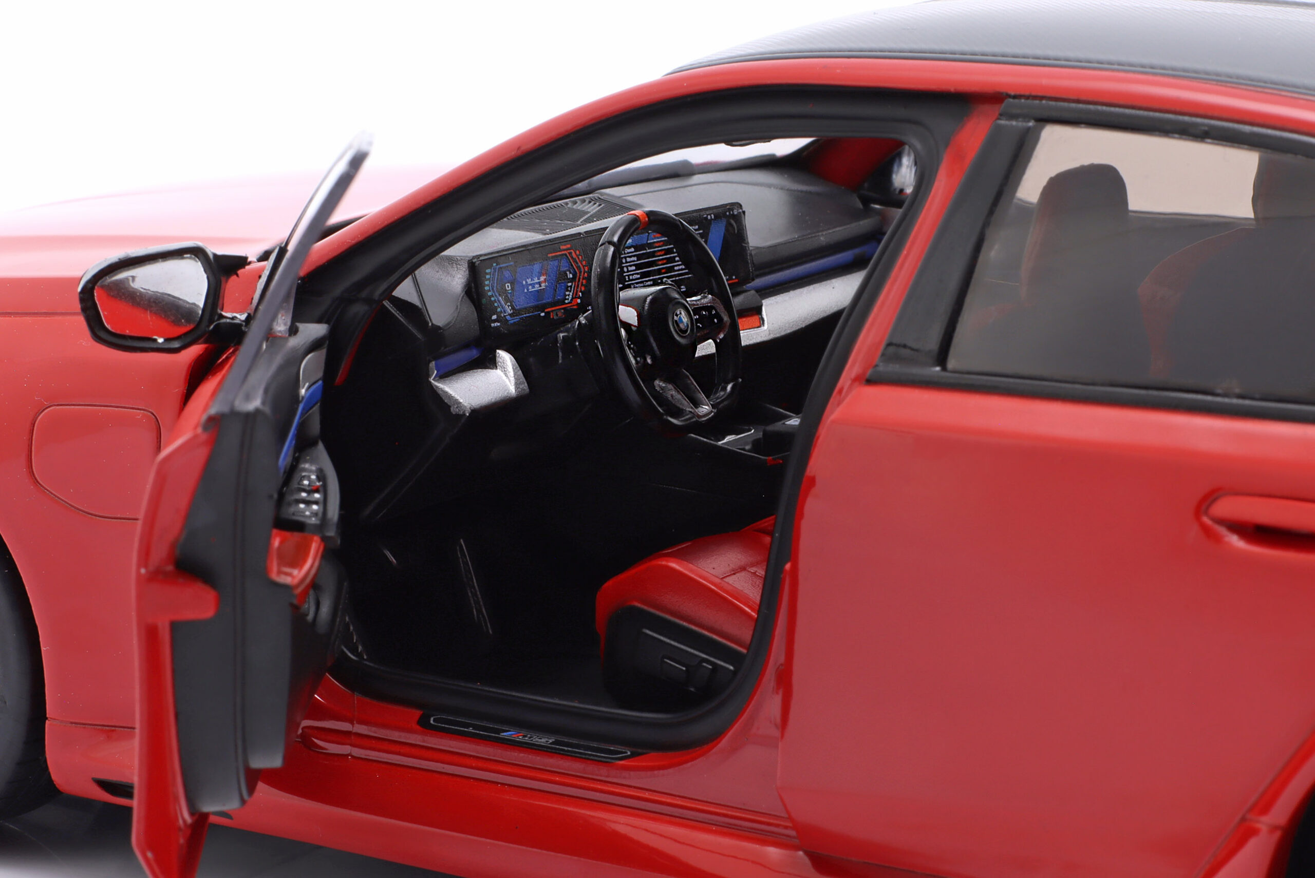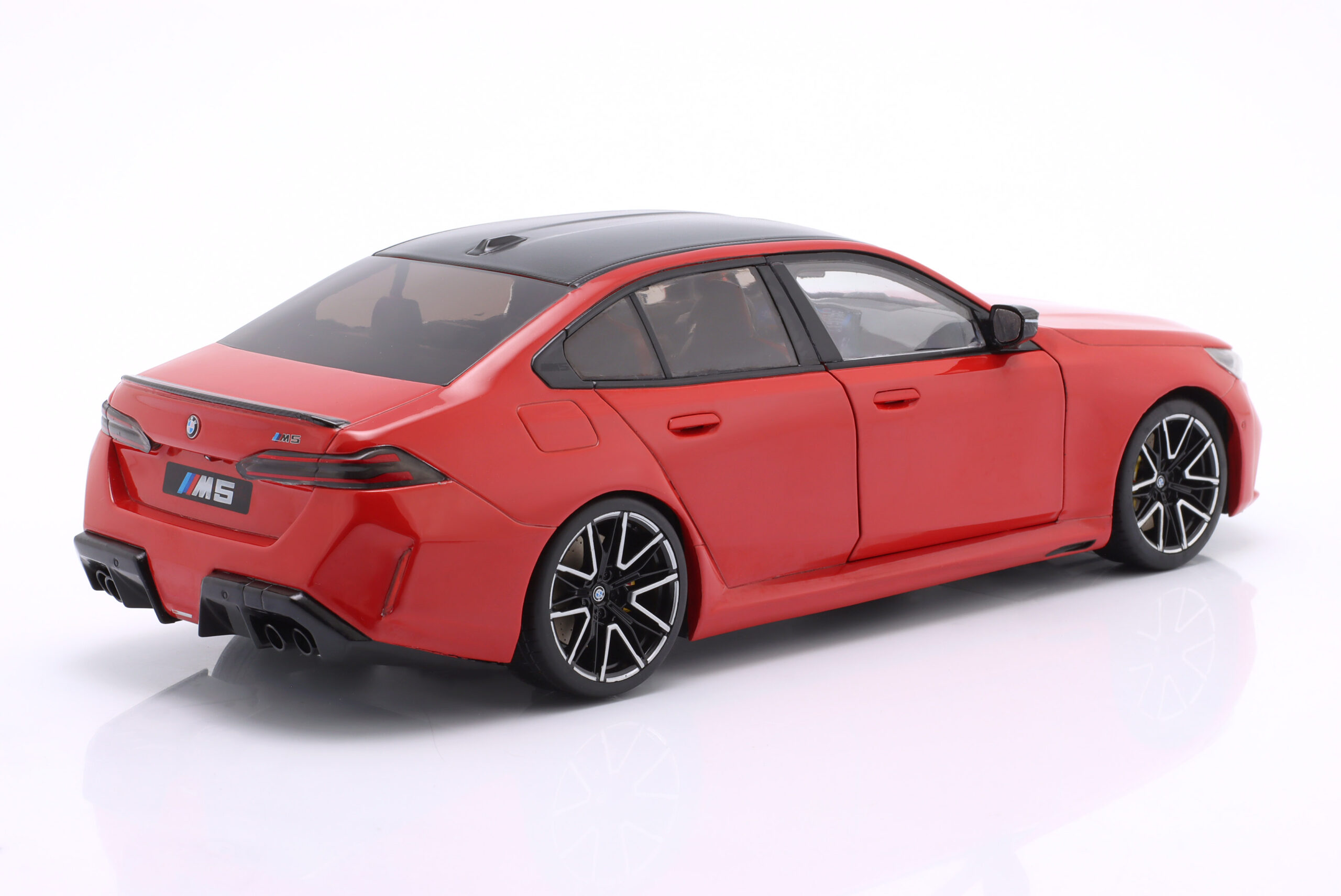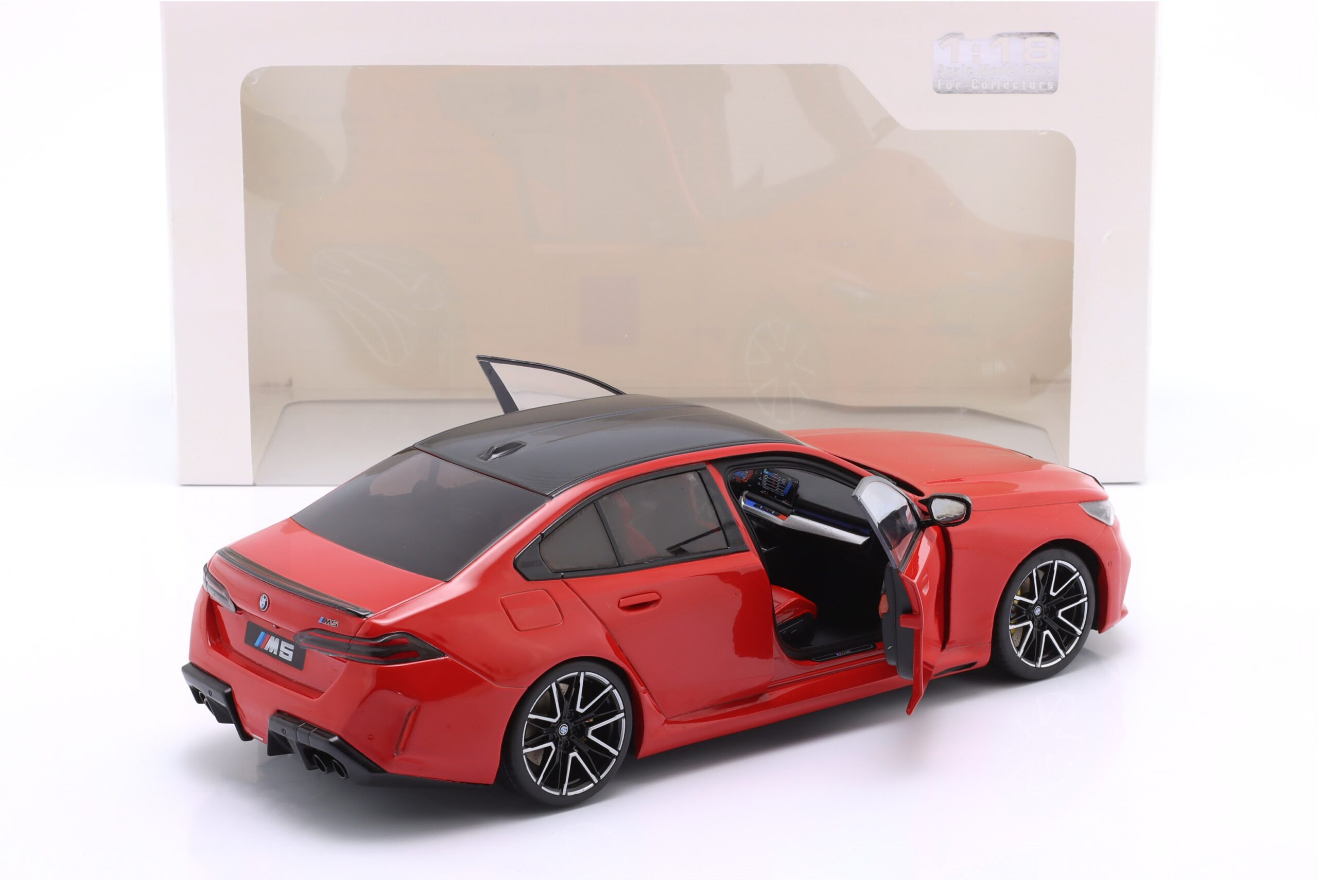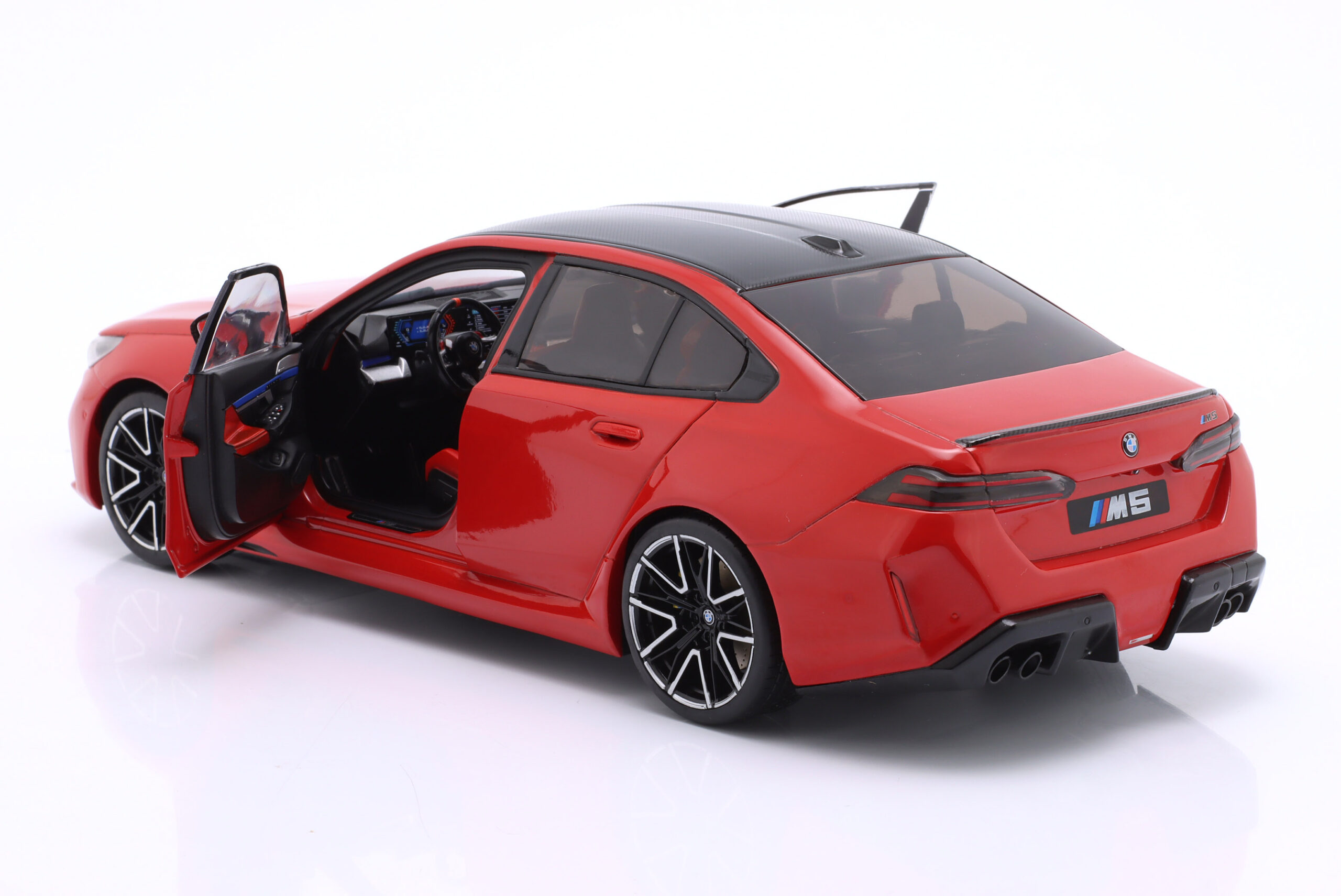 Kolekcjonerski model metalowy z elementami plastikowymi samochodu BMW M5 (G90) z roku 2025 w kolorze Fire Red.Model posiada otwierane drzwi.