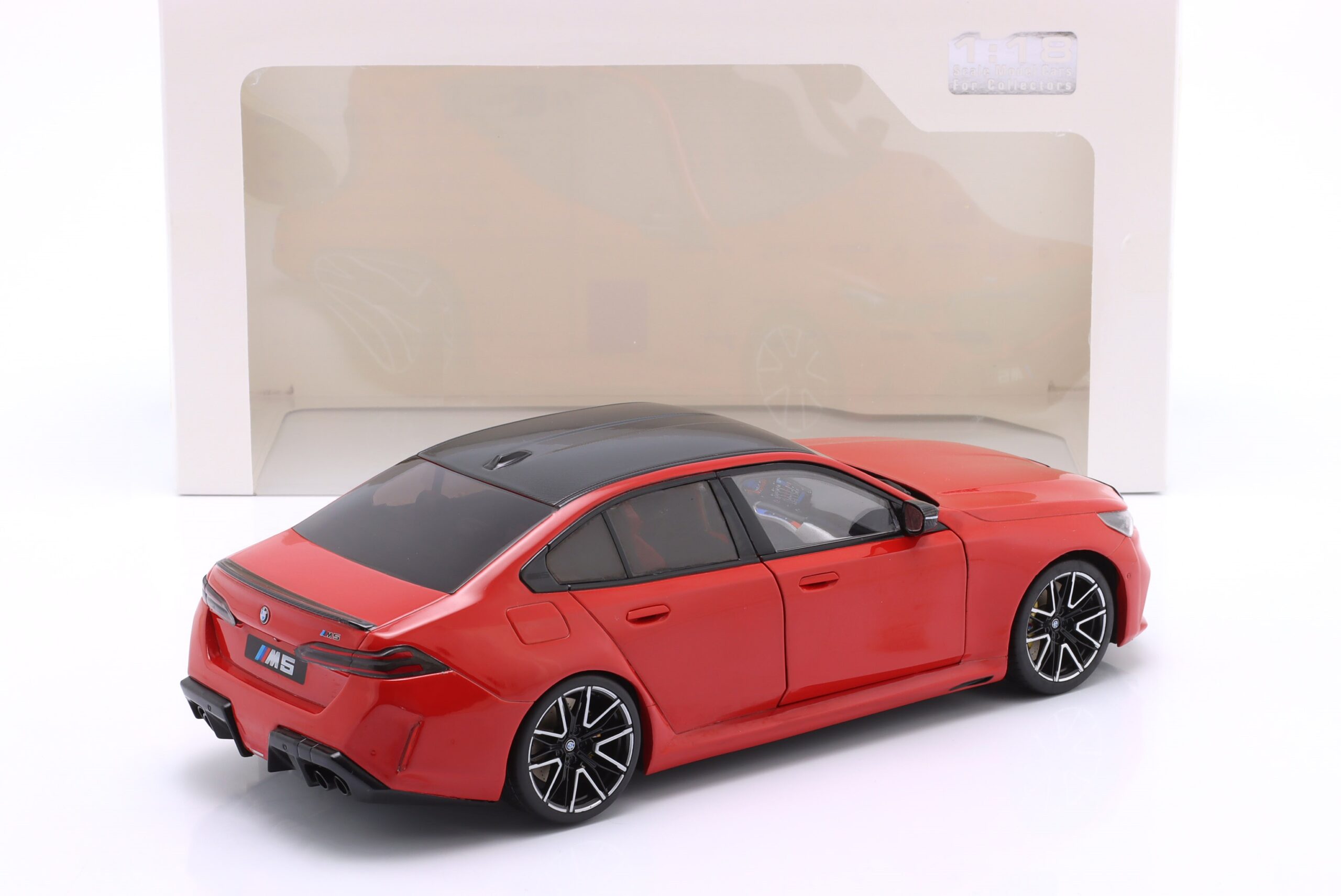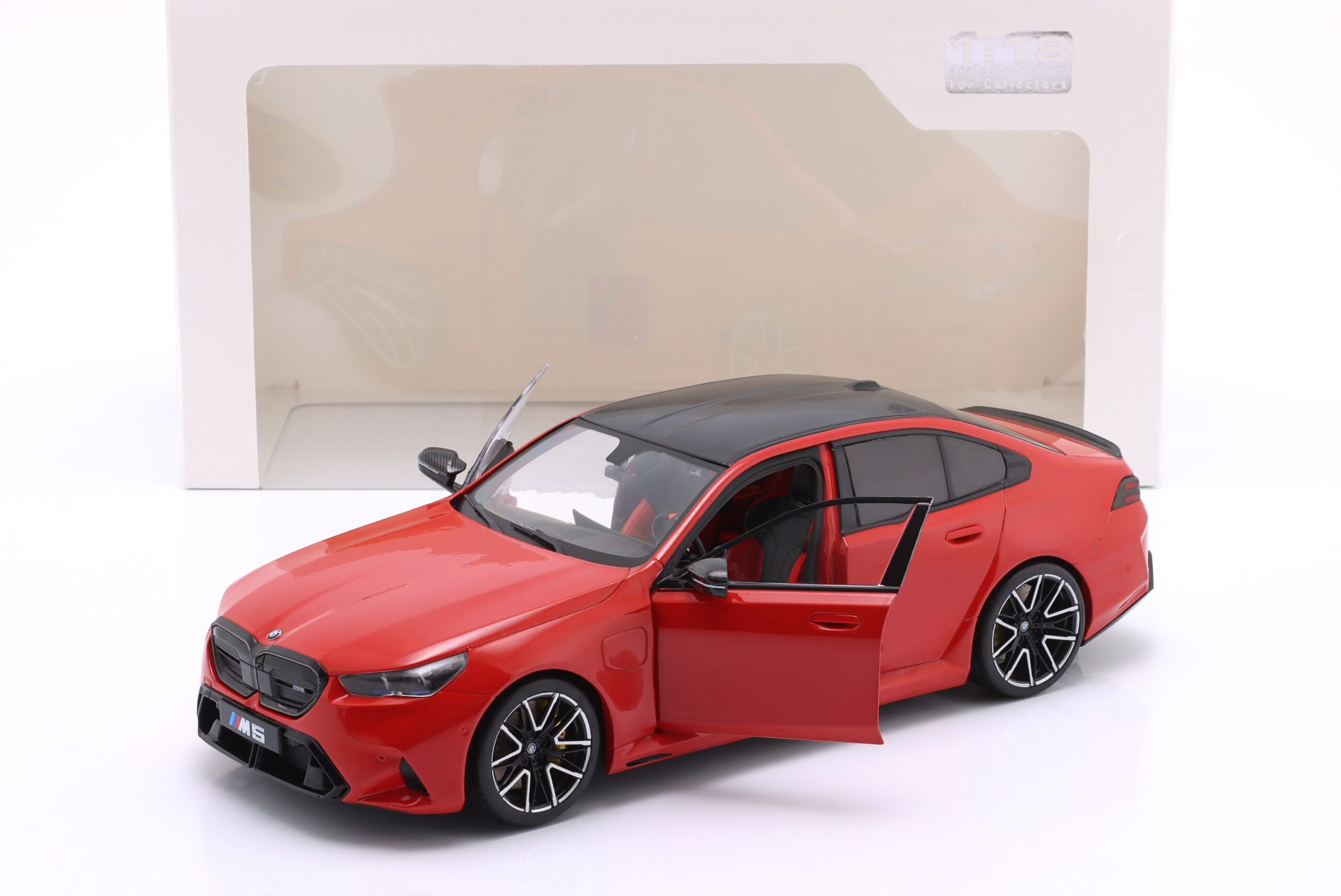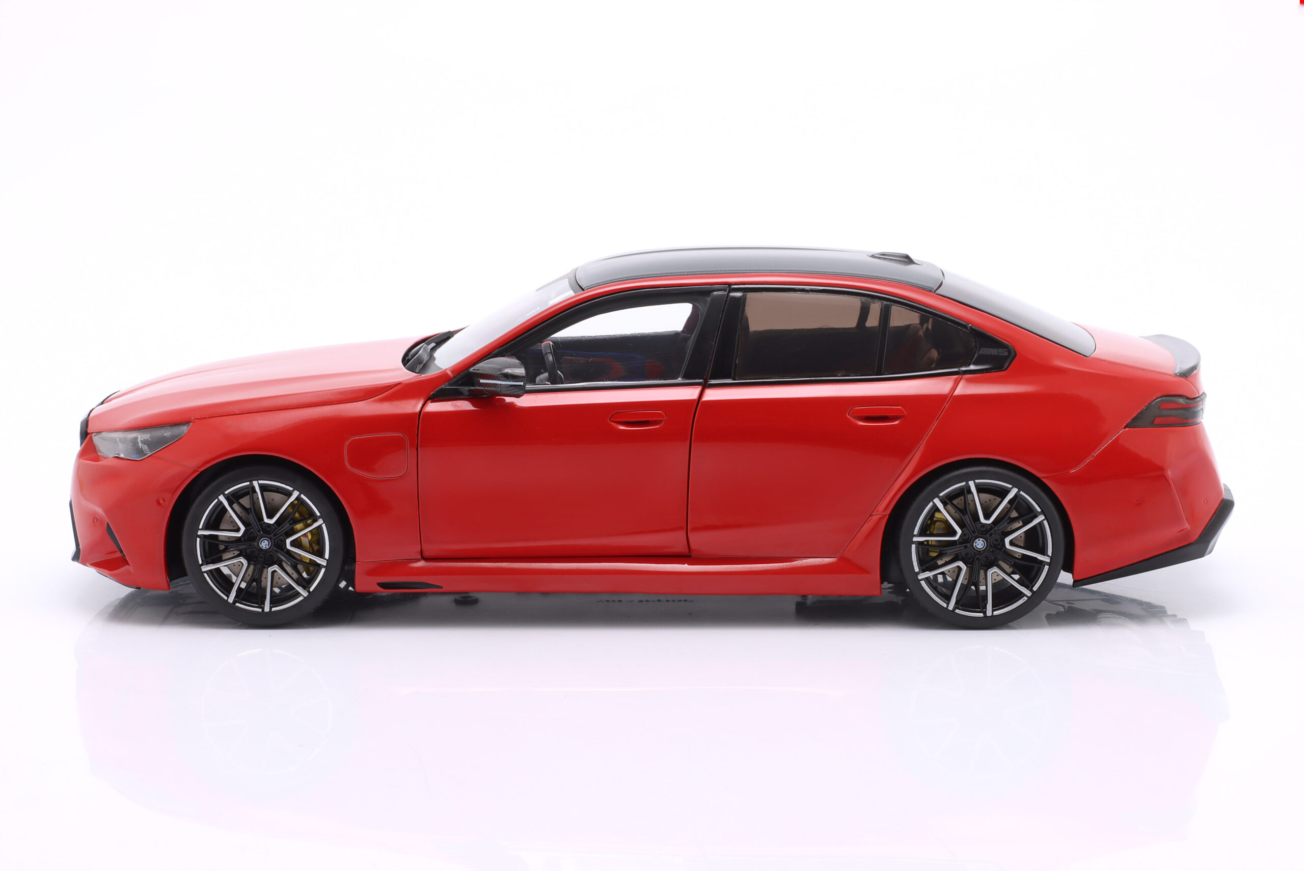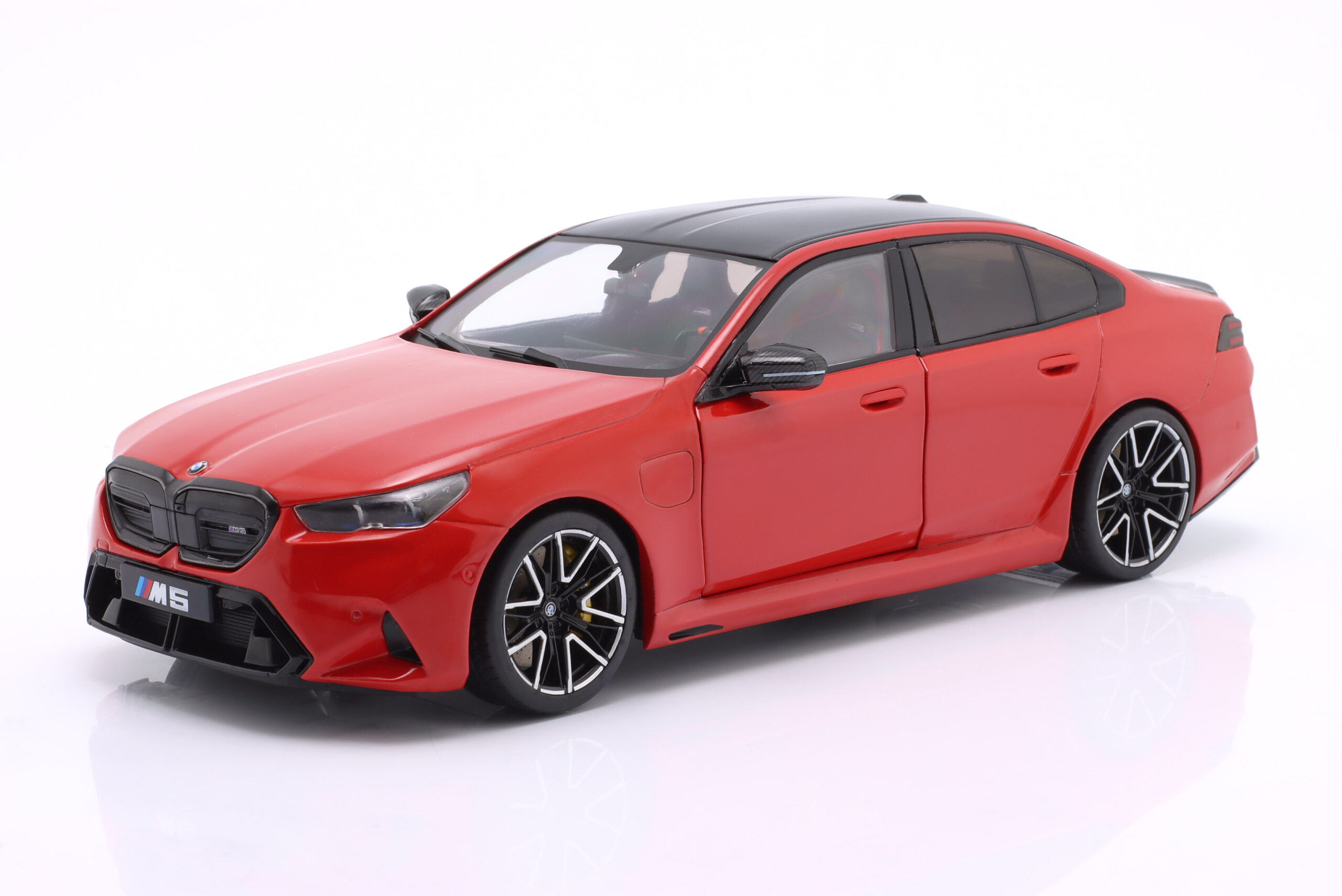 Kolekcjonerski model metalowy z elementami plastikowymi samochodu BMW M5 (G90) z roku 2025 w kolorze Fire Red.Model posiada otwierane drzwi.
