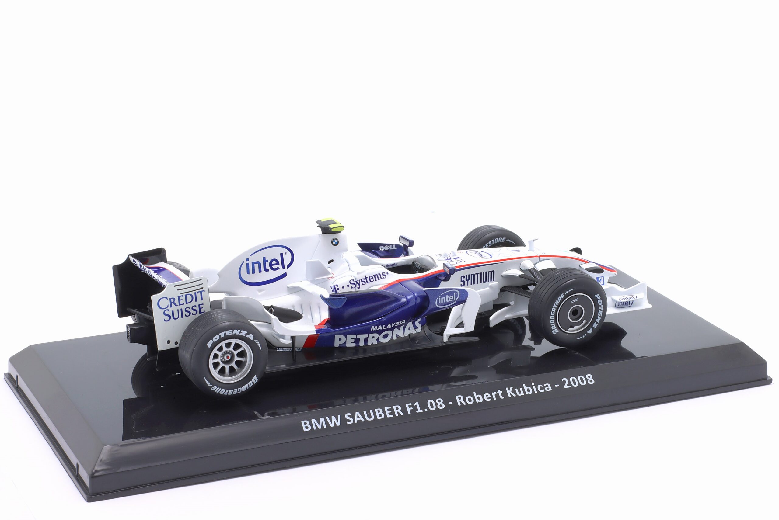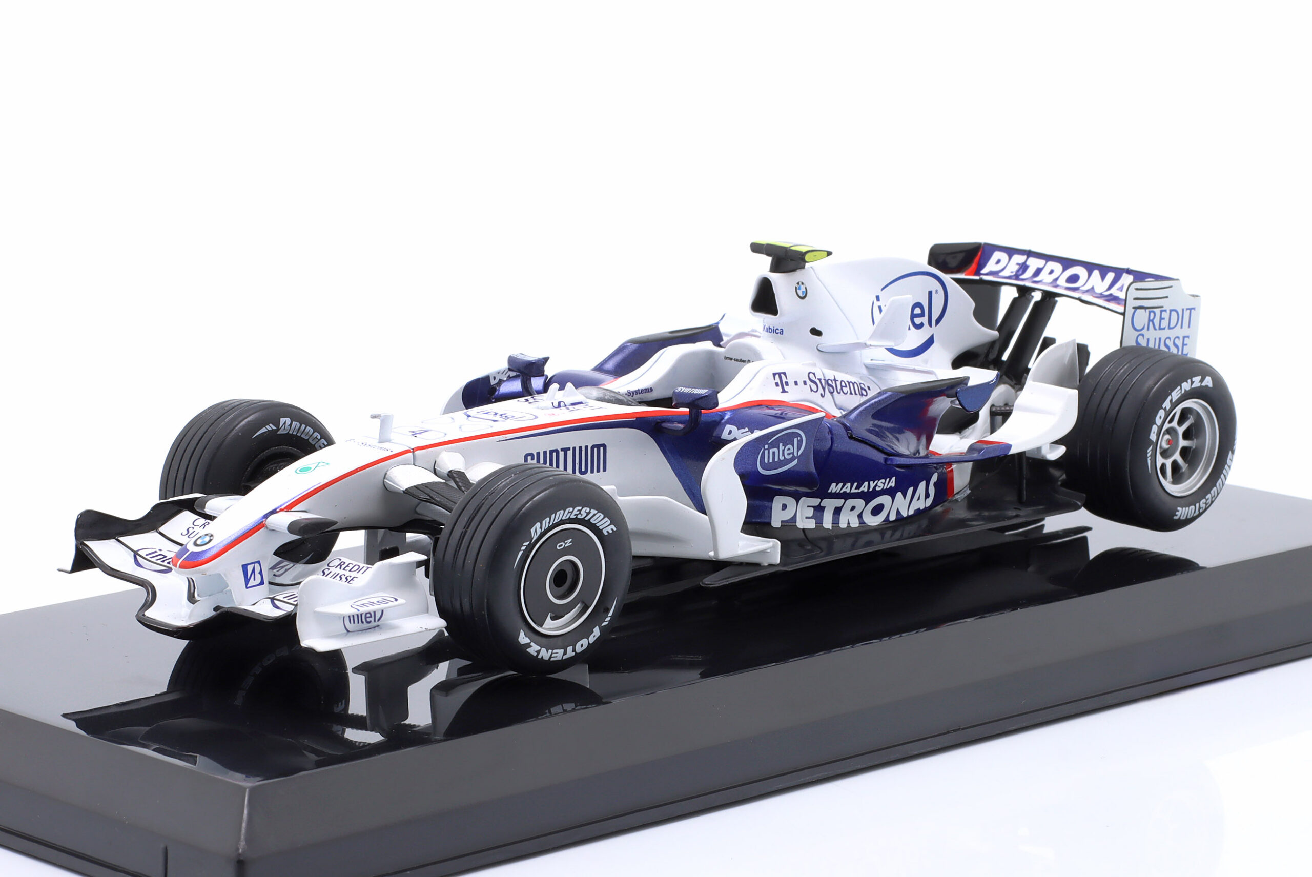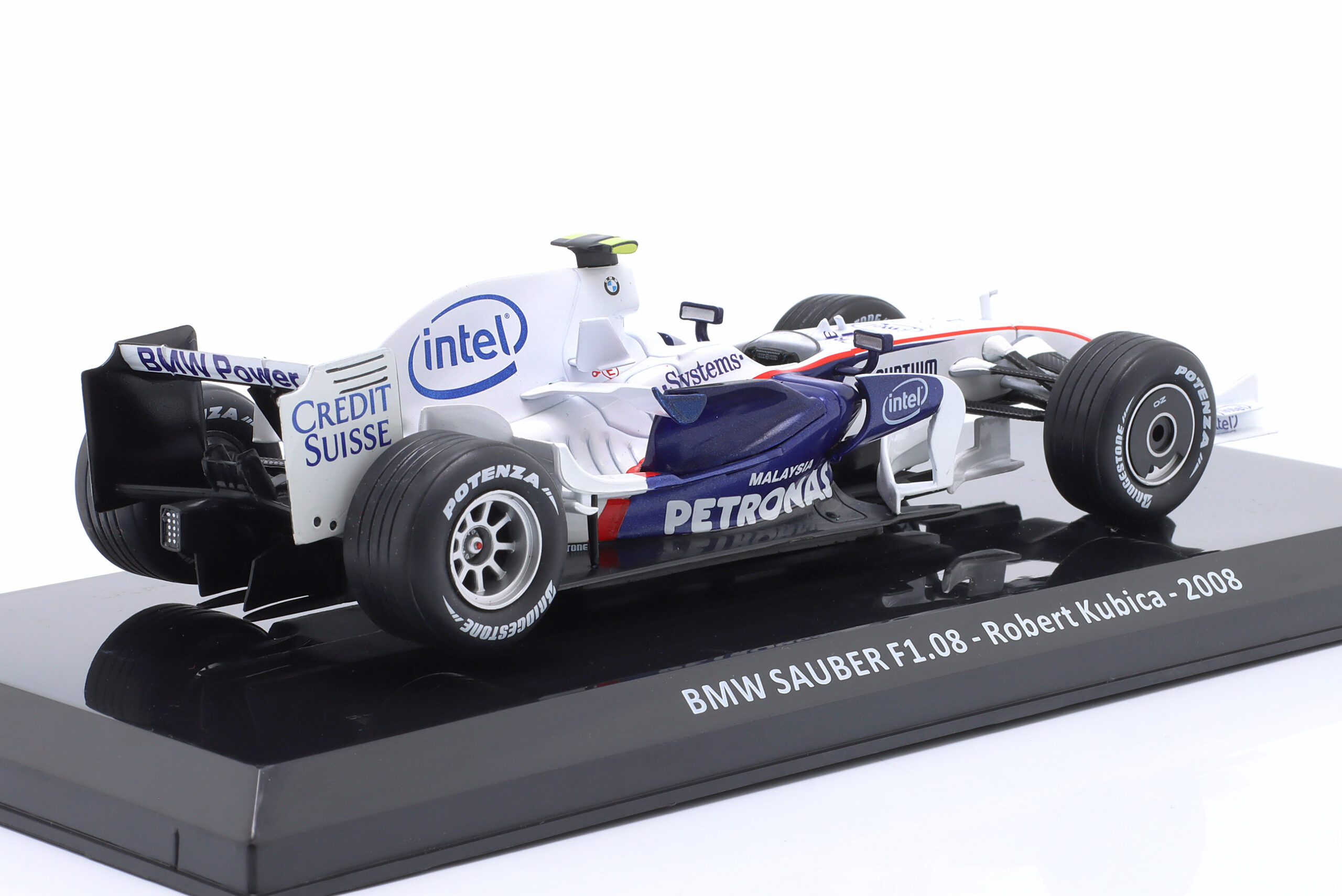 Kolekcjonerski model metalowy z elementami plastikowymi bolidu Formuły 1 BMW Sauber F1.08 #4w którym Robert Kubica startował w sezonie 2008.Model na podstawce,zapakowany w blister.