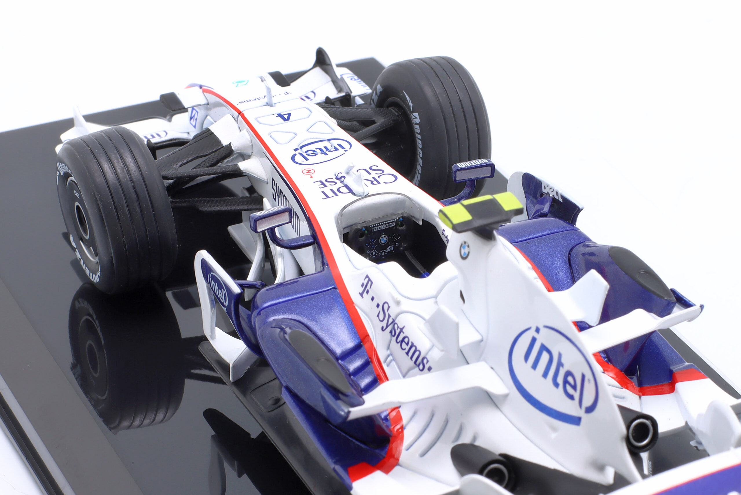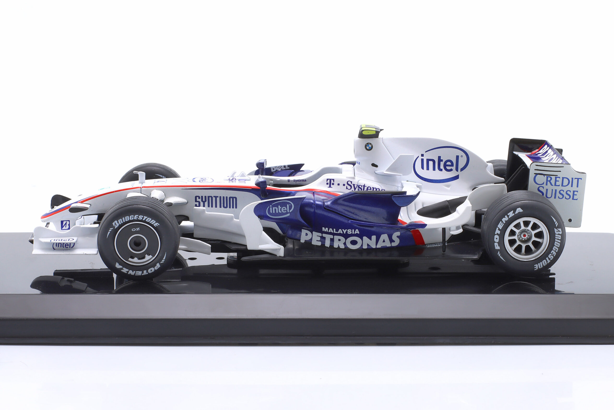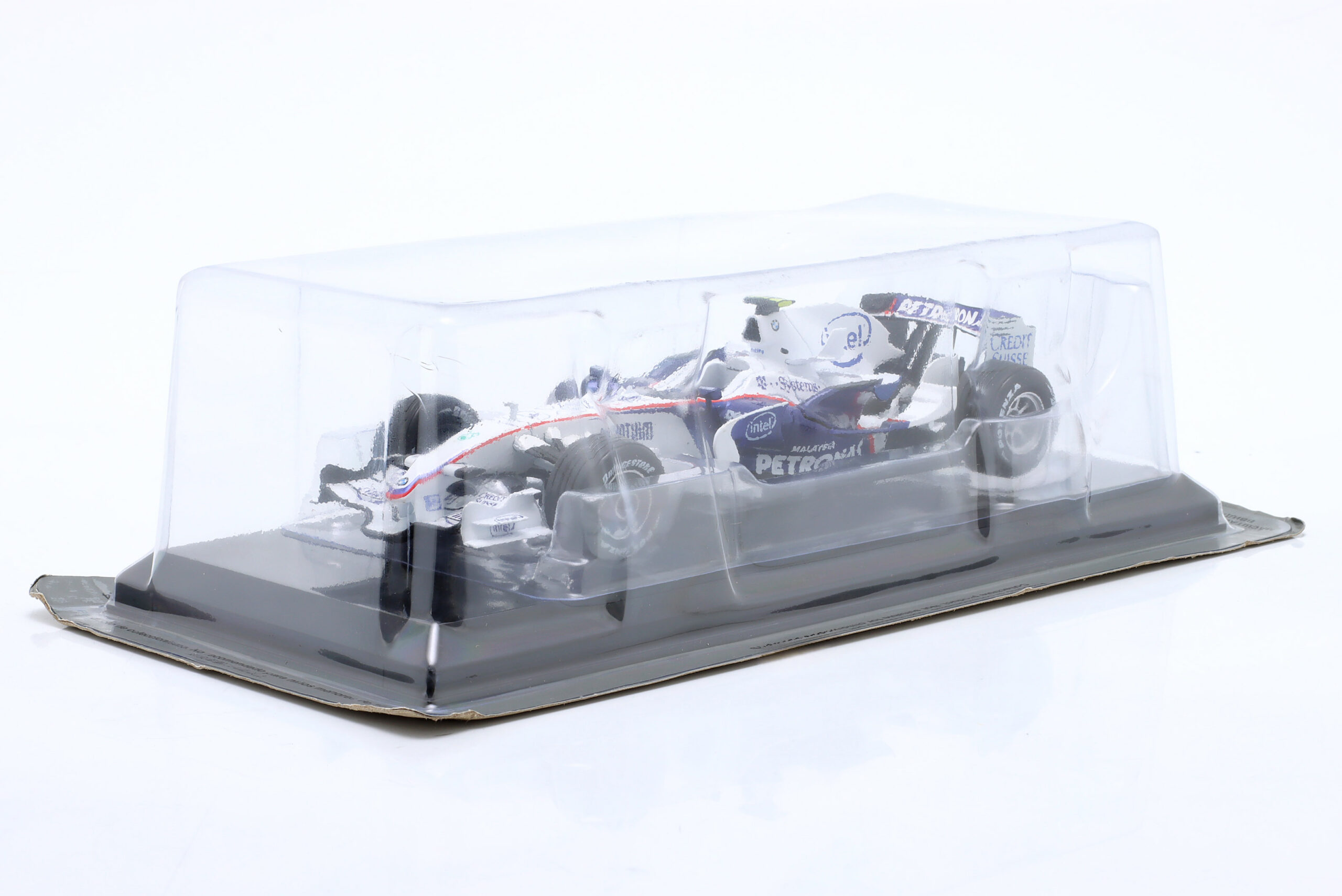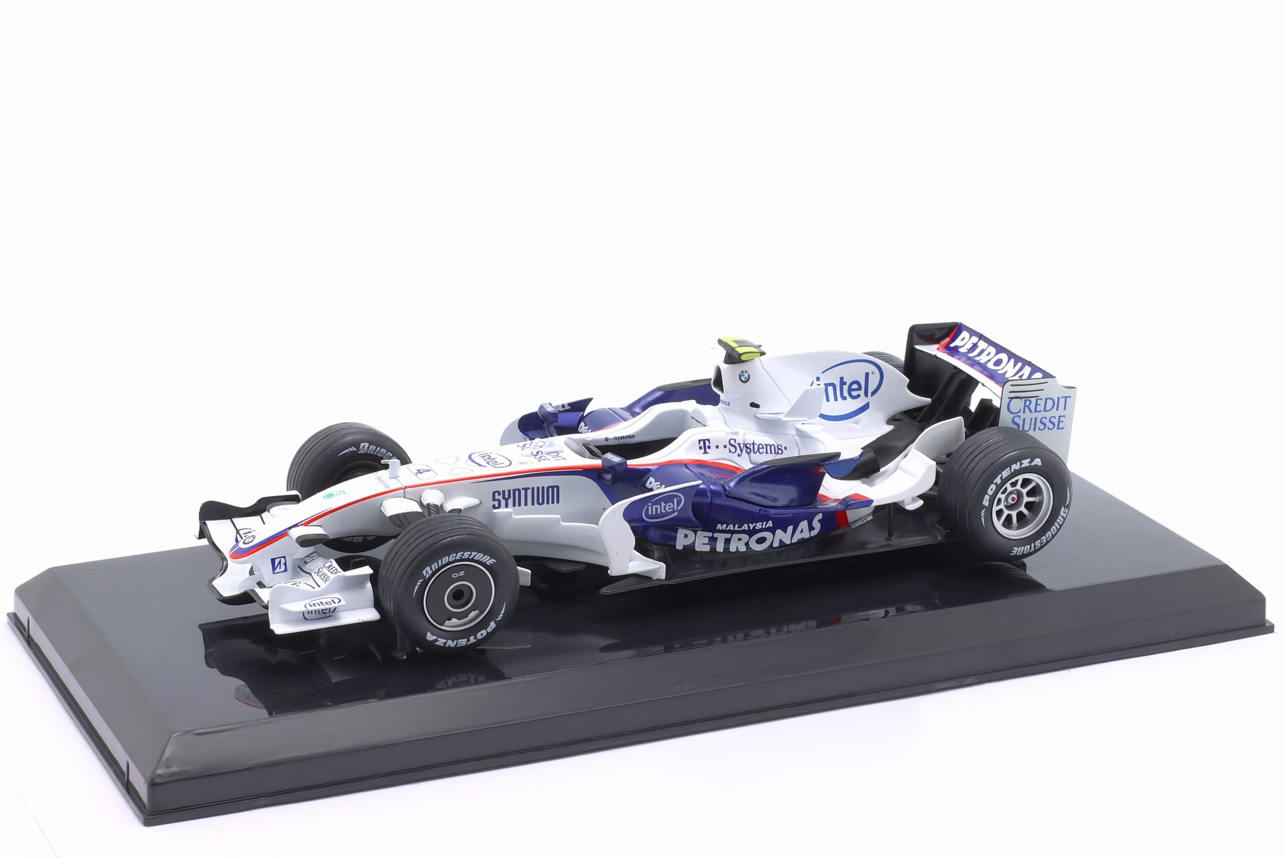 Kolekcjonerski model metalowy z elementami plastikowymi bolidu Formuły 1 BMW Sauber F1.08 #4w którym Robert Kubica startował w sezonie 2008.Model na podstawce,zapakowany w blister.
