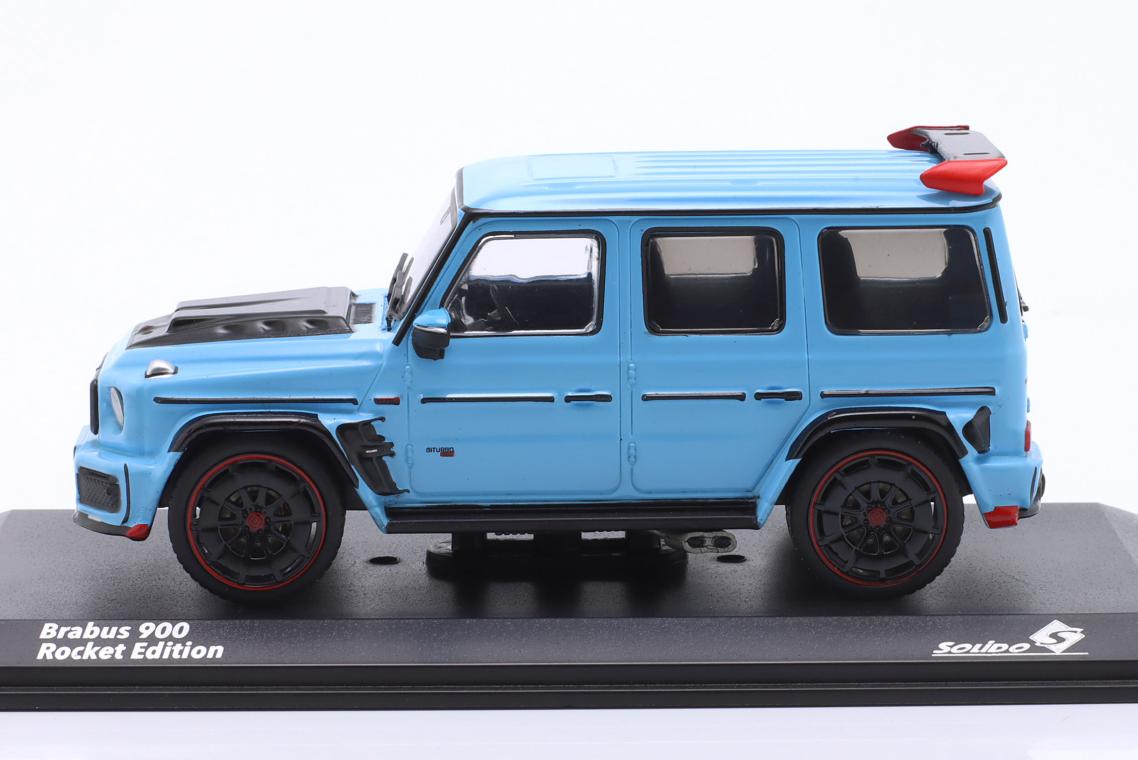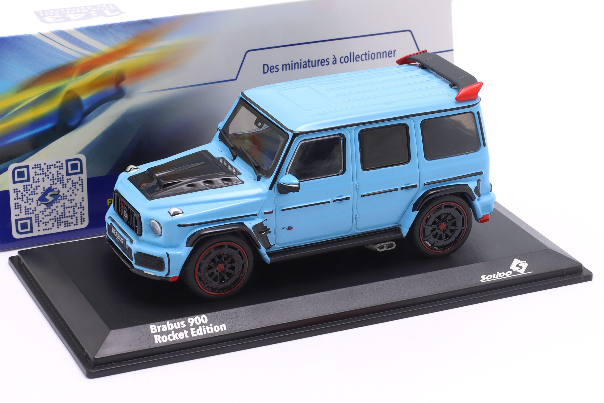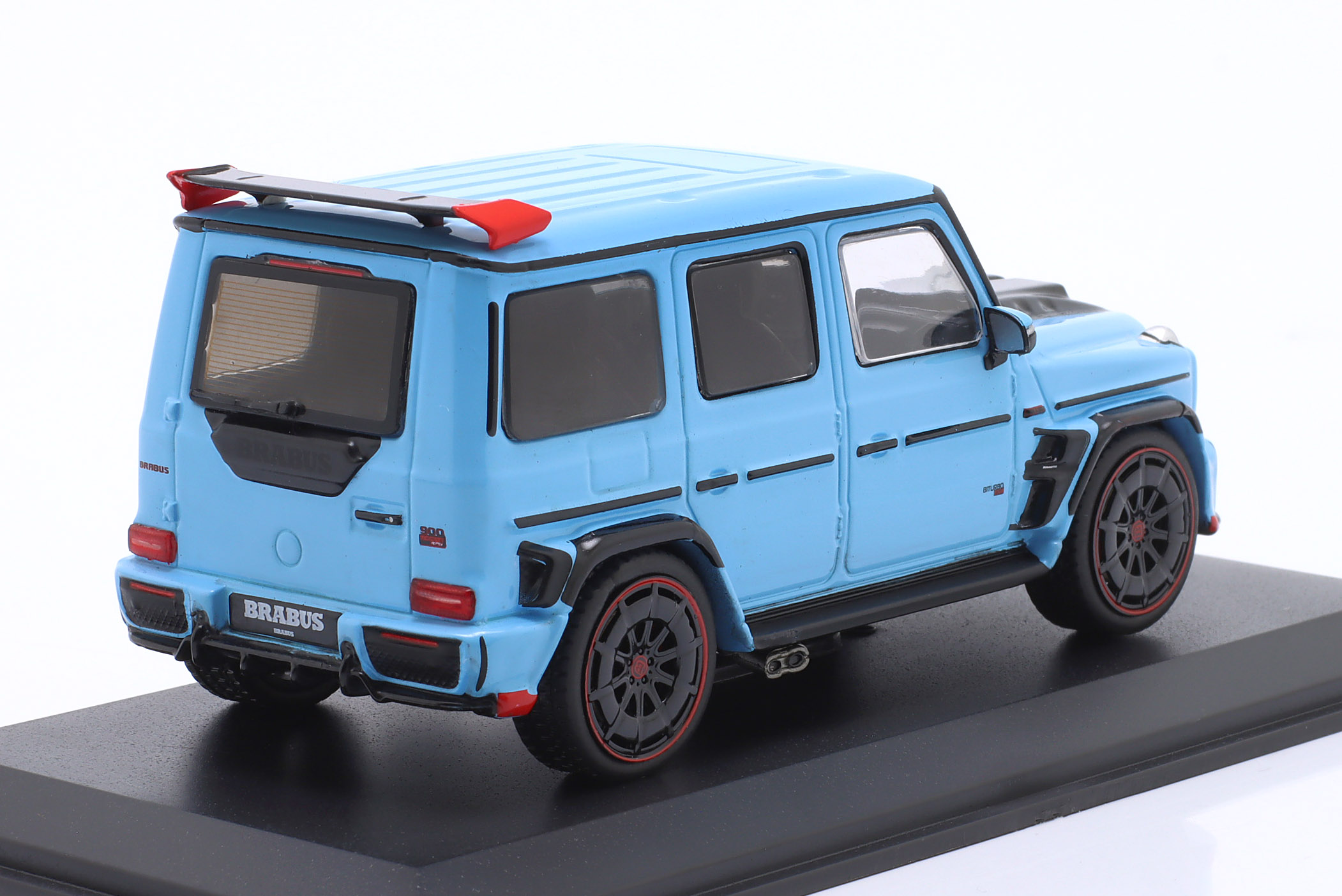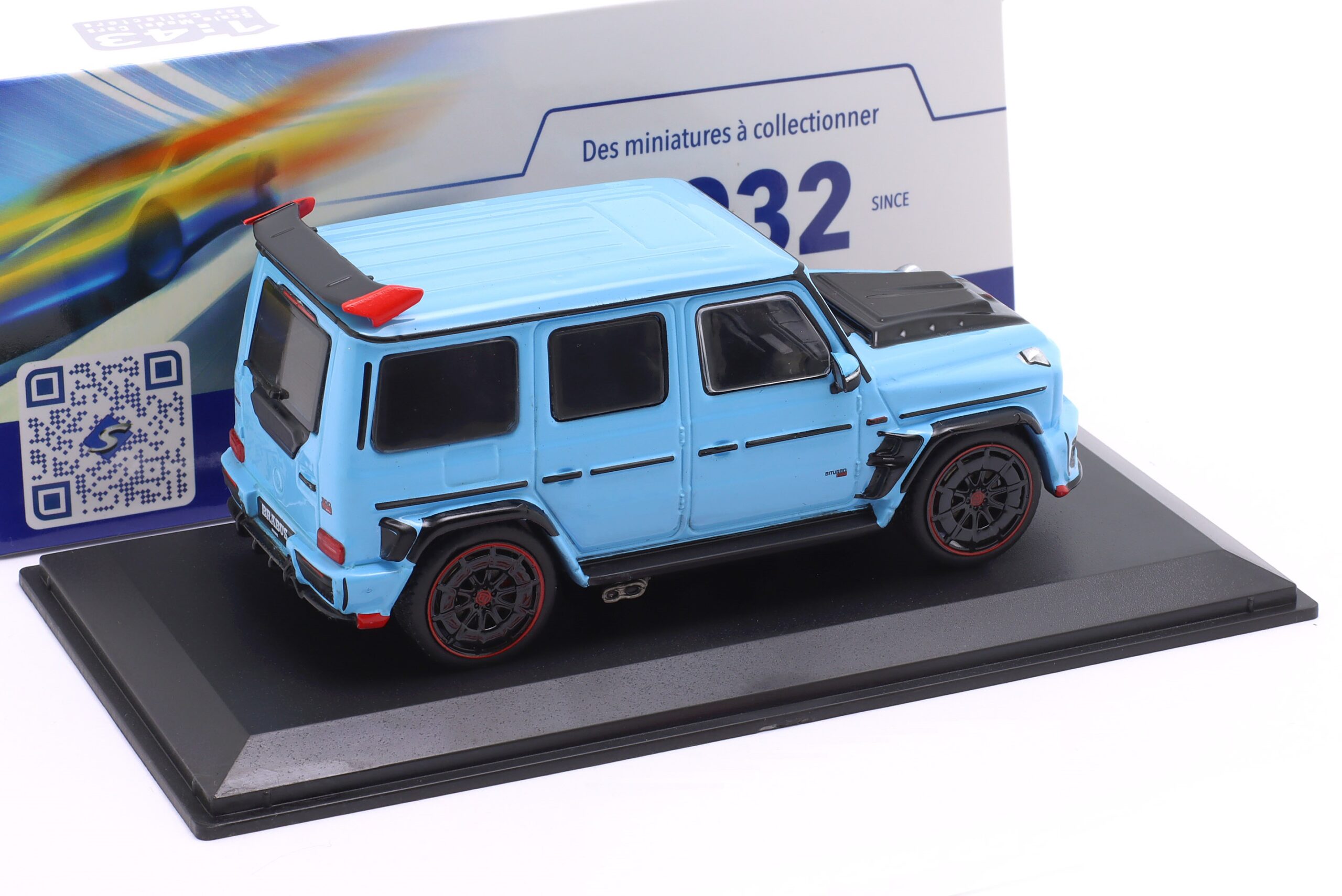 Kolekcjonerski model metalowy z elementami plastikowymi samochodu BRABUS 900 Rocket Edition (MERCEDES G-Class) z roku 2021 w kolorze China blue.Model posiada podstawkę oraz gablotkę ekspozycyjną.