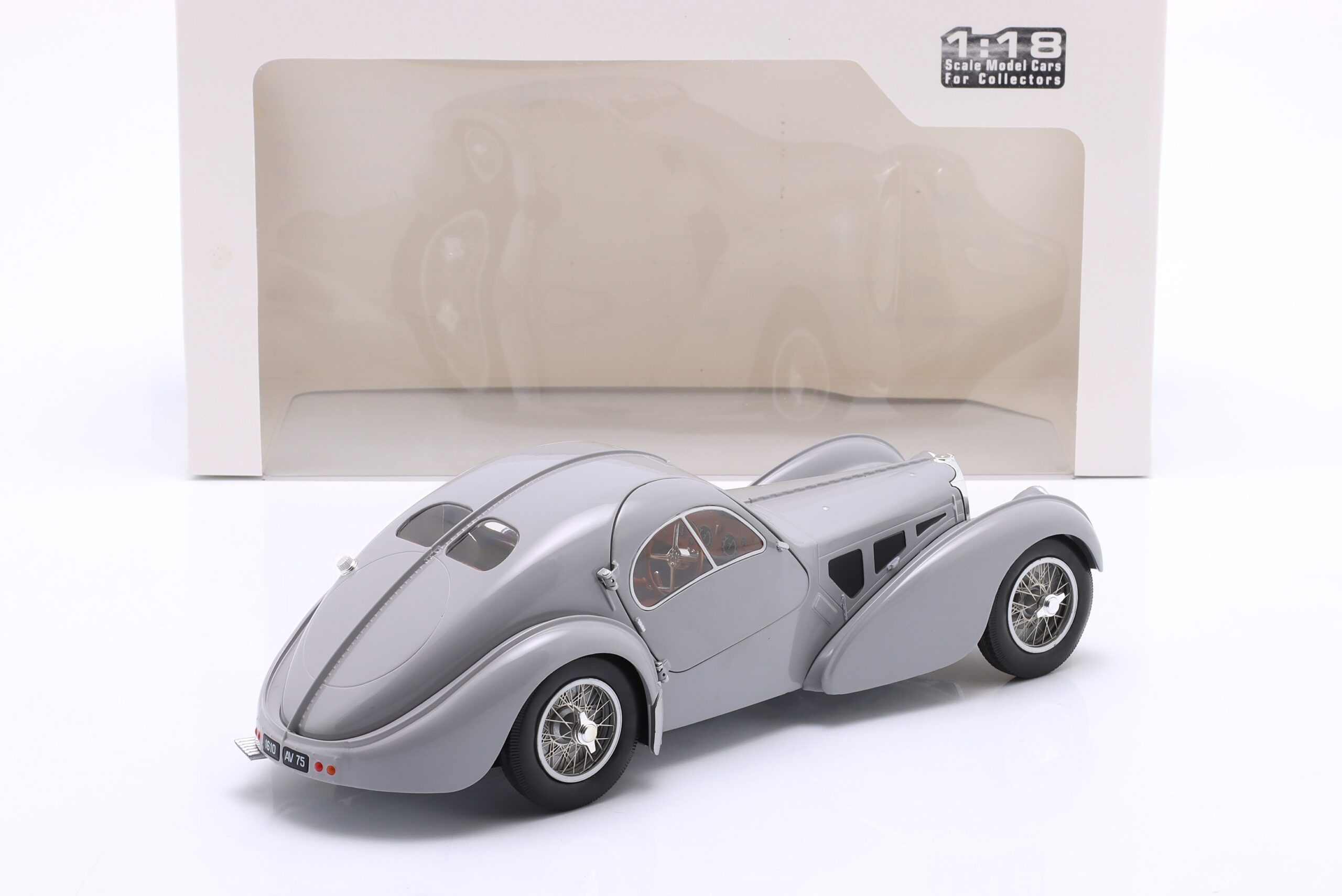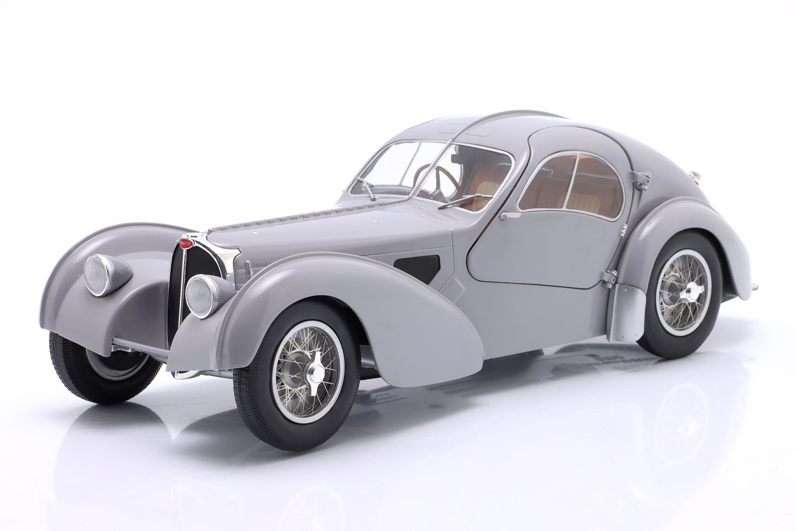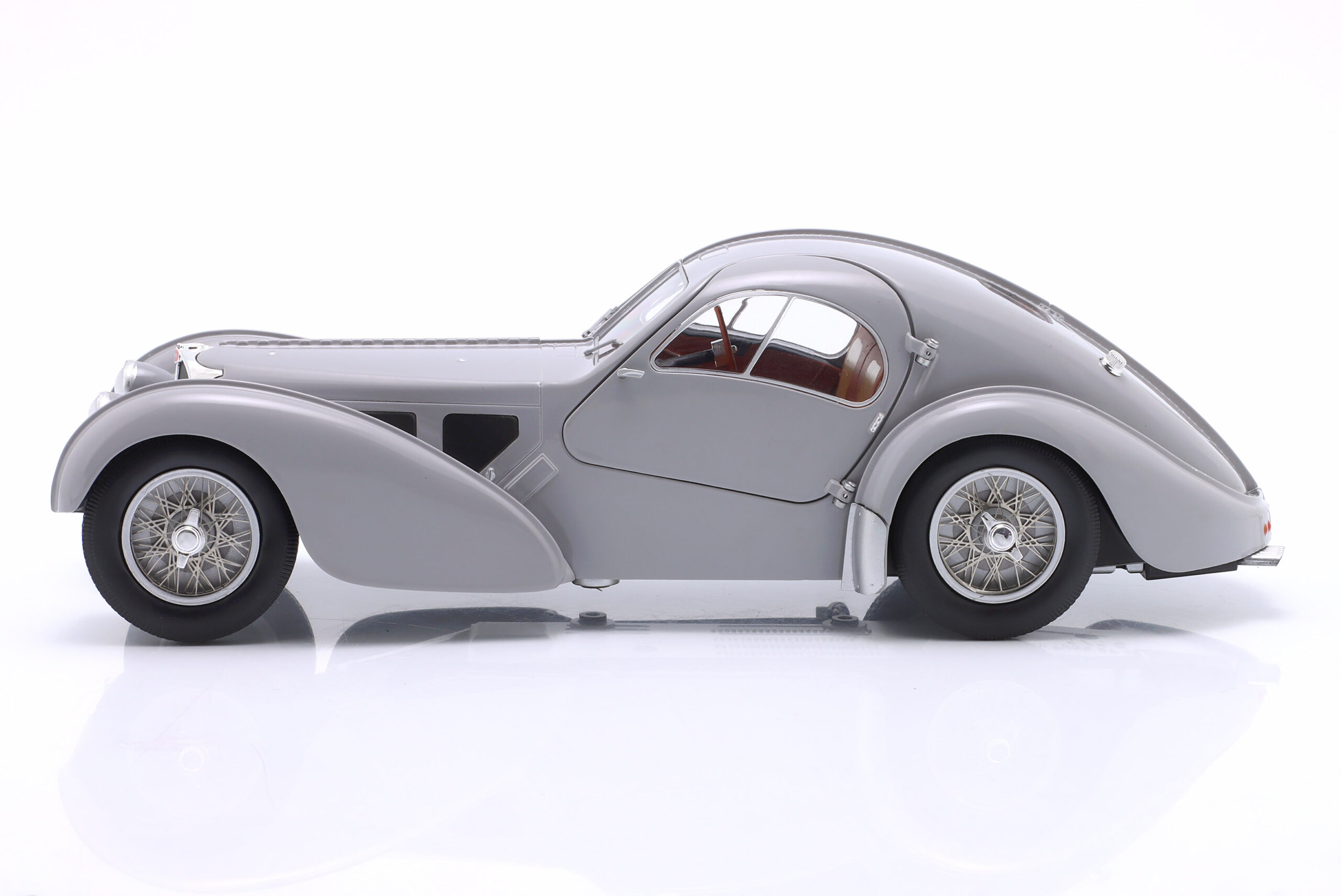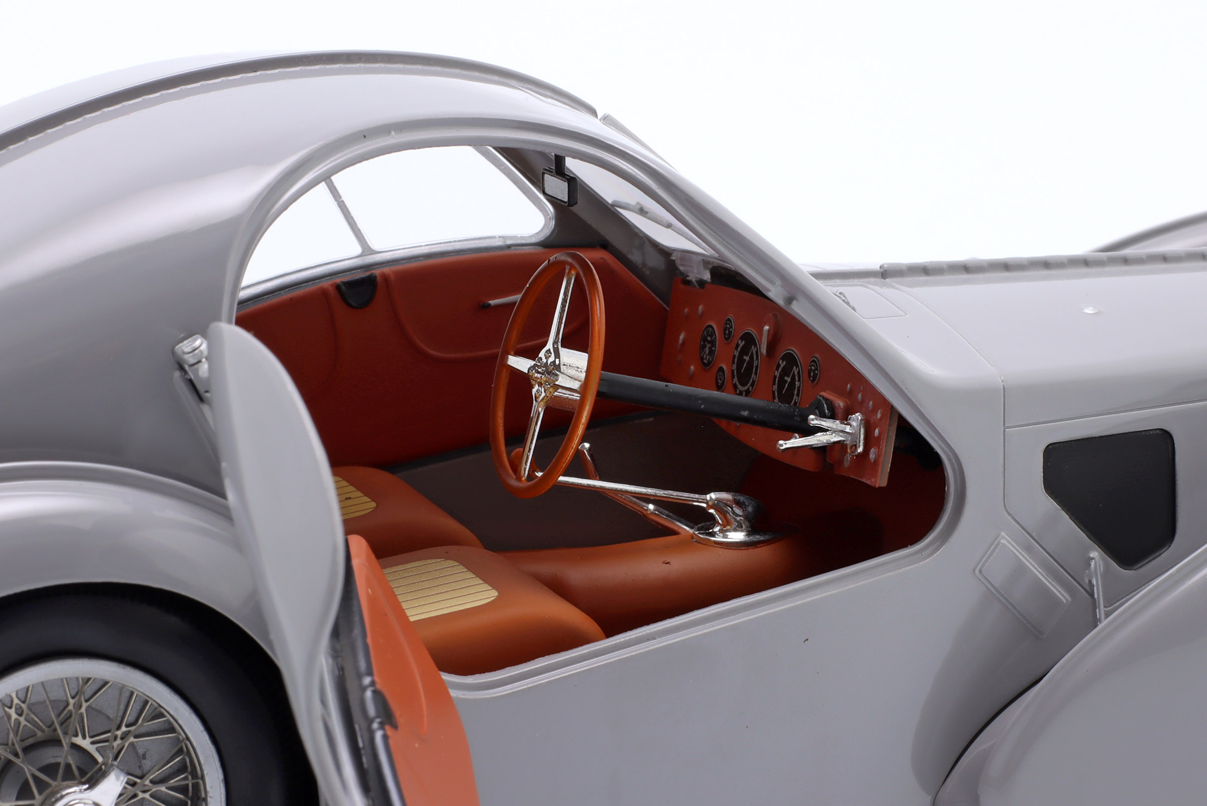 Kolekcjonerski model metalowy z elementami plastikowymi samochodu BUGATTI ATLANTC TYPE 57 SC roku 1937 w kolorze jasnoszarym.Model posiada otwierane drzwi.
