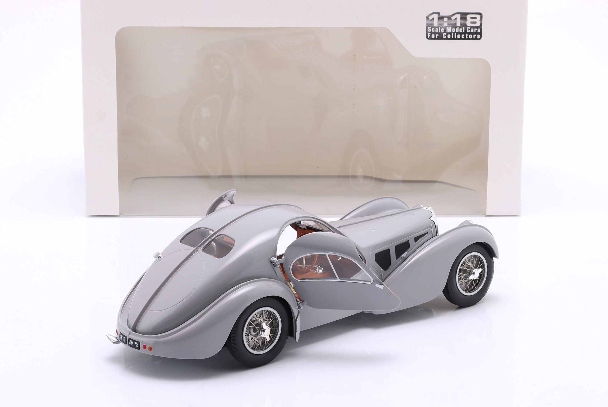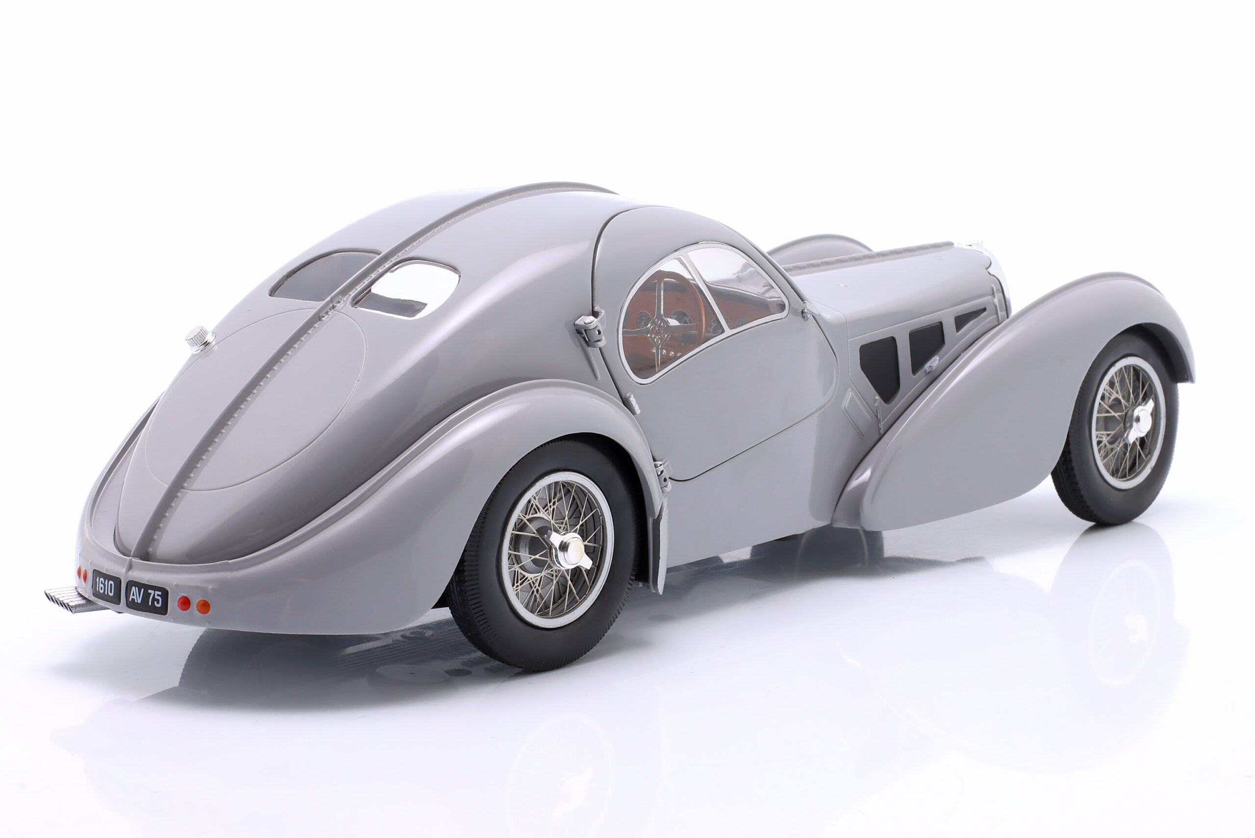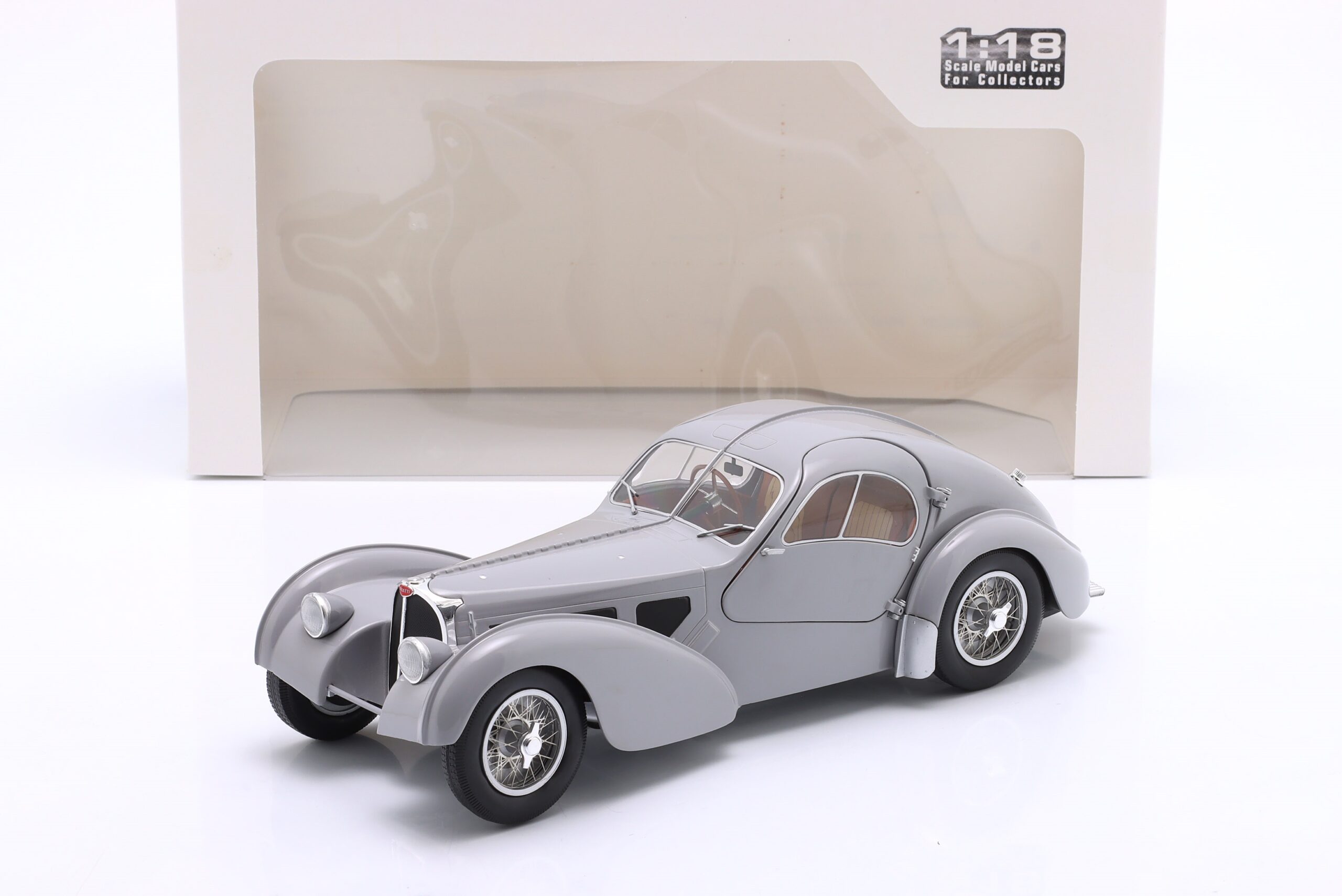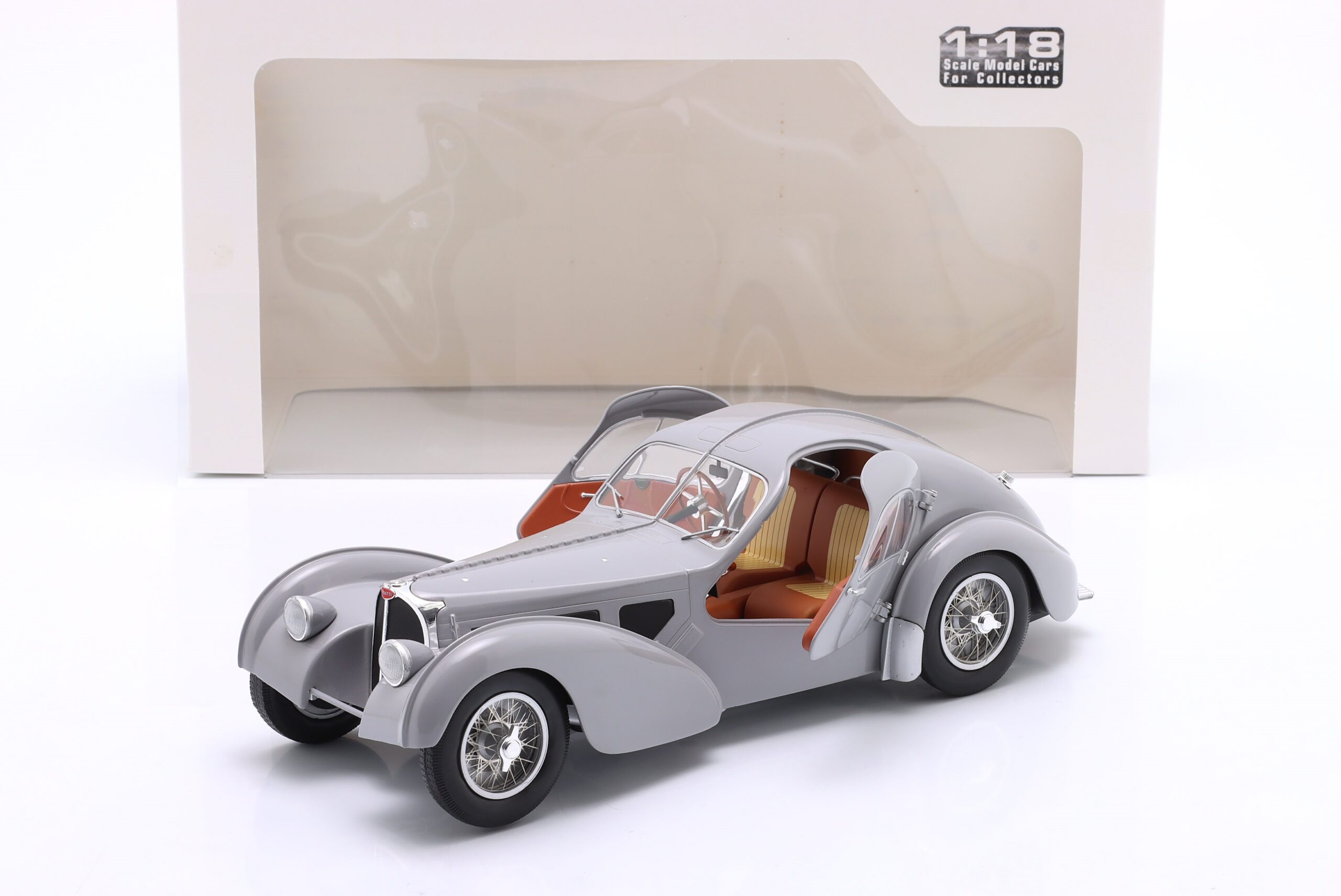 Kolekcjonerski model metalowy z elementami plastikowymi samochodu BUGATTI ATLANTC TYPE 57 SC roku 1937 w kolorze jasnoszarym.Model posiada otwierane drzwi.