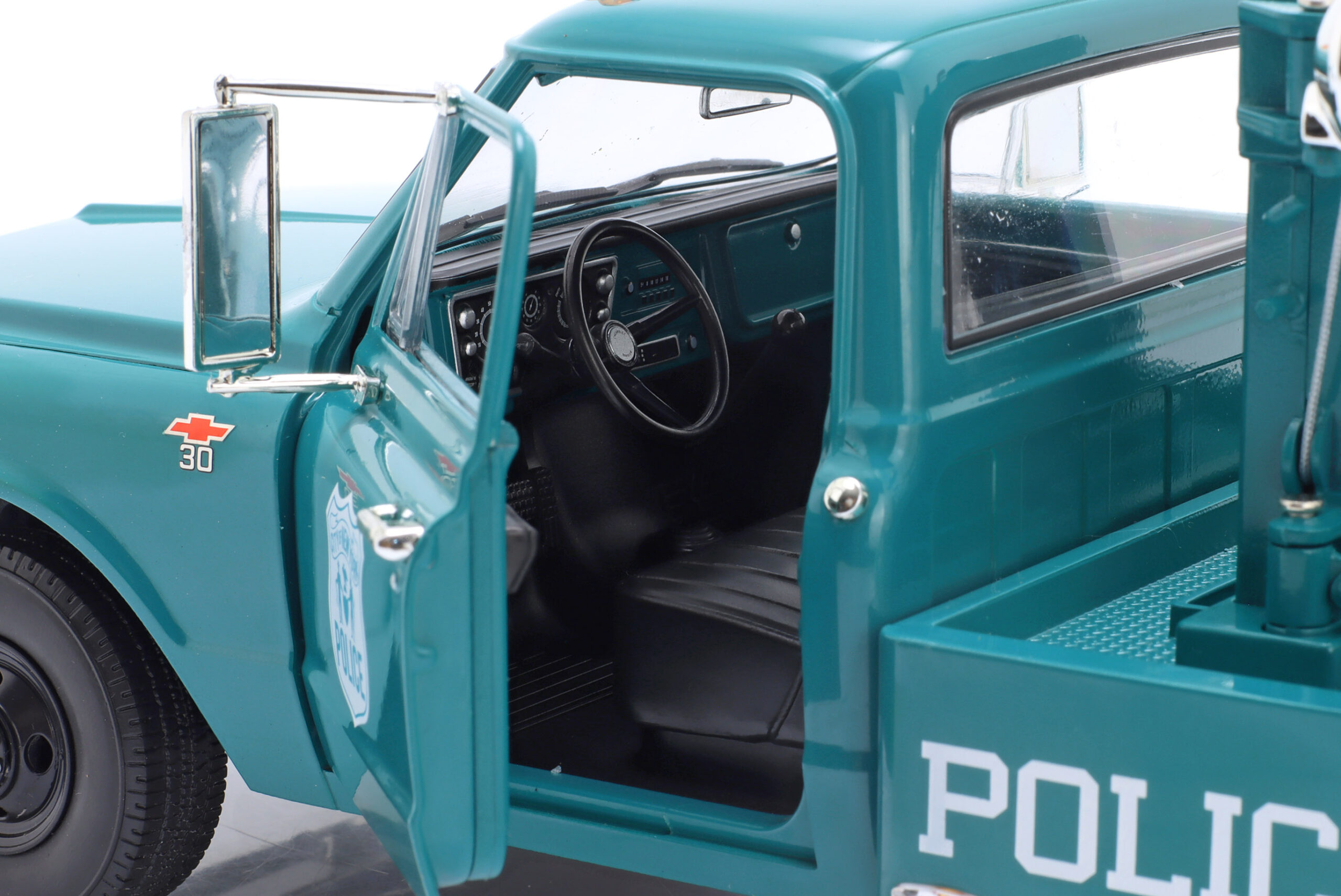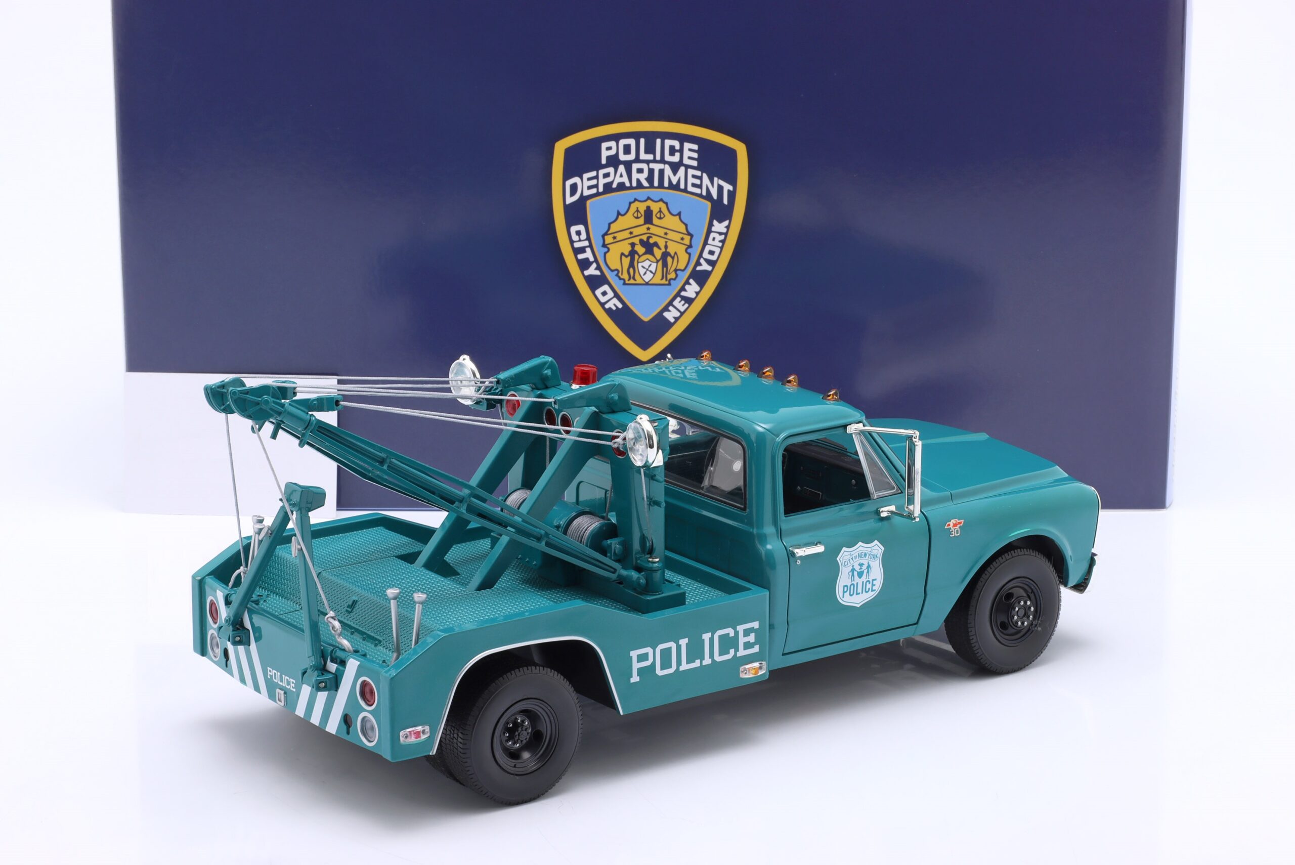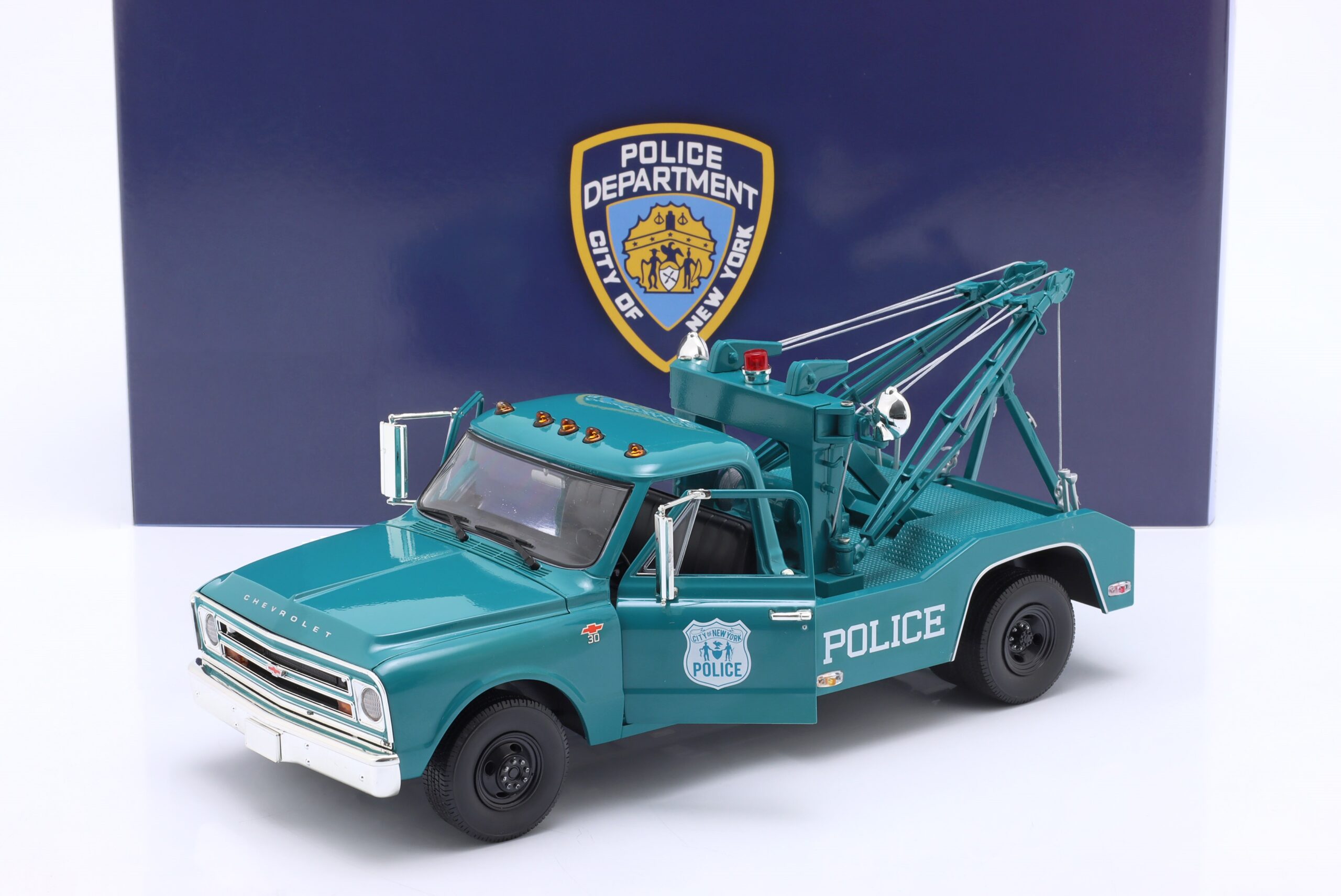 Kolekcjonerski model metalowy z elementami plastikowymi samochodu CHEVROLET C-30 Dually Wrecker New York police (NYPD) z roku 1967 w kolorze Zielonym.