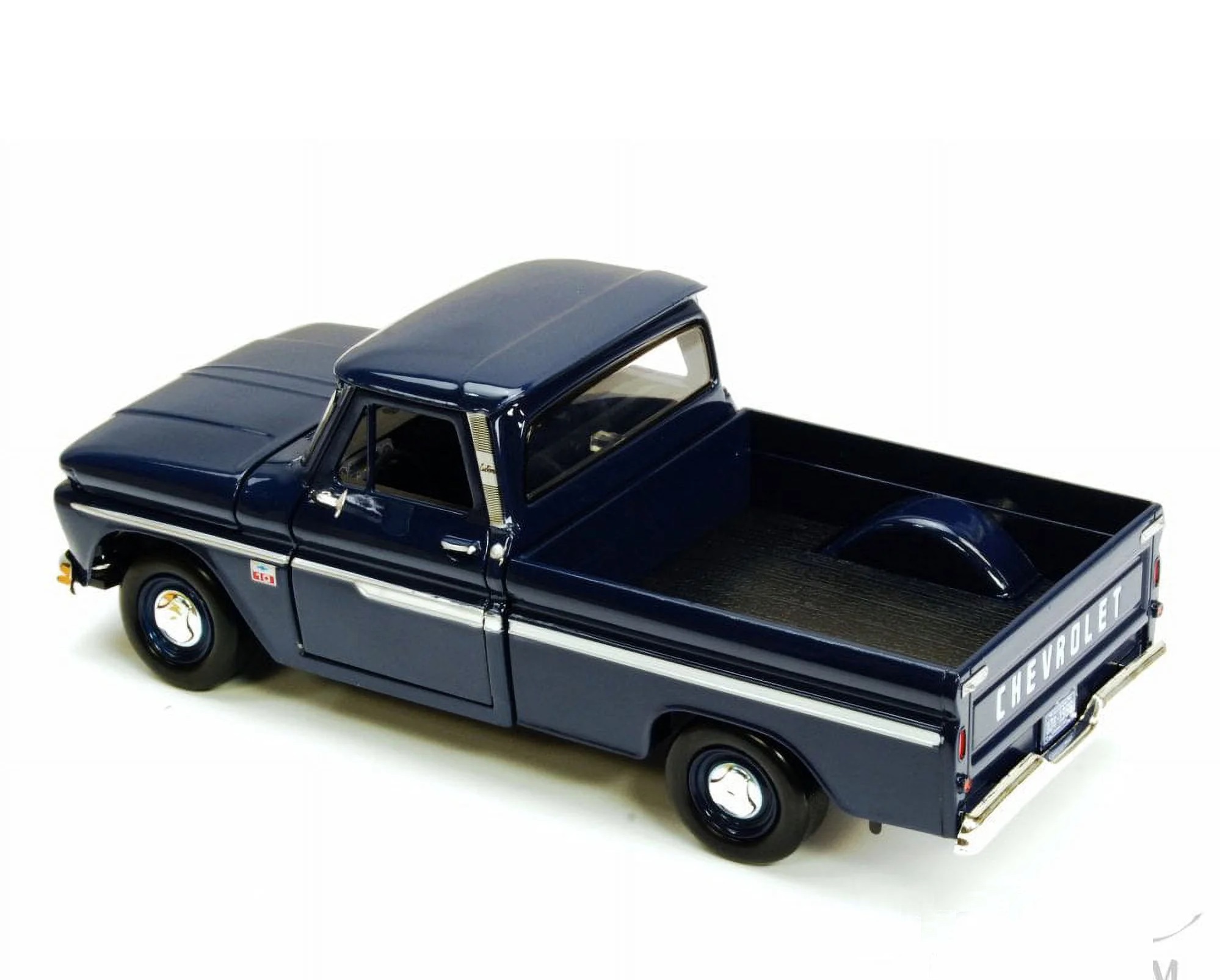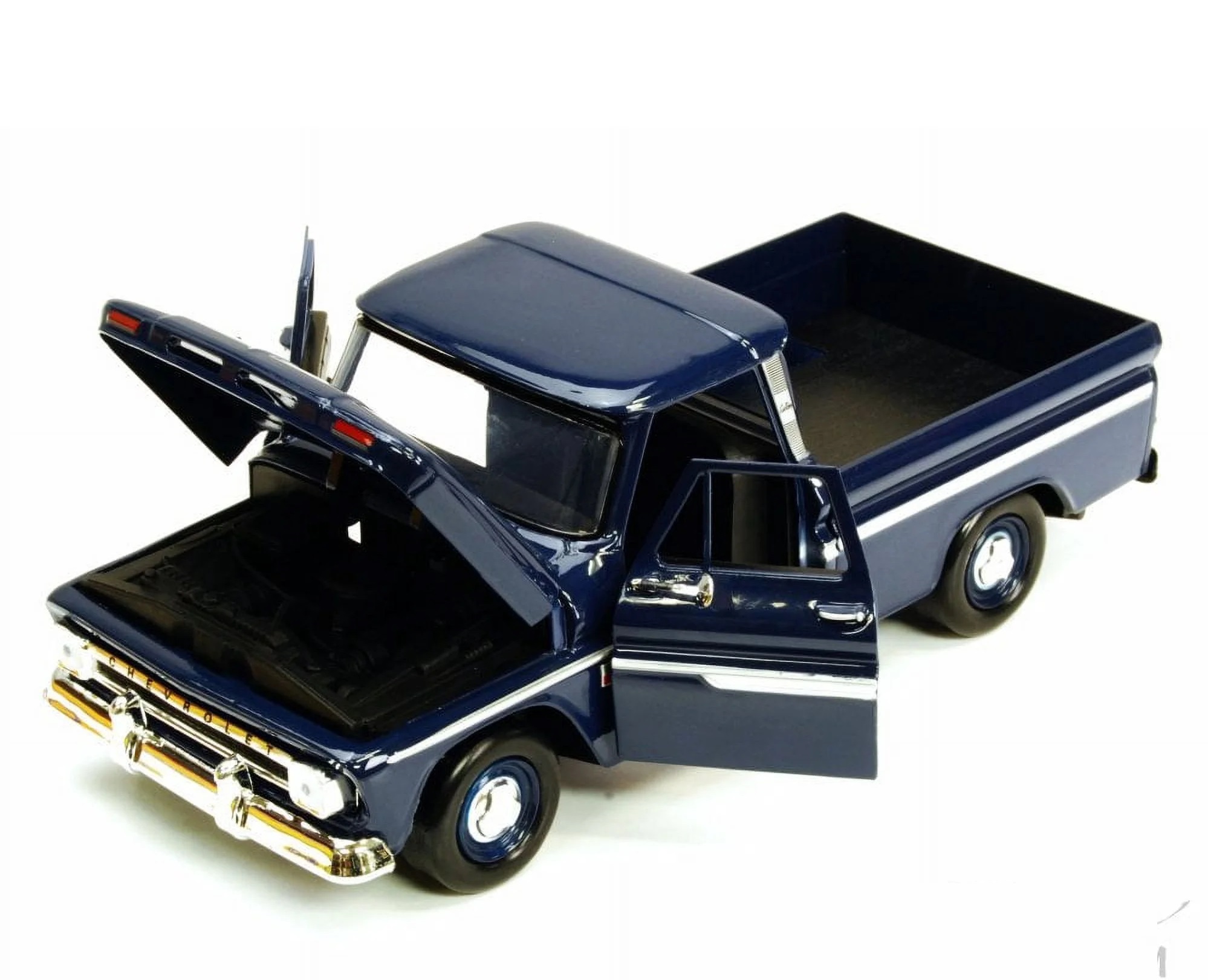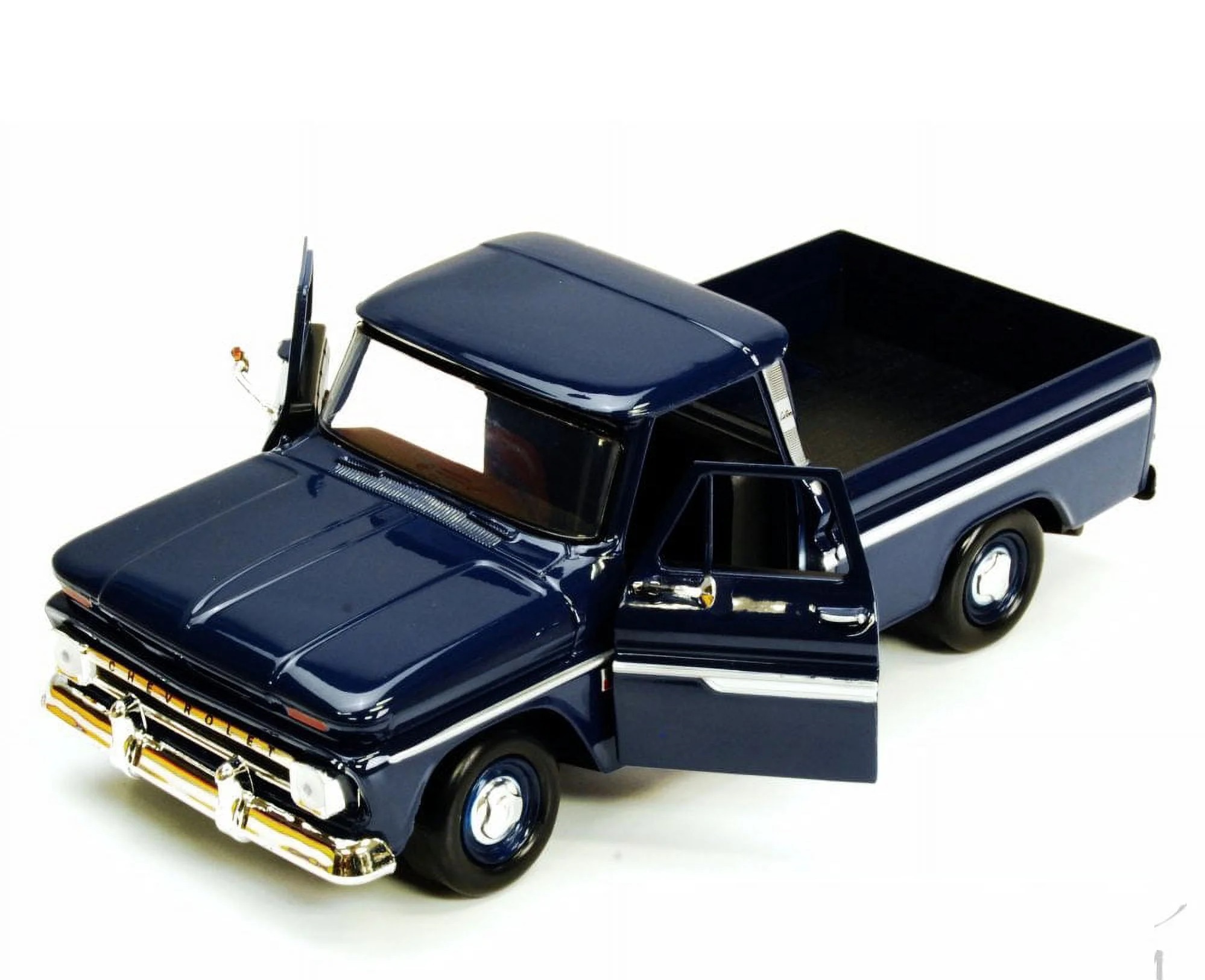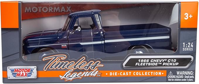 Kolekcjonerski model metalowy z elementami plastikowymi samochodu CHEVROLET C10 Fleetside Pick-Up z roku 1966 w kolorze Ciemnoniebieskim.Posiada otwierane drzwi.Model zapakowany w kartonowe pudełko witrynką.