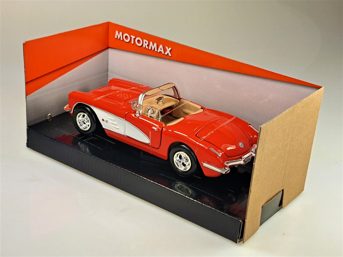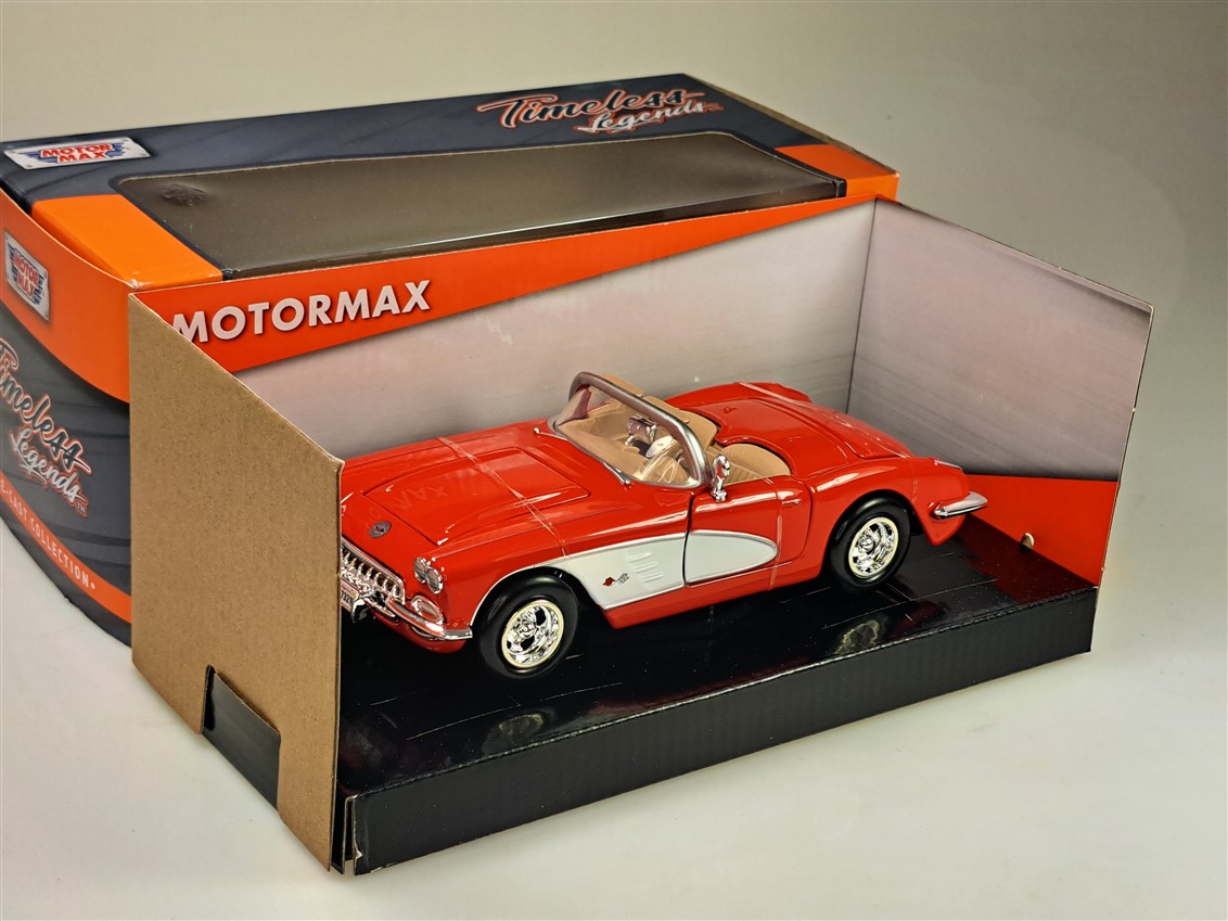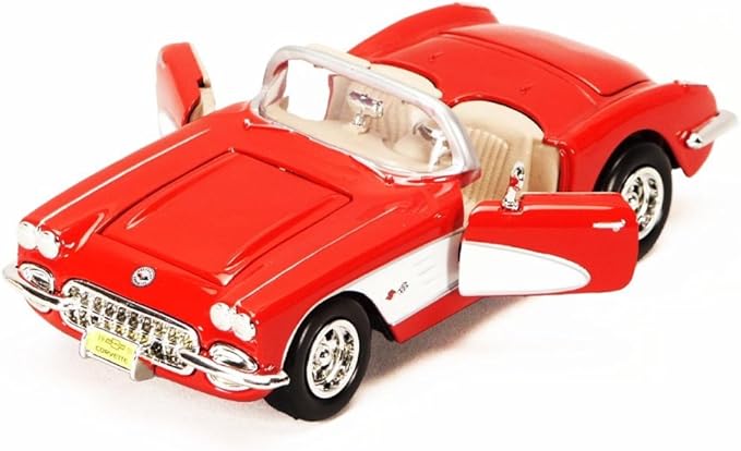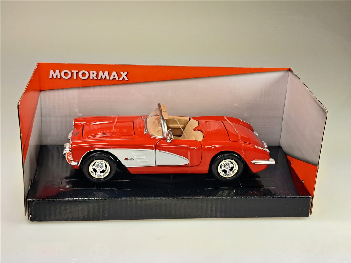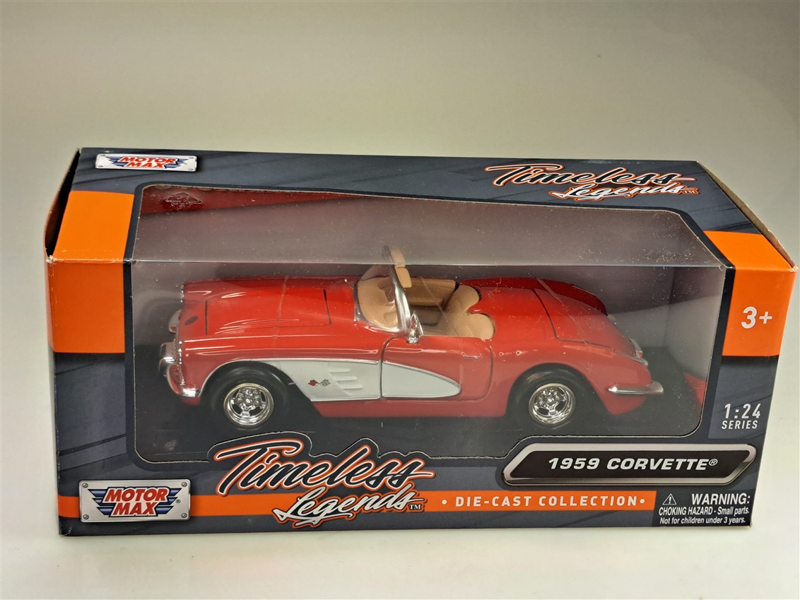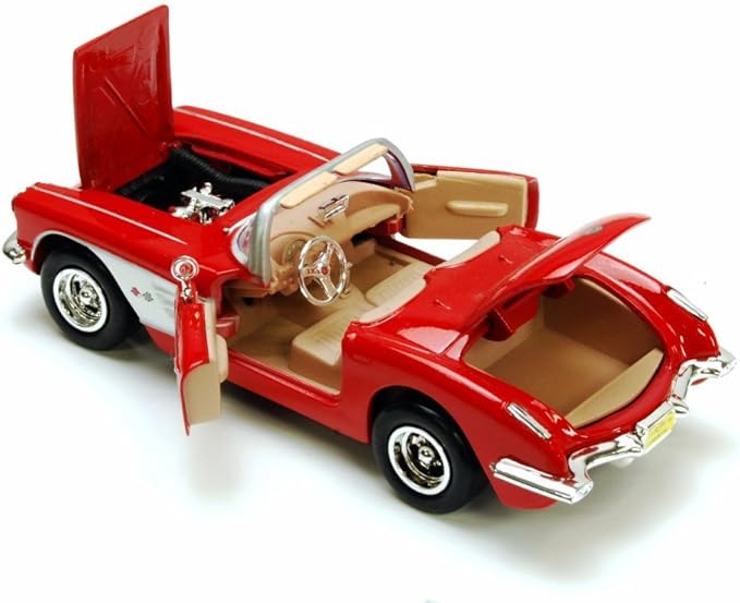 Kolekcjonerski model metalowy z elementami plastikowymi samochodu CHEVROLET CORVETTE C1 z roku 1959 w kolorze Czerwony/biały.Posiada otwierane drzwi,pokrywę silnika i bagażnika.Model zapakowany w kartonowe pudełko witrynką.
