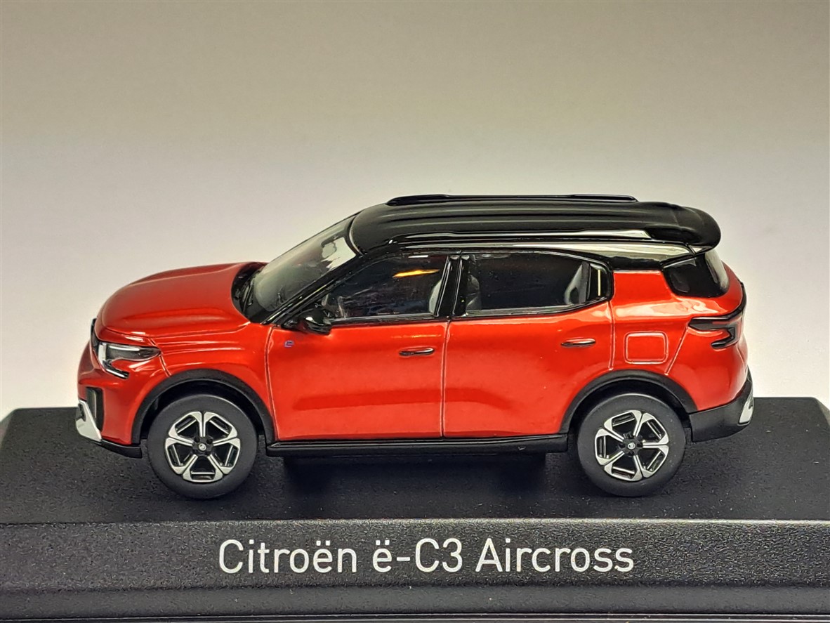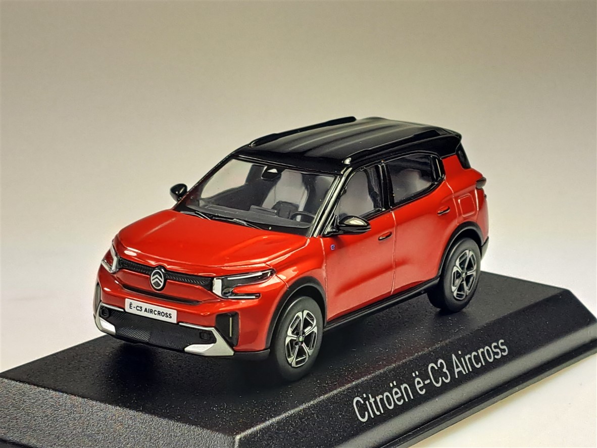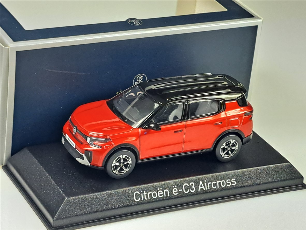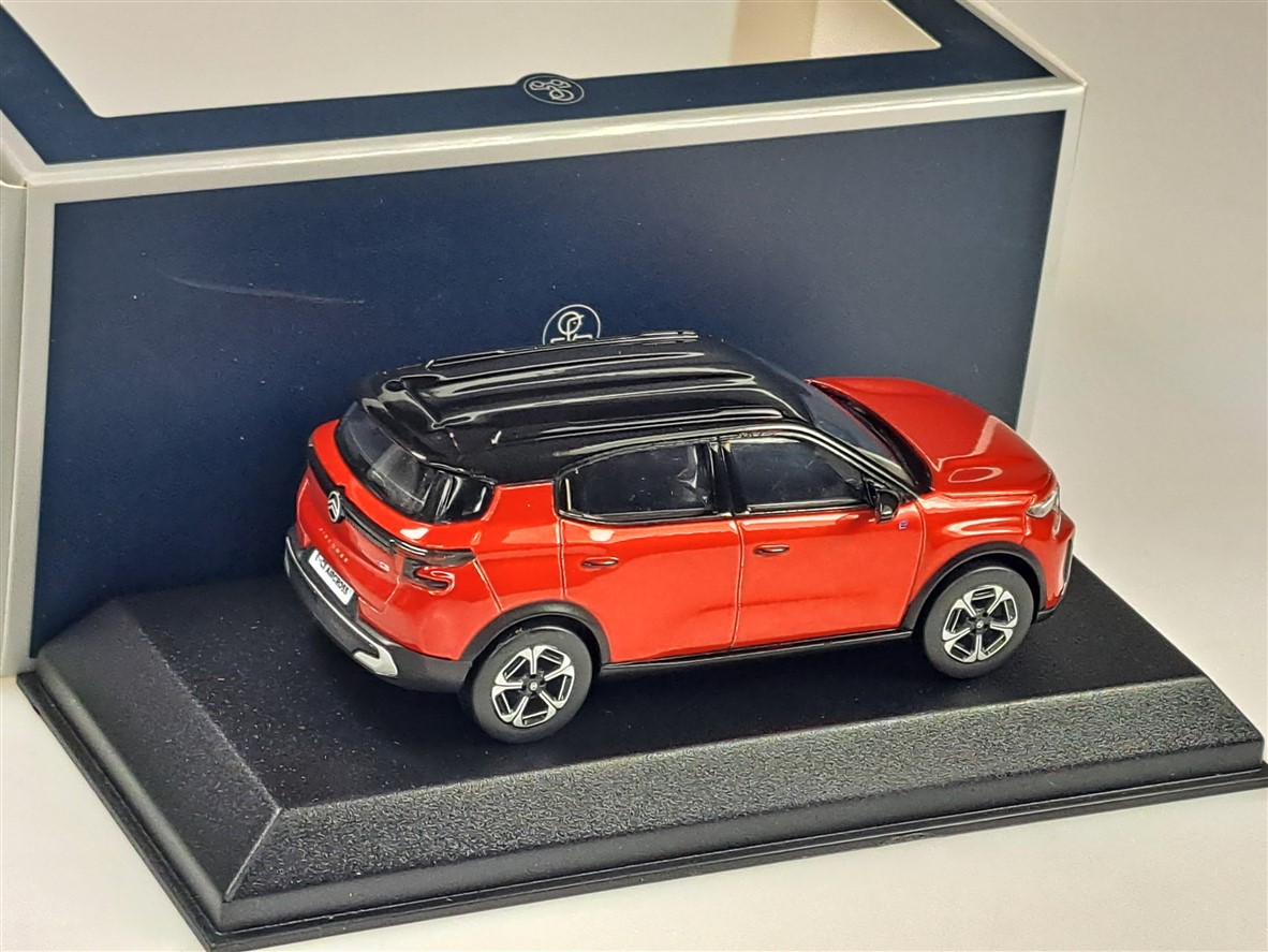 Kolekcjonerski model metalowy z elementami plastikowymi samochodu CITROEN C3 Aircross z roku 2025 w kolorze Elixir Red z czarnym dachem.Model na podstawce,posiada akrylową gablotkę ekspozycyjną,nie posiada otwieranych elementów.