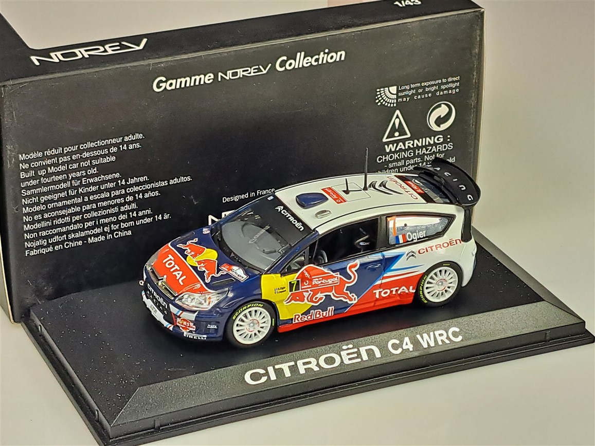Metalowy model kolekcjonerski z elementami plastikowymi samochodu rajdowego Citroen C4 WRC #7 zwycięskiej załogi S.Ogier/S.Ingrassia z Rajdu Portugalii z roku 2010.