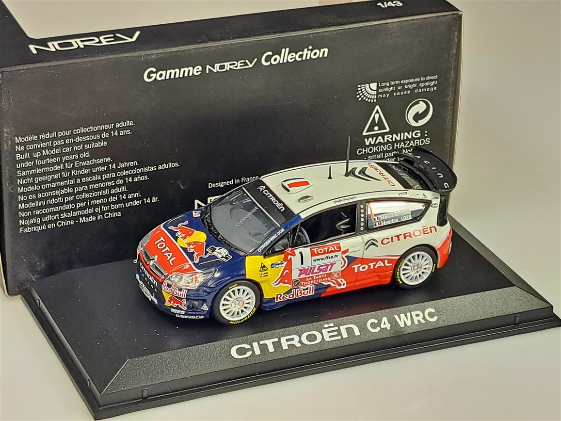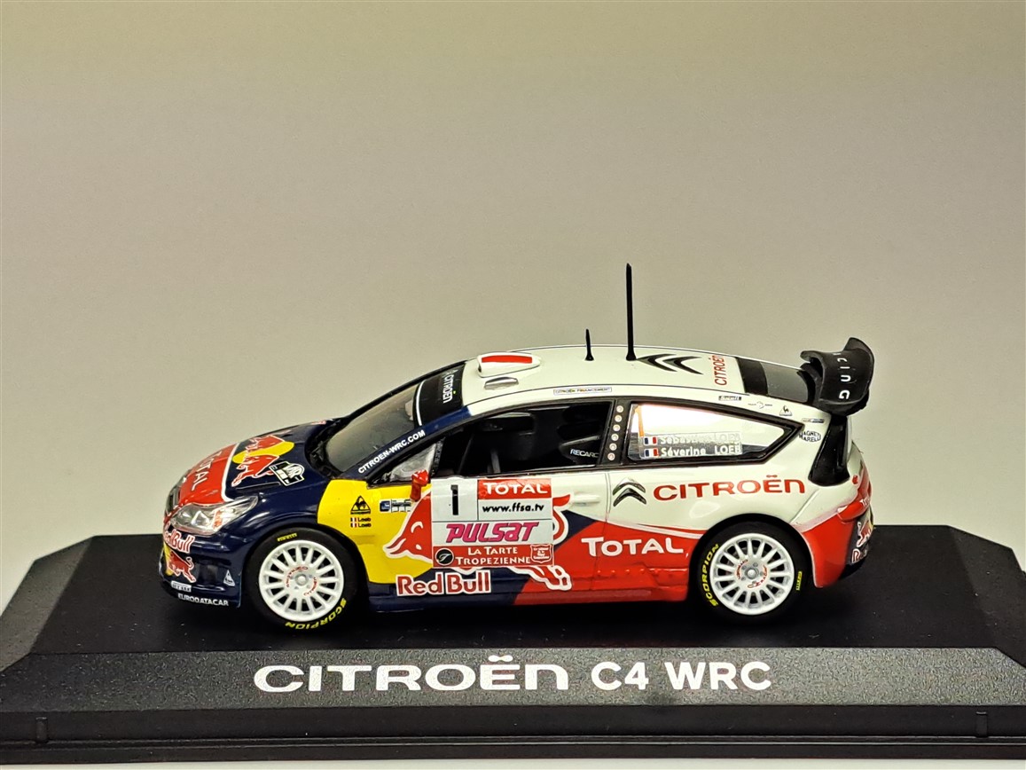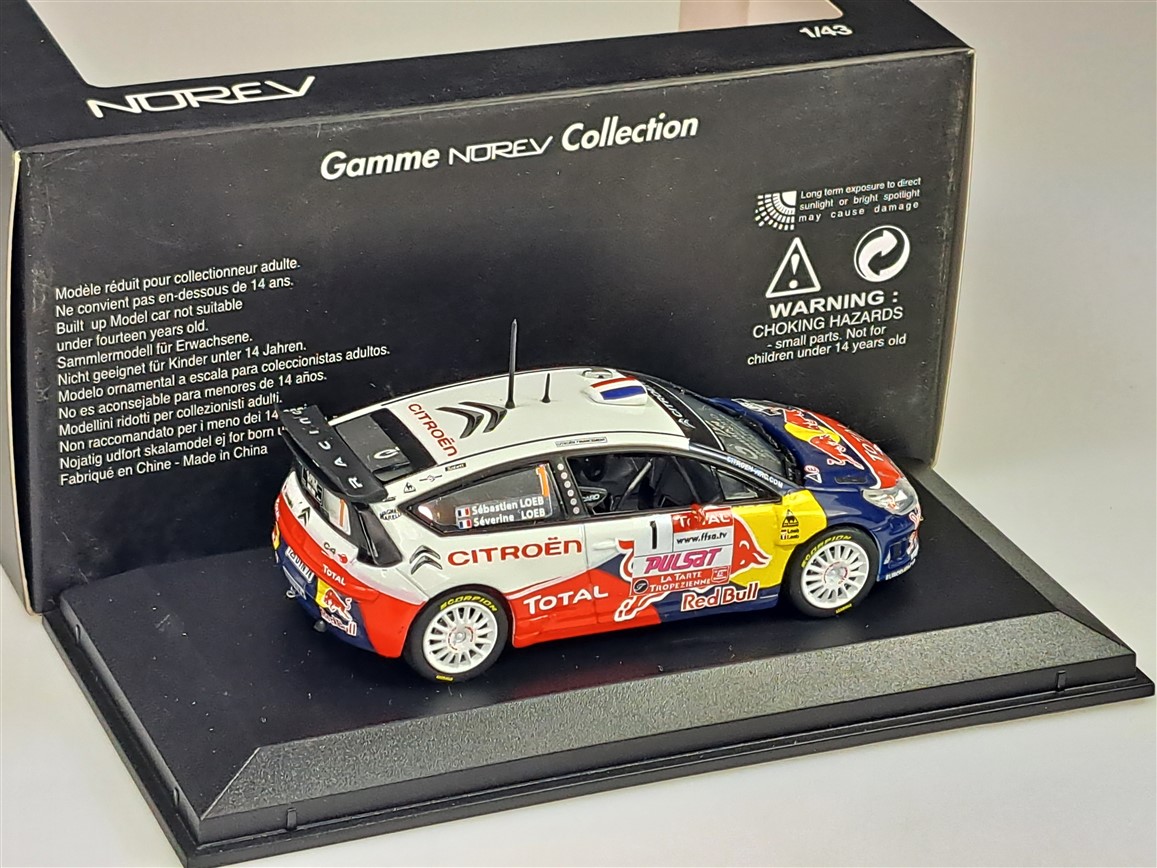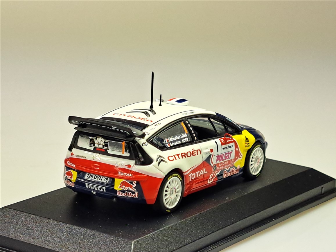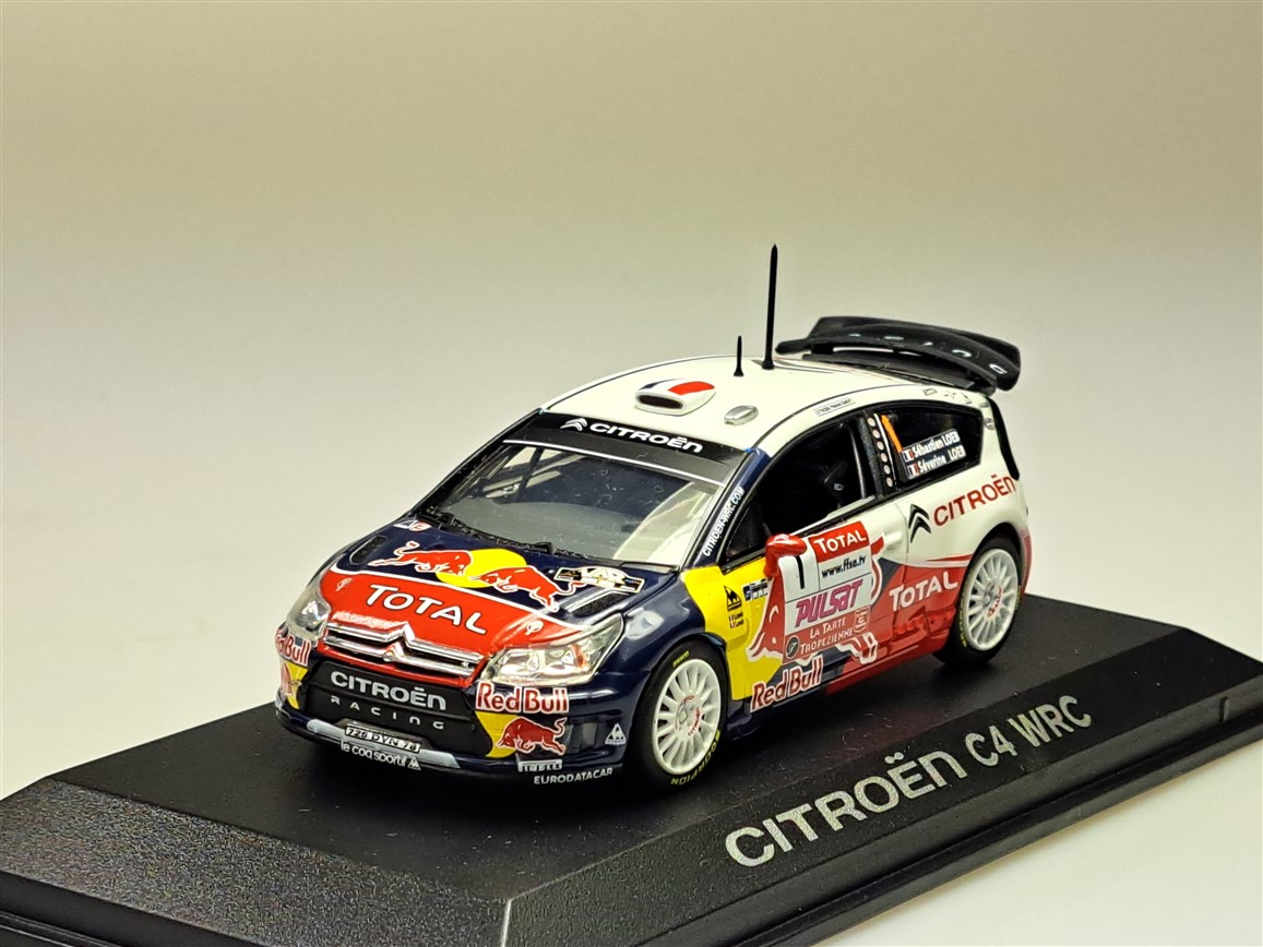 Kolekcjonerski model metalowy z elementami plastikowymi samochodu rajdowego CITROEN C4 WRC z 2009 roku z Rajdu du Var zwycięskiej załogi LOEB/LOEB.