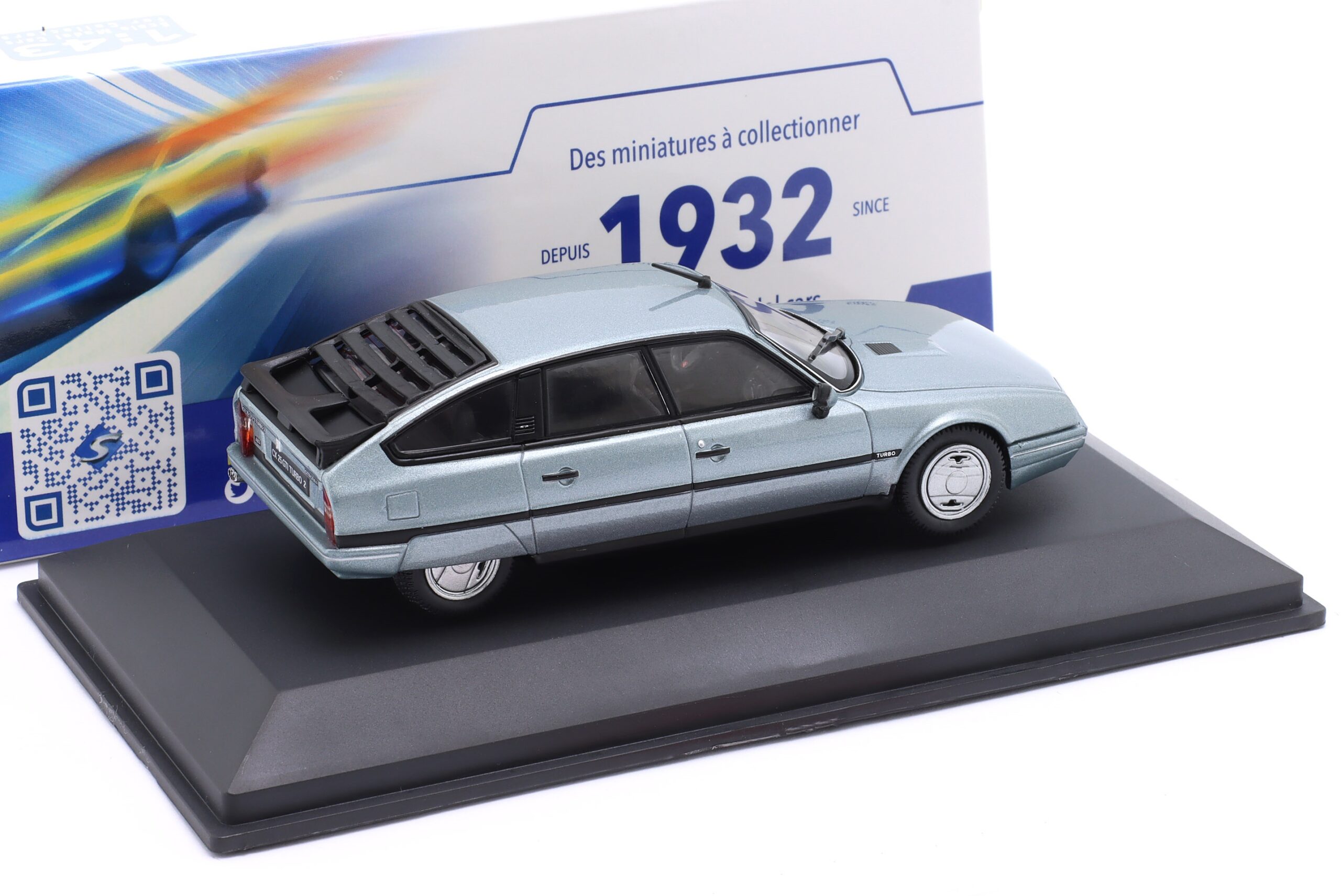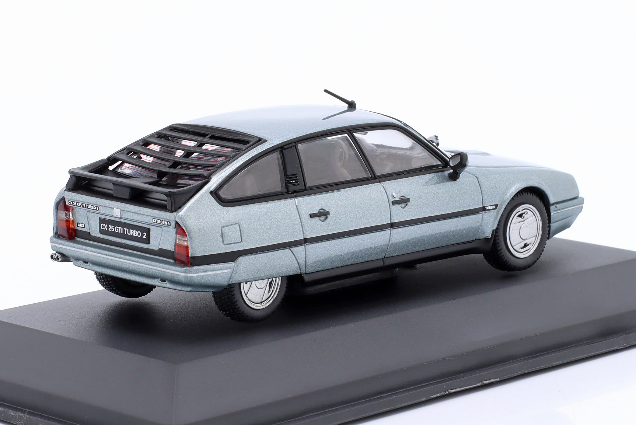 Kolekcjonerski model metalowy z elementami plastikowymi samochodu CITROEN CX GTI TURBO II z roku 1988 w kolorze Jasnoniebieski metallic.Model na podstawce,posiada akrylową gablotkę ekspozycyjną.