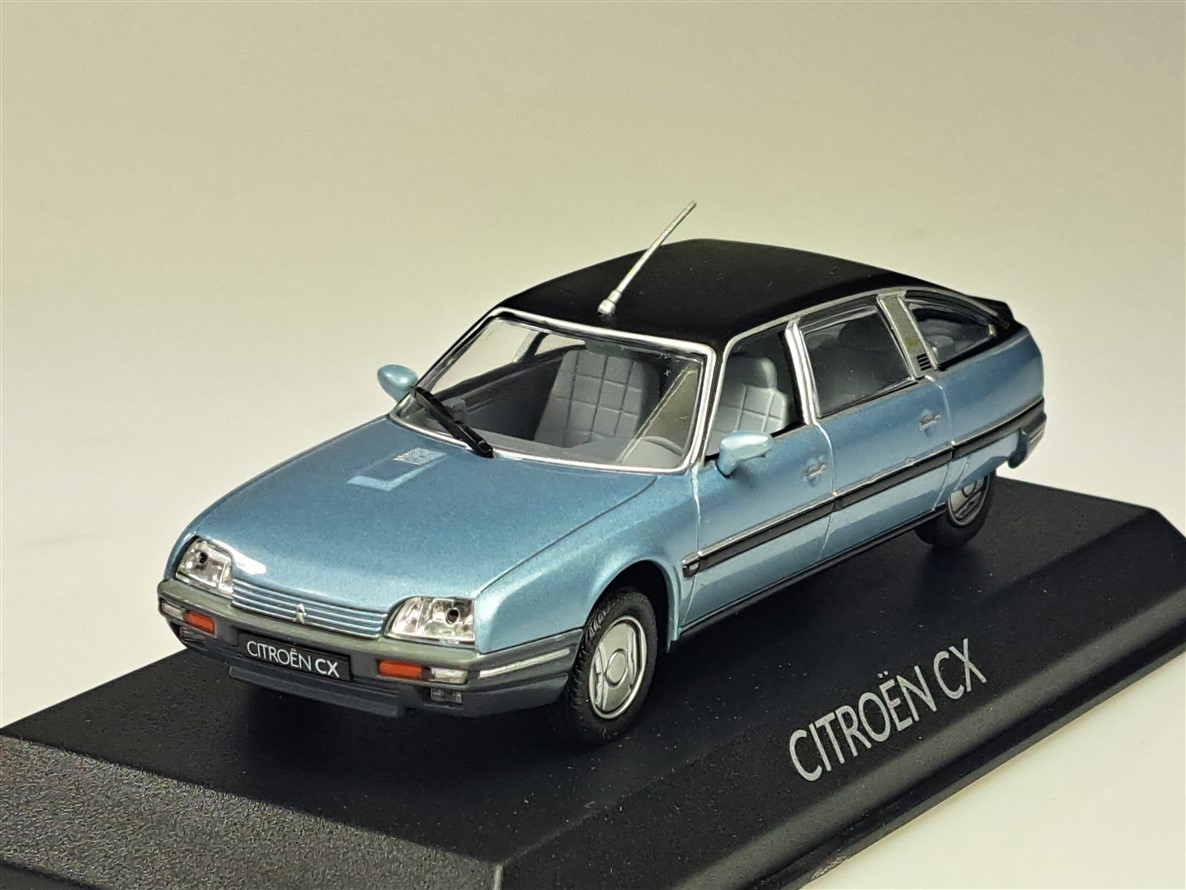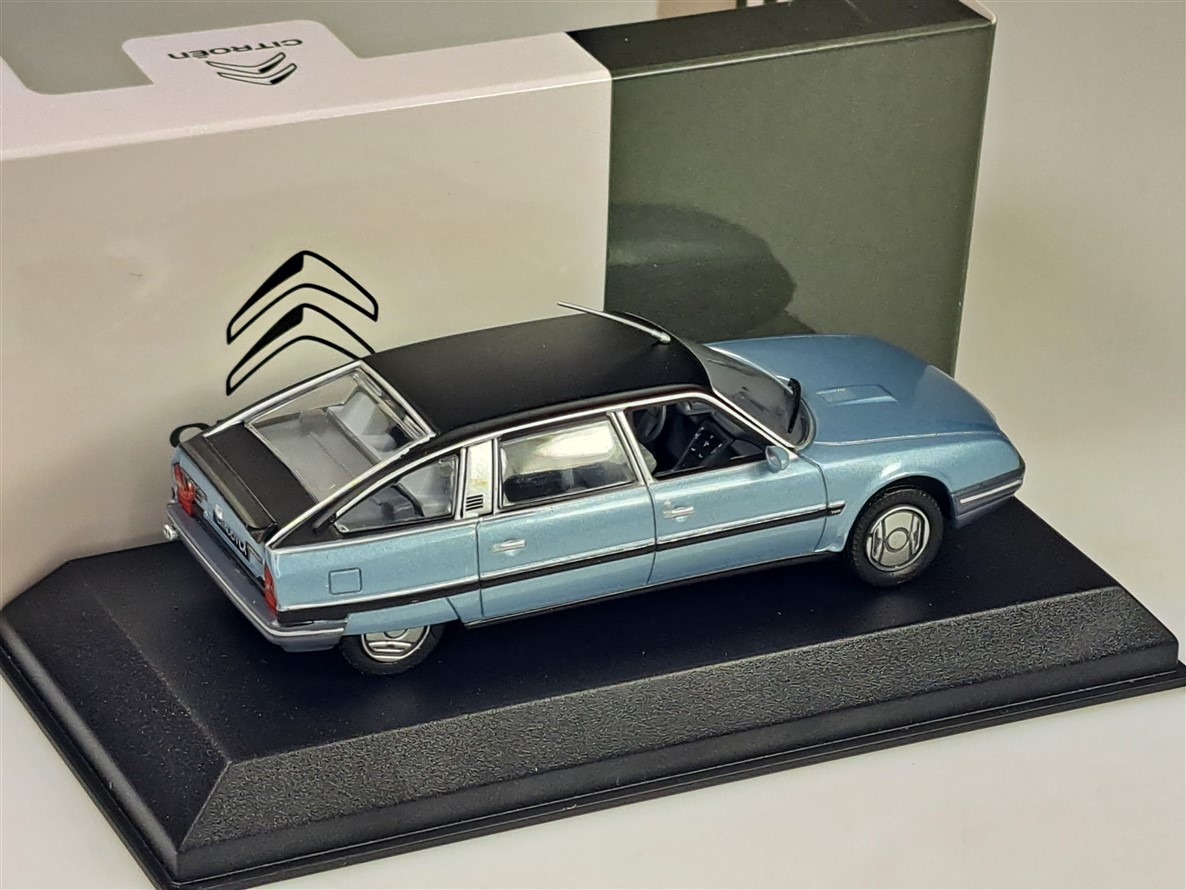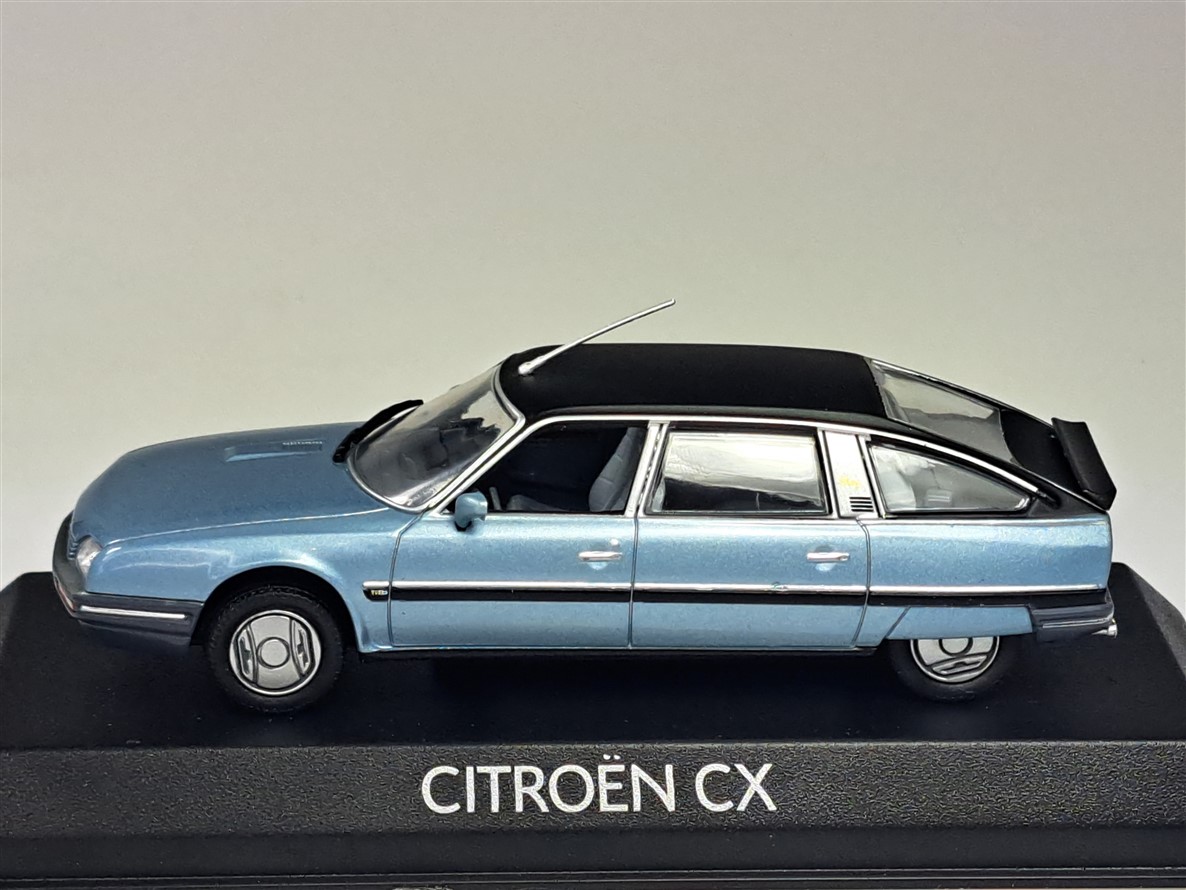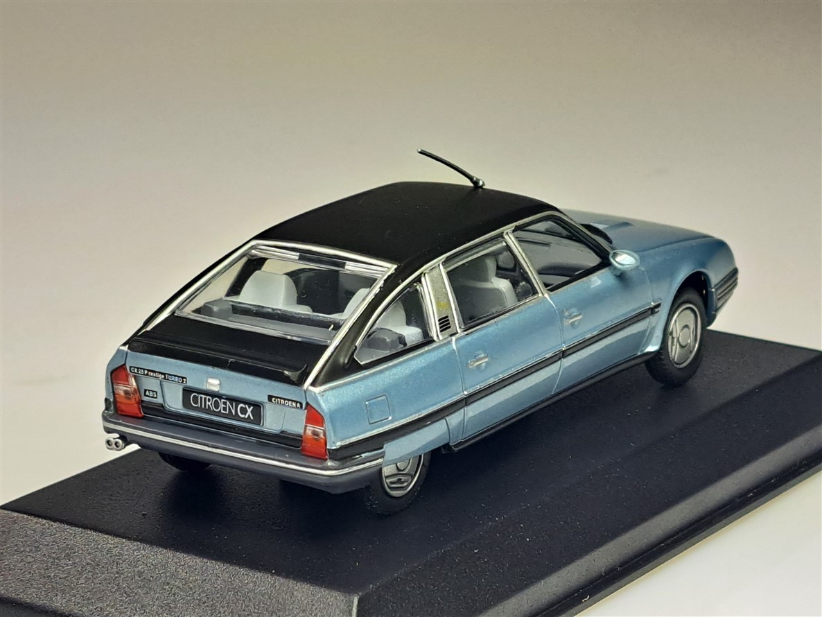 Kolekcjonerski model metalowy z elementami plastikowymi samochodu CITROEN CX Turbo 2 Prestige z roku 1986 w kolorze Jasnoniebieski metallic.Model w skali 1:43,model na podstawce posiada akrylową gablotkę ekspozycyjną.Model z edycji dealerskiej firmy CITROEN.