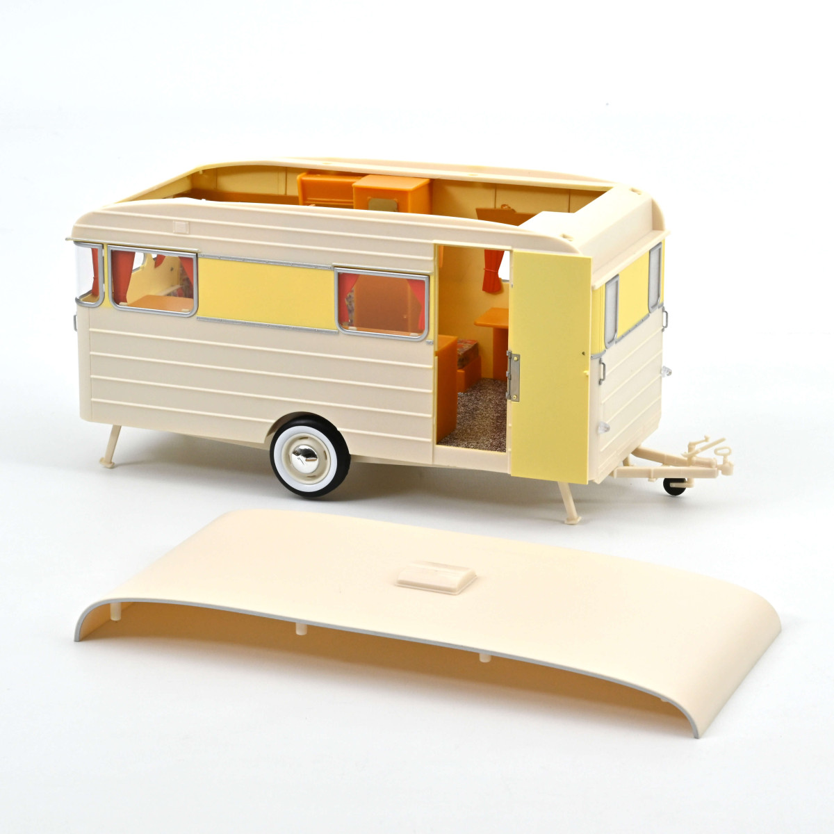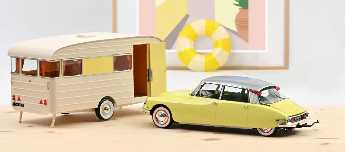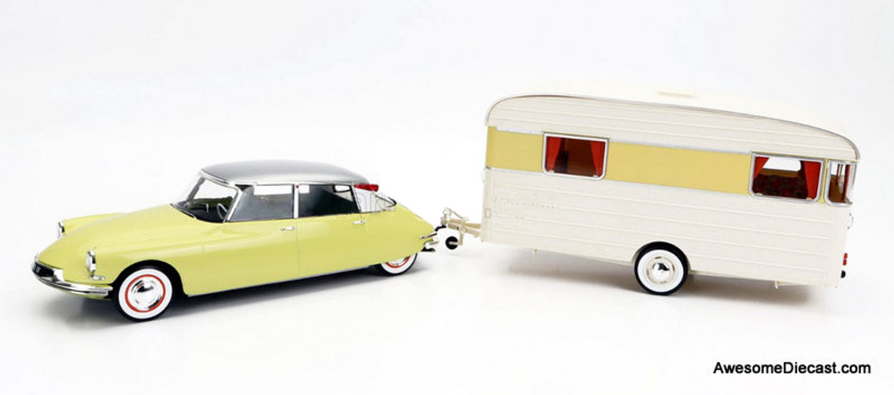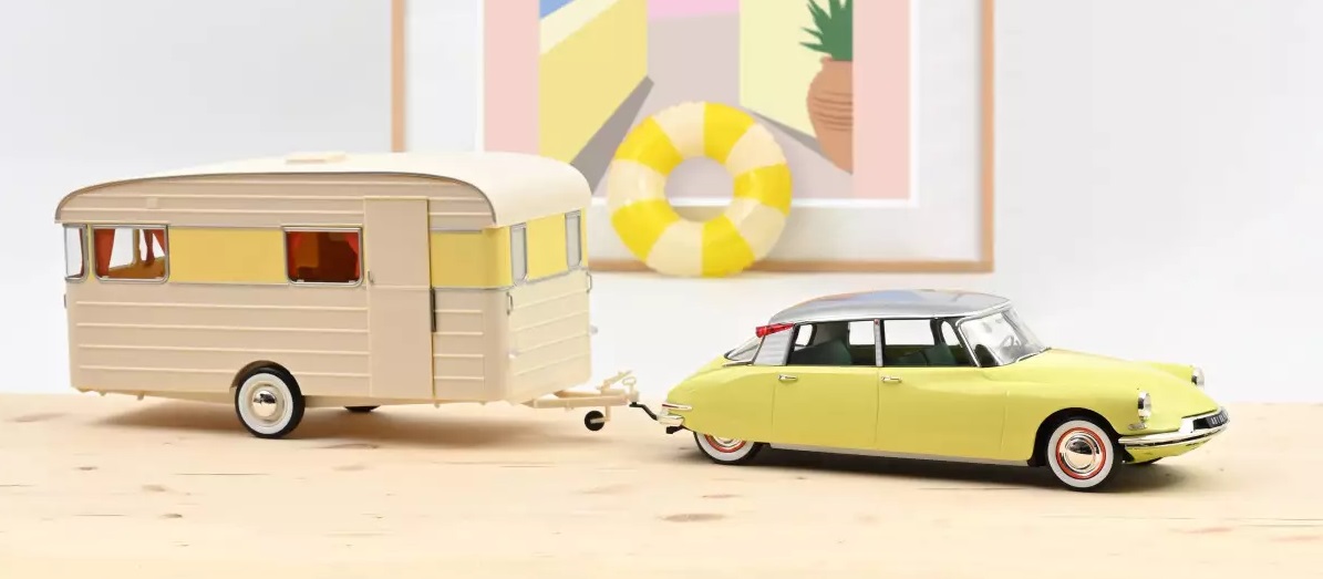 Kolekcjonerski model metalowy z elementami plastikowymi samochodu CITROEN DS19 z roku 1960 w kolorze Żółtym z przyczepą Kampingową Dingue Panoramic.
