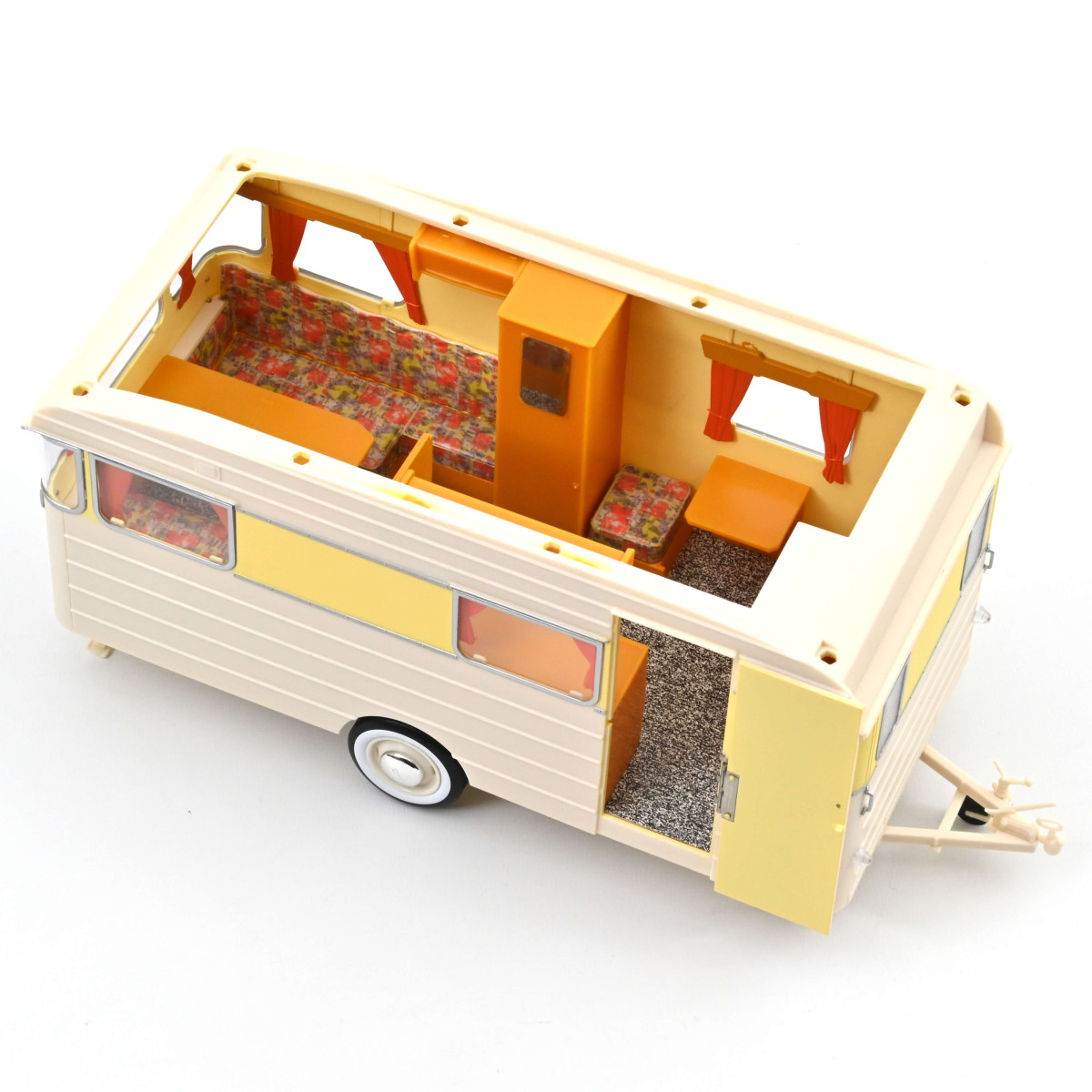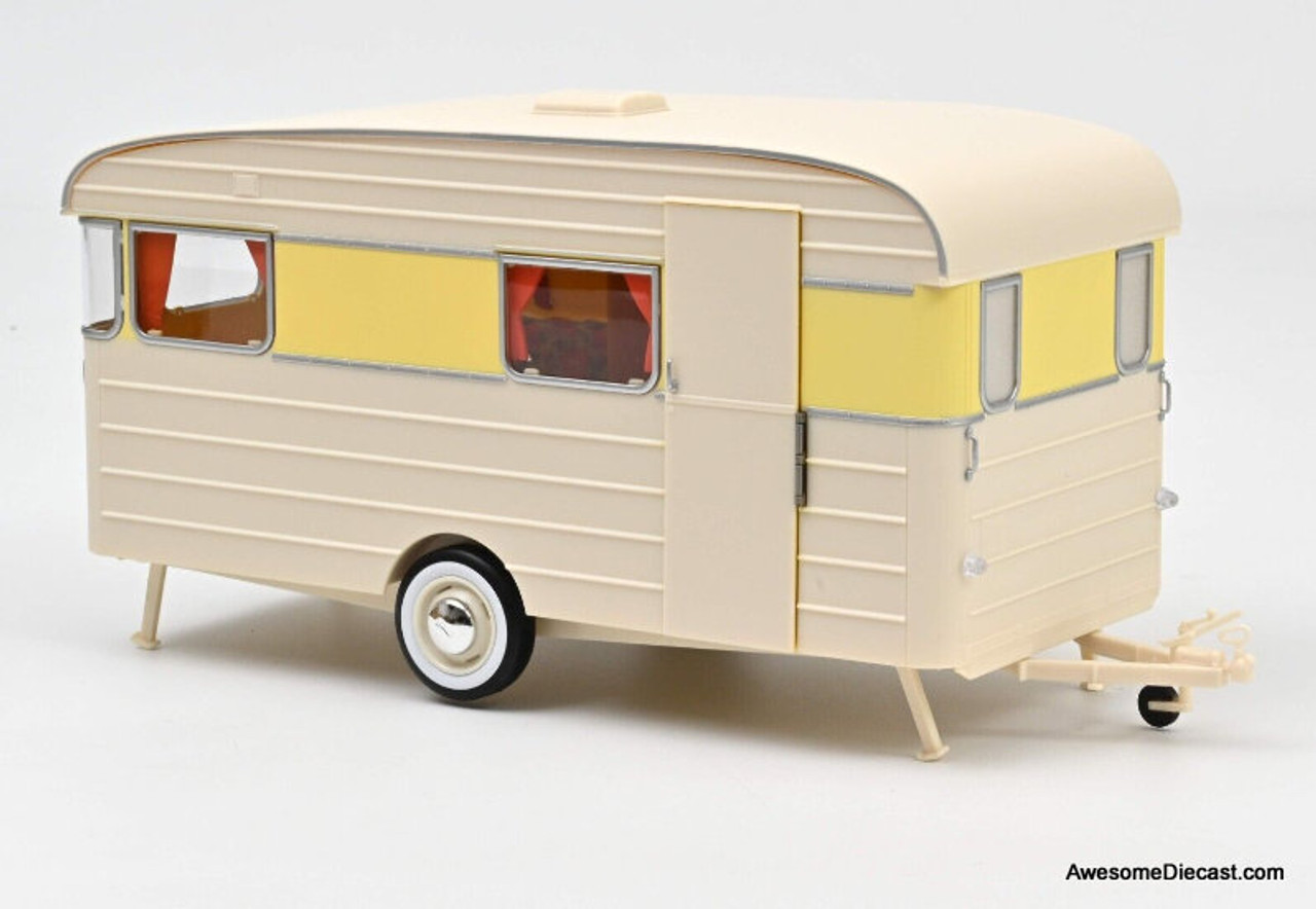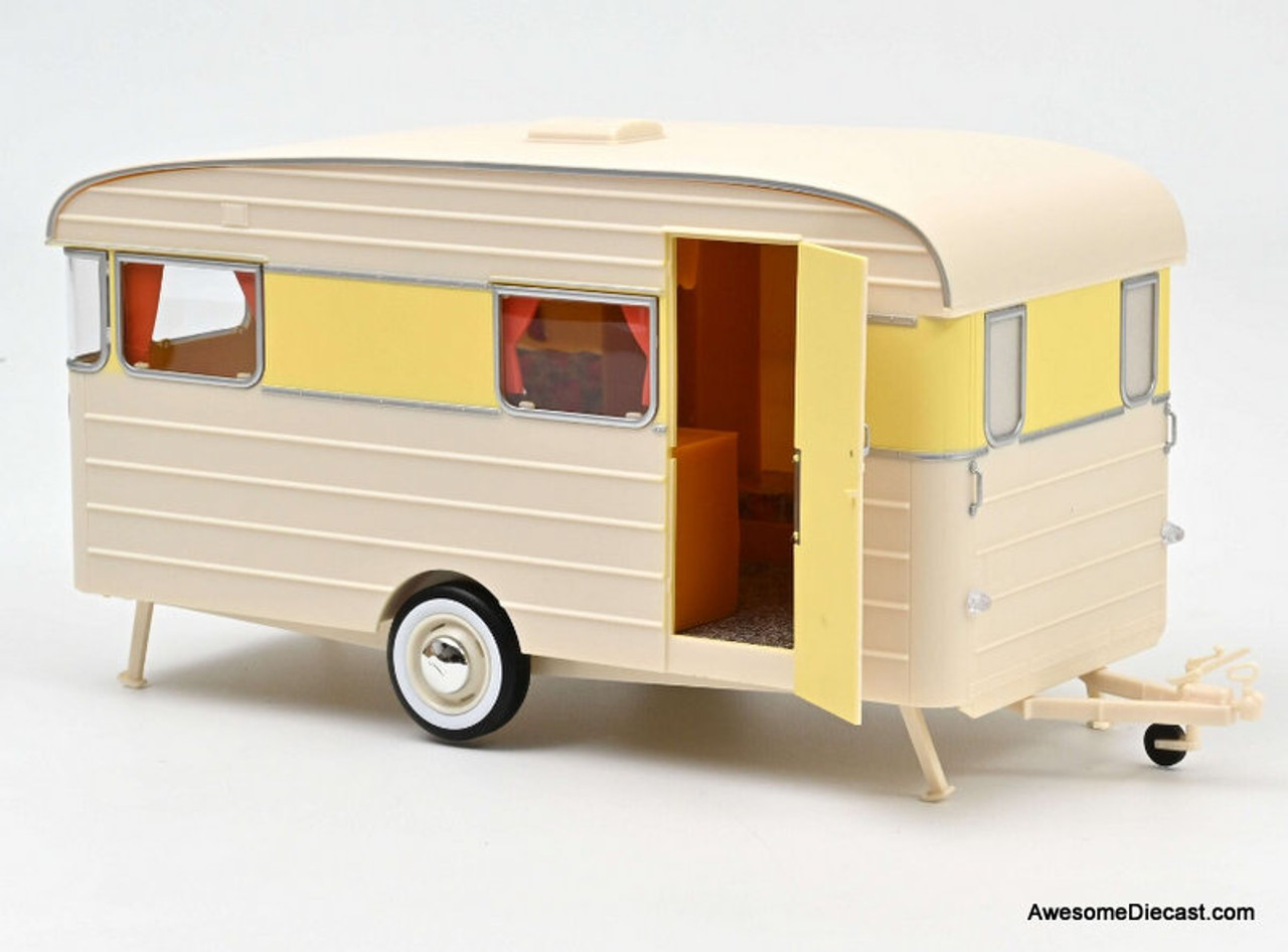 Kolekcjonerski model metalowy z elementami plastikowymi samochodu CITROEN DS19 z roku 1960 w kolorze Żółtym z przyczepą Kampingową Dingue Panoramic.