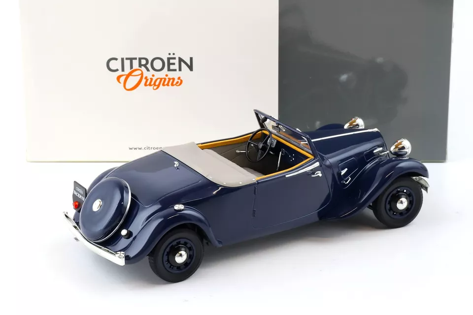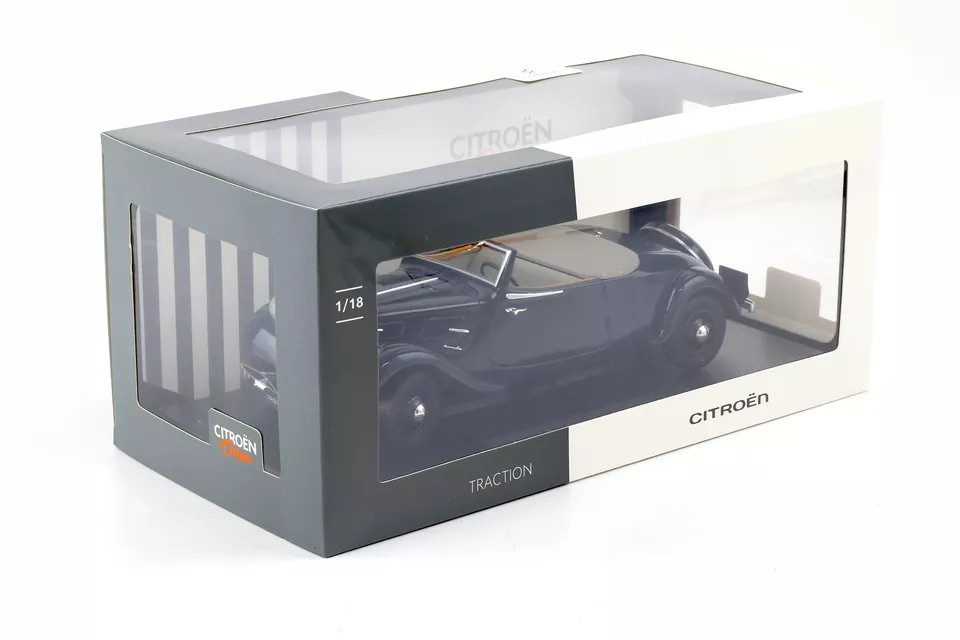 Kolekcjonerski model metalowy z elementami plastikowymi samochodu CITROEN TRACTION 11B Cabriolet z roku 1938 w kolorze Ciemnoniebieskim.Model nie posiada otwieranych elementów
