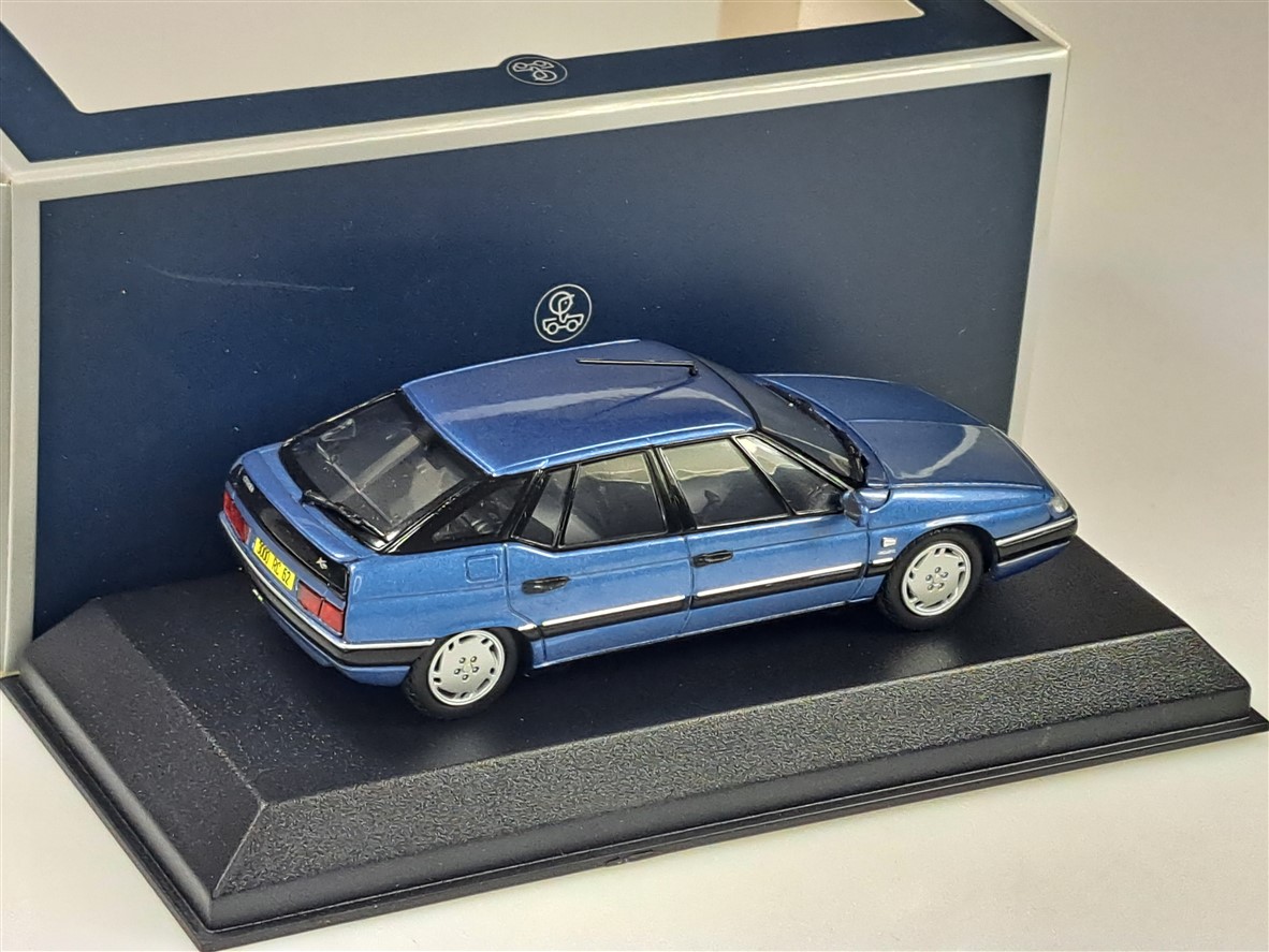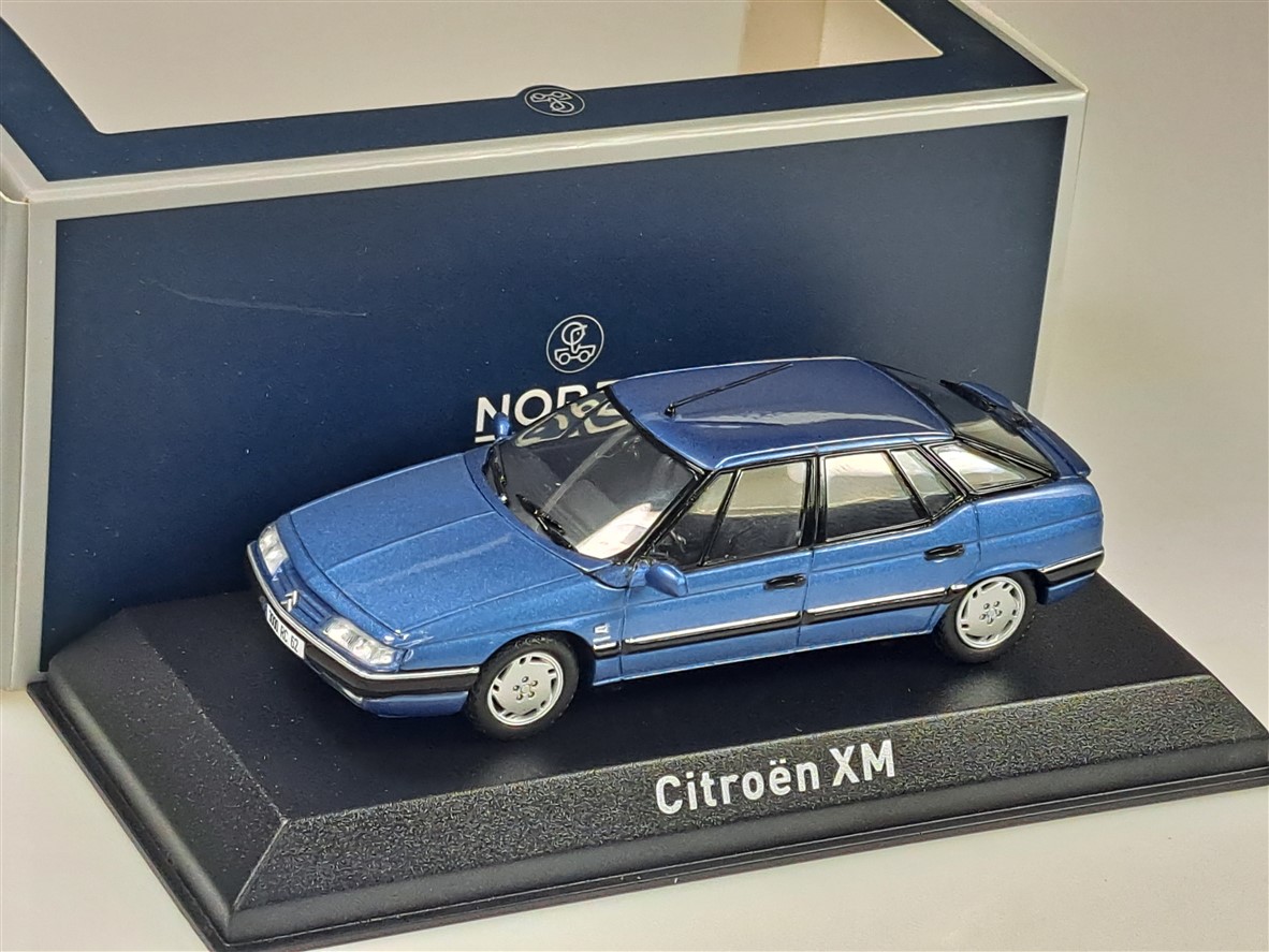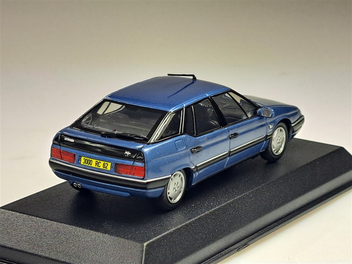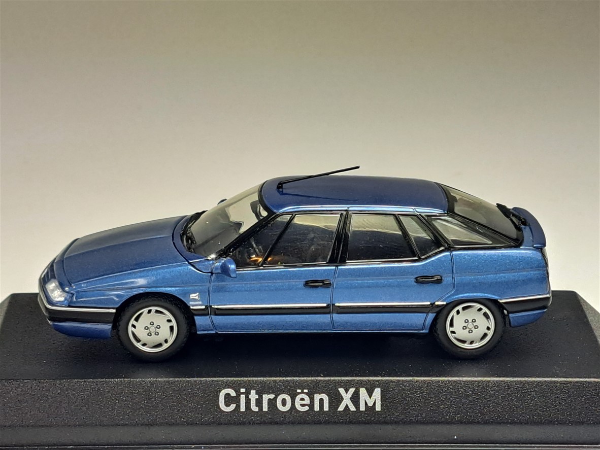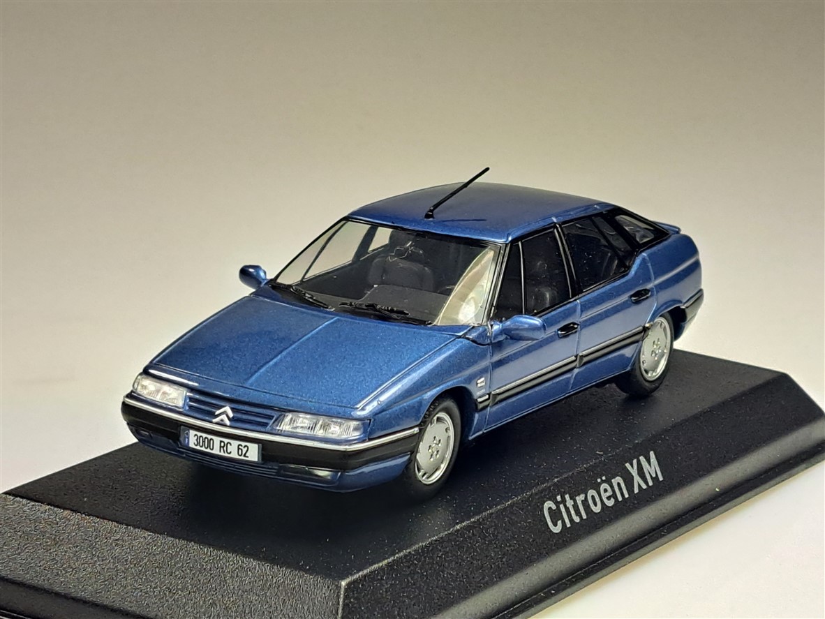 Kolekcjonerski model metalowy z elementami plastikowymi samochodu CITROEN XM z roku 1995 w kolorze Buckingham Blue.Model na podstawce,posiada akrylową gablotkę ekspozycyjną,nie posiada otwieranych elementów.