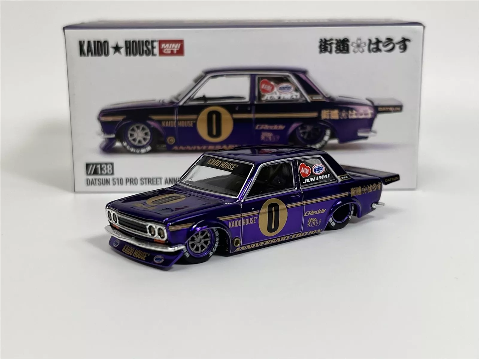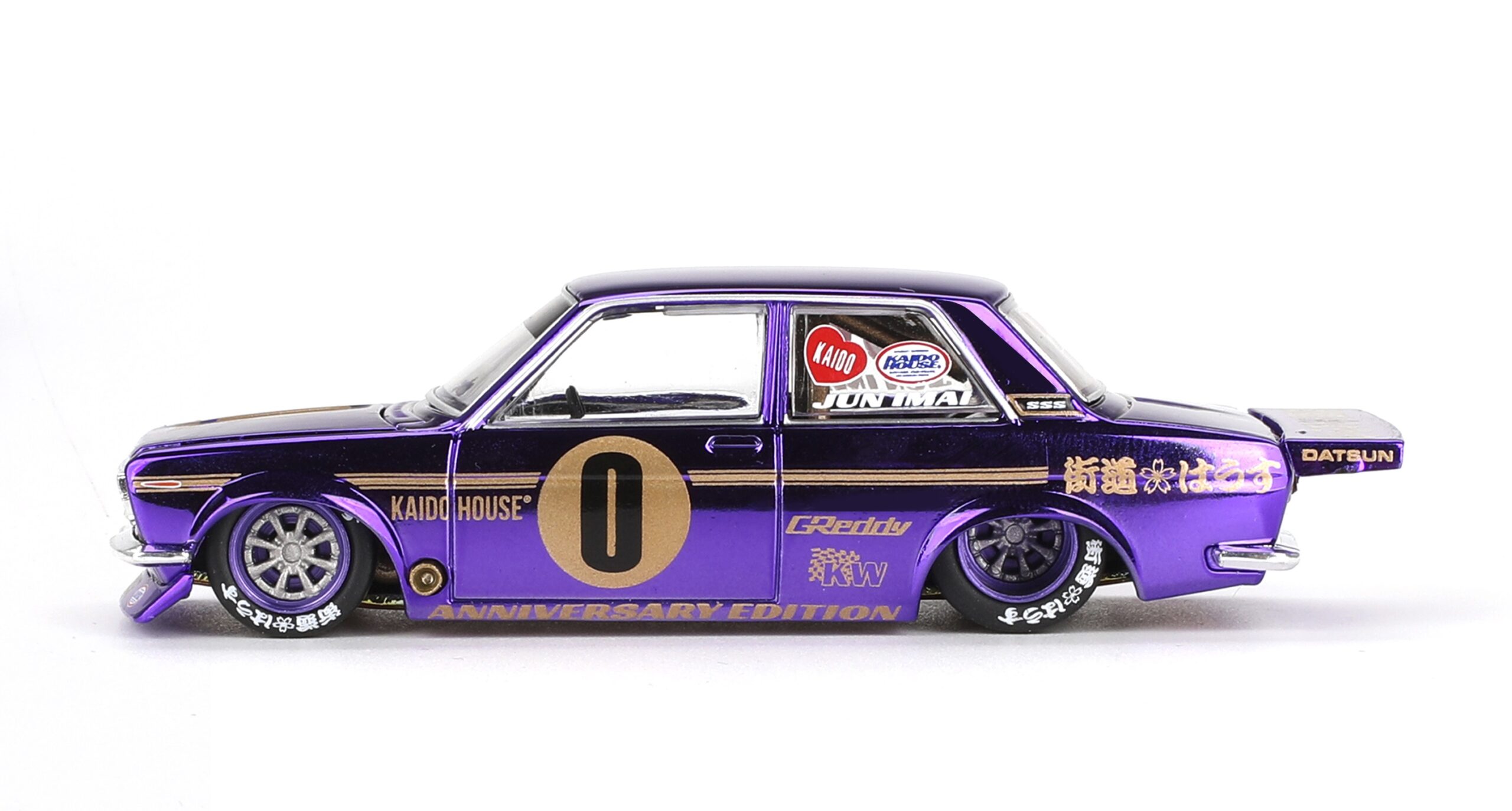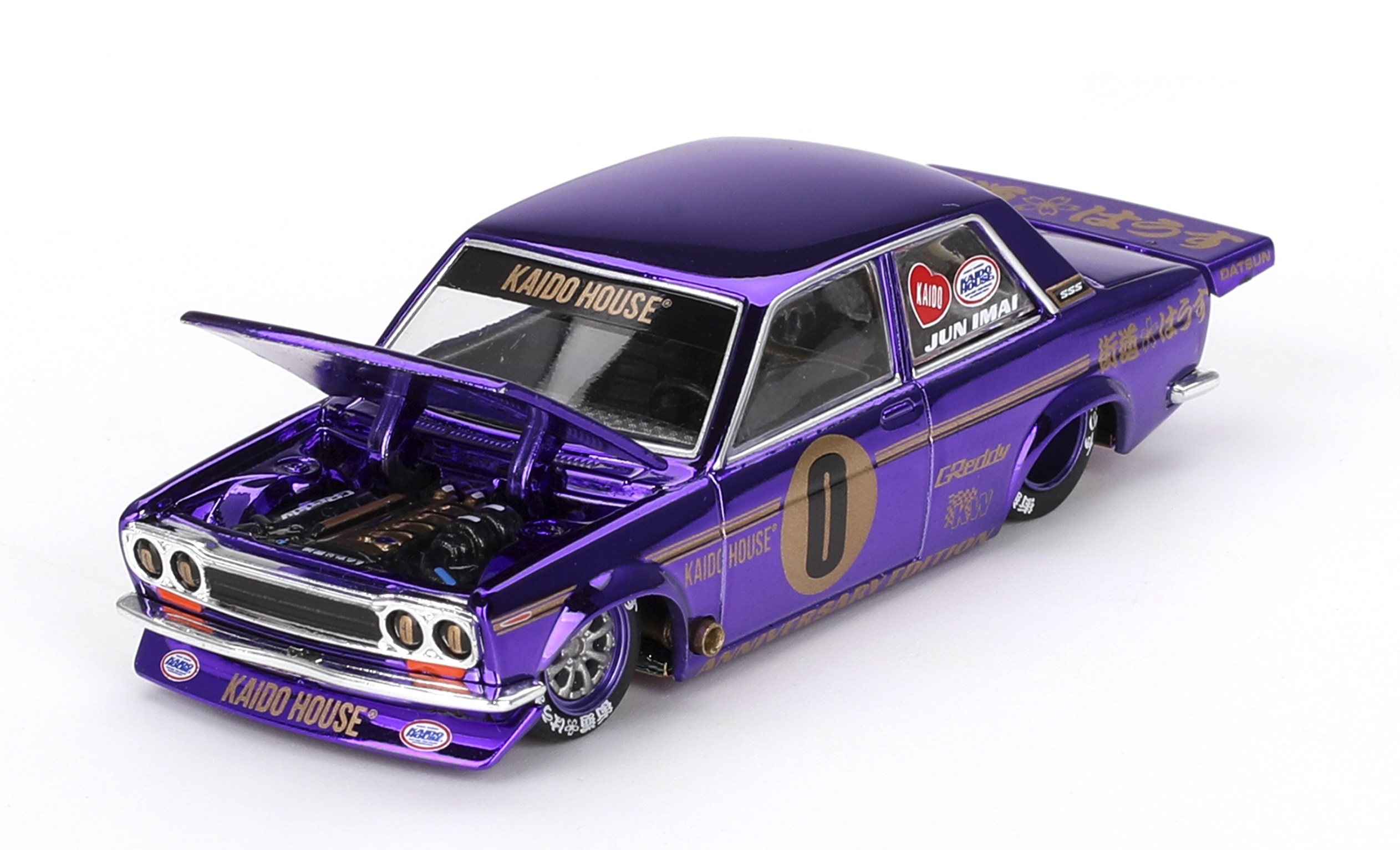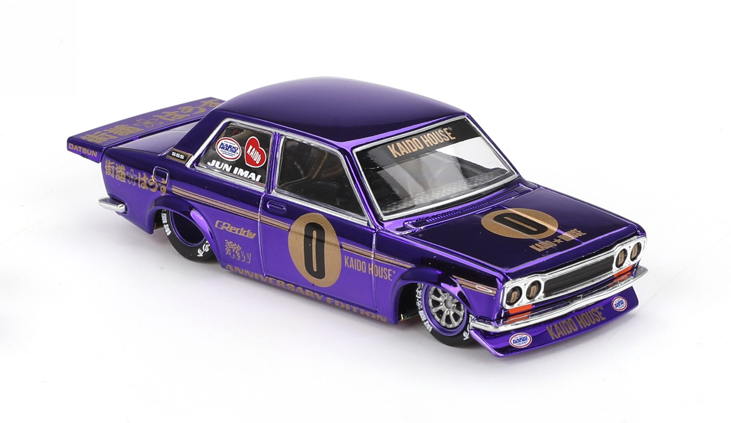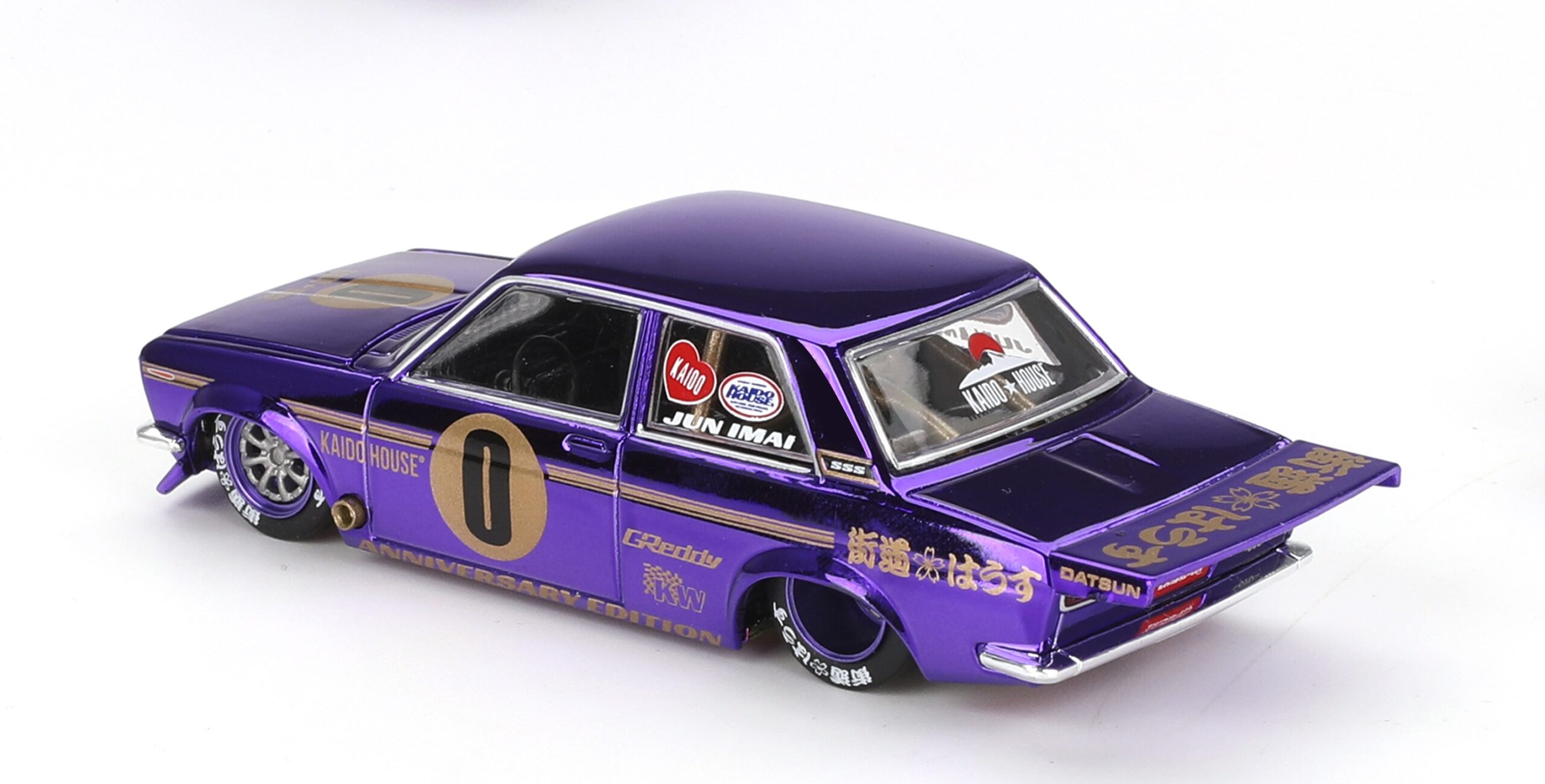 Kolekcjonerski model metalowy z elementami plastikowymi samochodu DATSUN 510 PRO STREET Anniversary Edition 1969. Model z serii Kaido House.
