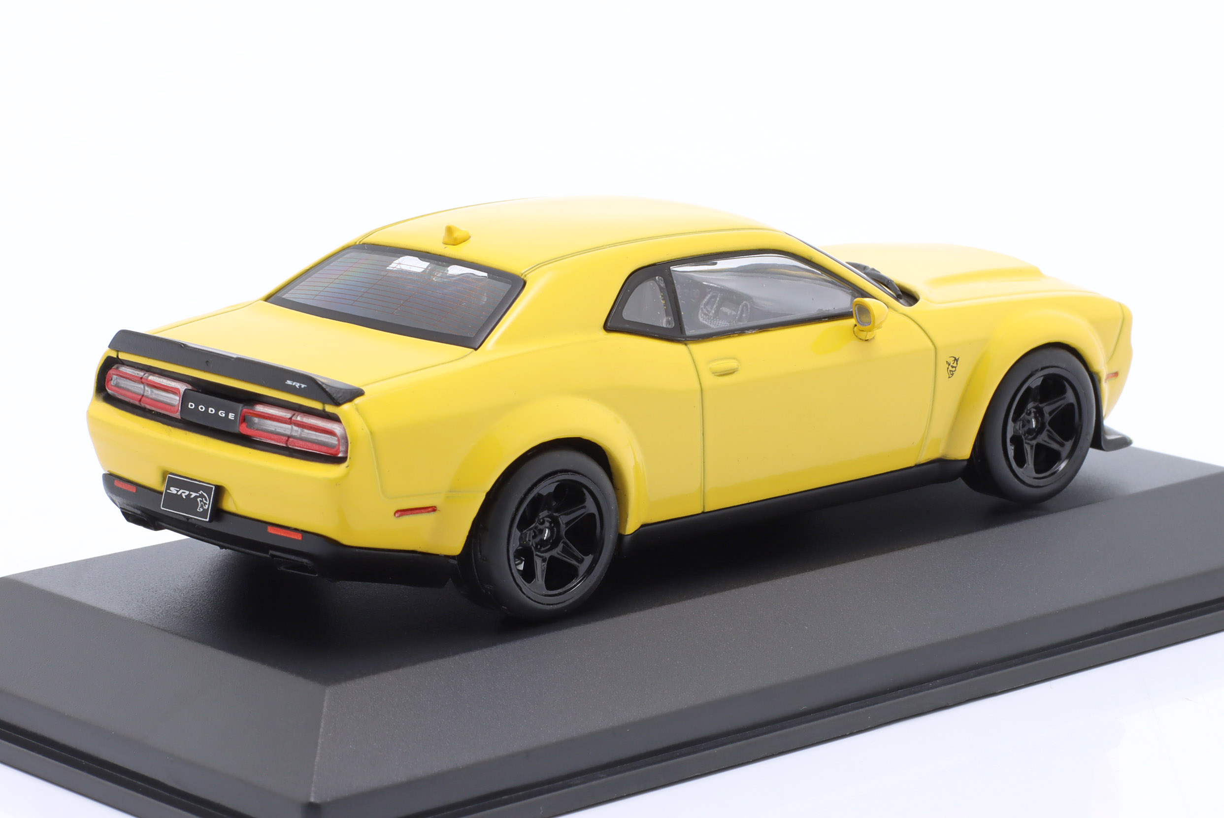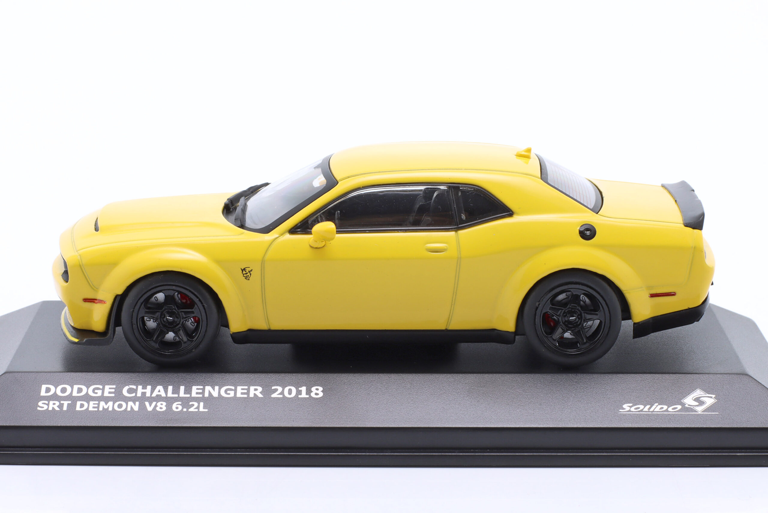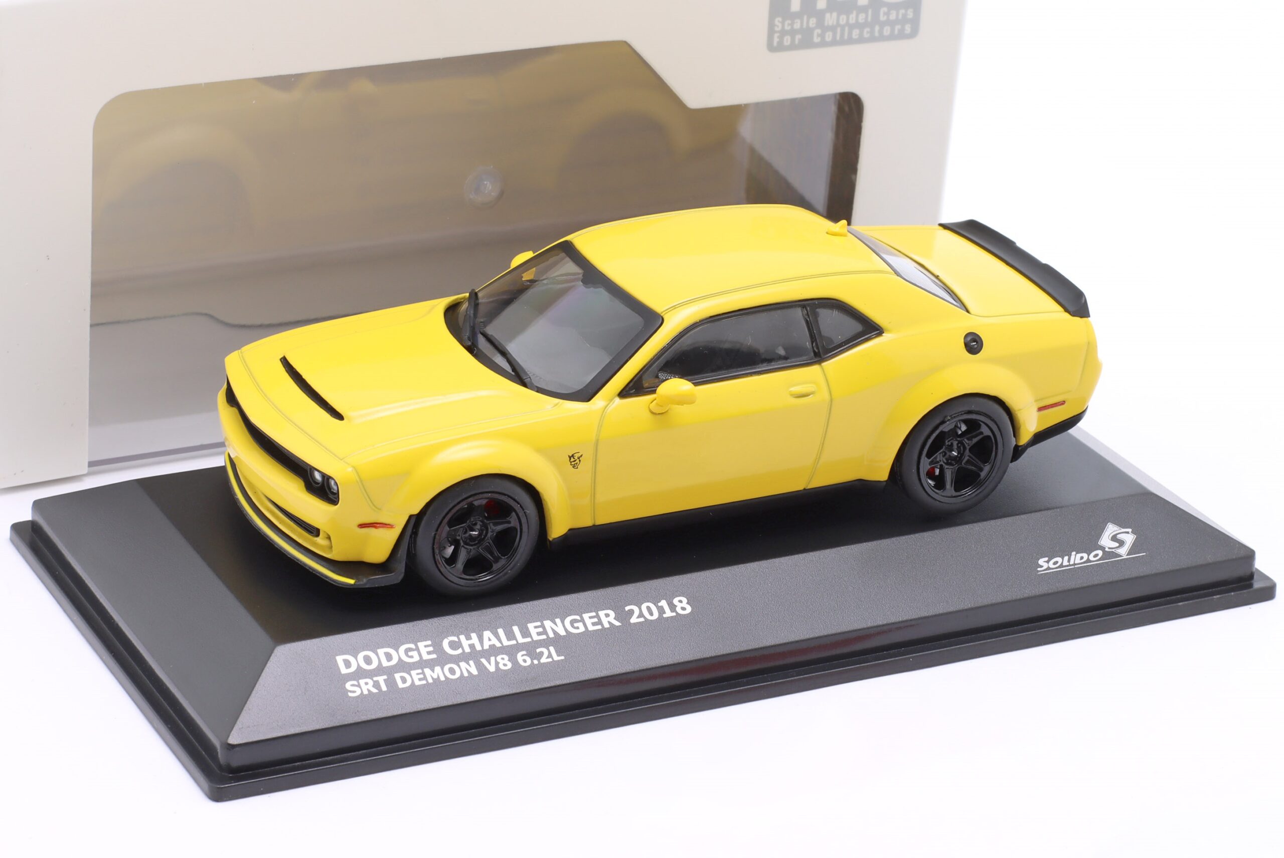Kolekcjonerski model metalowy z elementami plastikowymi samochodu DODGE CHALLENGER SRT DEMON V8 6.2L z roku 2018 w kolorze Żółtym.Model posiada podstawkę oraz gablotkę ekspozycyjną.
