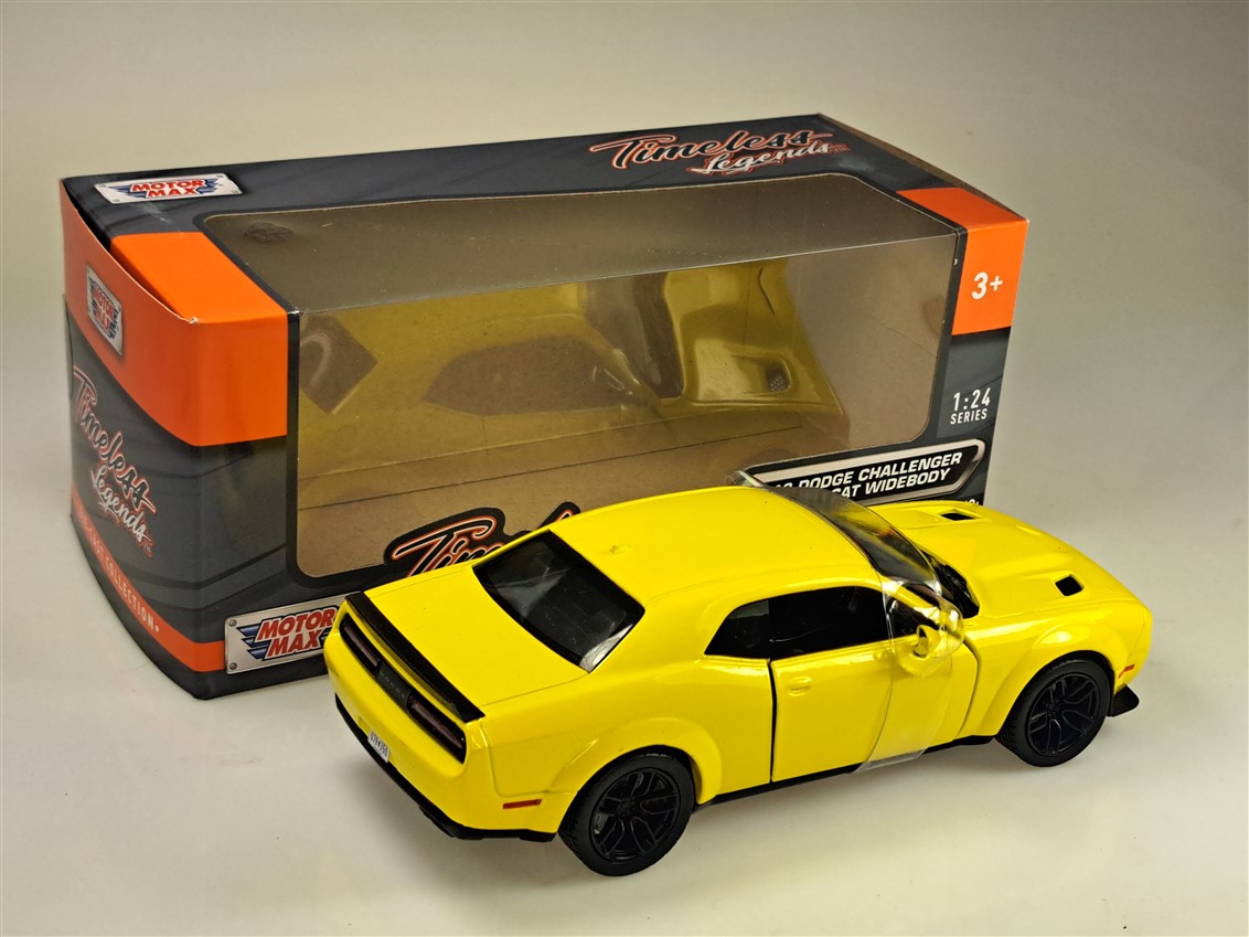 Kolekcjonerski model metalowy z elementami plastikowymi samochodu DODGE CHALLENGER SRT Hellcat Wide Body z roku 2018 w kolorze Żółtym.Posiada otwierane drzwi.Model zapakowany w kartonowe pudełko witrynką.