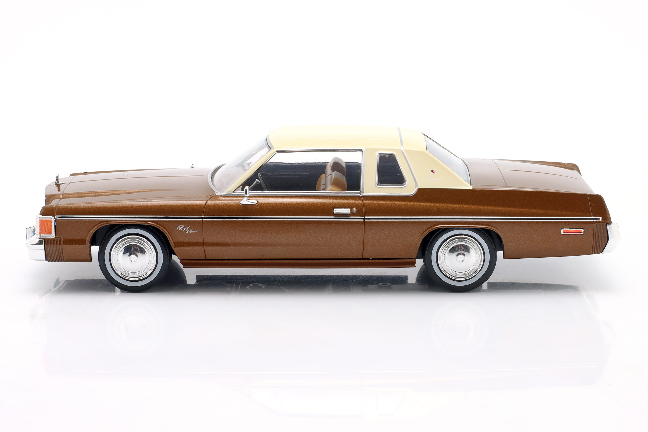Kolekcjonerski model metalowy z elementami plastikowymi samochodu DODGE ROYAL MONACO z roku 1977 w kolorze Brązowy metallic.Model nie posiada otwieranych elementów.Model na plastikowej podstawce,zapakowany w kartonowe pudełko z witrynką.