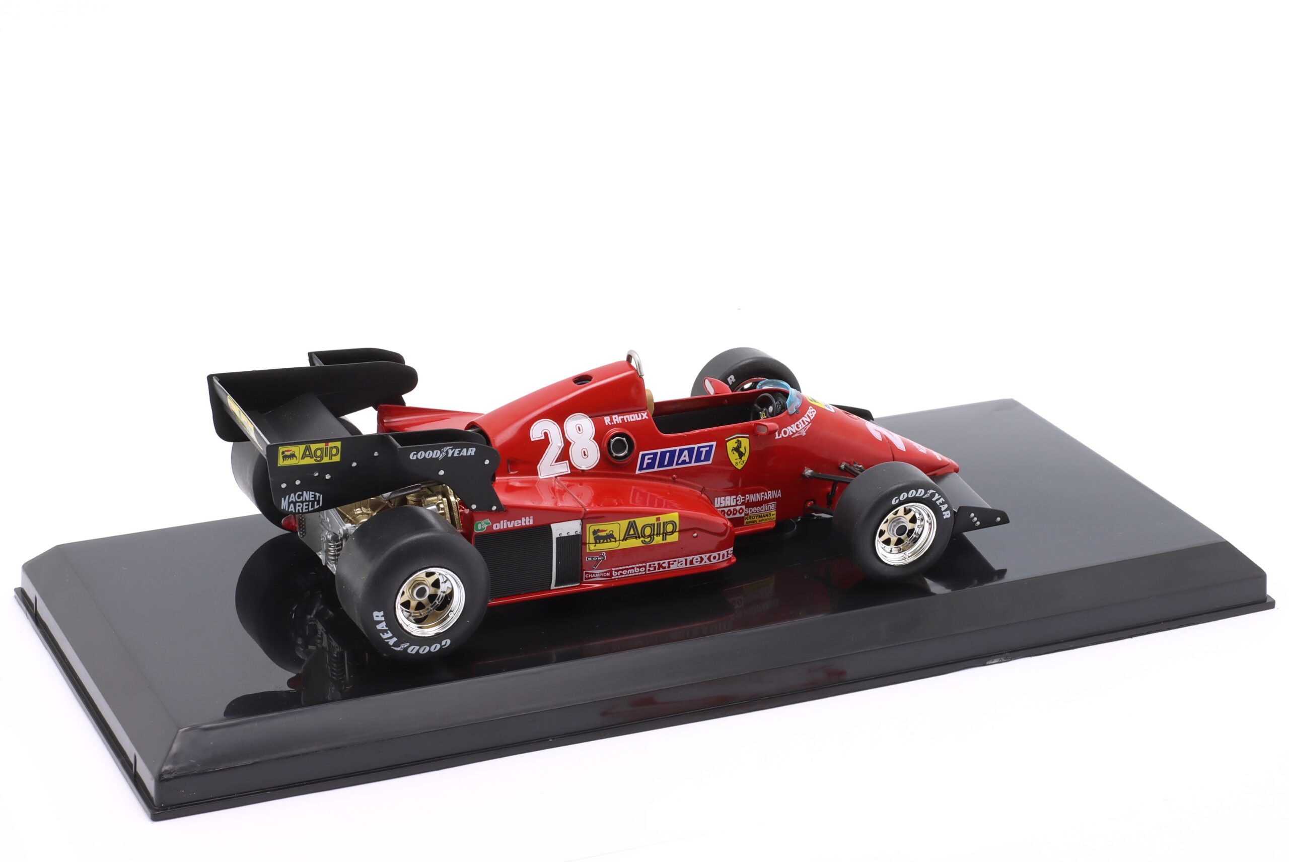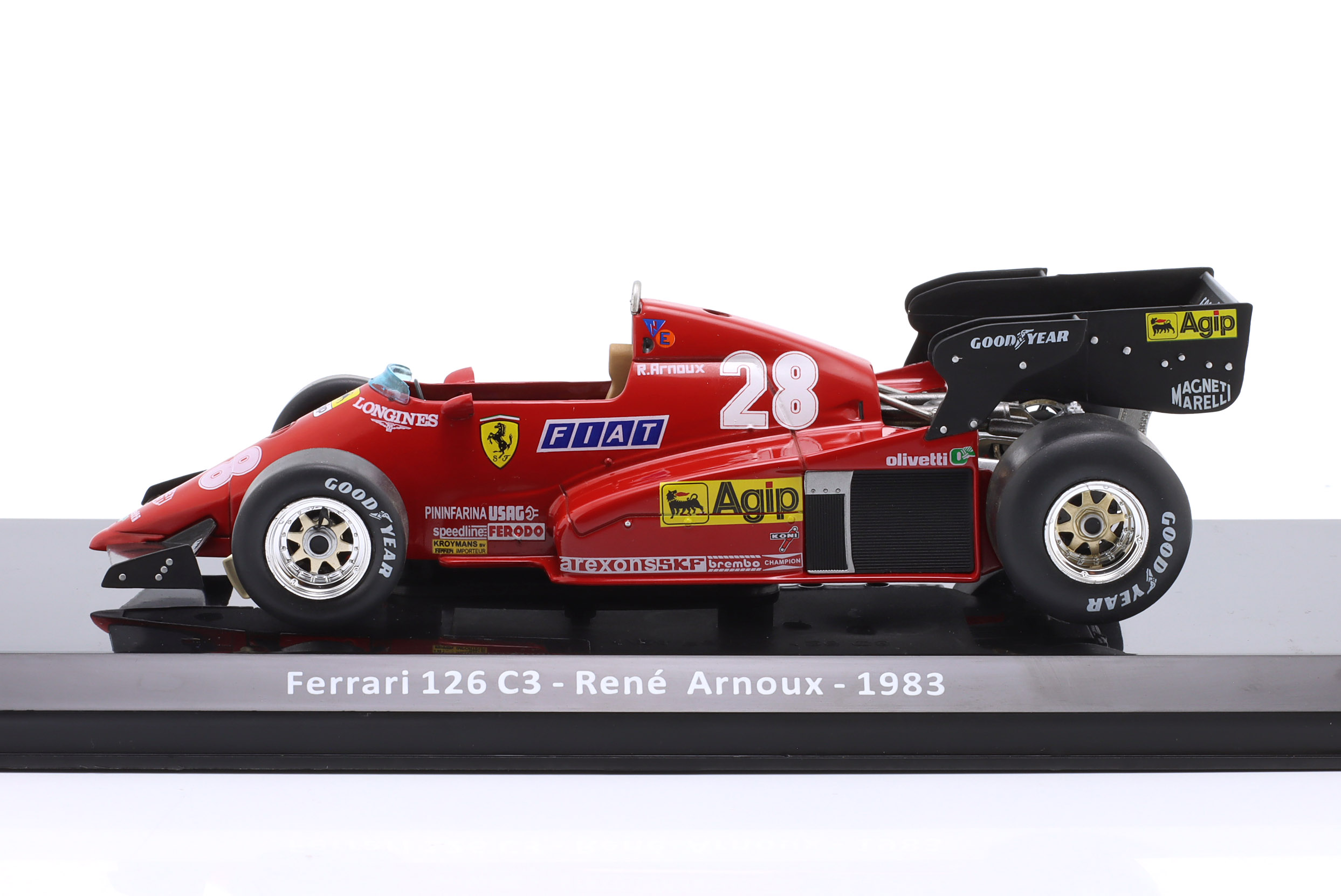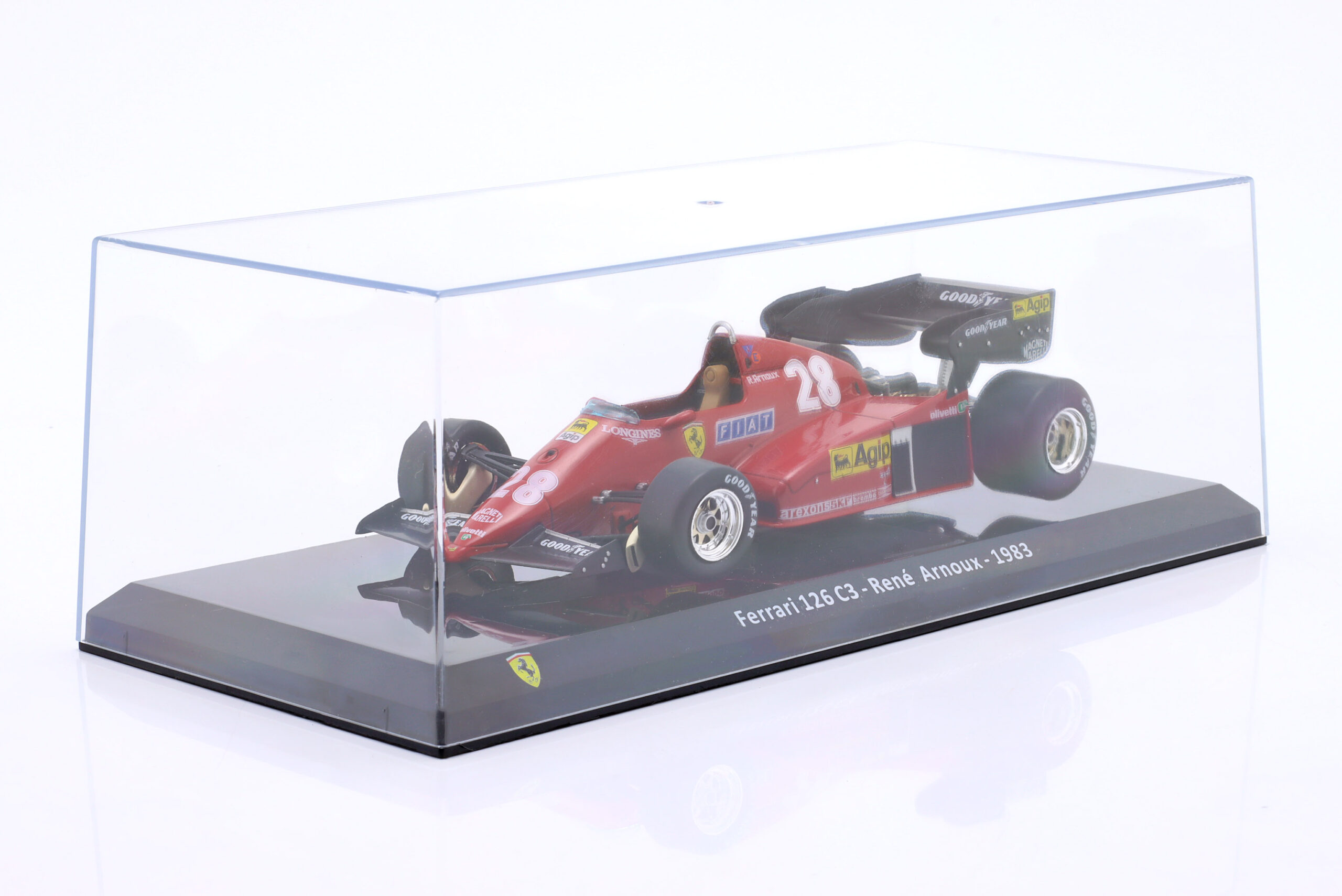 Kolekcjonerski model metalowy z elementami plastikowymi bolidu Formuły 1 ,FERRARI 126C3 #28 w którym Rene Arnoux startował w Mistrzostwach Świata Formuły 1 w sezonie 1983.Model na podstawce,posiada akrylową gablotkę ekspozycyjną.Nie posiada otwieranych elementów,Dodatkowo zapakowany w blister.