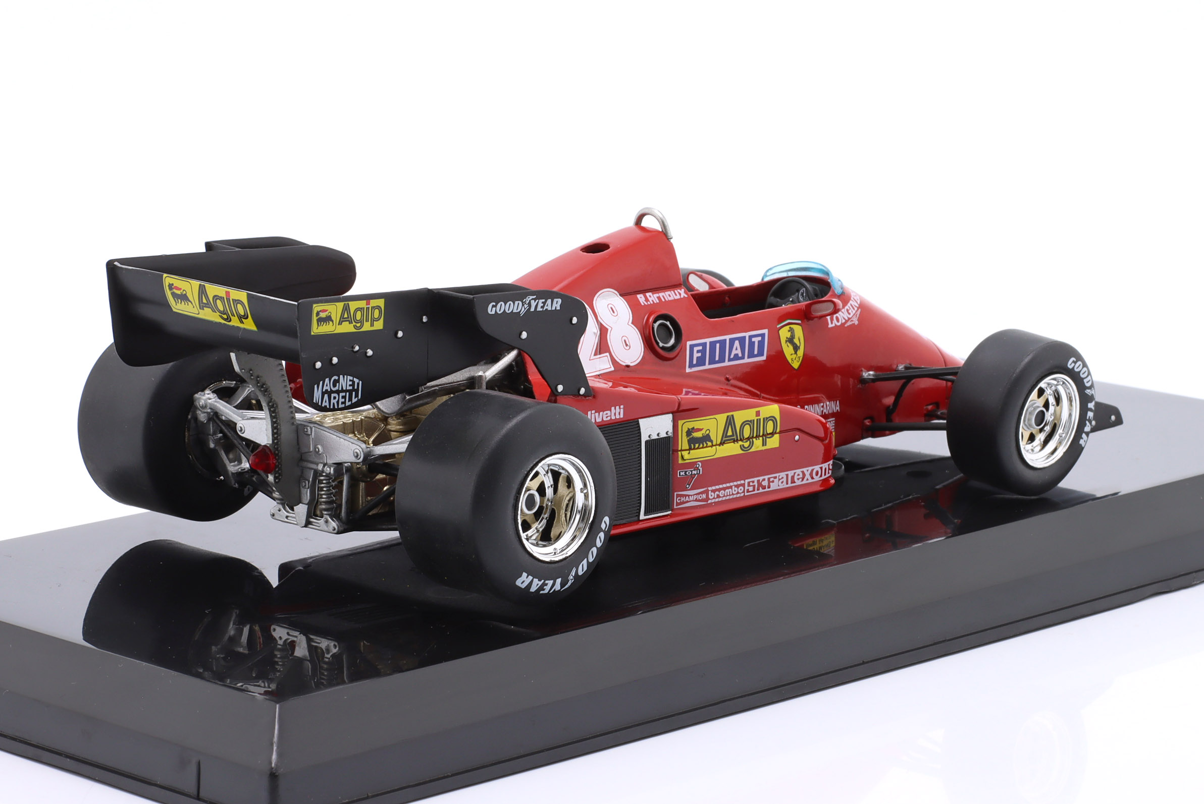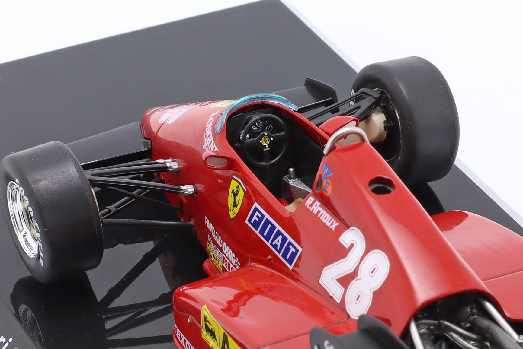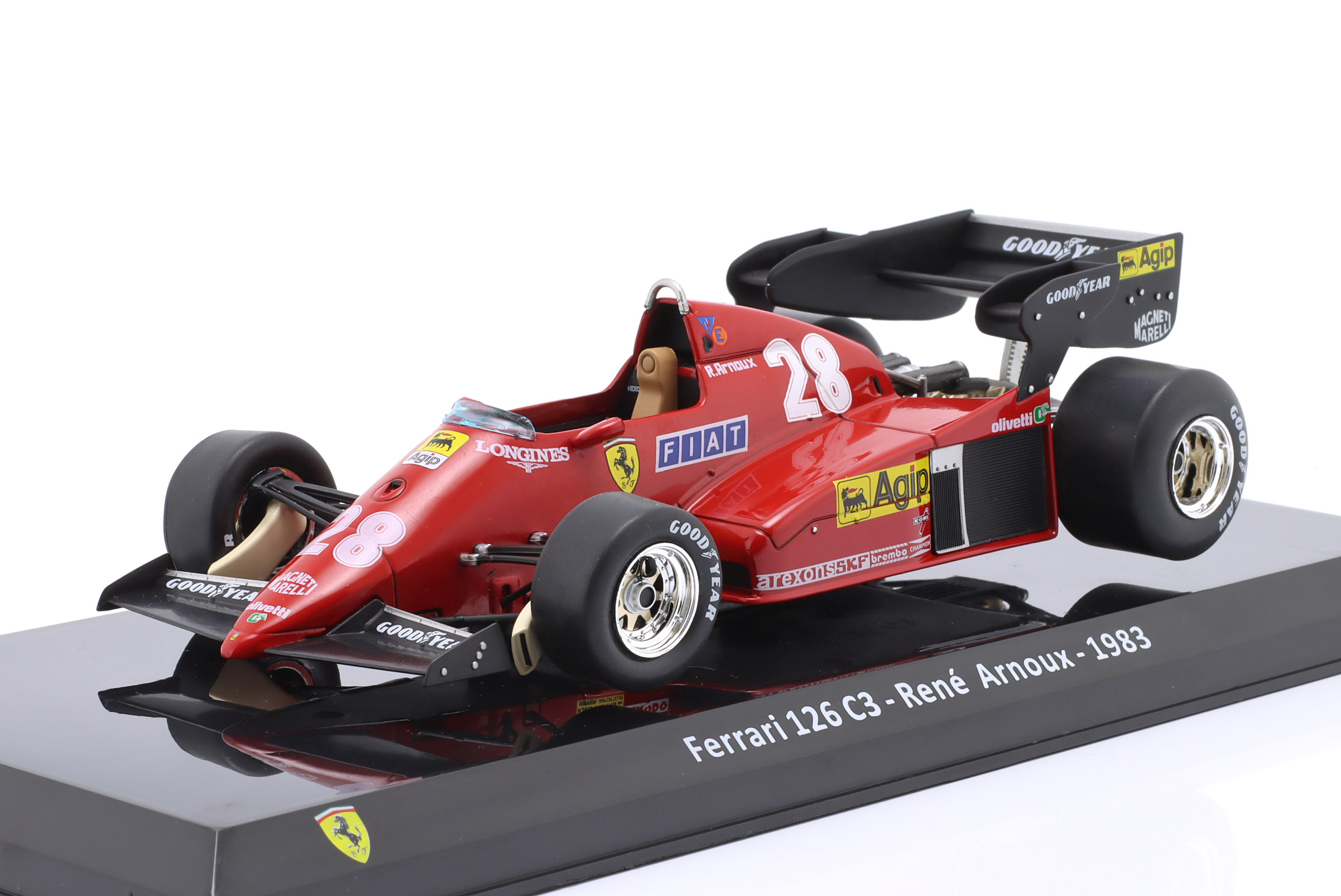 Kolekcjonerski model metalowy z elementami plastikowymi bolidu Formuły 1 ,FERRARI 126C3 #28 w którym Rene Arnoux startował w Mistrzostwach Świata Formuły 1 w sezonie 1983.Model na podstawce,posiada akrylową gablotkę ekspozycyjną.Nie posiada otwieranych elementów,Dodatkowo zapakowany w blister.