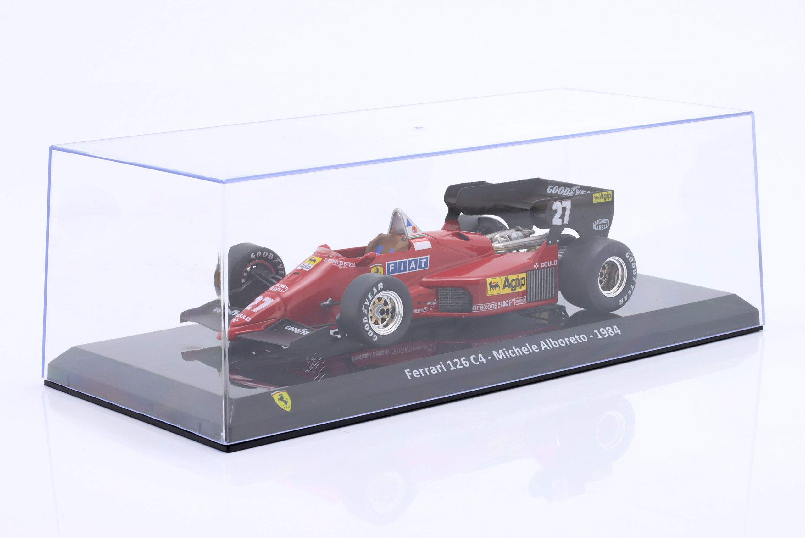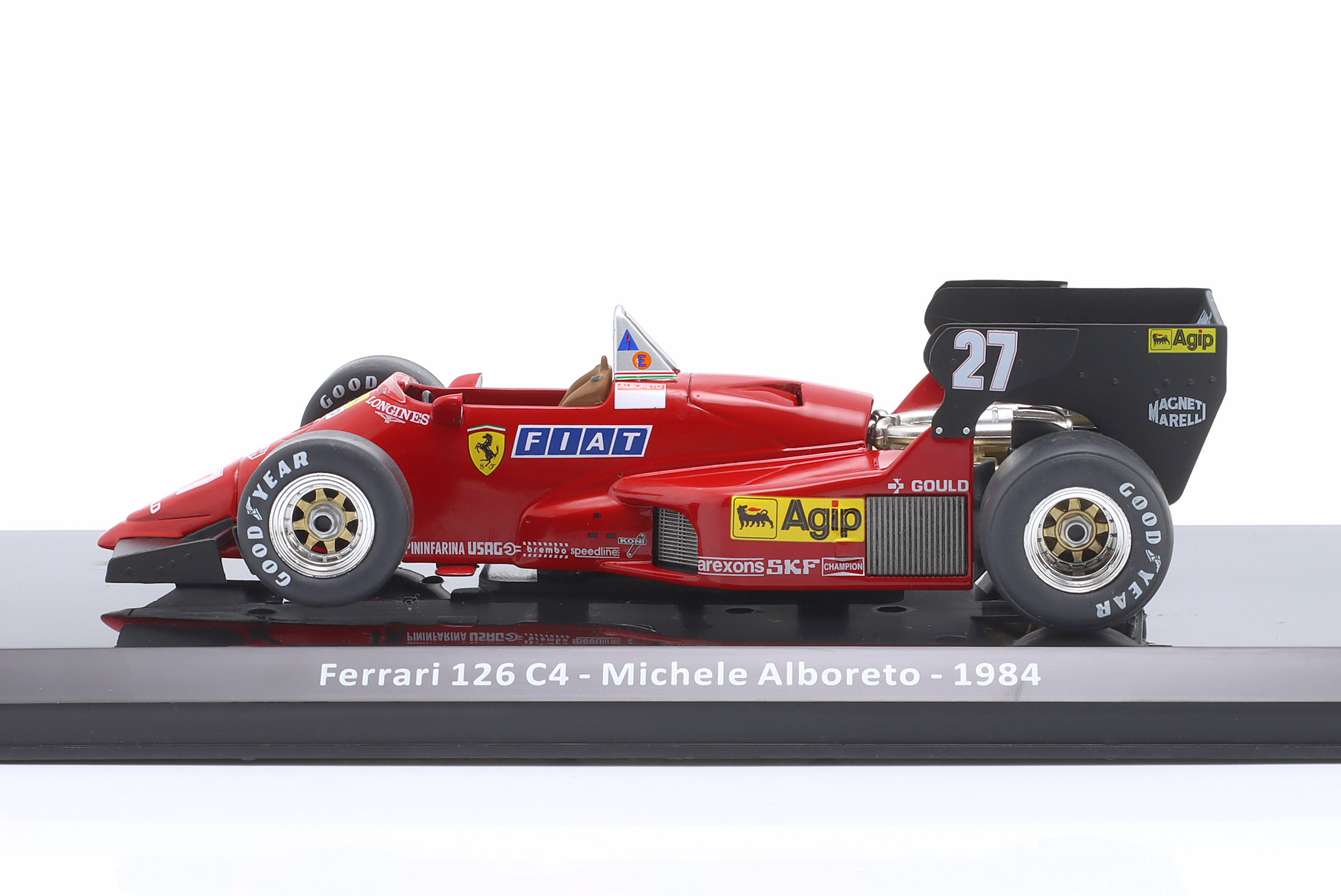 Kolekcjonerski model metalowy z elementami plastikowymi bolidu Formuły 1 FERRARI 126C4 #27,w którym Michele Alboreto startował w Mistrzostwach Świata Formuły 1 w sezonie 1984.Model na podstawce,posiada akrylową gablotkę ekspozycyjną.Nie posiada otwieranych elementów,Dodatkowo zapakowany w blister.