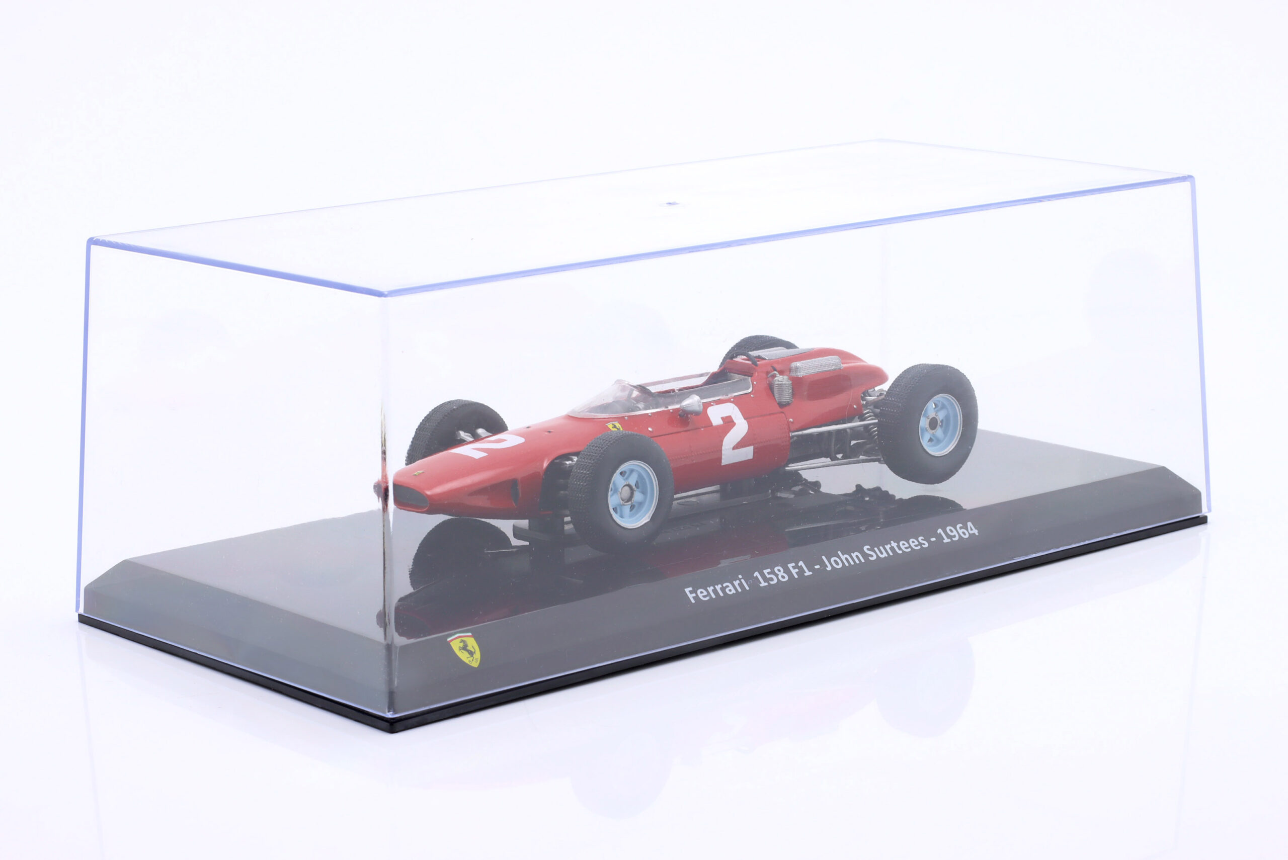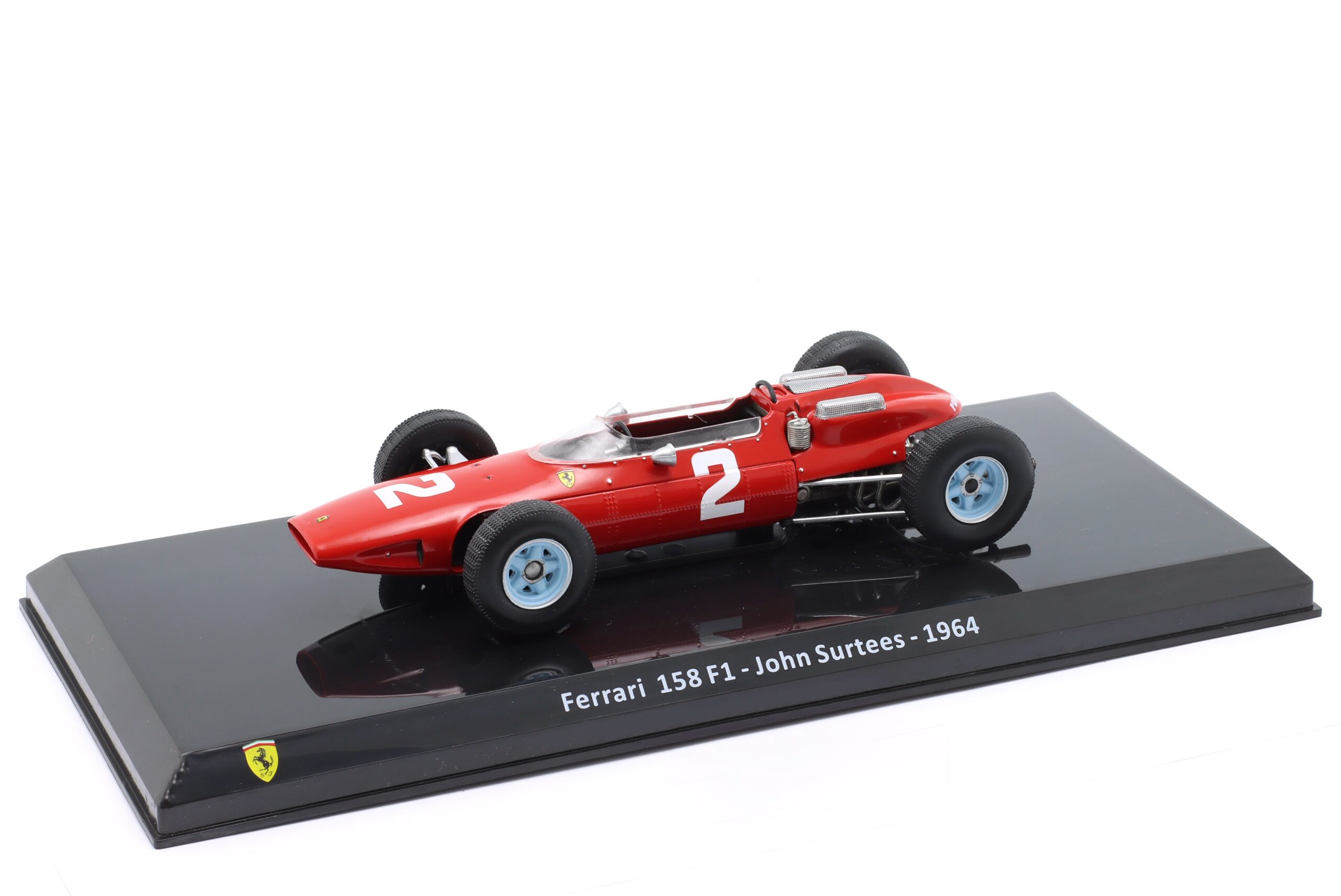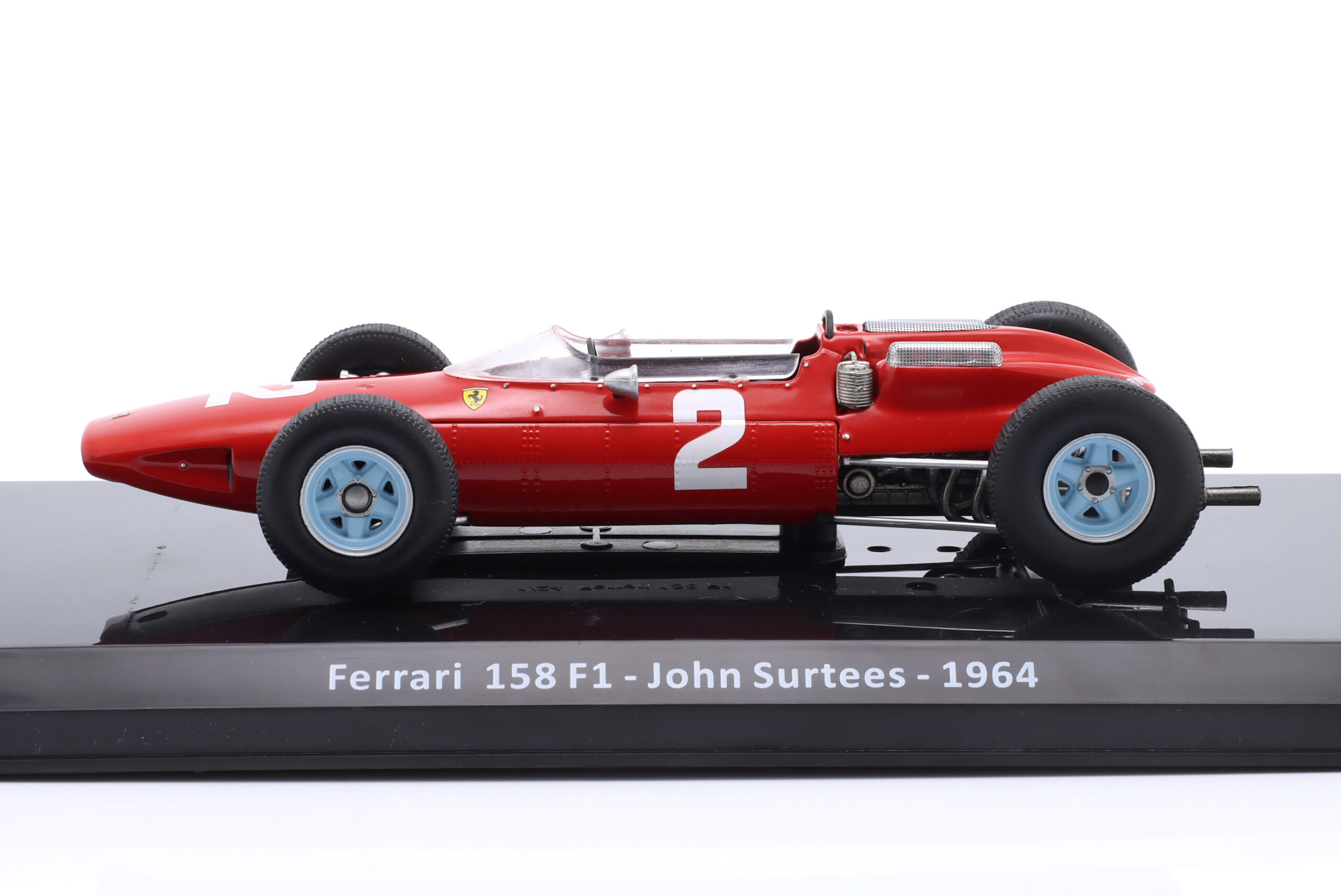 Kolekcjonerski model metalowy z elementami plastikowymi bolidu Formuły 1 FERRARI 158 F1 #2 ,w którym John Surtees zdobył Tytuł Mistrza Świata Formuły 1 w sezonie 1964.Model na podstawce,posiada akrylową gablotkę ekspozycyjną.Nie posiada otwieranych elementów,Dodatkowo zapakowany w blister.