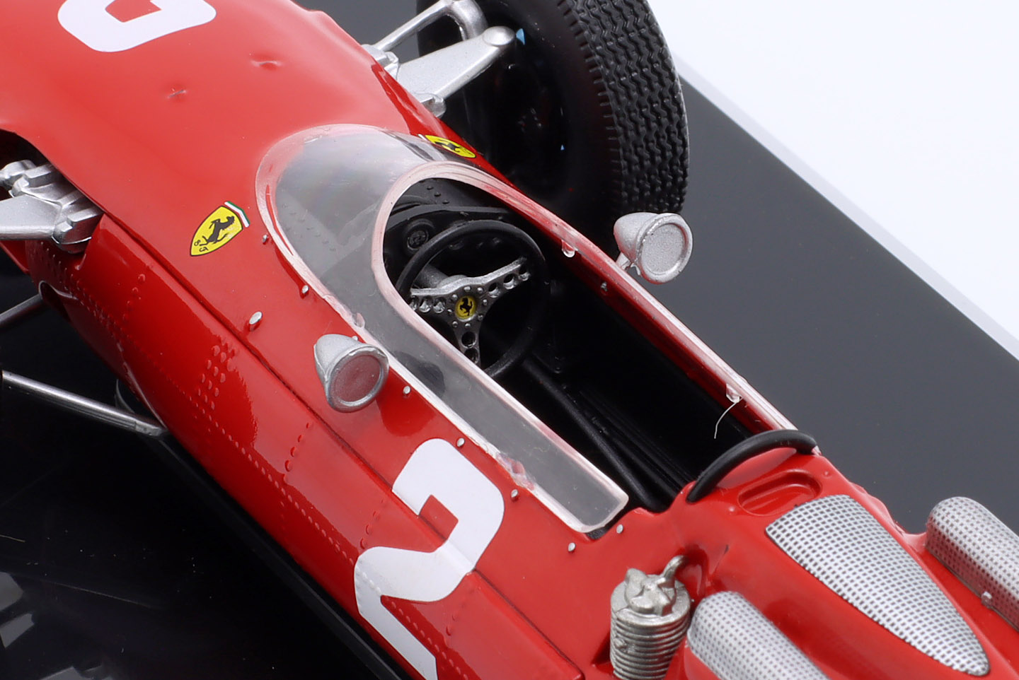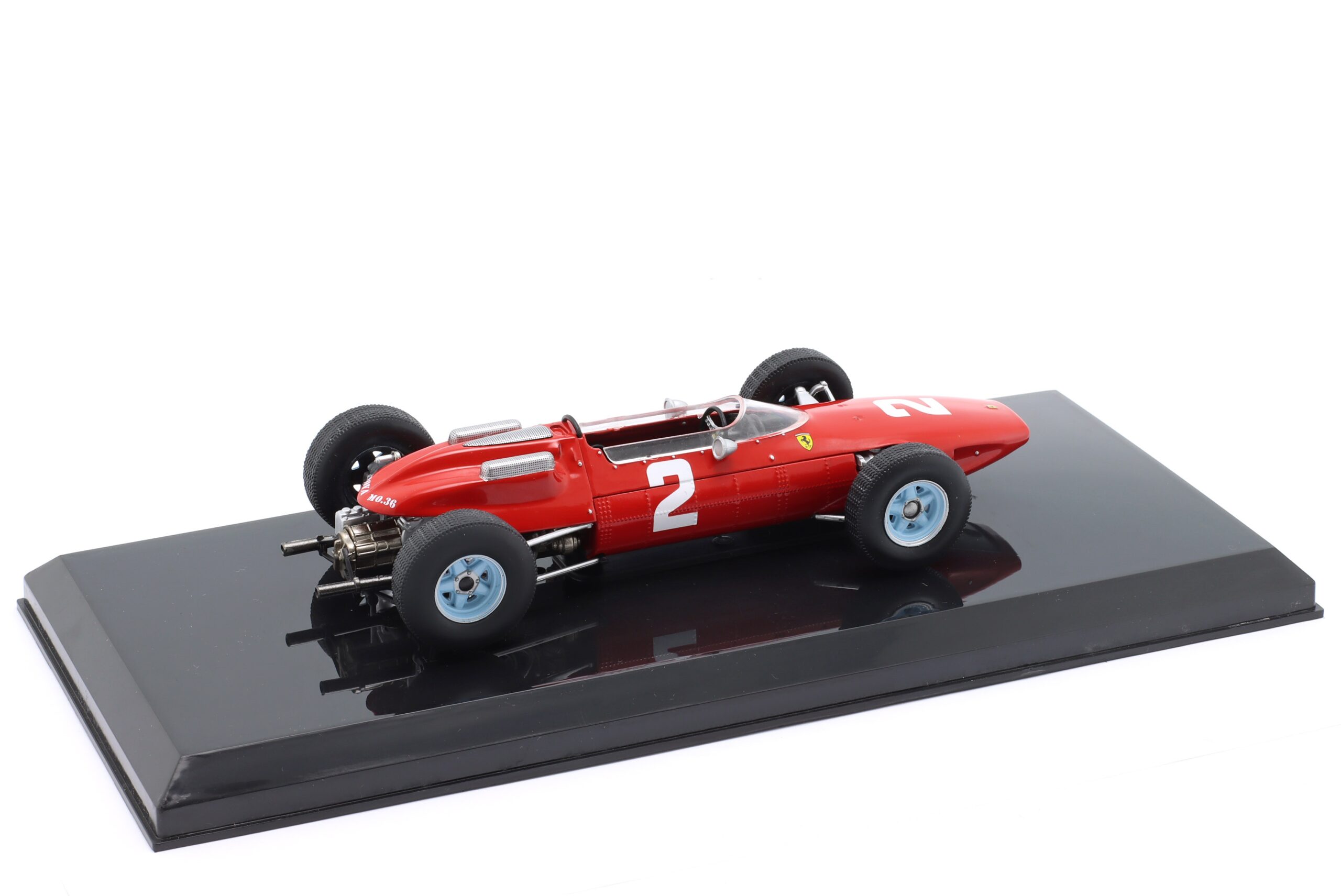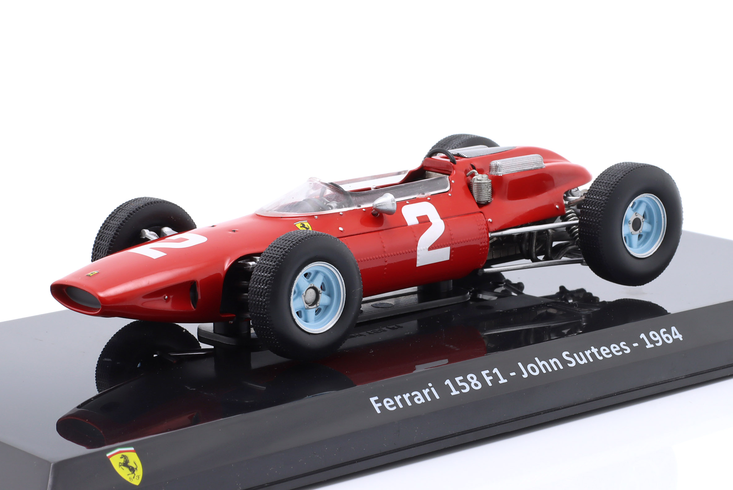 Kolekcjonerski model metalowy z elementami plastikowymi bolidu Formuły 1 FERRARI 158 F1 #2 ,w którym John Surtees zdobył Tytuł Mistrza Świata Formuły 1 w sezonie 1964.Model na podstawce,posiada akrylową gablotkę ekspozycyjną.Nie posiada otwieranych elementów,Dodatkowo zapakowany w blister.