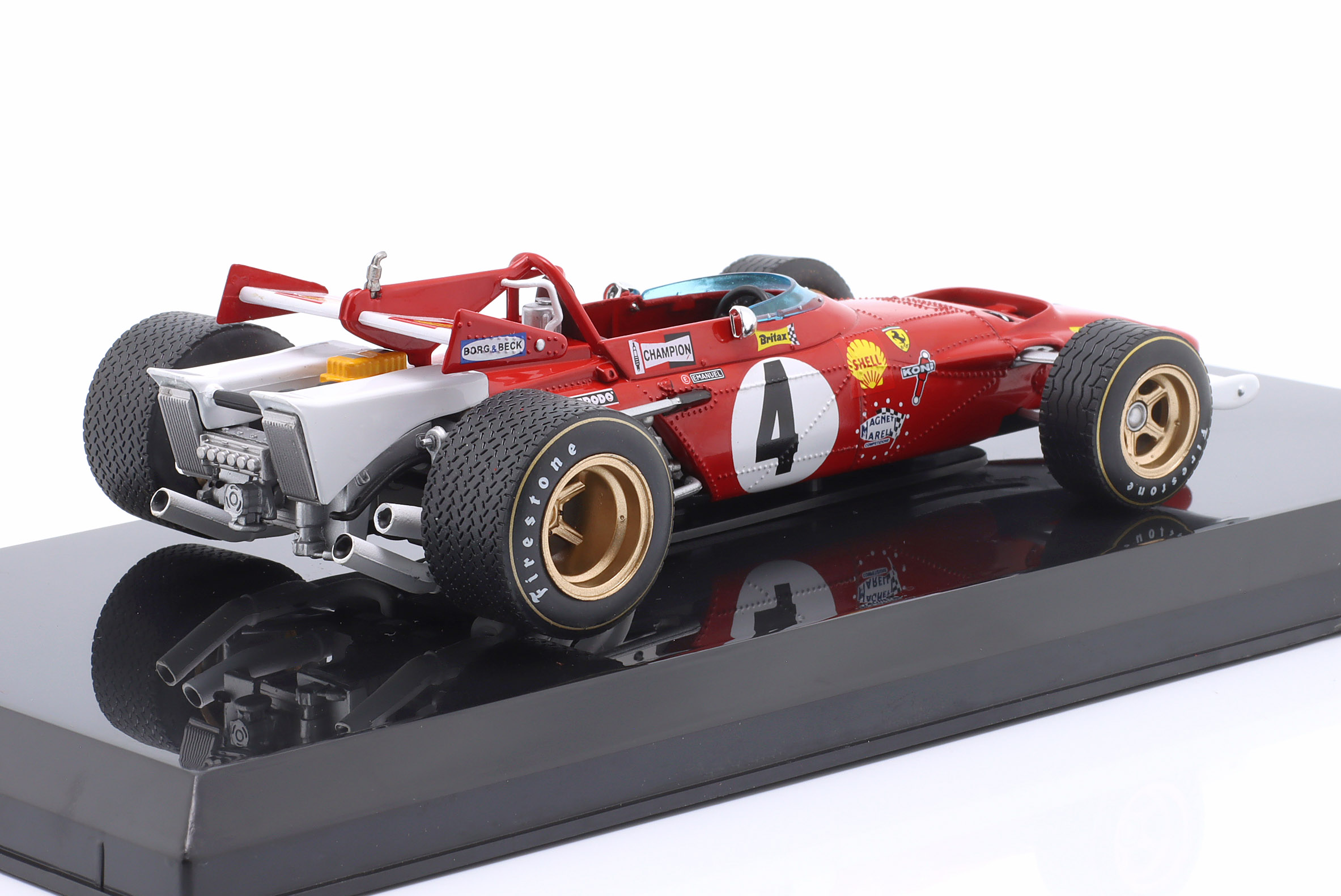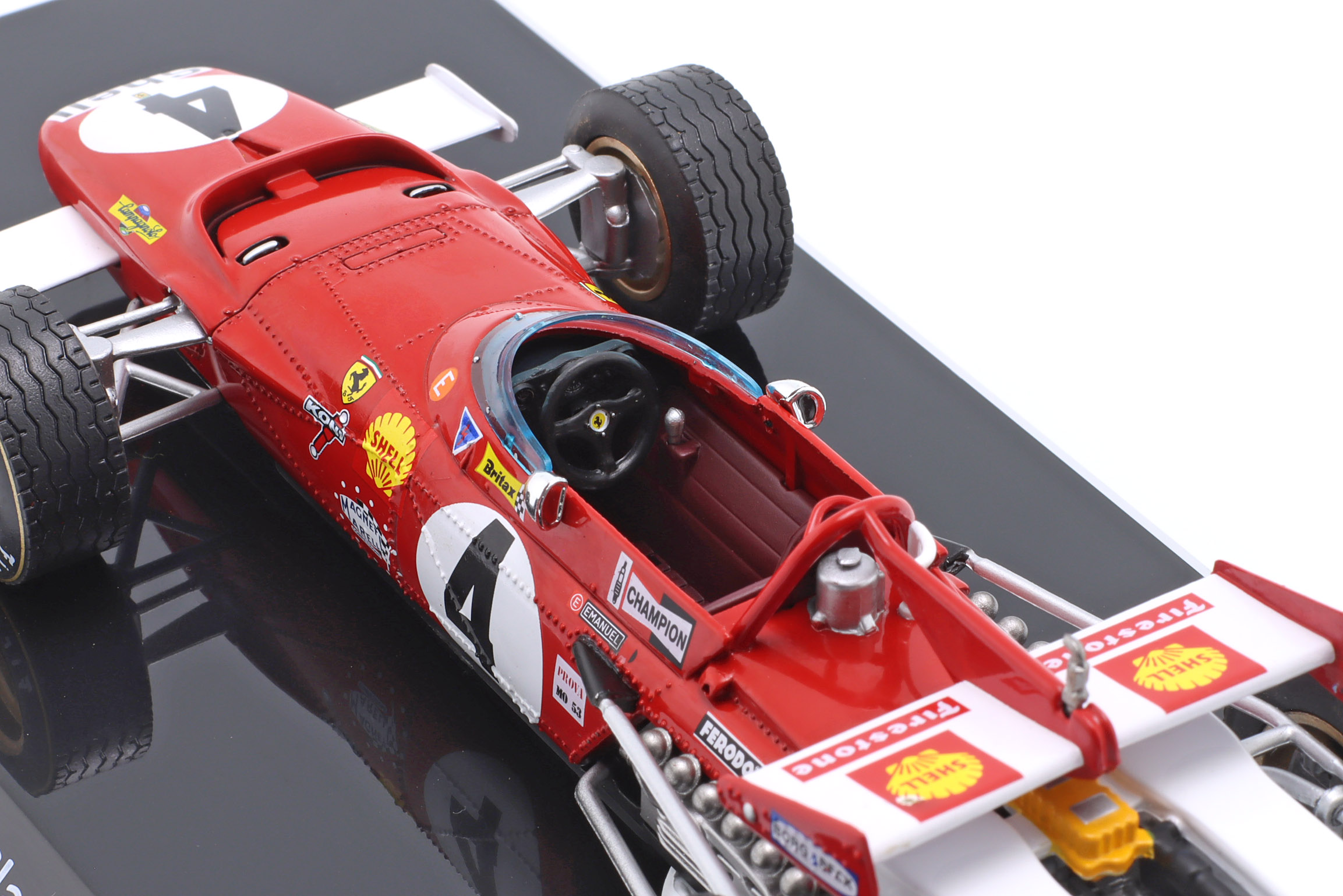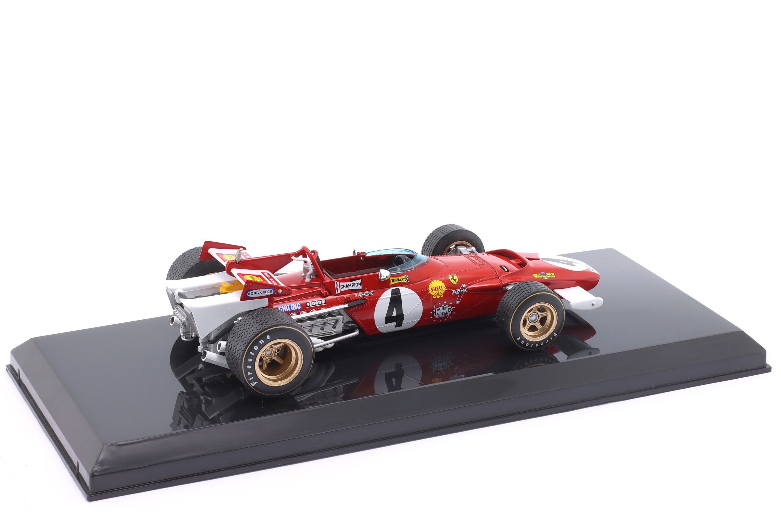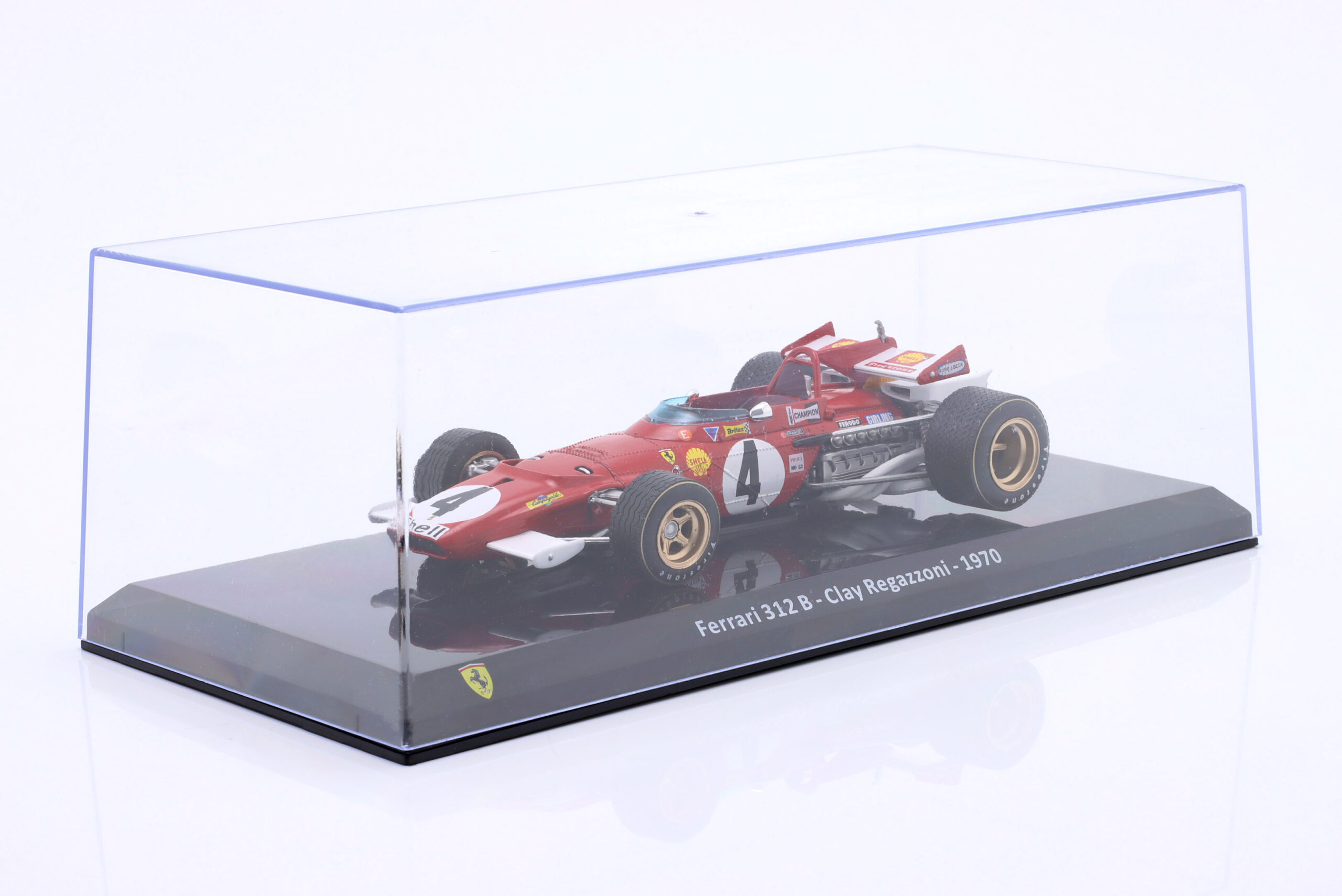 Kolekcjonerski model metalowy z elementami plastikowymi bolidu Formuły 1 FERRARI 312B #4,w którym Clay Regazzoni startował w Mistrzostwach Świata Formuły 1 w sezonie 1970 i zajął 3-cie miejsce w klasyfikacji generalnej.Model na podstawce,posiada akrylową gablotkę ekspozycyjną.Nie posiada otwieranych elementów,Dodatkowo zapakowany w blister.