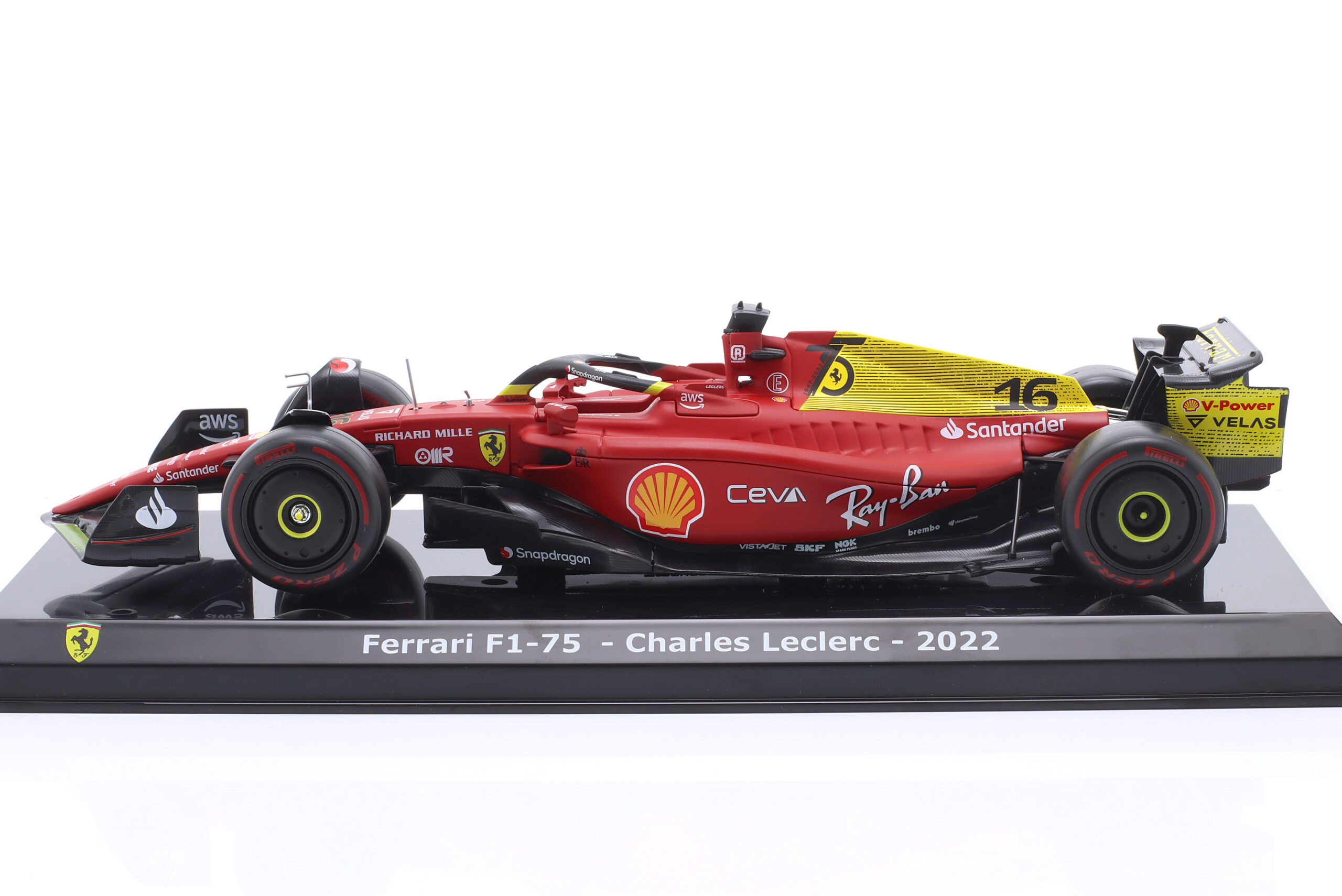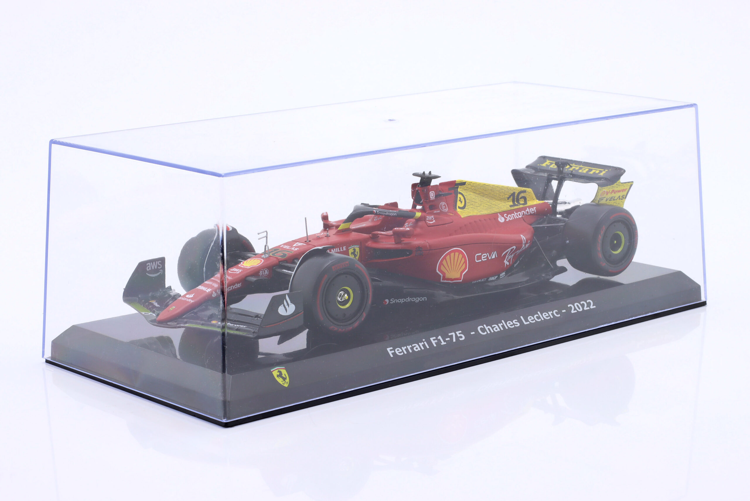 Kolekcjonerski model metalowy z elementami plastikowymi bolidu Formuły 1 FERRARI F1-75 #16,w którym Charles Leclerc zajął 2-gie miejsce w GP F1 Włoch w sezonie 2022.Model na podstawce,posiada akrylową gablotkę ekspozycyjną.Nie posiada otwieranych elementów,Dodatkowo zapakowany w blister.