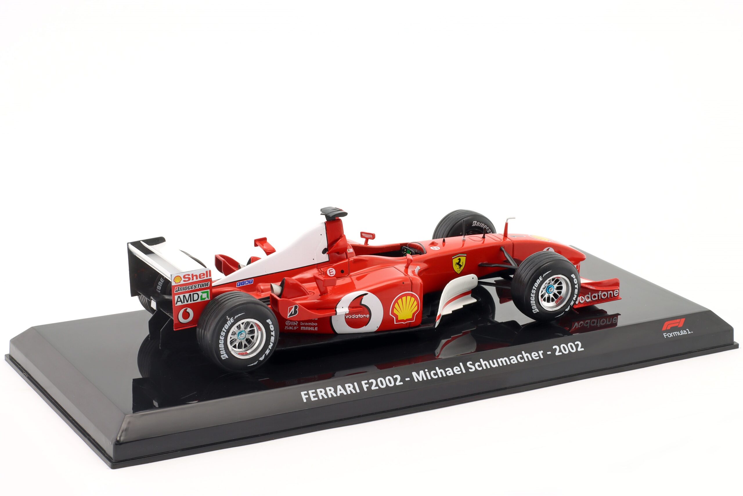 Kolekcjonerski model metalowy z elementami plastikowymi bolidu Formuły 1 FERRARI F2002 #1 w którym Michael Schumacher startował w sezonie 2002 zdobywając Tytuł Mistrza Świata.Model na podstawce,zapakowany w blister.