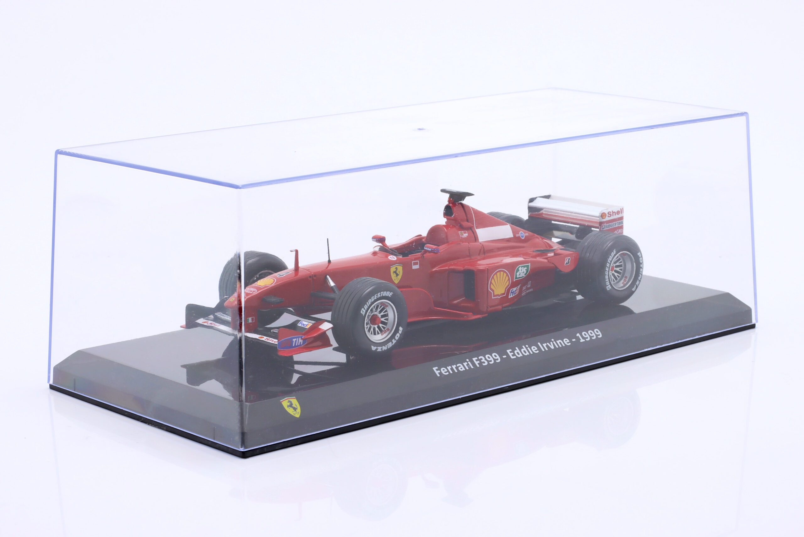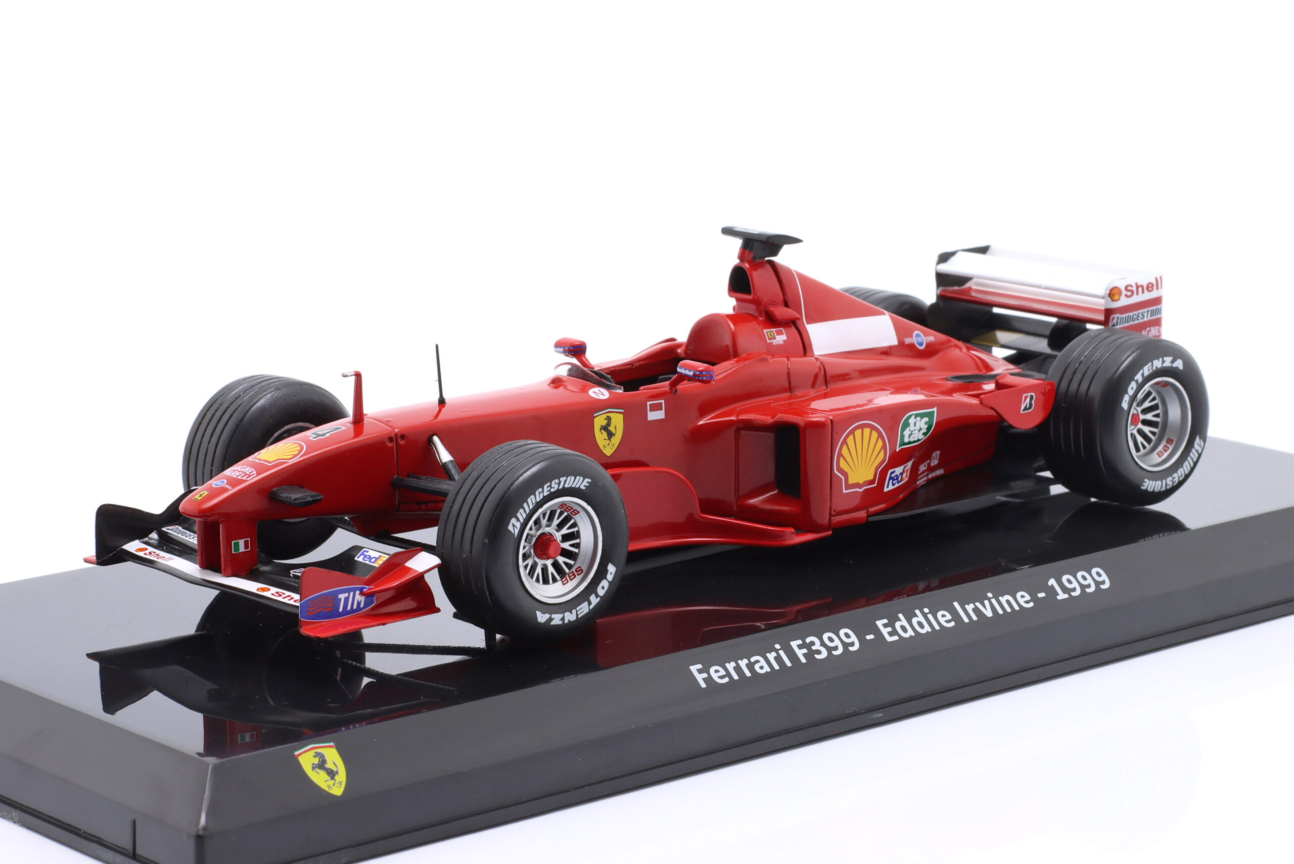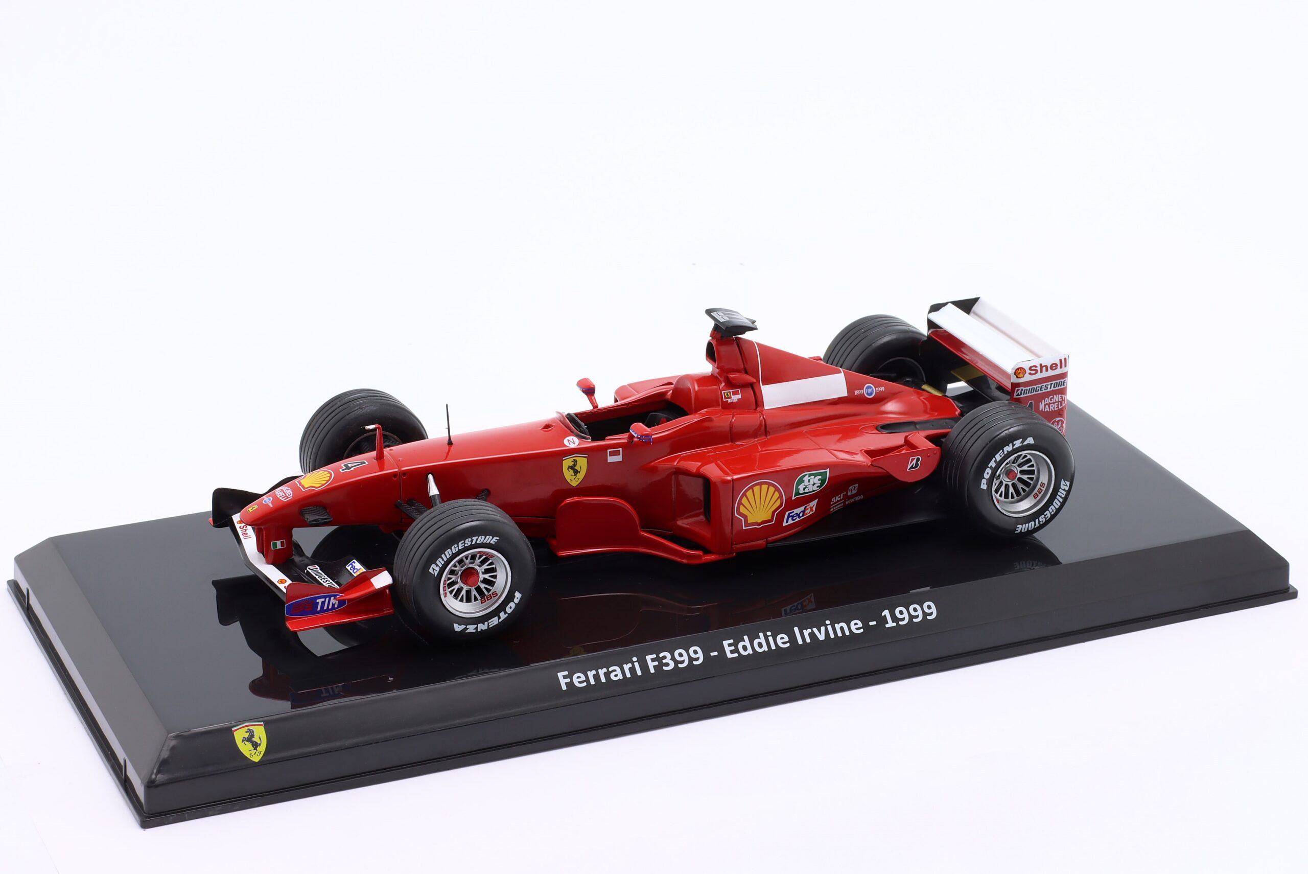 Kolekcjonerski model metalowy z elementami plastikowymi bolidu Formuły 1 FERRARI F399 #4,w którym Eddie Irvine zajął 2-gie miejsce w Mistrzostwach Świata Formuły 1 w sezonie 1999.Model na podstawce,posiada akrylową gablotkę ekspozycyjną.Nie posiada otwieranych elementów,Dodatkowo zapakowany w blister.