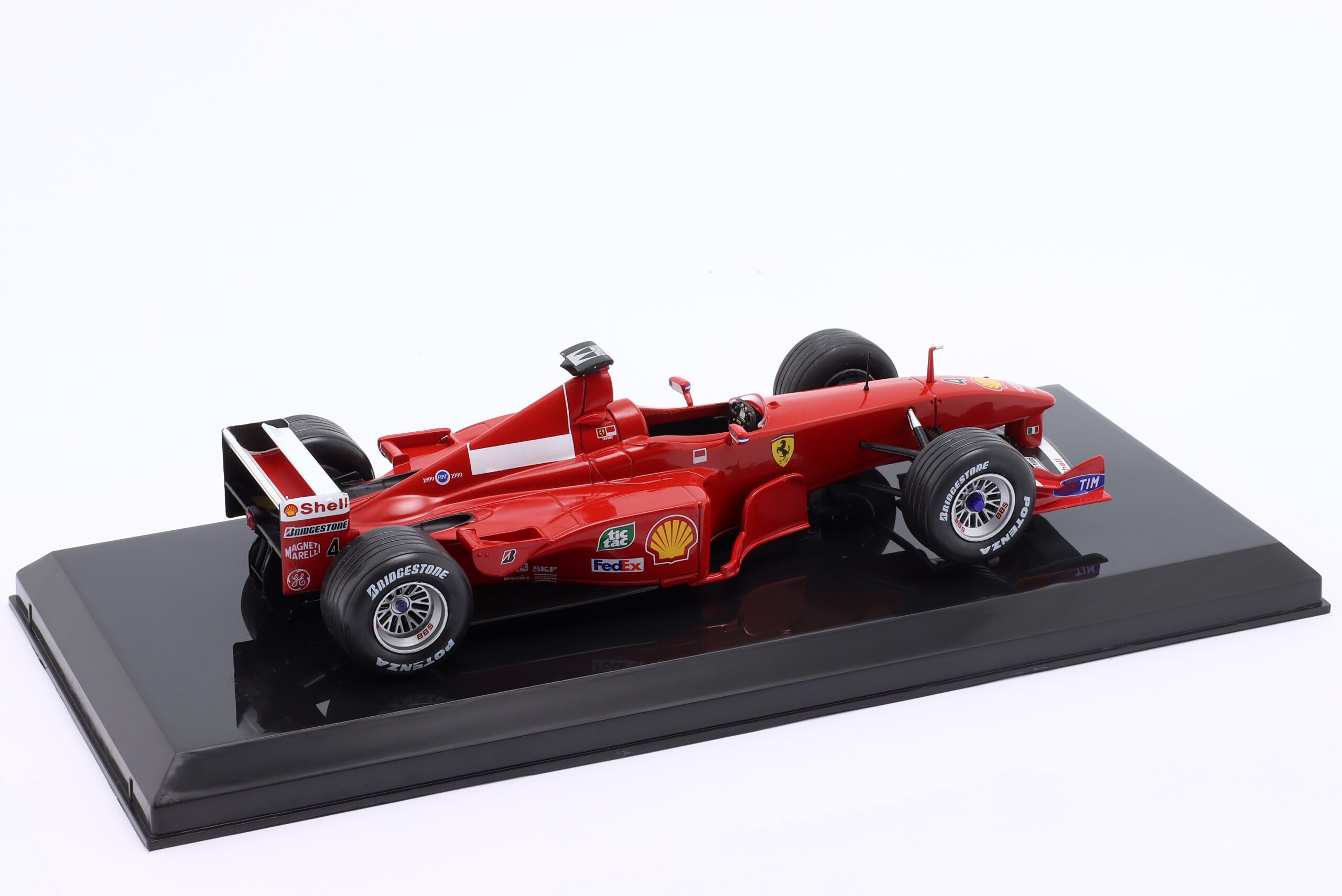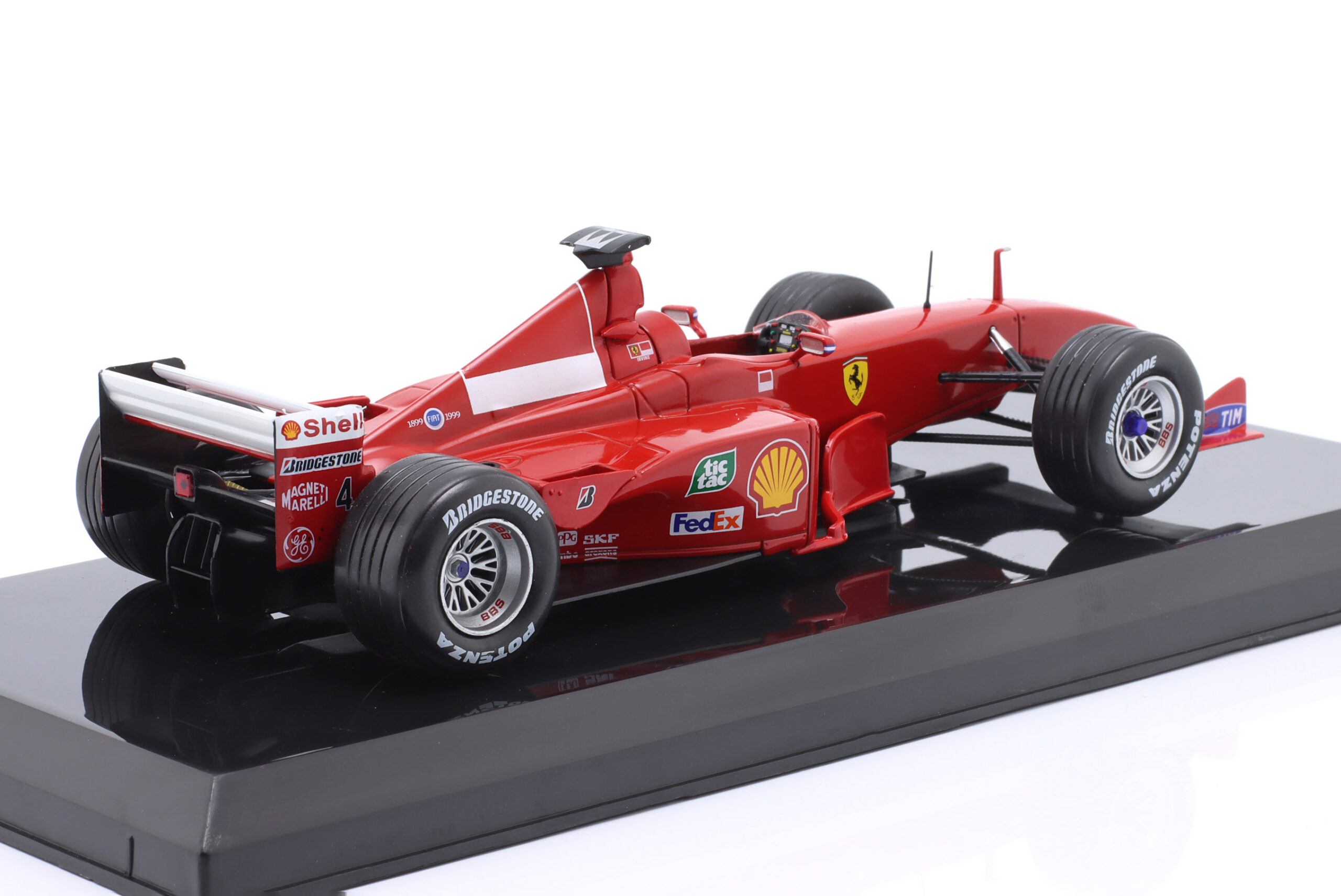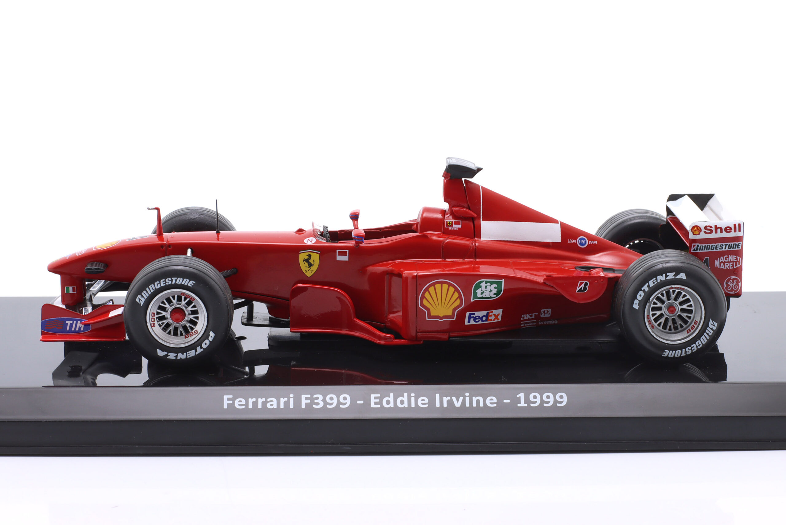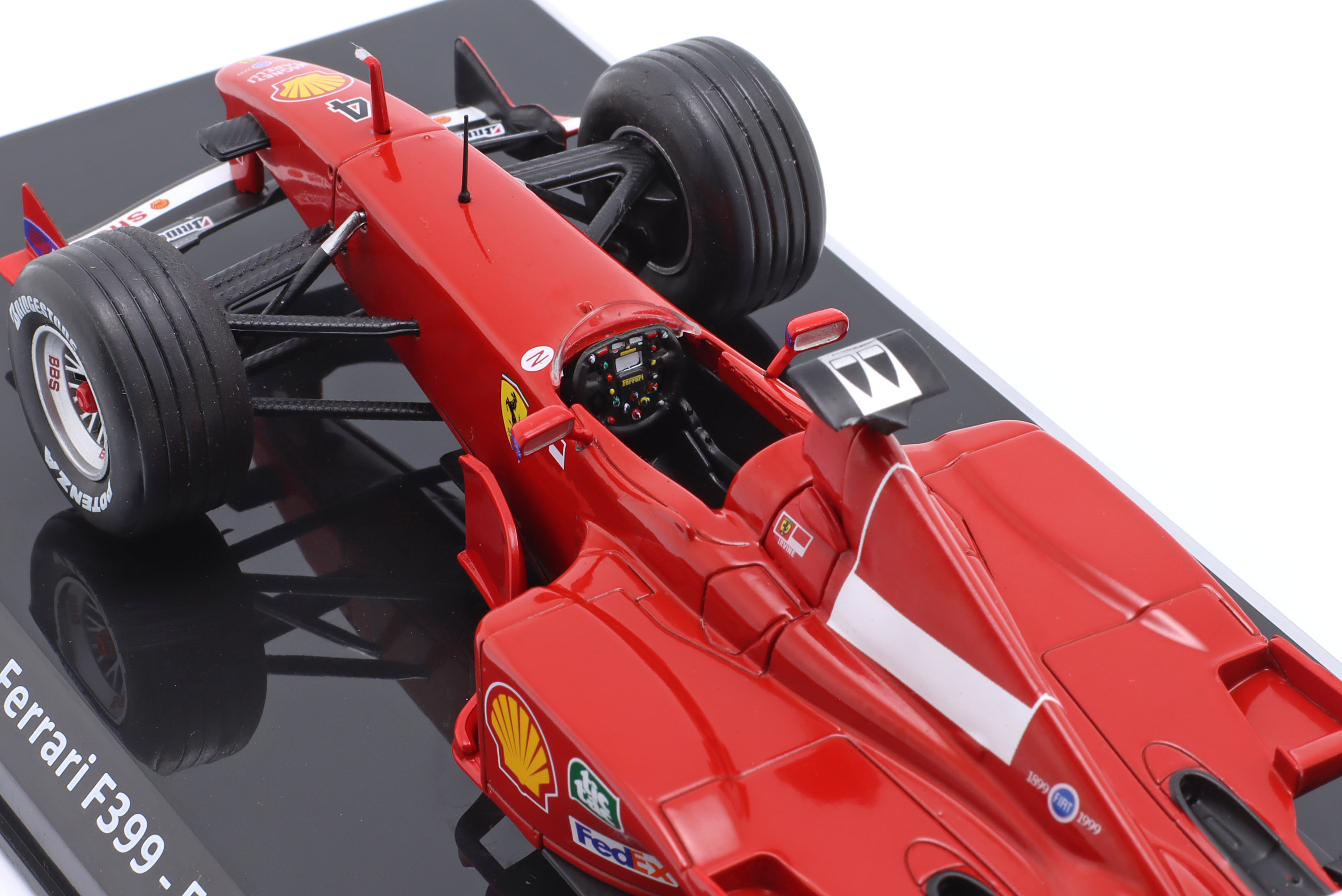 Kolekcjonerski model metalowy z elementami plastikowymi bolidu Formuły 1 FERRARI F399 #4,w którym Eddie Irvine zajął 2-gie miejsce w Mistrzostwach Świata Formuły 1 w sezonie 1999.Model na podstawce,posiada akrylową gablotkę ekspozycyjną.Nie posiada otwieranych elementów,Dodatkowo zapakowany w blister.
