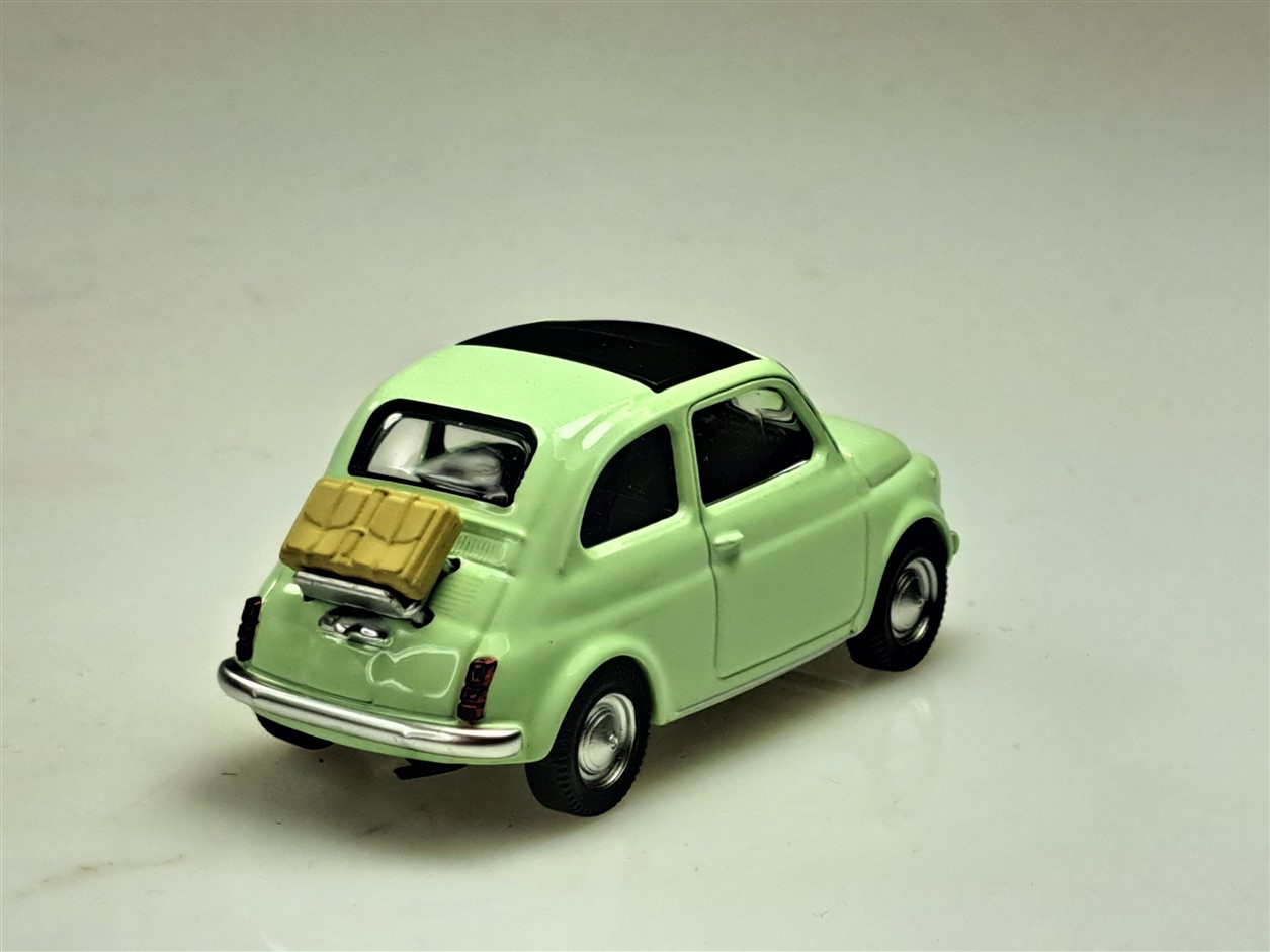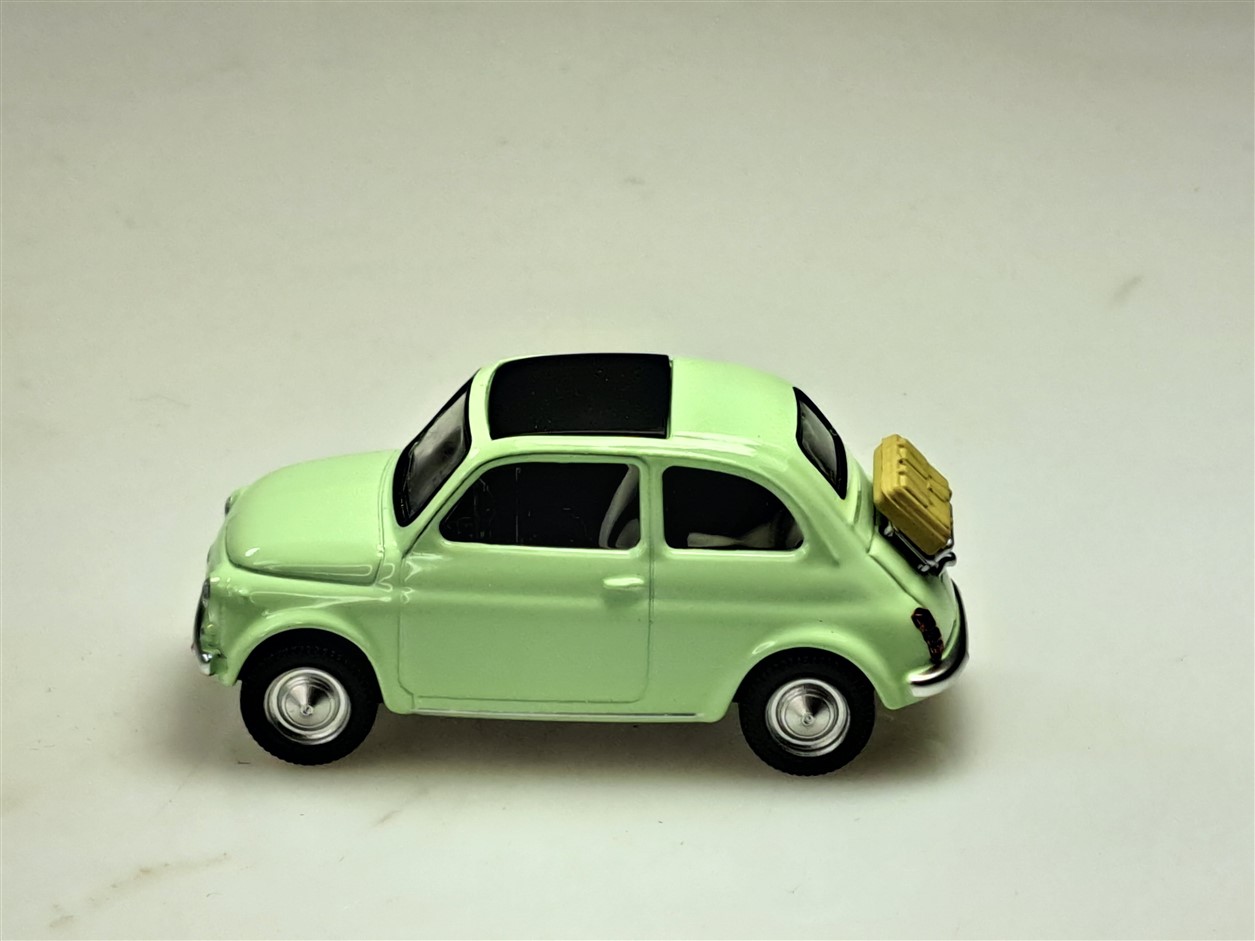 Kolekcjonerski model metalowy z elementami plastikowymi samochodu FIAT 500 F z roku 1965 w kolorze Jasnozielonym.Model z serii JET – CAR.
