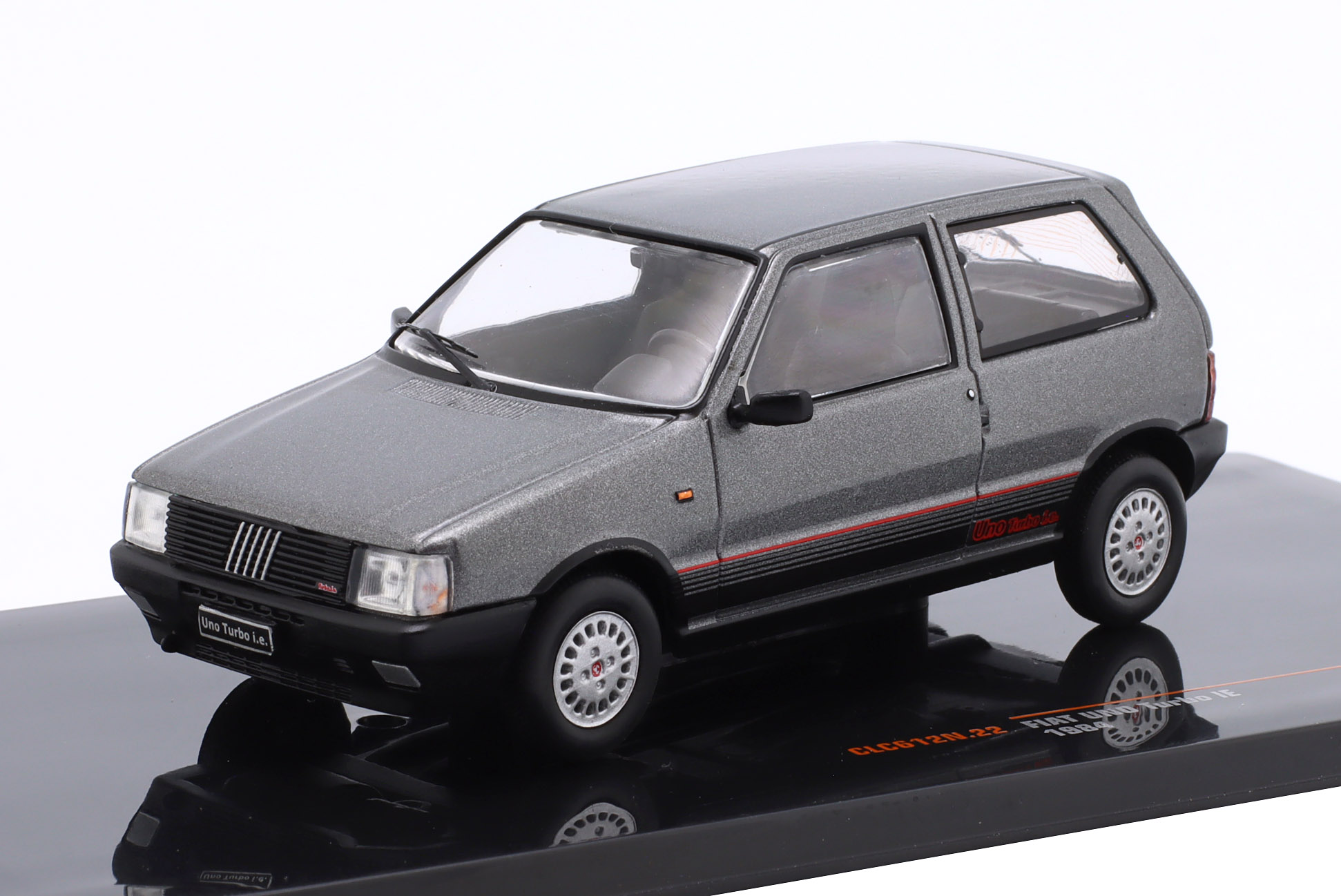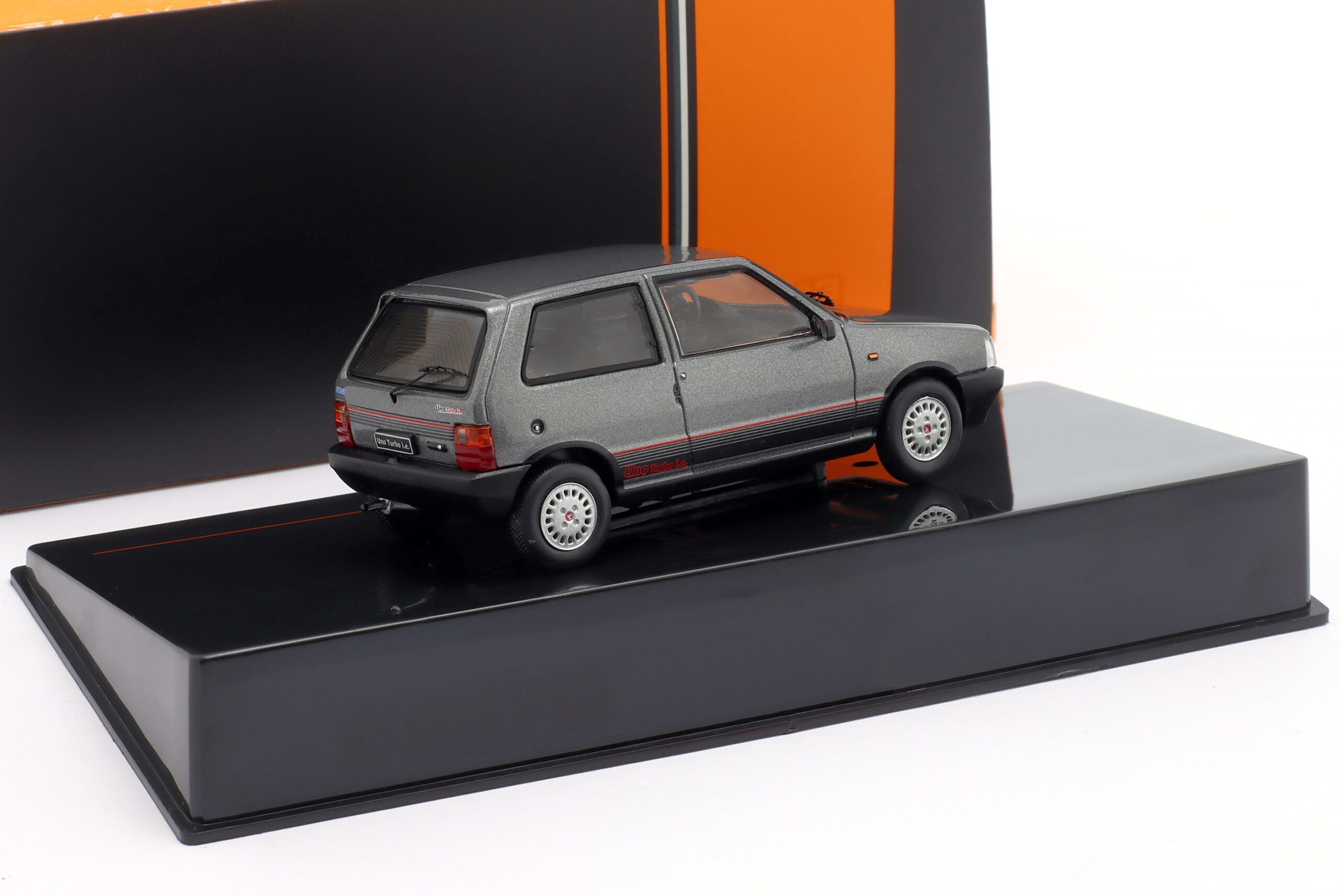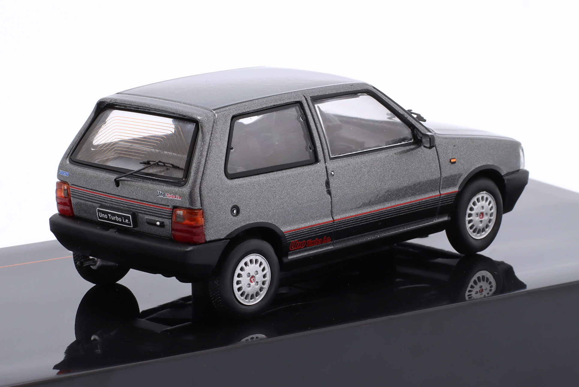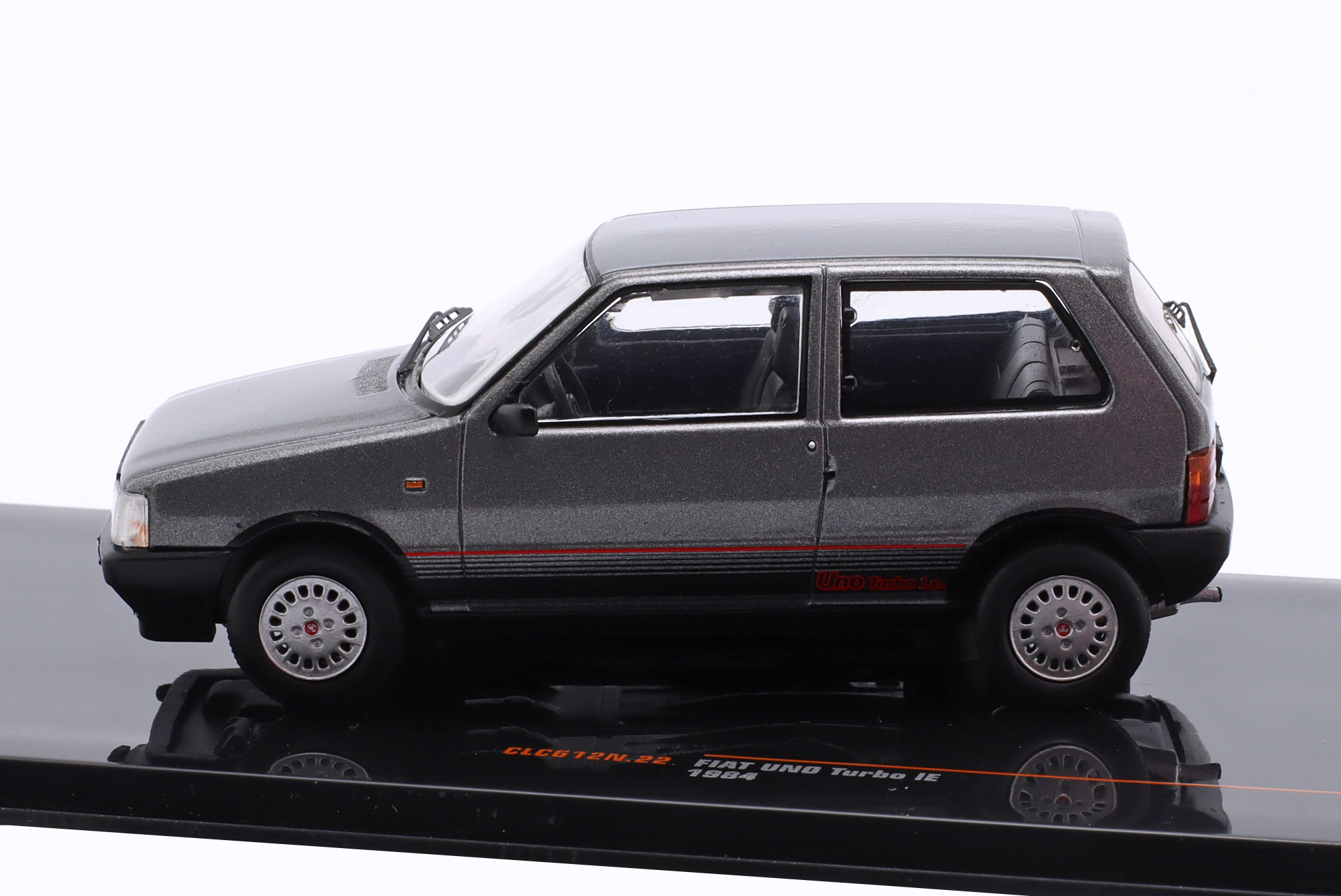 Kolekcjonerski model metalowy z elementami plastikowymi samochodu FIAT UNO TURBO IE z roku 1984 w kolorze Szary metallic.Model nie posiada otwieranych elementów.Model na plastikowej podstawce,posiada akrylową gablotkę ekspozycyjną.