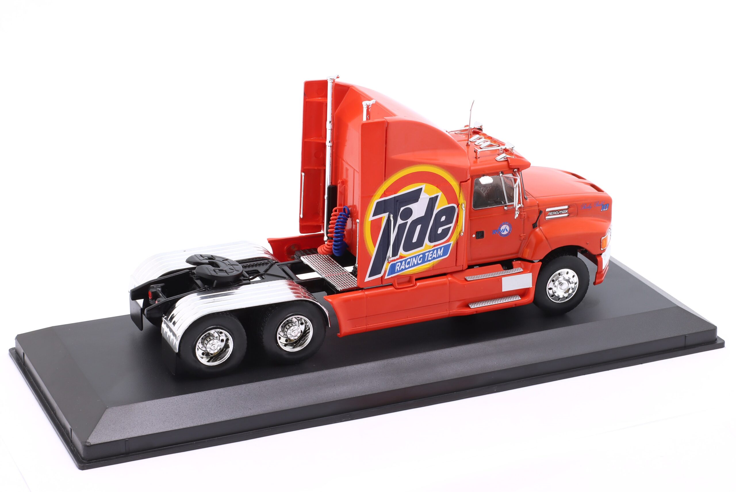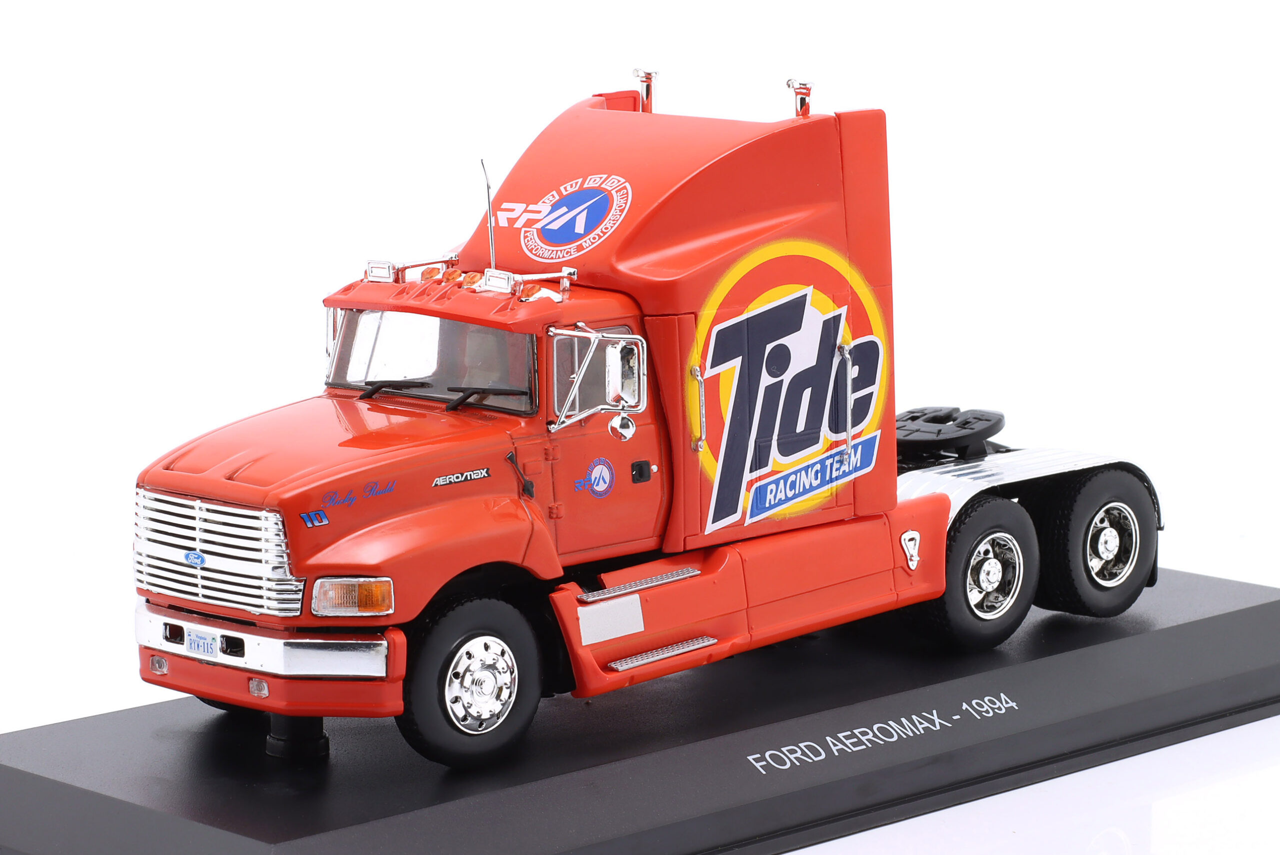 Kolekcjonerski model metalowy z elementami plastikowymi ciągnika siodłowego FORD AEROMAX „Tide Racing Team” z roku 1994 w kolorze pomarańczowym.Model nie posiada otwieranych elementów. Model na plastikowej podstawce, zapakowany w blister.