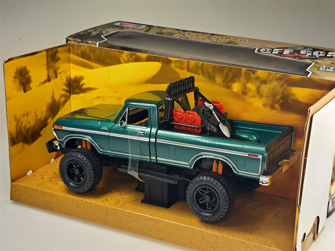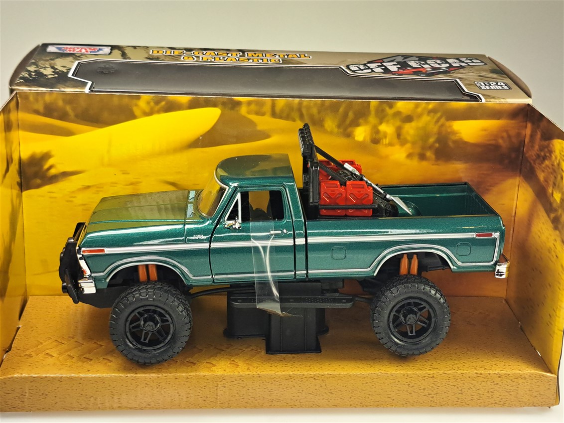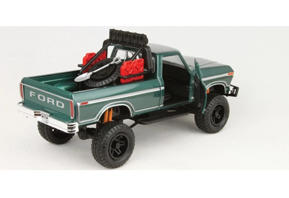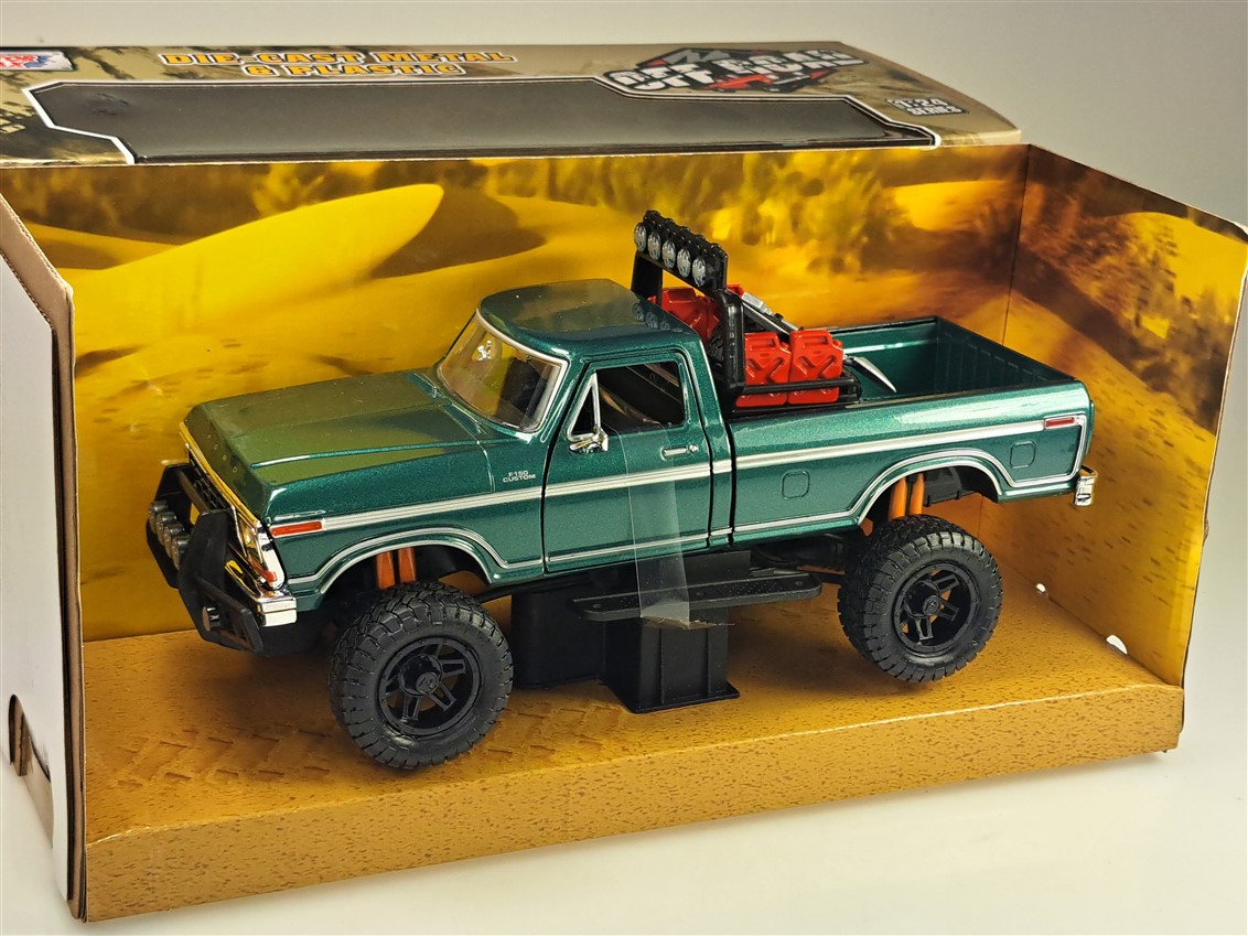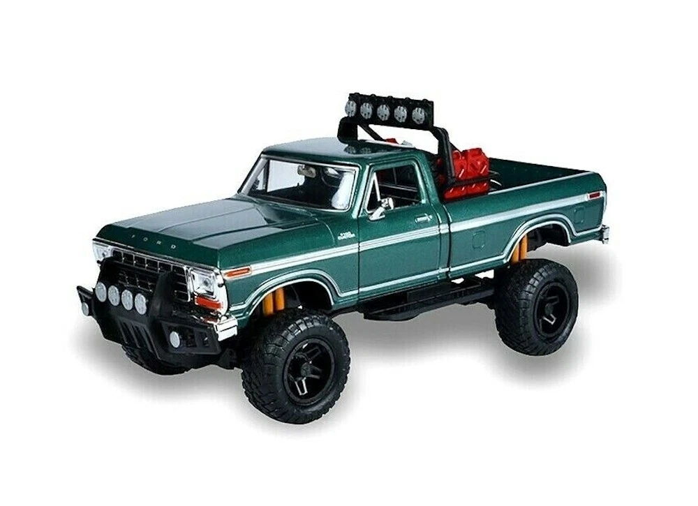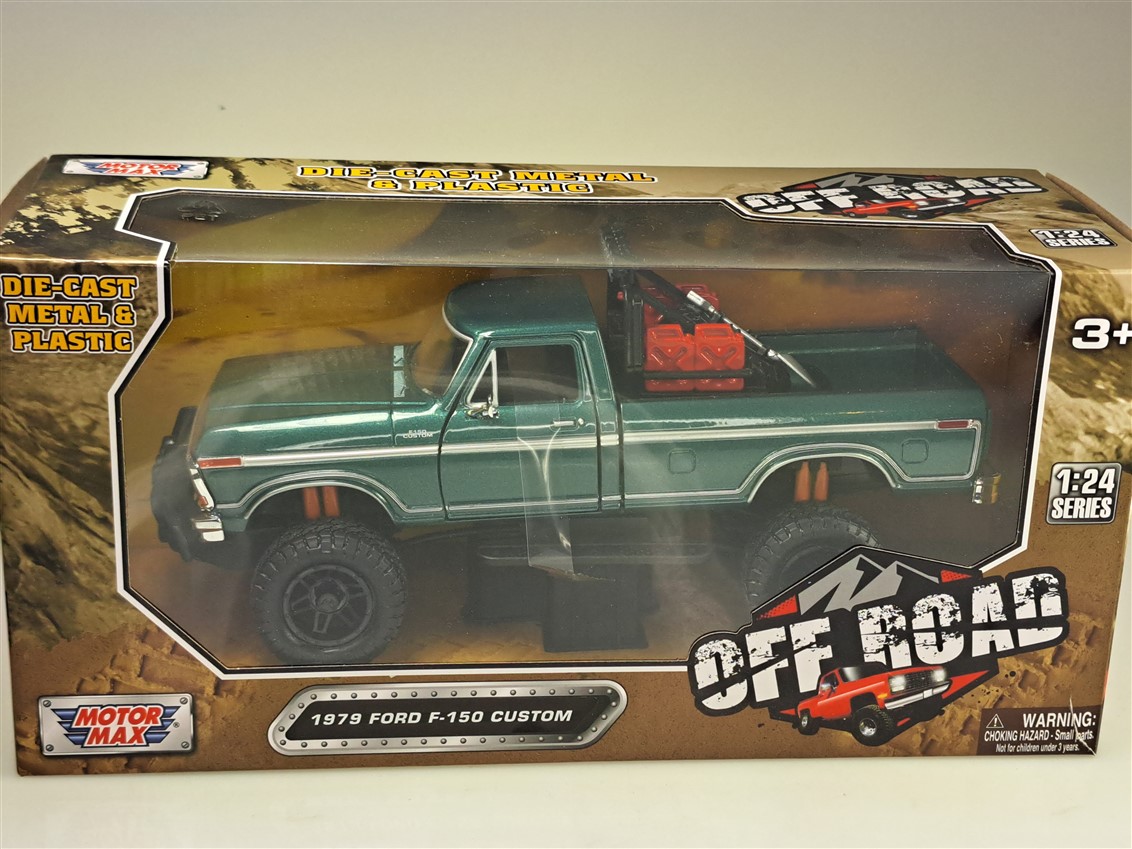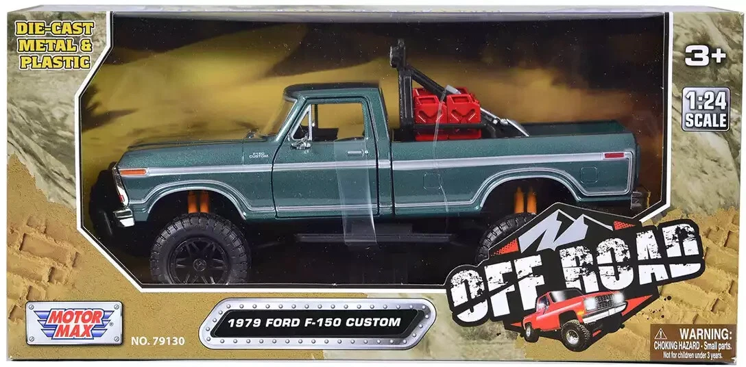 Kolekcjonerski model metalowy z elementami plastikowymi samochodu FORD F-150 Custom Off Road z roku 1979 w kolorze Zielonym.Posiada otwierane drzwi.Model zapakowany w kartonowe pudełko witrynką.