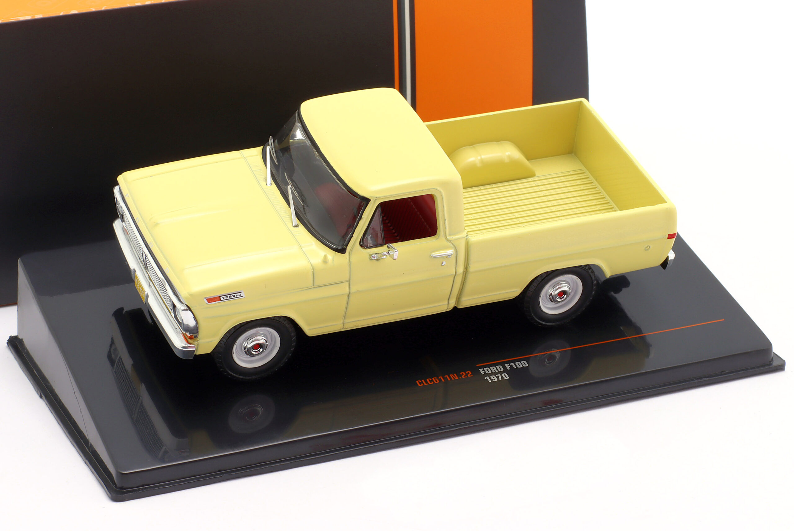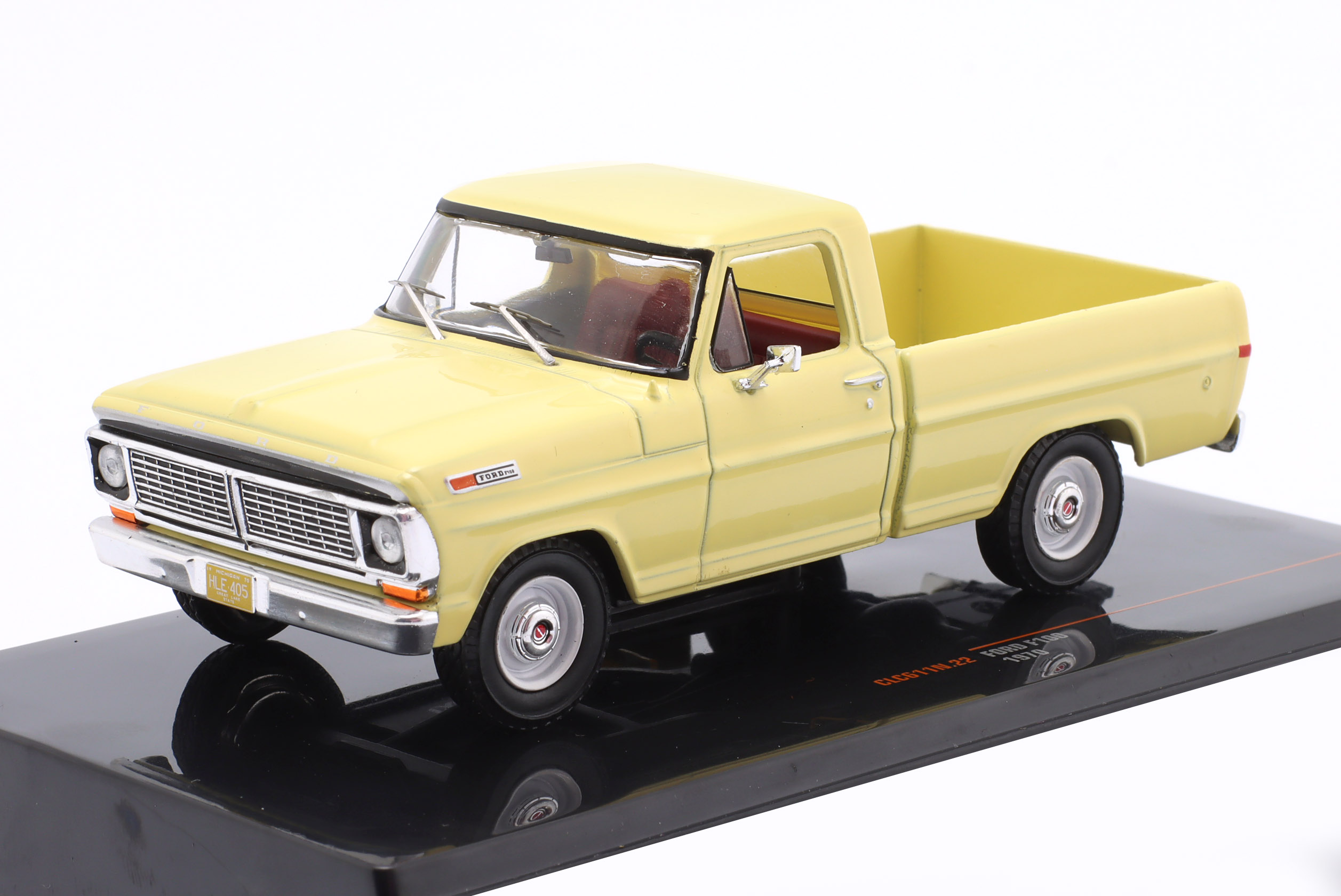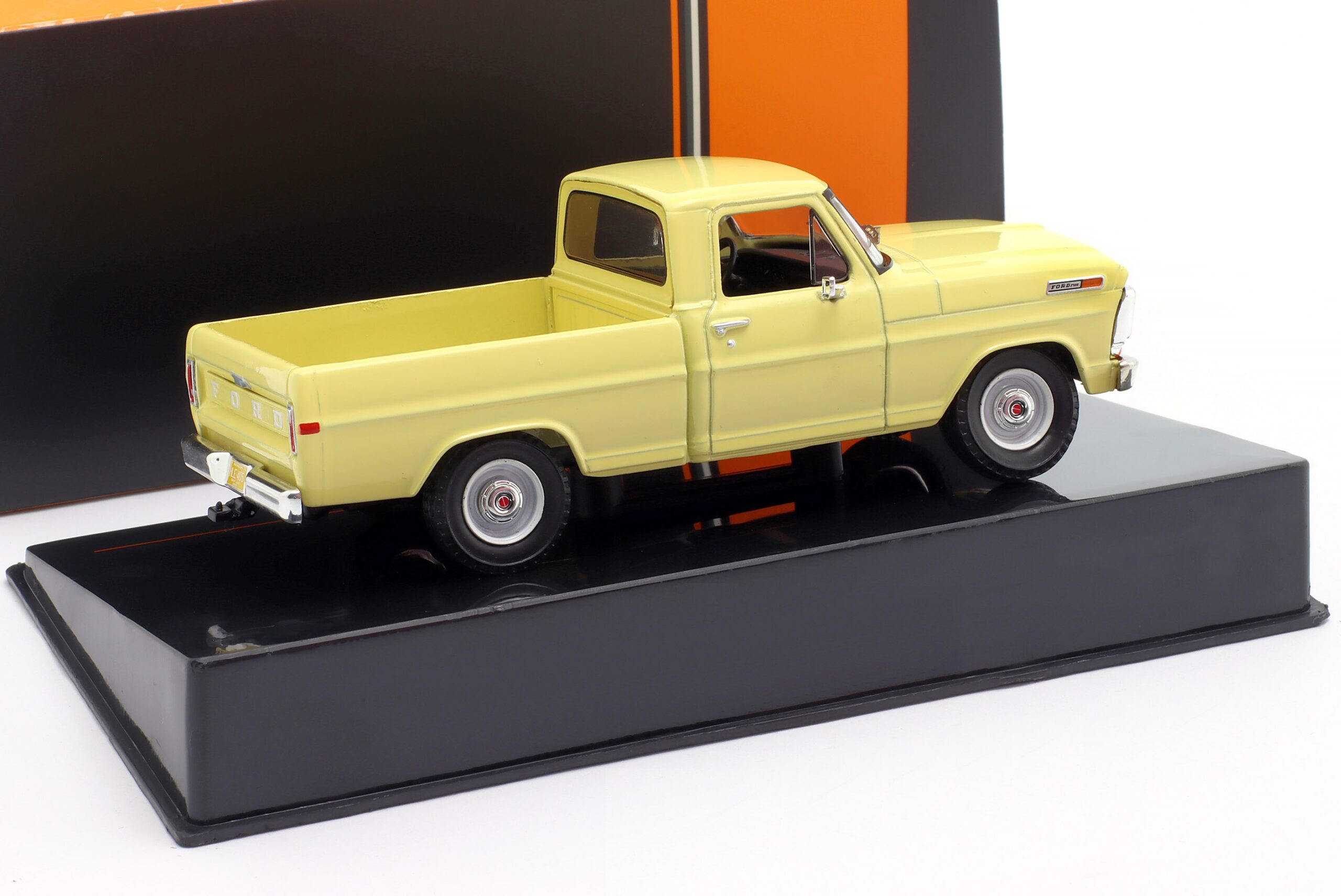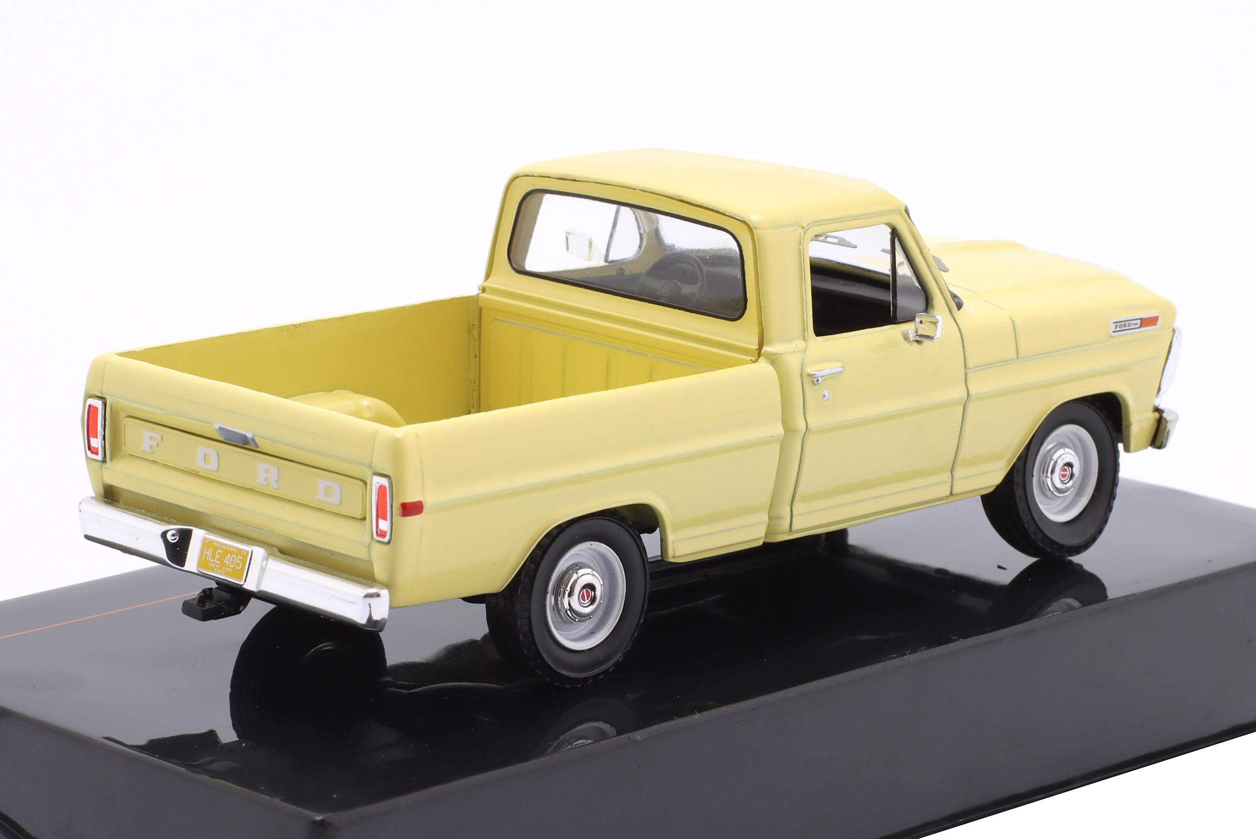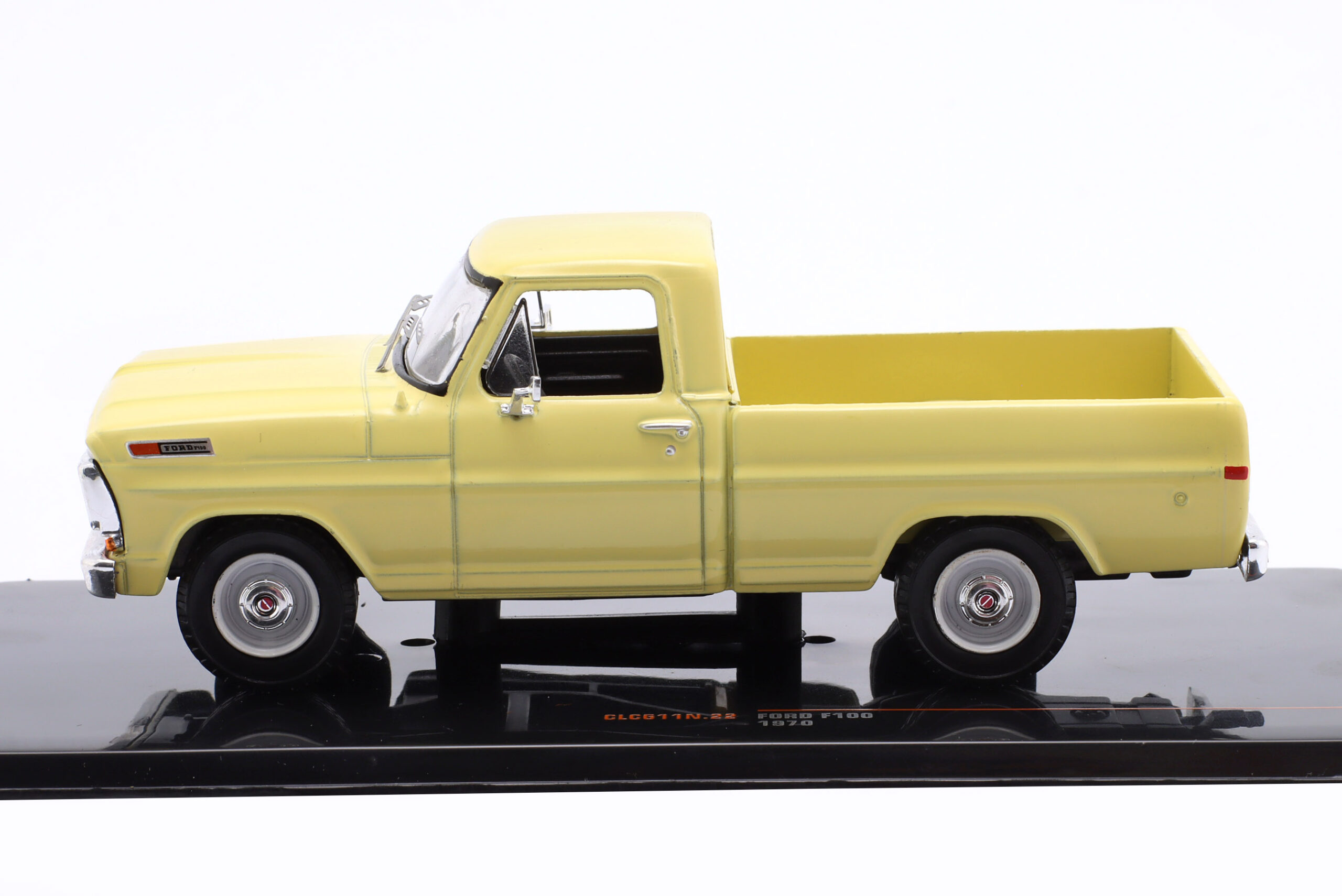 Kolekcjonerski model metalowy z elementami plastikowymi samochodu FORD F100 z roku 1970 w kolorze jasnożółtym.Model nie posiada otwieranych elementów.Model na plastikowej podstawce,posiada akrylową gablotkę ekspozycyjną.
